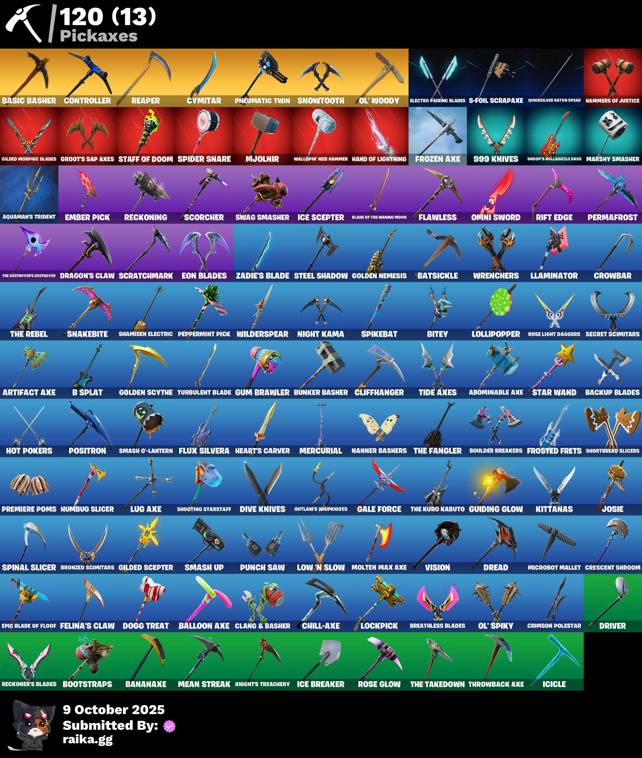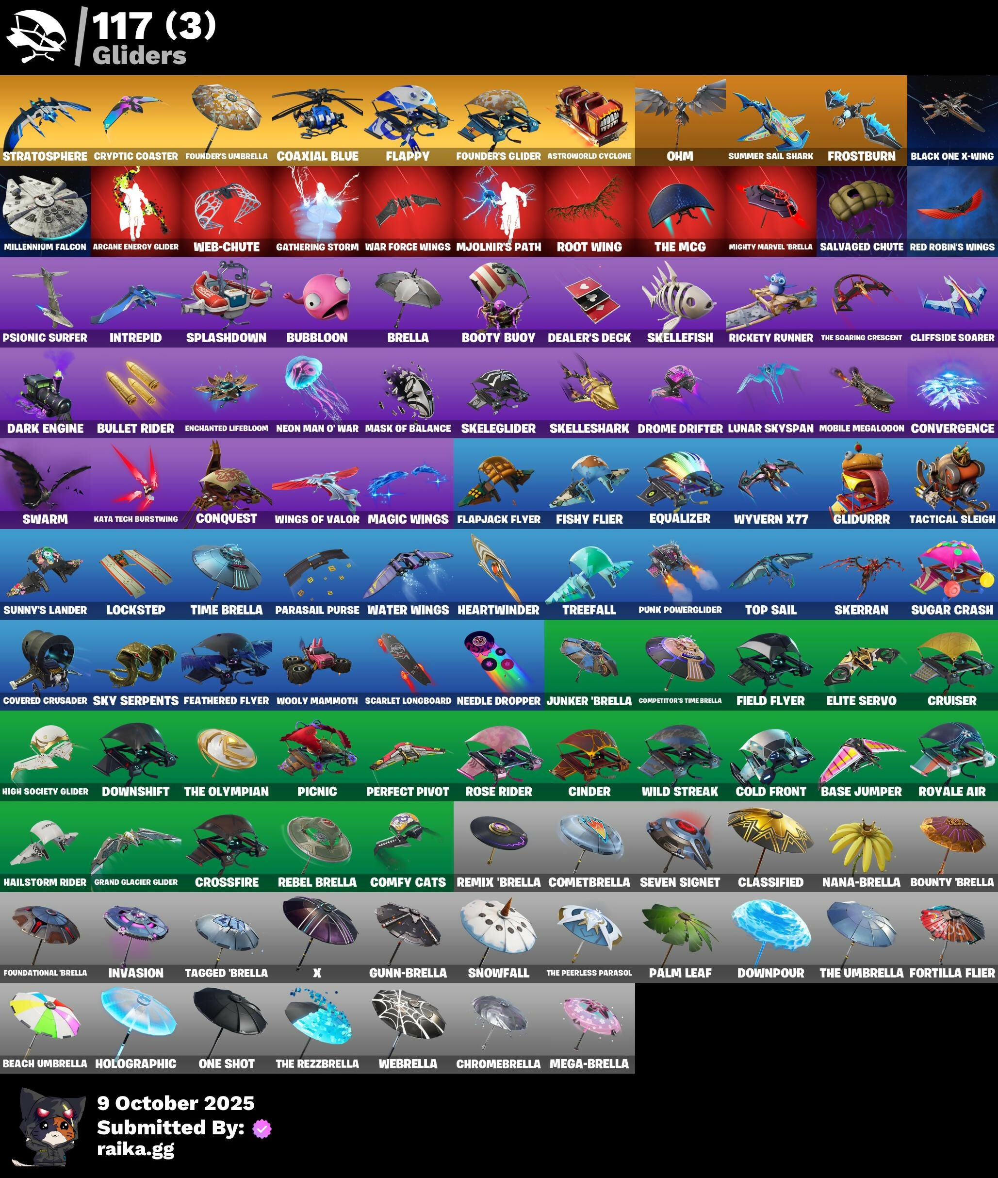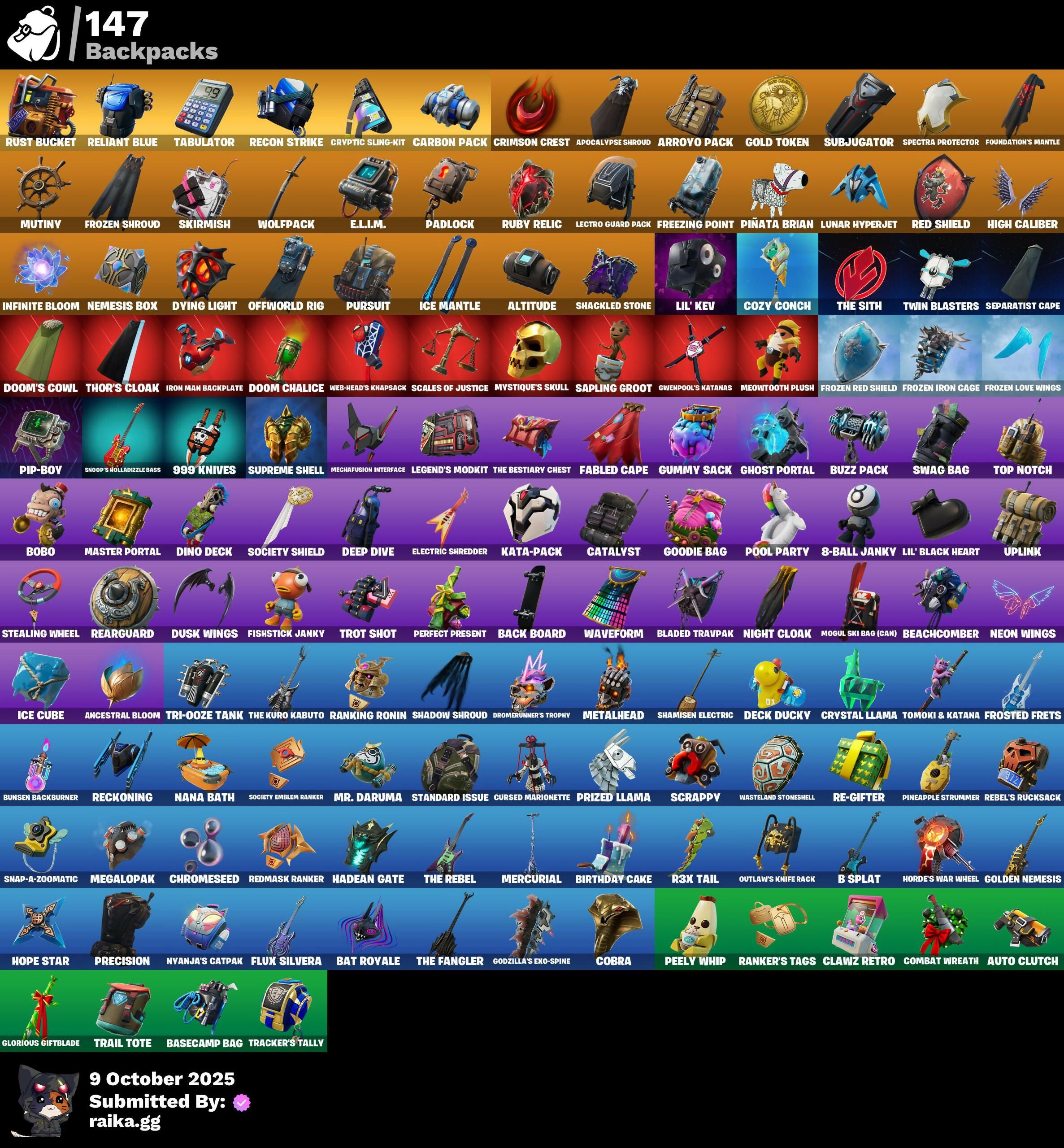 8-Ball Janky, 999 Knives, A.I.M., Abominable Axe, Air Shredder, Altitude, Ancestral Bloom, Apocalypse Shroud, Aquaman, Aquaman's Trident, Arcane Energy Glider, Arroyo Pack, Artifact Axe, Astroworld Cyclone, Aura, Auto Clutch, B Splat, Back Board, Backup Blades, Balloon Axe, Bananaxe, Base Jumper, Basecamp Bag, Basic Basher, Bat Royale, Batsickle, Battlehawk, Beach Umbrella, Beachcomber, Beep Beep, Birthday Cake, Bitey, Black One X-Wing, Blackheart, Blade Of The Waning Moon, Bladed Travpark, Bobo, Bootstraps, Booty Buoy, Boulder Breakers, Bounty 'Brella, Breakdown, Breathless Blades, Brella, Brite Bomber, Bronzed Scimitars, Bubloon, Bullet Rider, Bunker Basher, Bunsen Backburner, Buzz Pack, Calamity, Calculated, Call Me, Carbide, Carbon Commando, Carbon Pack, Cat Flip, Catalyst, Chill-Axe, Chromebrella, Chromeseed, Cinder, Clang & Basher, Classified, Clawz Retro, Clean Sweep, Cliffhanger, Cliffside Soarer, Clutch, Coaxial Blue, Cobra, Cold Front, Combat Wreath, Cometbrella, Comfy Cats, Commando, Competitor's Time Brella, Conga, Conquest, Controller, Convergence, Covered Crusader, Cozy Conch, Crescent Shroom, Crimson Crest, Crimson Polestar, Crossfire, Crowbar, Crowning Achievement, Cruiser, Cryptic Coaster, Cryptic Sling-Kit, Crystal Llama, Cursed Marionette, Cymitar, DJ Yonder, Dark Engine, Deadfire, Dealer's Deck, Deck Ducky, Deep Dive, Dino Deck, Dire, Dive Knives, Doctor Doom, Dogg Treat, Doom Chalice, Doom's Cowl, Downpour, Downshift, Doze Dab, Dragon Stance, Dragon's Claw, Dread, Drift, Driver, Drome Drifter, Dromerunner's Trophy, Dusk, Dusk Wings, Dying Light, E.L.I.M., Electric Shredder, Electro Pairing Blades, Elite Servo, Ember, Ember Pick, Enchanted Lifebloom, Enforcer, Eon Blades, Epic Blade Of Floof, Equalizer, Fable, Fabled Cape, Fade, Feathered Flyer, Felina, Felina's Claw, Field Flyer, Fierce, Fishstick Janky, Fishy Flier, Fist Bump, Fixer, Flamenco, Flapjack Flyer, Flappy, Flawless, Flippin' Away, Flux Silvera, Foil Flex, Fortilla Flier, Foundation's Mantle, Foundational 'Brella, Founder's Glider, Founder's Umbrella, Free Flow, Freezing Point, Frostbite, Frostburn, Frosted Frets, Frozen Axe, Frozen Iron Cage, Frozen Love Ranger, Frozen Love Wings, Frozen Raven, Frozen Red Knight, Frozen Red Shield, Frozen Shroud, Gale Force, Gathering Storm, Gentleman's Dab, Get Funky, Ghost Portal, Giddy-Up, Gilded Morphic Blades, Gilded Scepter, Glidurrr, Glorious Giftblade, Godzilla's Exo-Spine, Gold Token, Golden Nemesis, Golden Scythe, Golf Clap, Goodie Bag, Grand Glacier Glider, Grind, Groot, Groot's Sap Axes, Guiding Glow, Gum Brawler, Gumbo, Gummy Sack, Gunn-Brella, Gwenpool's Katanas, Hadean Gate, Hailstorm Rider, Hammers Of Justice, Hand Of Lightning, Harlowe, Have A Seat, Haven, Hearts Carver, Heartwinder, Hello Friend, High Caliber, High Society Glider, Holiday Boxy, Holographic, Hoop Master, Hope Star, Hordes War Wheel, Hot Marat, Hot Pokers, Hot Stuff, Humbug Slicer, Huntress, Hybrid, Hype, I Declare!, Ice Breaker, Ice Cube, Ice Mantle, Ice Scepter, Icicle, Infinite Bloom, Intrepid, Introducing..., Invasion, Iron Man Backplate, It's Go Time!, It's... You?, Jennifer Walters, Jet Signals, Josie, Jules, Junker 'Brella, Kata Tech Burstwing, Kata-Pack, Keep It Mello, Keyed Up, Kit, Kittanas, Knight's Treachery, Laguna, Lectro Guard Pack, Legend's Modkit, Lil' Black Heart, Lil' Kev, Lil' Monster, Lil' Warthog, Llaminator, Lockpick, Lockstep, Lollipopper, Love It!, Low 'N Slow, Lt. Evergreen, Lt. John Llama, Lug Axe, Lunar Charge, Lunar Hyperjet, Lunar Skyspan, Luxe, Lynx, Magic Wings, Make A Seat, Marked Marauder, Marshy Smasher, Mask Of Balance, Master Key, Master Portal, Mean Streak, Mechafusion Interface, Mega-Brella, Megalopak, Meowtooth Plush, Mercurial, Metalhead, Mic Drop, Microbot Mallet, Mighty Marvel 'Brella, Millennium Falcon, Mjolnir, Mjolnir's Path, Mobile Megalodon, Mogul Master (CAN), Mogul Ski Bag (Can), Molten Max Axe, Mr. Daruma, Mutiny, Mwahaha, Mystique, Mystique's Skull, Nana Bath, Nana Nana, Nana-Brella, Nanner Bashers, Needle Dropper, Nemesis Box, Neon Man O' War, Neon Wings, Night Cloak, Night Kama, Nightshade, Ninja Stance: Leo, Nog Ops, Nyanja's Catpak, Ocean, Offworld Rig, Ohm, Ol' Spiky, Ol' Woody, Omni Sword, One Shot, Onesie, Orange Justice, Outlaw's Knife Rack, Outlaw's Whipknives, Padlock, Palm Leaf, Parasail Purse, Peely, Peely Whip, Peppermint Pick, Perfect Pivot, Perfect Present, Permafrost, Picnic, Pineapple Pete, Pineapple Strummer, Pip-Boy, Piñata Brian, Pneumatic Twin, Point It Out, Point Patroller, Poised Playmaker, Pool Party, Popcorn, Positron, Powder, Precision, Premiere Poms, Prized Llama, Prodigy, Psionic Surfer, Punch Saw, Punk Powerglider, Pursuit, R3X Tail, Ragnarok, Ranker's Tags, Ranking Ronin, Re-Gifter, Reanimated, Reaper, Rearguard, Rebel Brella, Rebel's Rucksack, Reckoner's Blades, Reckoning, Recon Strike, Red Knight, Red Robin's Wings, Red Shield, Redline, Redmask Ranker, Regal Wave, Reliant Blue, Remix 'Brella, Respect, Respect The Peace, Rickety Runner, Ride The Pony, Rift Edge, Rock Paper Scissors, Rogue Agent, Ronin, Rook, Root Wing, Rose Glow, Rose Light Daggers, Rose Rider, Rose Team Leader, Royale Air, Ruby Relic, Ruin, Running Man, Runway Racer, Rust Bucket, S-Foil Scrapaxe, Sad Trombone, Salute, Salvaged Chute, Santa Dogg, Sapling Groot, Scales of Justice, Scarlet Longboard, Scootin', Scorcher, Scrappy, Scratchmark, Scuba Jonesy, Secret Scimitars, Separatist Cape, Seven Signet, Sgt. Winter, Shackled Stone, Shadow Shroud, Shamisen Electric, Shanta, Sharpshooter, Shimmer, Shooting Starstaff, Shortbread Slicers, Show 'Em Off, Sidewinder, Sing Along, Skeleglider, Skellefish, Skelleshark, Skerran, Skirmish, Skull Trooper, Sky Serpents, Slaver Juice Wrld, Sledgehammer, Slitherin', Smash O'-Lantern, Smash Up, Snakebite, Snap-A-Zoomatic, Snoop's Holladazzle Bass, Snoop's Holladizzle Bass, Snoozefest, Snowfall, Snowshaker, Snowtooth, So Square, Society Emblem Ranker, Society Shield, Sparkplug, Spectra Protector, Spider Snare,