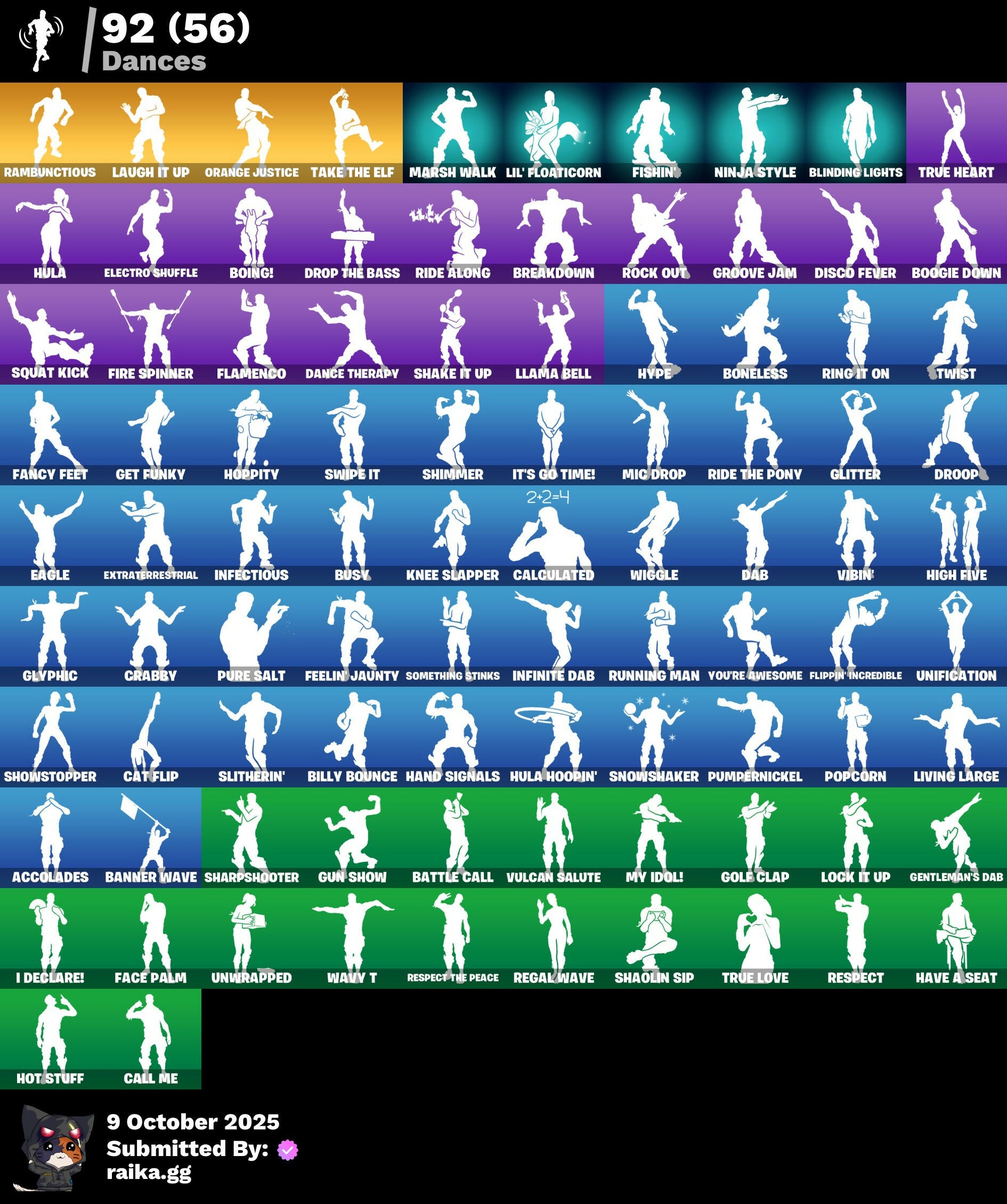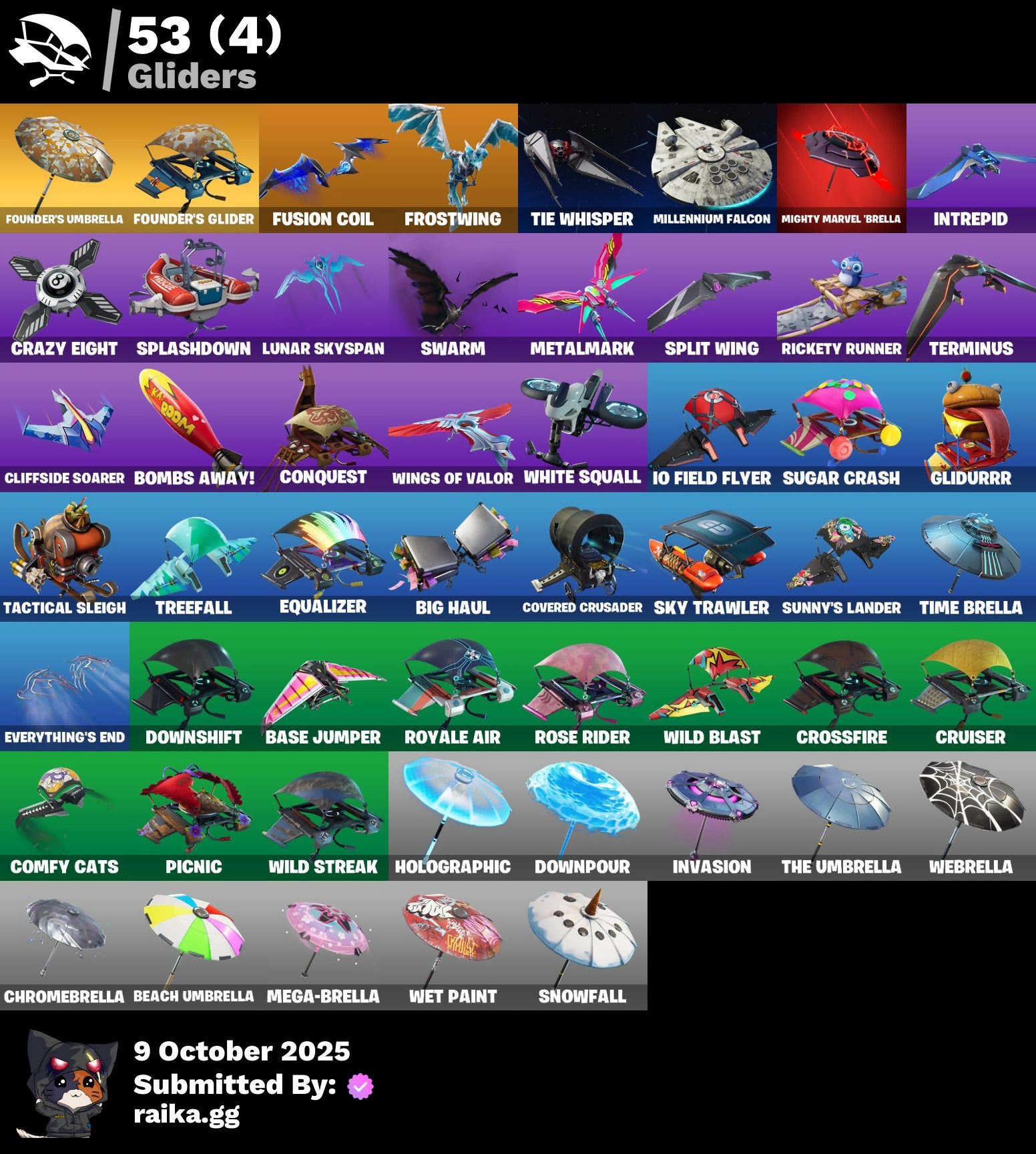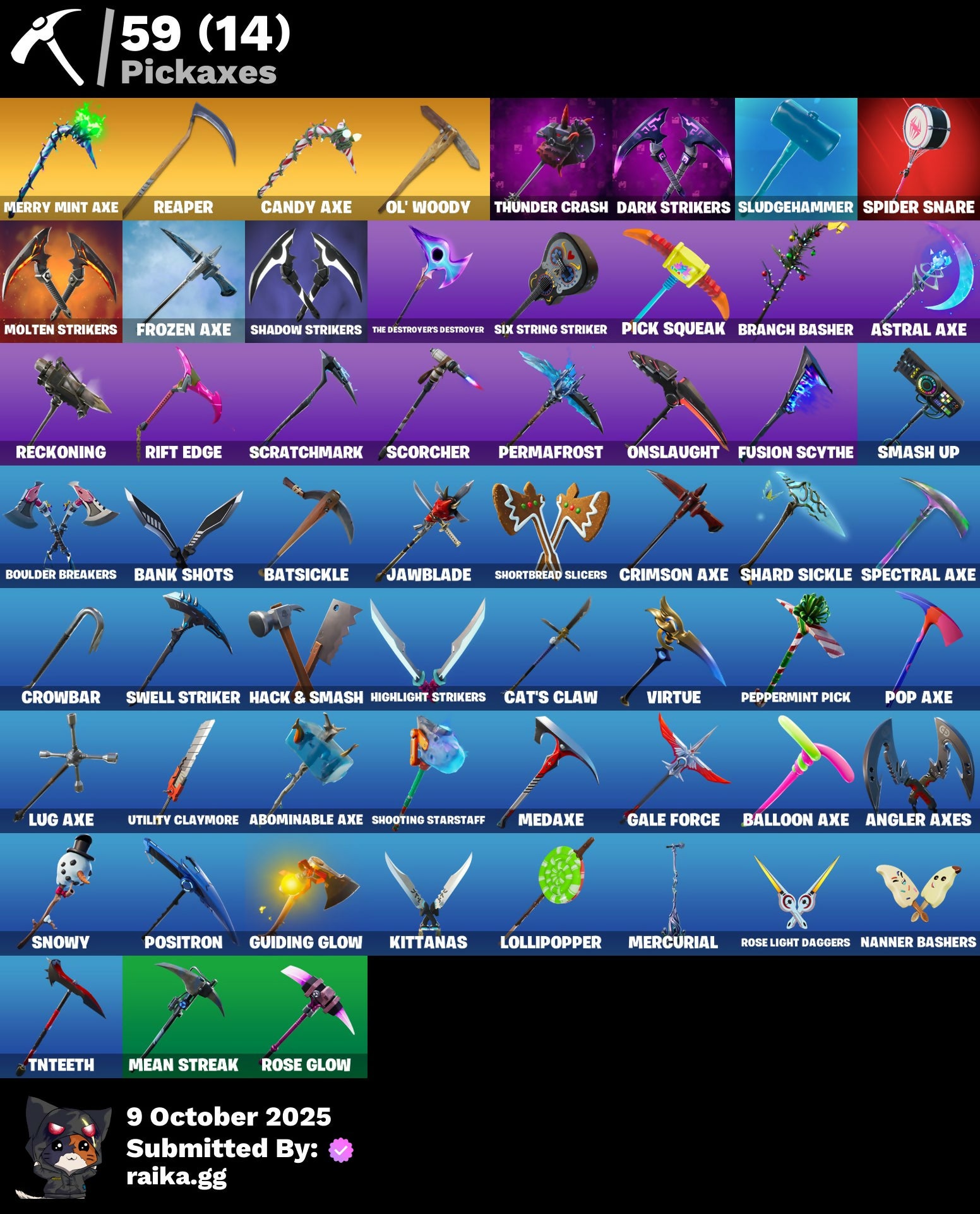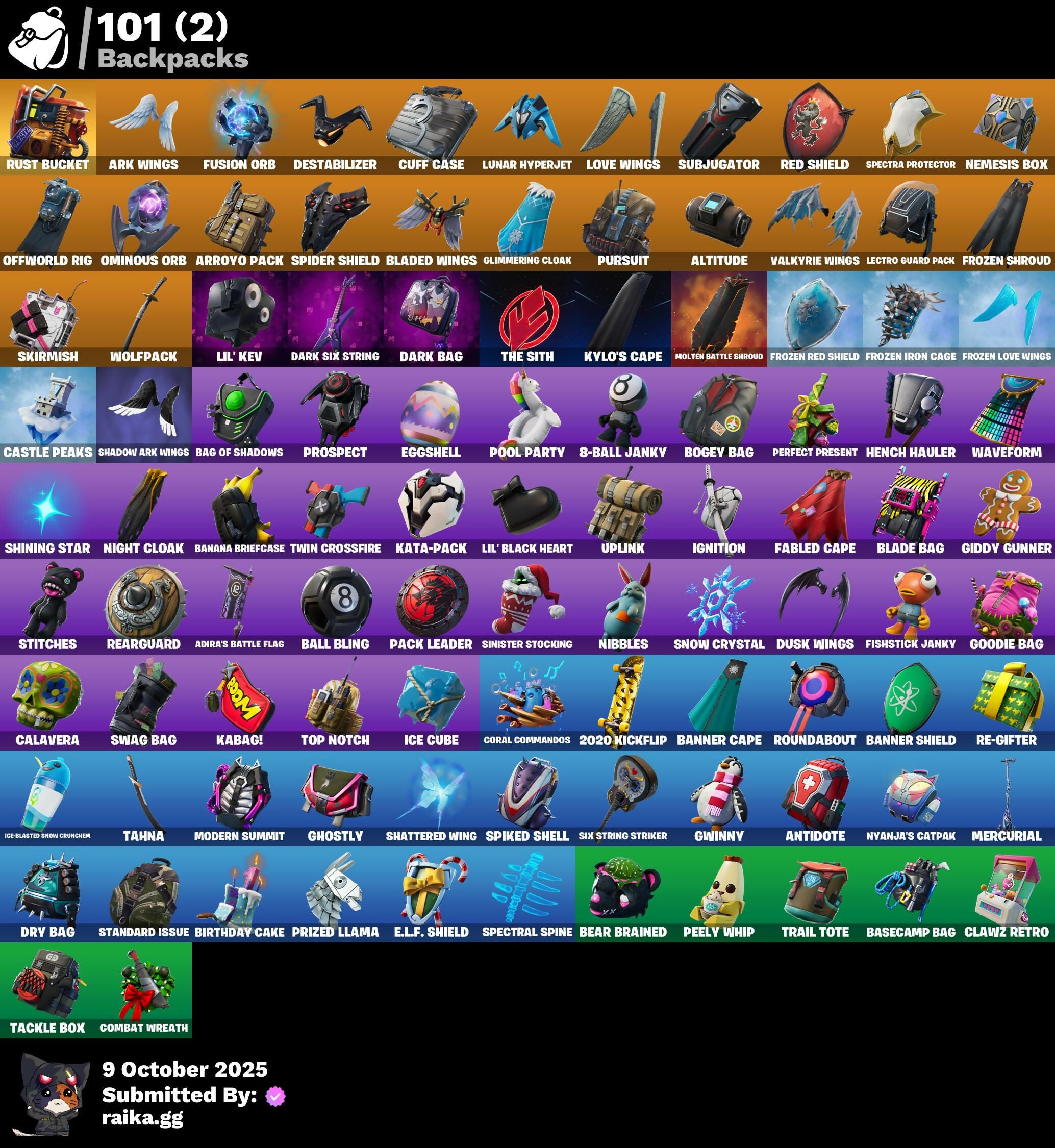 2020 Kickflip, 8-Ball Janky, 8-Ball Vs Scratch, Abominable Axe, Accolades, Adira's Battle Flag, Agent Peely, Altitude, Angler Axes, Antidote, Arctica, Ark, Ark Wings, Arroyo Pack, Astra, Astral Axe, Bag of Shadows, Ball Bling, Balloon Axe, Banana Briefcase, Bank Shots, Banner Cape, Banner Shield, Banner Wave, Base Jumper, Basecamp Bag, Batsickle, Battle Call, Battlehawk, Beach Umbrella, Bear Brained, Big Haul, Billy Bounce, Birthday Cake, Blade Bag, Bladed Wings, Blinding Lights, Bogey Bag, Boing!, Bombs Away!, Boneless, Boogie Down, Boulder Breakers, Branch Basher, Breakdown, Brutus, Bullseye, Bundles, Bunny Brawler, Busy, Calamity, Calavera, Calculated, Call Me, Cameo Vs Chic, Candy Axe, Carbide, Castle Peaks, Cat Flip, Cat's Claw, Chromebrella, Clash, Clawz Retro, Cliffside Soarer, Codename E.L.F., Combat Wreath, Comfy Cats, Commando, Conquest, Coral Commandos, Covered Crusader, Crabby, Crazy Eight, Crimson Axe, Crossfire, Crowbar, Cruiser, Cryptic, Cuff Case, DJ Yonder, Dab, Dance Therapy, Dark Bag, Dark Bomber, Dark Power Chord, Dark Six String, Dark Strikers, Destabilizer, Dire, Disco Fever, Downpour, Downshift, Dream, Drift, Droop, Drop The Bass, Dry Bag, Dusk, Dusk Wings, E.L.F. Shield, Eagle, Eggshell, Electro Shuffle, Enforcer, Equalizer, Everything's End, Extraterrestrial, Fable, Fabled Cape, Face Palm, Fancy Feet, Fate, Feelin' Jaunty, Fire Spinner, Fishin', Fishstick Janky, Flamenco, Flapjackie, Flippin' Incredible, Fortune, Founder's Glider, Founder's Umbrella, Frostwing, Frozen Axe, Frozen Fishstick, Frozen Iron Cage, Frozen Love Ranger, Frozen Love Wings, Frozen Nog Ops, Frozen Raven, Frozen Red Knight, Frozen Red Shield, Frozen Shroud, Fusion, Fusion Coil, Fusion Orb, Fusion Scythe, Gale Force, Gear Specialist Maya, Gentleman's Dab, Get Funky, Ghostly, Ghoul Trooper, Giddy Gunner, Giddy-Up, Ginger Gunner, Glidurrr, Glimmer, Glimmering Cloak, Glitter, Glyphic, Golf Clap, Goodie Bag, Grim Fable, Groove Jam, Guiding Glow, Gun Show, Gwinny, Hack & Smash, Hand Signals, Harley Quinn, Have A Seat, Hemlock, Hench Hauler, High Five, Highlight Strikers, Holographic, Hoppity, Hot Stuff, Hula, Hula Hoopin', Huntress, Hype, I Declare!, IO Field Flyer, Ice Cube, Ice-Blasted Snow Crunchem, Ignition, Infectious, Infinite Dab, Intrepid, Invasion, Iris, It's Go Time!, Jawblade, Journey Vs Hazard, Kabag!, Kata-Pack, Kittanas, Knee Slapper, Kylo Ren, Kylo's Cape, Lace, Laugh It Up, Lectro Guard Pack, Lil' Black Heart, Lil' Floaticorn, Lil' Kev, Living Large, Llama Bell, Lock It Up, Lollipopper, Love Ranger, Love Wings, Lt. Evergreen, Lug Axe, Lunar Hyperjet, Lunar Skyspan, Lynx, Marsh Walk, Mean Streak, Medaxe, Mega-Brella, Mercurial, Merry Mint Axe, Metalarmark, Mic Drop, Mighty Marvel 'Brella, Millennium Falcon, Modern Summit, Molten Battle Shroud, Molten Omen, Molten Strikers, My Idol!, Nanner Bashers, Nemesis Box, Nibbles, Night Cloak, Nightshade, Ninja Style, Nitelite, Nog Ops, Nyanja's Catpak, Oblivion, Offworld Rig, Ol' Woody, Omega, Ominous Orb, Onesie, Onslaught, Orange Justice, Pack Leader, Payback, Peely Whip, Peppermint Pick, Perfect Present, Permafrost, Pick Squeak, Picnic, Poised Playmaker, Pool Party, Pop Axe, Popcorn, Positron, Powder, Prized Llama, Prospect, Pumpernickel, Pure Salt, Pursuit, Ragnarok, Rambunctious, Re-Gifter, Reaper, Rearguard, Reckoning, Red Knight, Red Shield, Red-Nosed Raider, Redline, Regal Wave, Remedy Vs Toxin, Respect, Respect The Peace, Rickety Runner, Ride Along, Ride The Pony, Rift Edge, Riley, Ring It On, Rippley Vs Sludge, Rock Out, Rook, Rosa, Rose Glow, Rose Light Daggers, Rose Rider, Rose Team Leader, Roundabout, Royale Air, Running Man, Rust Bucket, Scorcher, Scratchmark, Sgt. Winter, Shadow Ark, Shadow Ark Wings, Shadow Ops, Shadow Strikers, Shake It Up, Shaolin Sip, Shard Sickle, Sharpshooter, Shattered Wing, Shimmer, Shining Star, Shogun, Shooting Starstaff, Shortbread Slicers, Showstopper, Sinister Stocking, Six String Striker, Skirmish, Skull Ranger, Sky Trawler, Sledgehammer, Slitherin', Sludgehammer, Smash Up, Snow Crystal, Snowfall, Snowshaker, Snowy, Something Stinks, Spectra Protector, Spectral Axe, Spectral Spine, Spider Knight, Spider Shield, Spider Snare, Spiked Shell, Splashdown, Split Wing, Squad Leader, Squat Kick, Standard Issue, Stitches, Subjugator, Sugar Crash, Summit Striker, Sun Strider, Sunny's Lander, Survival Specialist, Swag Bag, Swarm, Swell Striker, Swipe It, Tackle Box, Tactical Sleigh, Tahna, Take The Elf, Teknique, Terminus, The Ace, The Destroyer's Destroyer, The Devourer, The Sith, The Umbrella, The Visitor, Thunder Crash, Tie Whisper, Time Brella, Tnteeth, Top Notch, Trail Tote, Treefall, Triggerfish, Trog, True Heart, True Love, Tsuki, Turk Vs Riptide, Twin Crossfire, Twist, Unification, Unwrapped, Uplink, Utility Claymore, Valkyrie, Valkyrie Wings, Valor, Vibin', Virtue, Vulcan Salute, Warpaint, Wavebreaker, Waveform, Wavy T, Webrella, Wet Paint, White Squall, Whiteout, Wiggle, Wild Blast, Wild Card, Wild Streak, Wingman, Wings Of Valor, Wolfpack, Wooly Warrior, You're Awesome, Yule Trooper, Zenith, Zoey