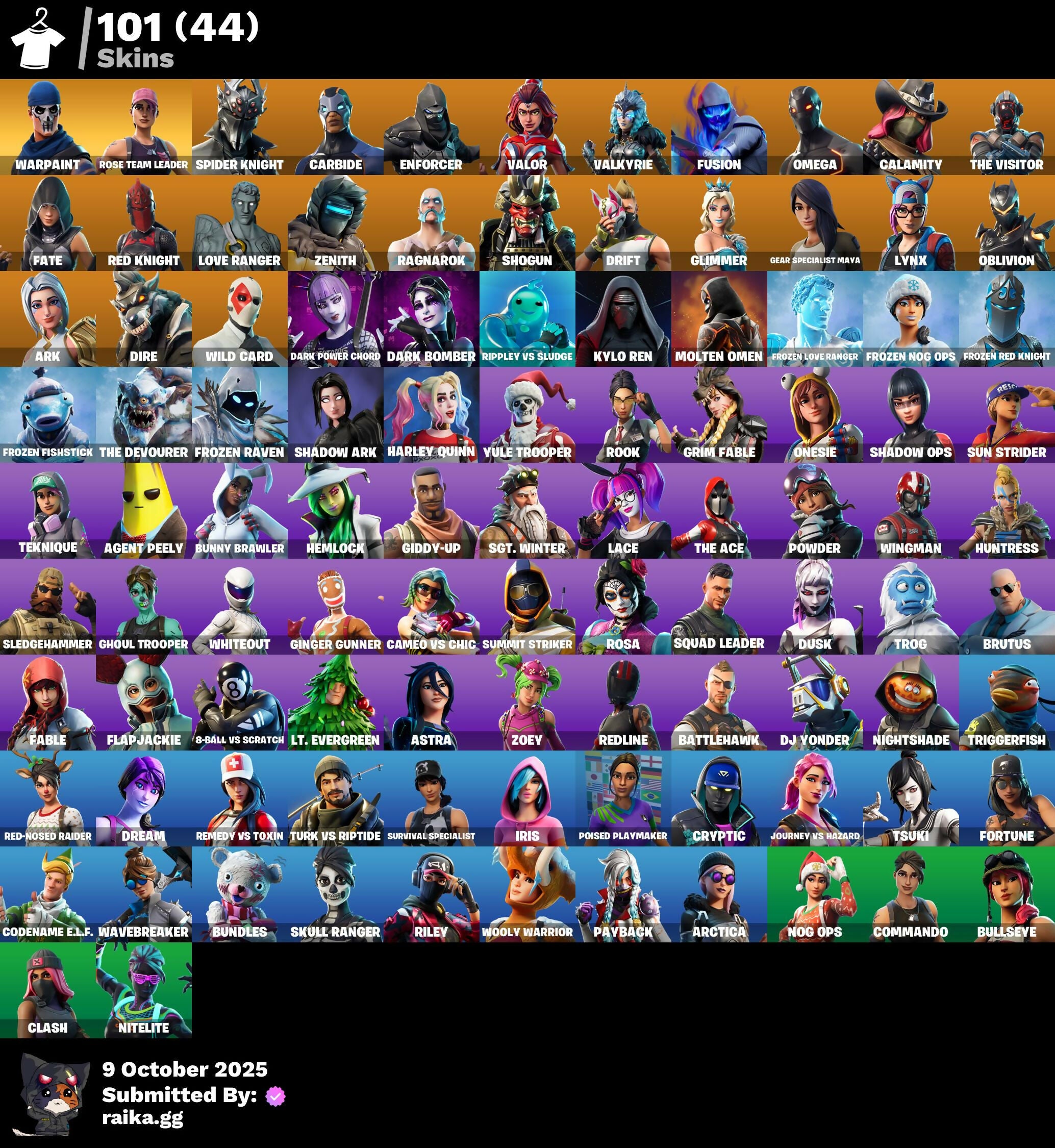 [PC/PSN/XBOX] 101 skins | OG STW | Spider Knight | Carbide | Enforcer | Valor | Valkyrie | Fusion | Omega | Calamity | The Visitor | Fate | Red Knight | 800 VB