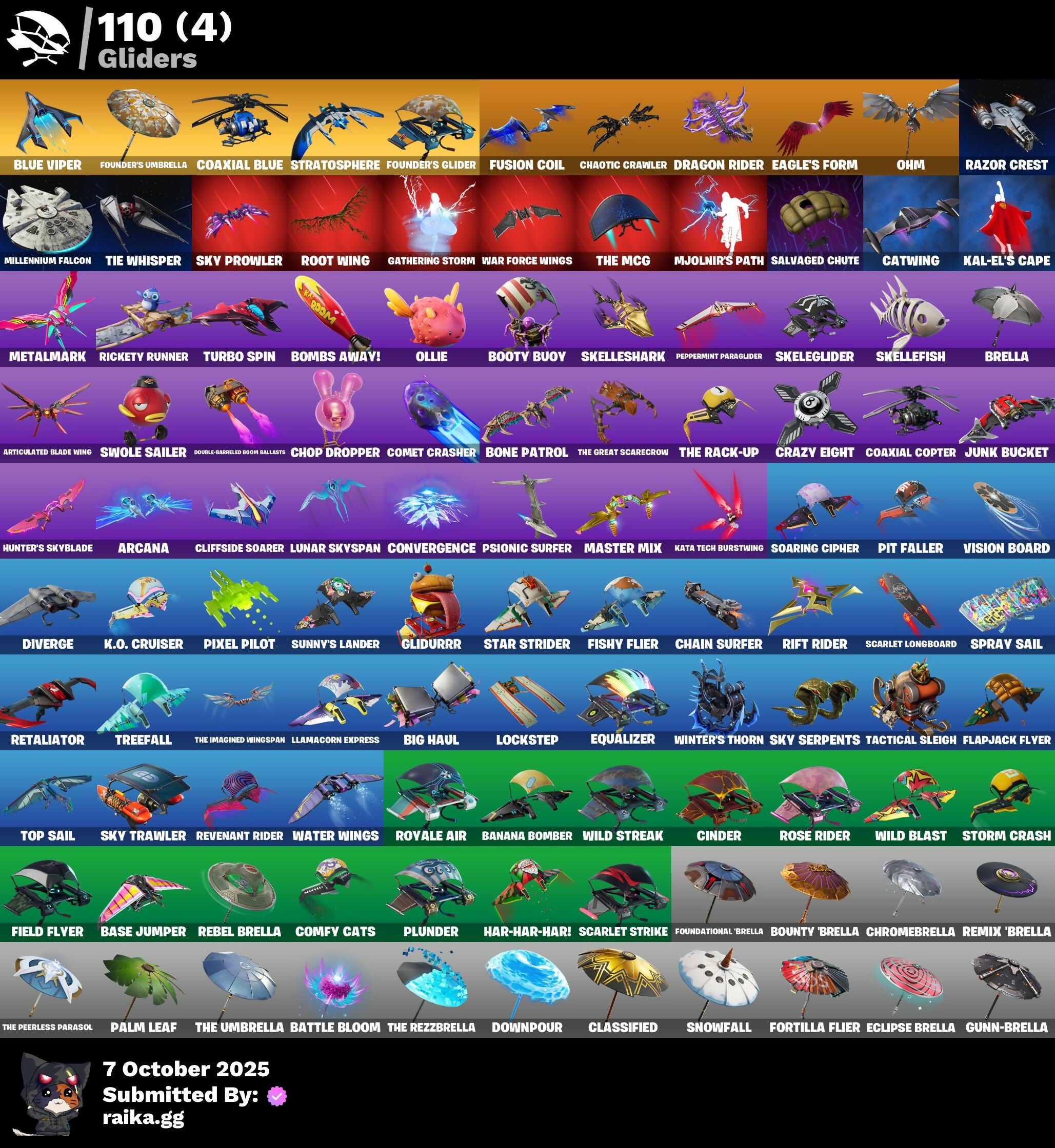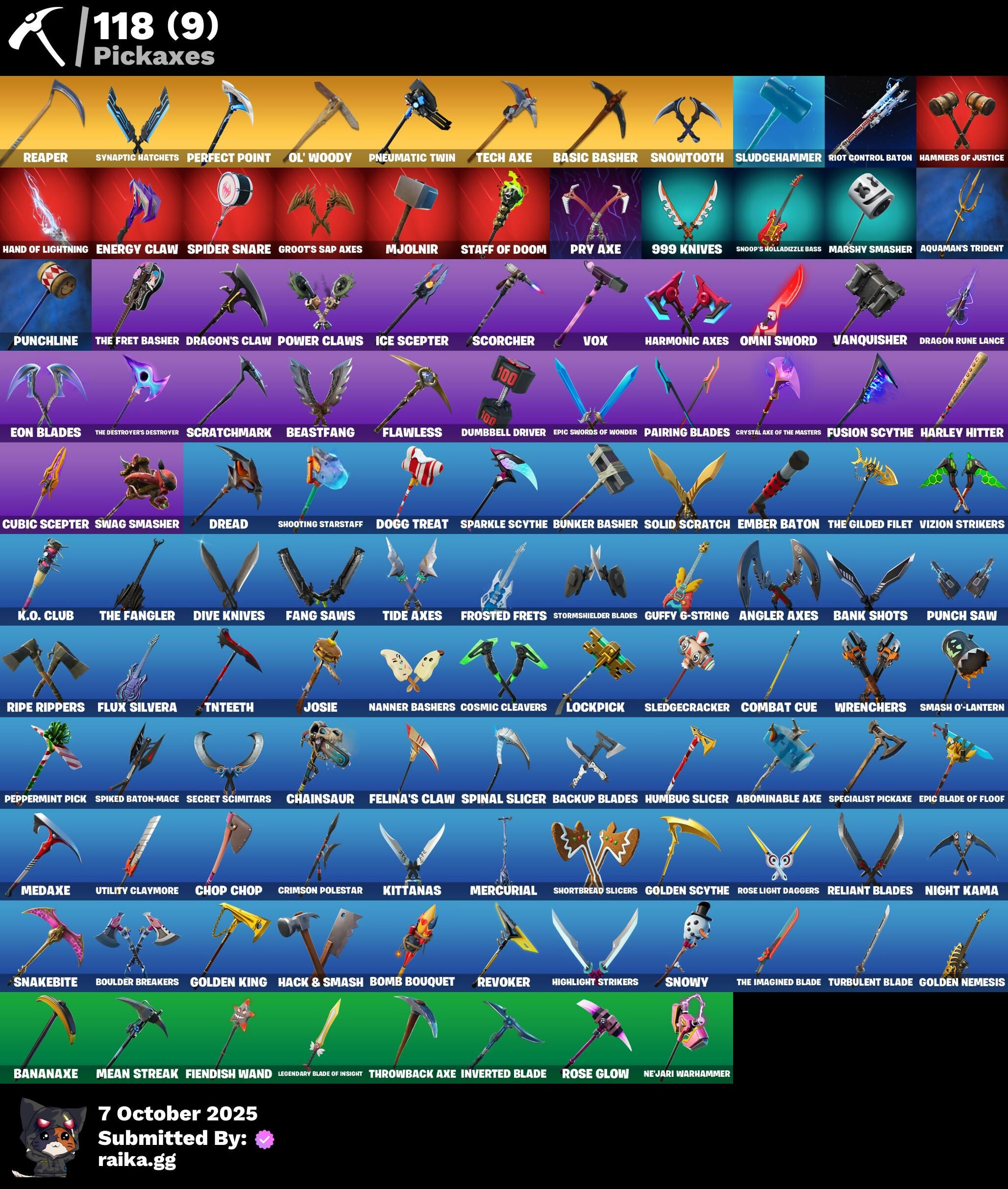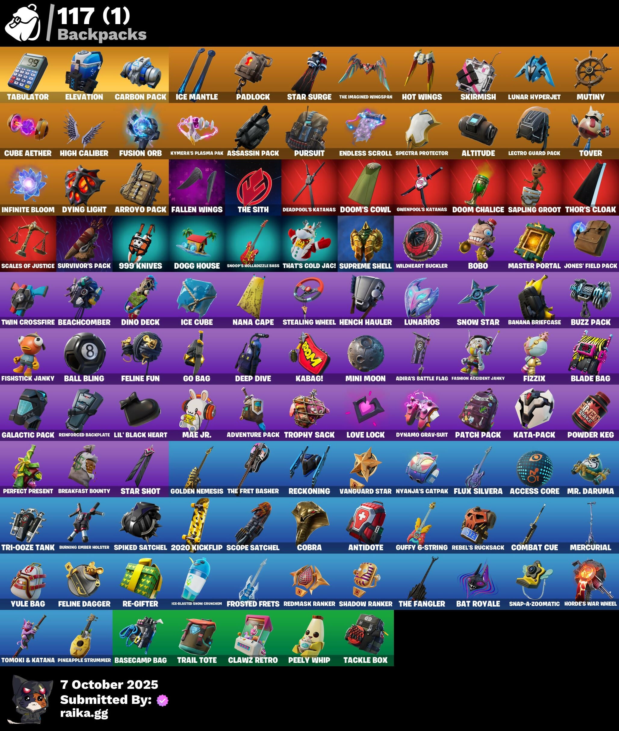 1-Ball, 2020 Kickflip, 8-Ball vs Scratch, 999 Knives, Abominable Axe, Access Core, Adira, Adira’s Battle Flag, Adventure Pack, Agent Jones, Agent Peely, Air Horn, Air Shredder, Altitude, Angler Axes, Antidote, Aquaman, Aquaman's Trident, Arcana, Arctic Adeline, Arroyo Pack, Articulated Blade Wing, Assassin Pack, Backup Blades, Ball Bling, Banana Bomber, Banana Briefcase, Bananaxe, Bank Shots, Base Jumper, Basecamp Bag, Basic Basher, Bat Royale, Battle Bloom, Battle Call, Beachcomber, Beastfang, Beep Beep, Big Haul, Blackheart, Blade Bag, Blowin' Up, Blowing Bubbles, Blue Viper, Bobo, Boing!, Bomb Bouquet, Bombs Away!, Bone Patrol, Boogie Down, Boomin', Booty Buoy, Boulder Breakers, Bounty 'Brella, Breakfast Bounty, Breakneck, Brella, Brutus, Bunker Basher, Bunker Jonesy, Burning Ember Holster, Buzz Pack, Call Me, Cameo vs Chic, Carbon Commando, Carbon Pack, Cardistry, Cat Flip, Catalyst, Catwing, Cauldron Chill, Chain Surfer, Chainsaur, Chaos Director, Chaotic Crawler, Charlotte, Chop Chop, Chop Dropper, Chromebrella, Cinder, Classified, Clawz Retro, Clean Sweep, Cliffside Soarer, Cloud Striker, Cluck Strut, Coaxial Blue, Coaxial Copter, Cobalt, Cobra, Coin Flip, Combat Cue, Comet Crasher, Comfy Cats, Conga, Convergence, Cosmic Cleavers, Crazy Eight, Crimson Polestar, Crowning Achievement, Crystal Axe Of The Masters, Cube Aether, Cubic Scepter, Cyclo Curl, Dabstand, Daywalker's Kata, Deadpool, Deadpool’s Katanas, Deep Dive, Demi, Dino Deck, Dive Knives, Diverge, Doctor Doom, Dogg House, Dogg Treat, Doom Chalice, Doom’s Cowl, Double-Barreled Boom Ballasts, Downpour, Doze Dab, Dragon Rider, Dragon Rune Lance, Dragon Stance, Dragon's Claw, Dread, Droop, Dumbbell Driver, Dying Light, Dynamo Grav-Suit, Dynamo Tntina, Eagle's Form, Eclipse Brella, Elevation, Ember, Ember Baton, Endless Scroll, Energy Claw, Eon Blades, Epic Blade Of Floof, Epic Swords Of Wonder, Equalizer, Evasive Maneuvers, Evie, Fade, Fallen Love Ranger, Fallen Wings, Fang Saws, Fashion Accident Janky, Featherweight, Felina, Felina's Claw, Feline Dagger, Feline Fun, Field Flyer, Fiendish Wand, Fierce, Fishstick Janky, Fishy Flier, Fixer, Fizzix, Flapjack Flyer, Flawless, Flippin' Away, Flux Silvera, Fortilla Flier, Foundational 'Brella, Founder's Glider, Founder's Umbrella, Free Flow, Frosted Frets, Fusion, Fusion Coil, Fusion Orb, Fusion Scythe, GGWP, Galactic Pack, Gathering Storm, Gear Specialist Maya, Get Funky, Glidurrr, Go Bag, Golden King, Golden Nemesis, Golden Scythe, Golf Clap, Good Game, Well Played, Groot, Groot's Sap Axes, Guffy 6-String, Guggimon, Gunn-Brella, Gunnar, Gwenpool’s Katanas, Hack & Smash, Hammers Of Justice, Hand Of Lightning, Har-Har-Har!, Harley Hitter, Harley Quinn, Harmonic Axes, Hello Friend, Hench Hauler, High Caliber, High Five, Highlight Strikers, Hoop Master, Hootenanny, Horde’s War Wheel, Hot Wings, Hula Hoopin', Humbug Slicer, Hunter's Skyblade, Hybrid, I Declare!, Ice Cube, Ice Mantle, Ice Scepter, Ice-Blasted Snow Crunchem, Infinite Bloom, Introducing..., Inverted Blade, It Is Finished, Jaywalking, Jennifer Walters, Jet Signals, John Wick, Jones’ Field Pack, Josie, Journey vs Hazard, Jules, Jump Jets, Jun-Hwan, Junk Bucket, K.O. Club, K.O. Cruiser, Kabag!, Kal-El's Cape, Kata Tech Burstwing, Kata-Pack, Keep It Mello, Keyed Up, Kiara K.O., Kit, Kittanas, Kymera, Kymera’s Plasma Pak, Laguna, Lara Croft, Lectro Guard Pack, Legendary Blade Of Insight, Lil' Prancer, Lil' Saucer, Lil’ Black Heart, Lllamacorn Express, Lockpick, Lockstep, Longshot, Love Lock, Lt. Evergreen, Lunar Hyperjet, Lunar Skyspan, Lunarios, Luxe, Lynx, Mae Jr., Mancake, Mandalorian, Marshy Smasher, Master Key, Master Mix, Master Portal, Mave, Mean Streak, Medaxe, Meowdas, Meowscles, Mercurial, Metalmark, Mic Drop, Millennium Falcon, Mini Moon, Mjolnir, Mjolnir's Path, Mr. Daruma, Mutiny, Nana Cape, Nana Nana, Nanner Bashers, Nejari Warhammer, Night Kama, Nyanja’s Catpak, Ocean, Ohm, Ol' Woody, Ollie, Omni Sword, Onesie, Padlock, Pairing Blades, Palm Leaf, Pandemonium, Patch Pack, Paws & Claws, Peace Out, Peely, Peely Whip, Peppermint Paraglider, Peppermint Pick, Perfect Point, Perfect Present, Pineapple Strummer, Pit Faller, Pixel Pilot, Planetary Vibe, Plunder, Pneumatic Twin, Point It Out, Powder, Powder Keg, Power Claws, Predator, Prodigy, Prowler, Pry Axe, Psionic Surfer, Punch Saw, Punchline, Purr-Demonium, Pursuit, Raz, Razor Crest, Re-Gifter, Reaper, Rebel Brella, Rebel’s Rucksack, Reckoning, Redmask Ranker, Reese, Reinforced Backplate, Reliant Blades, Remedy vs Toxin, Remix 'Brella, Resistance Thumbs Up, Respect The Peace, Retaliator, Revenant Rider, Revoker, Rhythm Of Chaos, Rickety Runner, Ride The Pony, Rift Rider, Riot Control Baton, Ripe Rippers, Rippley vs Sludge, Root Wing, Rose Glow, Rose Light Daggers, Rose Rider, Rose Team Leader, Rox, Royale Air, Ruin, Sad Trombone, Salvaged Chute, Santa Dogg, Sapling Groot, Sasquatchin', Scales of Justice, Scarlet Longboard, Scarlet Strike, Scootin', Scope Satchel, Scorcher, Scratchmark, Scuba Jonesy, Secret Scimitars, Segway Tour, Sentinel, Sgt. Winter, Shadow Ranker, Shaolin Sip, Sharpshooter, Shimmer, Shooting Starstaff, Shortbread Slicers, Show 'Em Off, Side Hustle, Sidewinder, Sign Spinner, Sing Along, Siona, Ska-Stra-Terrestrial, Skatemonster, Skeleglider, Skellefish, Skelleshark, Skirmish, Sky Prowler, Sky Serpents, Sky Trawler, Skye, Slayer Juice Wrld, Sledgecracker, Sludgehammer, Smash O'-Lantern, Snakebite, Snap, Snap-A-Zoomatic, Snoop Dogg, Snoop's Holladziile Bass, Snoop’s Holladazzle Bass, Snoozefest, Snow Sniper, Snow Star, Snowfall, Snowfoot, Snowshaker, Snowtooth, Snowy, So Square, Soaring Cipher, Solid Scratch, Sparkle Scythe, Sparkle Supreme, Specialist Pickaxe, Spectra Protector, Spider Snare, Spiked Baton-Mace, Spiked Satchel, Spinal Slicer, Spray Sail, Square Up, Staff Of Doom, Star Shot, Star Strider, Star Surge, Stealing Wheel, Storm, Storm Crash, Stormshielder Blades, Stratosphere, Stratus, Stride, Sunny, Sunny's Lander, S