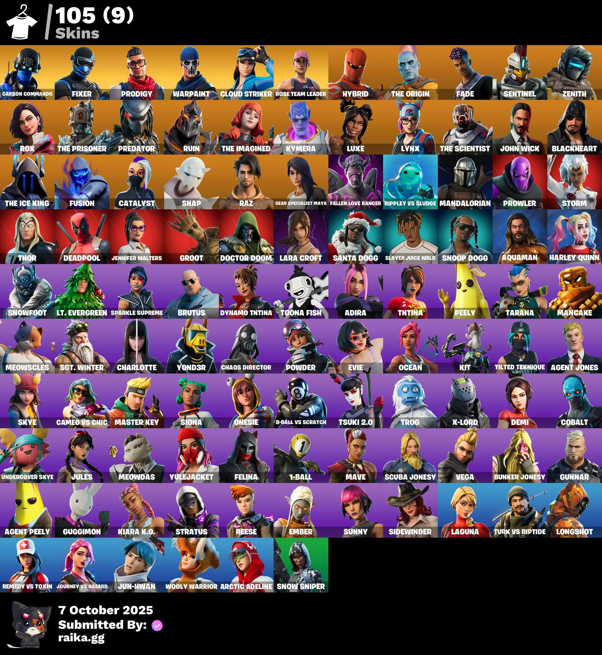 [PC/PSN/XBOX] 105 skins | OG STW | Carbon Commando | Fixer | Prodigy | Cloud Striker | Hybrid | The Origin | Fade | Sentinel | Zenith | Rox | The Prisoner | 900 VB