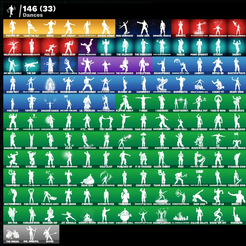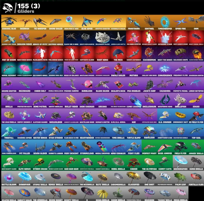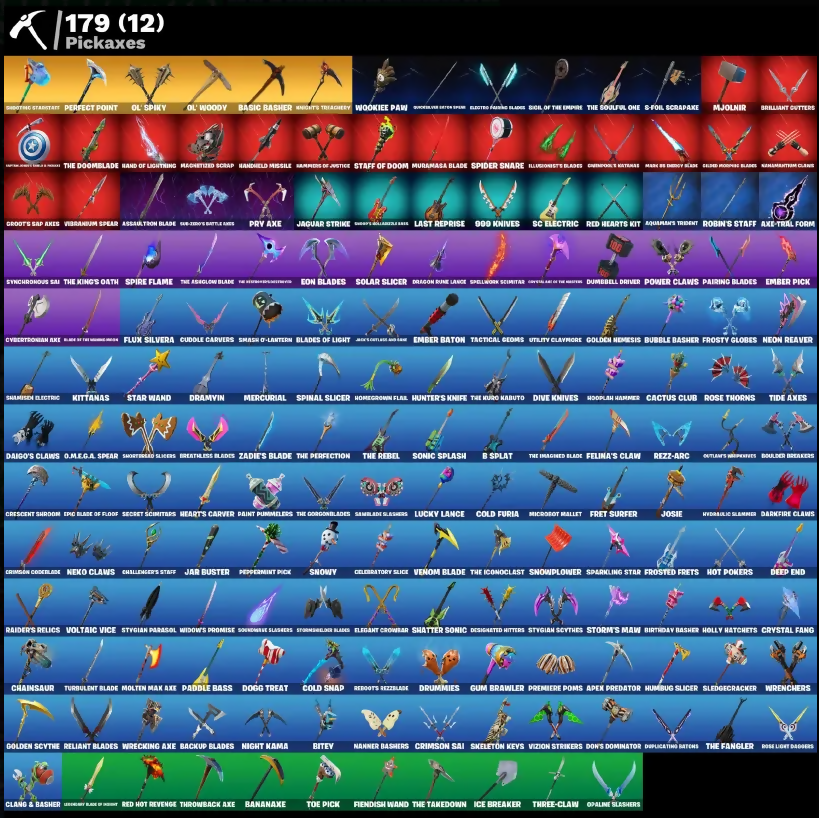 (Snikt!), 009 Knives, Adarte Movement, Adira (Battle Mask), Aerial Acrobat, Agent Jones (Jump 31), Air Shredder, Apex Predator, Aquaman’s Trident, Arcana, Arcane Energy Glider, Arcane Research, Arctic Adeline, Articulated Blade Wing, Assault Ion Blade, Aw, Shucks., Axe-Trail Form, Ayla Winn, B Splat, Backstroke, Backup Blades, Bananaxe, Baron's Hoard, Base Jumper, Basic Basher, Battle Bloom, Baymax Wings, Bean Bag, Beep Beep, Big Fan, Birdaring Flourish, Birdie, Birthday Basher, Bitey, Black Beet To Top Revive Aura, Black One X-Wing, Black Panther (Shuri), Black Queen, Blade Raven, Blades of Light, Blitz Brella, Blowin' Up, Blue Viper, Bombastic, Bone Patrol, Boogie Down, Boosting Ki, Boots'n Cats, Boulder Breakers, Bounty Brella, Breaking Point, Breathless Blades, Brella, Brilliant Cutters, Bring It, Brite Moves, Brush Your Shoulders, Bubble Basher, Bubbloon, Bullet Rider, Bunny Brawler, Cacodemon, Cactus Club, Call Me, Captain America’s Shield & Hammer, Captain Elamerica, Captain Jones, Captain's Glider, Carbon Commando, Cardistry, Catnipcurl’s Katanas, Cauldron Chill, Cazadora, Celebratory Slice, Chainsaur, Challenger’s Staff, Cheer Bolt, Chemist's Cloudglider, Chillest Vibe Rider, Choice Knit, Chrome Punk, Chromebrella, Cinder, Clang & Basher, Classic Homecat Cruiser, Classic Peelyverine, Classified, Clean Sweep, Cliffside Soarer, Cloud Striker, Cluck (Slurpy), Coaxial Blue, Cold Furia, Cold Snap, Comet Crasher, Comfy Cats, Competitor's Final Drill, Convergence, Coogsmotifs Cleanup, Count It!, Crescent Shroom, Crimson Codeblade, Crimson Sai, Crown And Achievement, Cryptic Coaster, Crystal, Crystal Fang, Cuddle Carvers, Cuddly Cloudcruiser, Curling Iron, Cybertronian Axe, Cyclo Curl, D.M.E.Q.A. Suit Alpha, Dagger Dance, Daigo’s Claws, Dark Charger, Dark Side, Darkfire Claws, Darklands White Raider, Darth Vader, Dealer's Deck, Deep Dab, Deep End, Delivery Blade of Light, Designated Hitters, Die With A Smile, Die With A Smile Bruno, Dive Knives, Doctor Doom, Dogg Treat, Don’s Dominator, Doom, Doom Brella, Downpour, Doze Dab, Dragon Rider, Dragon Rune Lance, Dramvin, Drome Drifter, Drummies, Dual-Band Battle Axes, Dumbbell Driver, Duplicating Batons, Dusk Knight, Eclipse Brella, Eggar, Electro Fang Blades, Elegant Crowbar, Elite Servo, Ember Baton, Ember Pick, Emergency Raft, End Day Set Mining Mode, Energized Godzilla, Energy Daggers and Axe, Eon Blades, Epic Blade of Floor, Equalizer, Evasive Maneuvers, Everything's End, Evo (Summer Strider), Fade, Fan Fervor, Felina, Felina’s Claw, Field Flyer, Fiendish Wand, Fiery Descent, Fire Show, Fireworks Salvo, Fishy Flier, Fist Bump, Fist Of Doom, Fixer, Flapjack Flyer, Flippin' Away, Flux Silvera, Foil Flex, Follow The Butterfly, Fortilla Flier, Foundational Brella, Frequency Flyer, Fret Surfer, Frostburn, Frosted Frets, Frosty Globes, Gathering Storm, Gilded Morning Blades, Golden Nemesis, Golden Scythe, Golf Clap, Good Game, Well Played, Good Guy, Gothic Shadesoarer, Grand Glacier Glider, Groot (Silver Foil), Groot’s Sap Axes, Guardian Jade, Gum Brawler, Gun Show, Gunn-Brella, Gwen-Step, Gwenpool, Hammers of Justice, Hand of Lightning, Handheld Missile, Hang Loose, Har-Har-Har!, Haylee Skye, Heart Sign, Heartburst, Heartwinder, Heart’s Carver, Hellfire Dance, Hello Friend, High Society Glider, Holiday Boxy, Holly Hatchets, Holographic, Homegrown Flail, Hoopla Hammer, Hot Marat, Hot Ponkars, Humbug Slicer, Hunter’s Knife, Hydraulic Slicer, Hype!, Hypnot Eyes, I Declare!, IQ Field Flyer, Ibiza (Ibiza Party Diamond), Ice Breaker, Illusionist’s Blades, Illusory Mysterio, Imperial March, Indiana Jones (Temple Explorer), Invasion, Invisible Cut, Iridia Vayne, It Is Finished, It's... You?, Jack's Ship, Jaguar Striker, Jake’s Cutlass and Pole, Jar Buster, Jennifer Walters, Jet Signals, Josie, Jules, Jun-Hwan, Junker 'Brella, K.O. Cruiser, Kendo, Keyed Up, Killswitch, Kintsugi Daigo, Kit, Kittanas, Knights Treachery, Krisabelle, Lambda-Class Shuttle, Last Reprise, Leafy Longboardin', Lightfoot Soulja Awareness, Lightrider, Lil' Godzilla Attack, Lil' Prancer, Lina Scorch, Love It!, Lt. Evergreen, Lucky Lance, Lucky Nyanja, Lunar Skyspan, Magnetized Scrap, Make A Seat, Mark 90 Flight Pack, Mark of D'indy Skye, Mask Of Balance, Masked, Masterpiece Bubble, Mega-Brella, Mercurial, Microsoft Mallet, Mighty Marvel Stella, Millennium Falcon, Min-Joon, Mini Dogfight, Mjolnir, Mjolnir's Path, Mobile Megalodon, Moley (Solitary Defender), Molten Max Axe, Morgan Myst, Mothra, Muramasa Blade, Mystery's Magic Trick, Mystique, Nailed It, Nana-Brella, Nanmanhattan Claws, Nanner Bashers, Needle Dropper, Neko Claws, Neon Man O War, Neon Reaver, Neymar Jr (Exhibition), Night Hunter Scarr, Night Kama, Ninja Stance: Donnie, Ninja Stance: Leo, Ninja Stance: Mikey, Ninja Stance: Raph, Nitro Fusion Roland Doom, Nomad's Drifter, Nue, O.M.E.G.A. Aerial, O.M.E.G.A. Spear, O.P.E.G.A. Diagnostic, Ocean, Ohm, Oki Doki, Ol' Spiky, Ol' Woody, On Your Mark..., One Shot, Oopsy Drones-Y, Opaline Slashers, Origami Battalion, Outlaw’s Warpivots, Overseer Axe of the Masters, Oxide Rust, Paddle Bass, Paint Pummelfists, Pairing Blades, Palm Leaf, Party Hips, Pea Part Harmony, Pea-Rigibles, Peel Out, Peel Verine Wings, Peppermint Paraglider, Peppermint Pick, Perfect Pivot, Perfect Point, Persephone, Phaedra, Pig-Chem Scooter, Pit Faller, Planetary Vibe, Plastic Patroller, Point & Shoot, Polar Peely, Power Claws, Pray Axe, Premiere Poms, Promenade, Protector Kaito, Psionic Surfer, Pumped!, Punched Up, Punk Powerglider, Puppet Dance, Puppet's Prowl, Quicksilver Baton Spear, Rage Quit, Raider’s Relics, Raise The Roof, Ranger's Doom Brella, Raven's Legion, Raz, Rebel Brella, Rebirth Raven, Reboot Man, Reboot’s Rezzblade, Red Card, Red Hearts Kit, Red Hot Revenge, Red Robin's Wings, Red Roots Billie, Regal Wave, Reliant Blades, Remix Brella, Respect & Peace, Rezz-Arc, Rezzblocks, Rezzboard, Rise Thorns, Robin, Robin’s Staff, Rollie, Root Wing, Rose Light Daggers, 