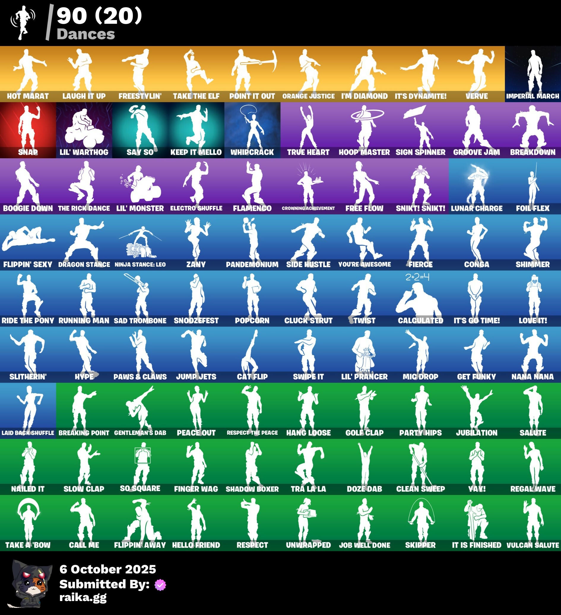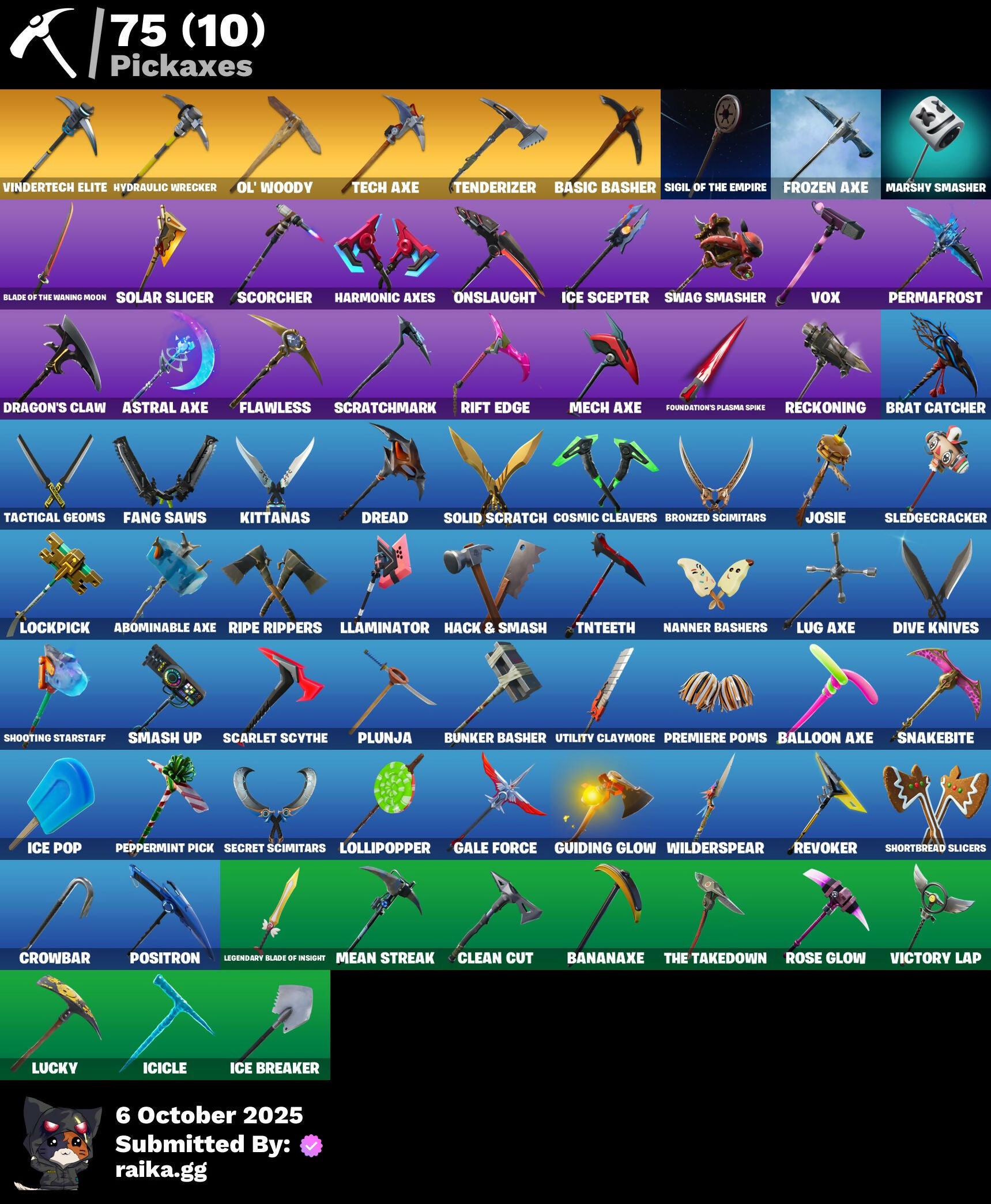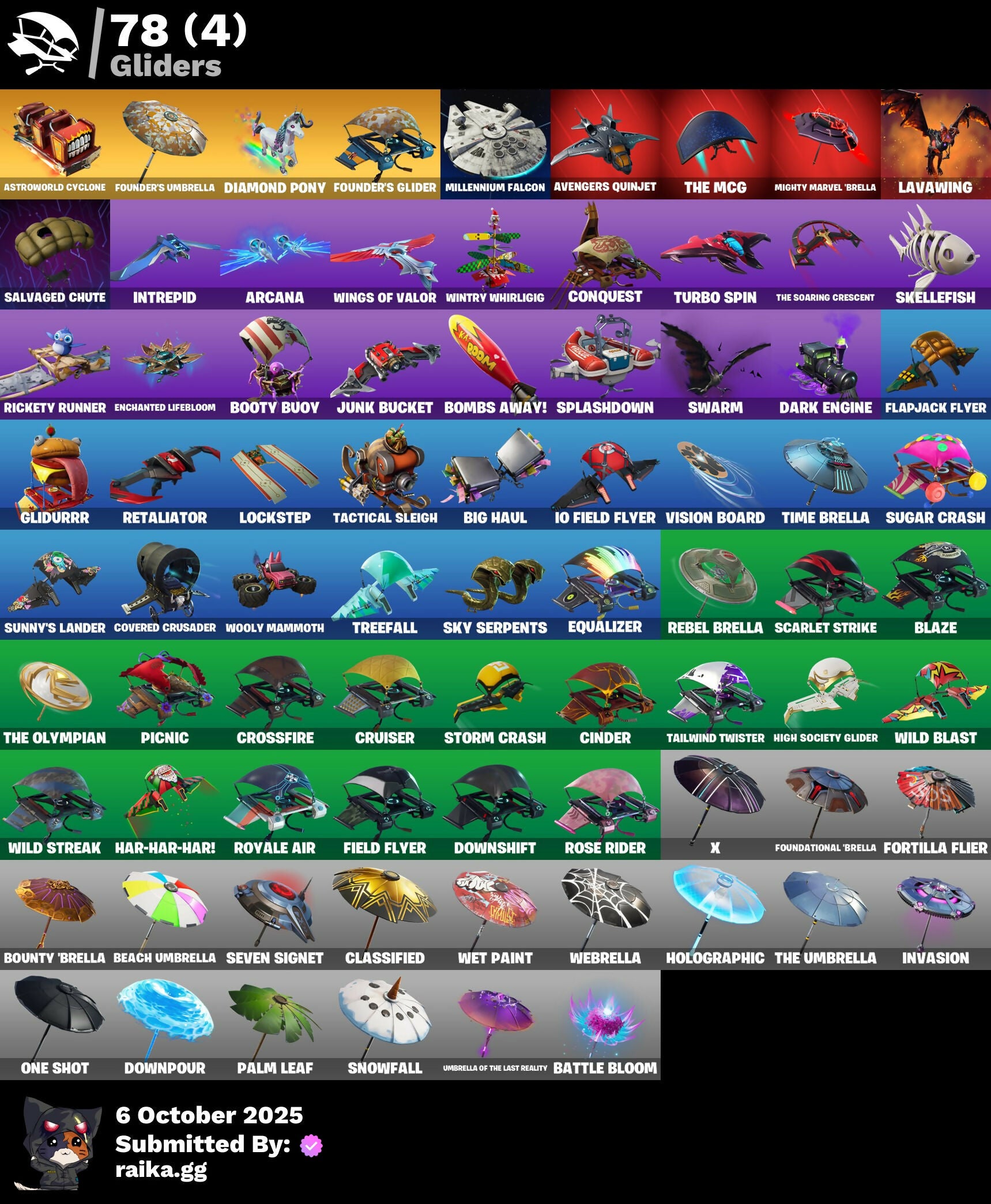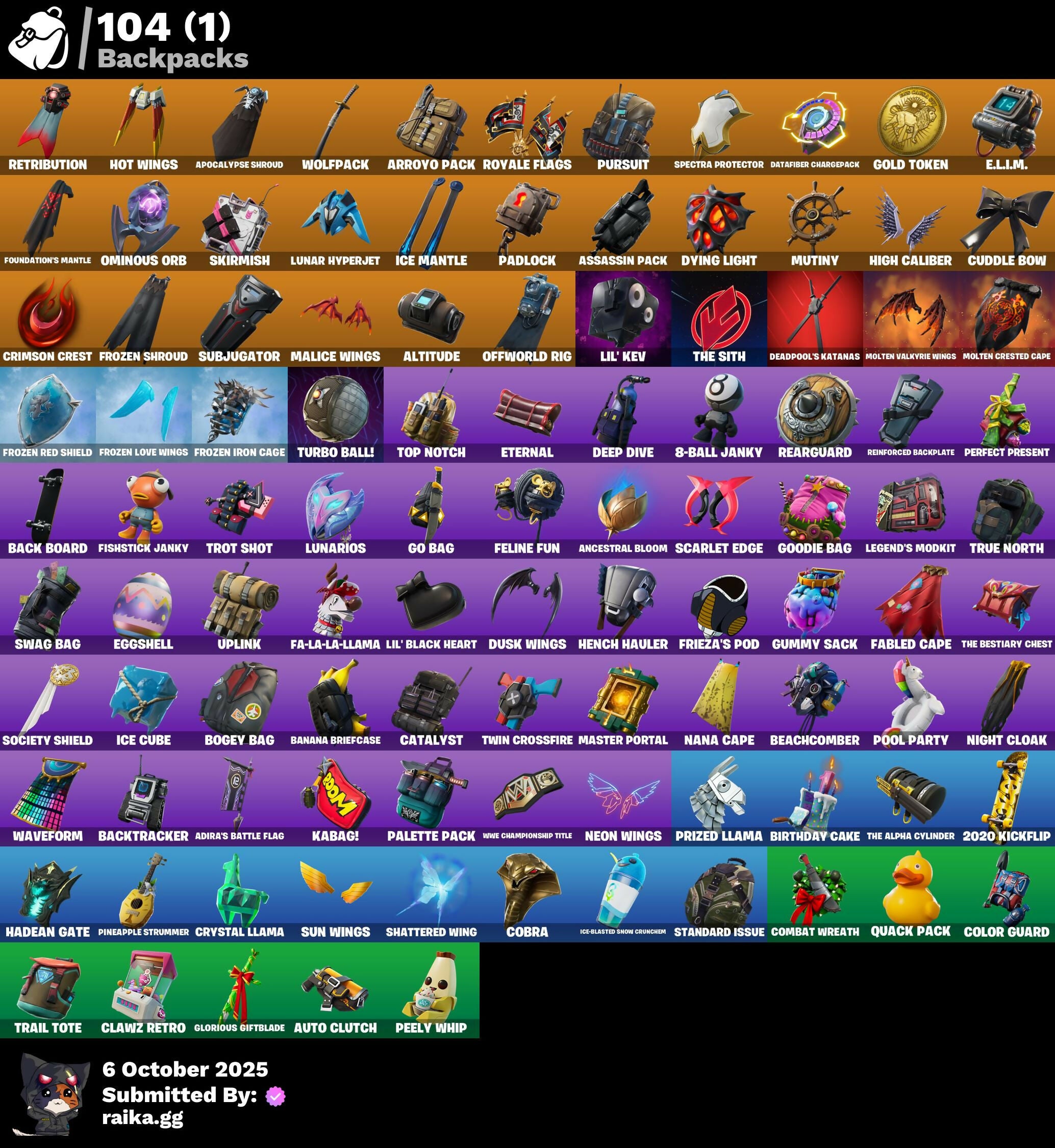 2020 Kickflip, 8-Ball Janky, A.I.M., Abominable Axe, Adira's Battle Flag, Agent Peely, Altitude, Ancestral Bloom, Apocalypse Shroud, Arcana, Arctic Adeline, Arroyo Pack, Assassin Pack, Astral Axe, Astroworld Cyclone, Aura, Auto Clutch, Avengers Quinjet, Back Board, Backtracker, Balloon Axe, Banana Briefcase, Bananaxe, Basic Basher, Battle Bloom, Battlehawk, Beach Umbrella, Beachcomber, Big Haul, Birthday Cake, Blackheart, Blade Of The Waning Moon, Blaze, Bogey Bag, Bombs Away!, Boogie Down, Booty Buoy, Bounty 'Brella, Brat Catcher, Breakdown, Breaking Point, Bronzed Scimitars, Brutus, Bunker Basher, Bunker Jonesy, Bunny Brawler, Calamity, Calculated, Call Me, Carbide, Cat Flip, Catalyst, Cinder, Classified, Clawz Retro, Clean Cut, Clean Sweep, Cluck Strut, Cobalt, Cobra, Color Guard, Combat Wreath, Commando, Conga, Conquest, Cosmic Cleavers, Covered Crusader, Crimson Crest, Crossfire, Crowbar, Crowning Achievement, Cruiser, Crystal Llama, Cuddle Bow, Cuddle Team Leader, DJ Yonder, Dark Engine, Datafiber Chargepack, Deadpool, Deadpool's Katanas, Deep Dive, Demi, Diamond Pony, Dire, Dive Knives, Downpour, Downshift, Doze Dab, Dragon Stance, Dragon's Claw, Dread, Dream, Drift, Dusk, Dusk Wings, Dying Light, E.L.I.M., Eggshell, Electro Shuffle, Ember, Enchanted Lifebloom, Enforcer, Equalizer, Eternal, Fa-La-La-Llama, Fable, Fabled Cape, Fang Saws, Fate, Feline Fun, Field Flyer, Fierce, Finger Wag, Fishstick Janky, Flamenco, Flapjack Flyer, Flawless, Flippin' Away, Flippin' Sexy, Foil Flex, Fortilla Flier, Foundation's Mantle, Foundation's Plasma Spike, Foundational 'Brella, Founder's Glider, Founder's Umbrella, Free Flow, Freestylin', Frieza, Frieza's Pod, Frosty Lou Ranger, Frozen Axe, Frozen Iron Cage, Frozen Love Wings, Frozen Raven, Frozen Red Knight, Frozen Red Shield, Frozen Shroud, Gale Force, Gear Specialist Maya, Gentleman's Dab, Get Funky, Giddy-Up, Glidurrr, Glorious Giftblade, Go Bag, Goku Black, Gold Token, Golf Clap, Goodie Bag, Grill Sergeant, Groove Jam, Guff Gringle, Guiding Glow, Gummy Sack, Hack & Smash, Hadean Gate, Hang Loose, Har-Har-Har!, Harmonic Axes, Hello Friend, Hench Hauler, High Caliber, High Society Glider, Holographic, Hoop Master, Hot Marat, Hot Wings, Huntress, Hybrid, Hydraulic Wrecker, Hype, I'm Diamond, Ice Breaker, Ice Cube, Ice Mantle, Ice Pop, Ice Scepter, Ice-Blasted Snow Crunchem, Icicle, Imperial March, Intrepid, Invasion, Io Field Flyer, It Is Finished, It's Dynamite!, It's Go Time!, Job Well Done, John Cena, John Wick, Josie, Jubilation, Jump Jets, Jungle Scout, Junk Bucket, Kabag!, Keep It Mello, Kittanas, Laguna, Laid Back Shuffle, Laugh It Up, Lavawing, Legend's Modkit, Legendary Blade Of Insight, Lil' Black Heart, Lil' Kev, Lil' Monster, Lil' Prancer, Lil' Warthog, Llaminator, Lockpick, Lockstep, Lollipopper, Love It!, Lt. John Llama, Lucky, Lug Axe, Lunar Charge, Lunar Hyperjet, Lunarios, Luxe, Lynx, Malice, Malice Wings, Marshmello, Marshy Smasher, Master Key, Master Portal, Mean Streak, Mech Axe, Meowscles, Mic Drop, Mighty Marvel 'Brella, Millennium Falcon, Min-Joon, Molten Battle Hound, Molten Crested Cape, Molten Valkyrie, Molten Valkyrie Wings, Mutiny, Nailed It, Nana Cape, Nana Nana, Nanner Bashers, Neon Wings, Night Cloak, Nightshade, Ninja Stance: Leo, Nog Ops, Offworld Rig, Ol' Woody, Omega, Ominous Orb, One Shot, Onesie, Onslaught, Orange Justice, Padlock, Palette Pack, Palm Leaf, Pandemonium, Paradox, Party Hips, Pathfinder, Paws & Claws, Peace Out, Peely, Peely Whip, Peppermint Pick, Perfect Present, Permafrost, Picnic, Pineapple Strummer, Plunja, Point It Out, Pool Party, Popcorn, Posed Playmaker, Positron, Powder, Premiere Poms, Prized Llama, Pursuit, Quack Pack, Ragnarok, Rearguard, Rebel Brella, Reckoning, Recon Specialist, Red-Hood Raider, Redline, Regal Wave, Reinforced Backplate, Respect, Respect The Peace, Retaliator, Retribution, Revoker, Rickety Runner, Ride The Pony, Rift Edge, Ripe Rippers, Rogue Agent, Ronin, Rook, Rose Glow, Rose Rider, Rose Team Leader, Rox, Royale Air, Royale Flags, Ruin, Running Man, Sad Trombone, Salute, Salvaged Chute, Say So, Scarlet Defender, Scarlet Edge, Scarlet Scythe, Scarlet Strike, Scorcher, Scratchmark, Secret Scimitars, Sentinel, Seven Signet, Sgt. Winter, Shadow Boxer, Shanta, Shattered Wing, Shimmer, Shooting Starstaff, Shortbread Slicers, Side Hustle, Sidewinder, Sigil Of The Empire, Sign Spinner, Singularity, Skellefish, Skipper, Skirmish, Sky Serpents, Sled Ready Guff, Sledgecracker, Sledgehammer, Slitherin', Slow Clap, Smash Up, Snakebite, Snap, Snikt! Snikt!, Snoozefest, Snorkel Ops, Snowfall, So Square, Society Shield, Solar Slicer, Solid Scratch, Spectra Protector, Splashdown, Squad Leader, Standard Issue, Storm Crash, Stratus, Subjugator, Sugar Crash, Summit Striker, Sun Strider, Sun Wings, Sunbird, Sunny's Lander, Swag Bag, Swag Smasher, Swarm, Swipe It, TNTina, Tactical Geoms, Tactical Sleigh, Tailwind Twister, Take A' Bow, Take The Elf, Tech Axe, Teknique, Tenderizer, The Ace, The Alpha Cylinder, The Bestiary Chest, The Foundation, The Ice King, The Mcg, The Olympian, The Prisoner, The Rick Dance, The Sith, The Soaring Crescent, The Takedown, The Umbrella, The Visitor, Tilted Teknique, Time Brella, Tnteeth, Top Notch, Tra La La, Trail Tote, Trailblazer, Treefall, Trog, Trot Shot, True Heart, True North, Turbo Ball!, Turbo Spin, Twin Crossfire, Twist, Umbrella Of The Last Reality, Unwrapped, Uplink, Utility Claymore, Valor, Vega, Vendetta, Verge, Verve, Victory Lap, Vindertech Elite, Vision Board, Vox, Vulcan Salute, WWE Championship Title, Warpaint, Waveform, Webrella, Wet Paint, Whipcrack, Whistle Warrior, Wild Blast, Wild Streak, Wilde, Wilderspear, Wingman, Wings Of Valor, Wintry Whirligig, Wolfpack, Wooly Mammoth, Wukong, X, X-Lord, Yay!, You're Awesome, Yuletide Ranger, Zany, Zenith, Zoey