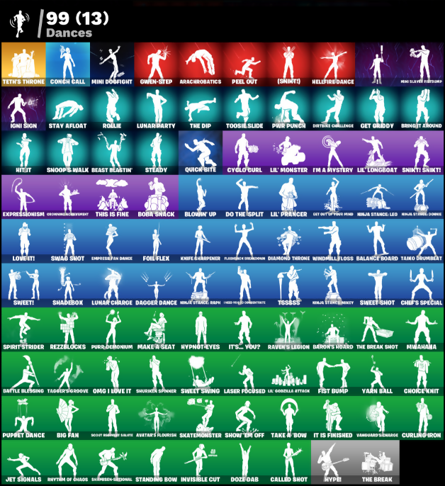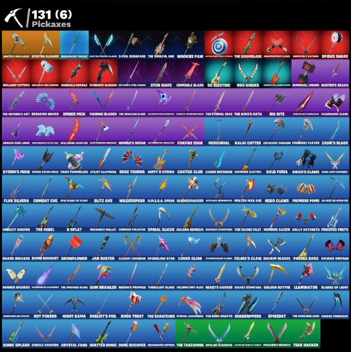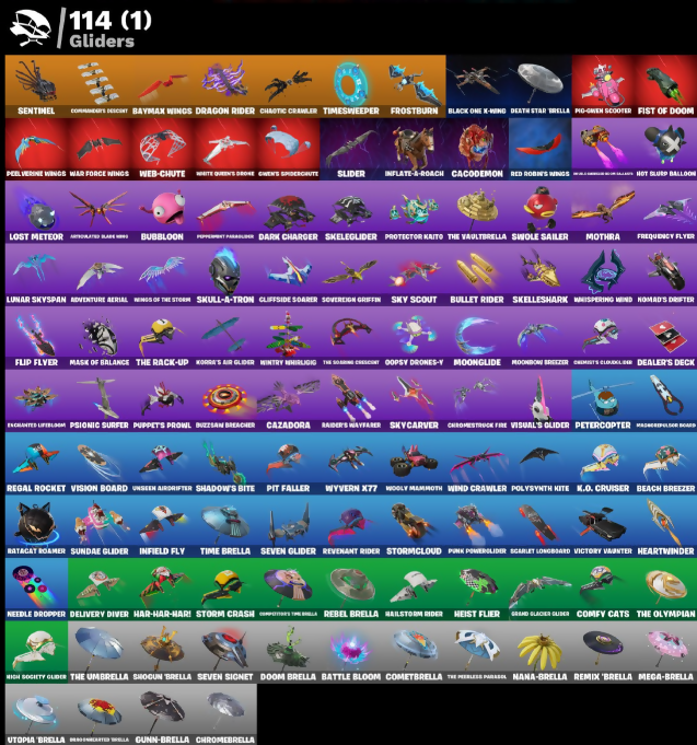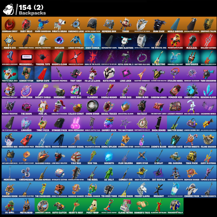 (Snikt!), 1-Ball, 999 Knives, Adira, Admiral's Battle Flag, Adventure Aerial, Ala Moana’s Boomerang, Ancestral Bloom, Aphrodite, Apocalypse Shroud, Arachrobatics, Arctic Adeline, Astroblated Blade Wings, Aura, Auto Clutch, Avatar's Flourish, B Splat, B-Splat, Back Board, Backup Blades, Balance Board, Baron's Hoard, Bat Royale, Battle Blessing, Battle Bloom, Baymax Wings, Beach Breezer, Beacon Glass, Beast Blastin', Beast Boy, Big Bite, Big Fan, Bitter Sweets, Black One X-Wing, Blackened Shield, Blade of the Waning Moon, Bladed Travpak, Blades of Light, Blitz Axe, Blowin' Up, Board Breaker, Boba Bling, Boba Snack, Bomb Bouquet, Breaking Waves, Brilliant Cutters, Bring It Around, Brite Bag, Brite Bomber, Brite Gunner, Broadwatershell 'Brella, Bronzed Scimitars, Bubbloon, Bullet Rider, Bun Bun Bang Bang, Bunsen Backburner, Buzzsaw Breacher, Bytes, Cacodemon, Cactus Club, Calico-Coconut, Called Shot, Captain America’s Shield & Pickaxe, Captain's From Voidbuster, Cazadora, Cazadora Wings, Celebratory Slice, Cerberus, Chaos Director, Chaotic Crawler, Charge Pack, Chef's Special, Chemist's Cloudglider, Choice Knit, Chow Down, Chrome Punk, Chromebrella, Chromeseed, Chromestruck Fire, Chronos Lock, Clawbox, Clawz Retro, Cloaked Shadow, Cold Furia, Combat Cue, Cometbrella, Comfy Cats, Commander's Descent, Conch Call, Coochi Titan, Cozy Chomps, Cozy Conch, Crescent Shroom, Crimson Crest, Crimson Pollstar, Crowndancer Emment, Crucible Blade, Crystal Fang, Cuddle Carvers, Curling Iron, Cursed Marionette, Cyclo Curl, Dagger Dance, Daigo, Daigo’s Claws, Dark Charger, De-Rezz De-Stroyer, Dealer's Deck, Death Star 'Brella, Delivery Diver, Designated Hitters, Diamond Throne, Diamondclaw Picker, Dieselback Pack, Dirtbike Challenge, Do The Split, Dogg Treat, Doggo, Doom, Doom Brella, Doom Protector Gloves, Doom Slayer, Doom's Cloak, Double Header, Doze Dab, Dragon Rider, Dragon Rune Lance, Dragonshore Trident, Dreamer's Two-Shot, Duelist’s Foil, Dumbbell Driver, Dune Scooper, Dusk Knight, Dusty, Dynamo TNTina, Electric Shredder, Electro Fang Blades, Elegant Crowbar, Ember Pick, Emma Frost, Empress Fan Dance, Enchanted Lifebloom, Epic Blade of Floof, Era, Eternal Ranker, Eternal Razorwing, Evie, Expressionism, Fa-Lu-La-Llama, Fanged Foresight, Felina, Felina’s Claw, Feline Dagger, Fishbone Flayer, Fist Bump, Fist of Doom, Flashback Breakdown, Flip Flyer, Flux Silvera, Foil Flex, Foundation's Mantle, Fox Wayfinder, Foxfire Edge, Frequency Flyer, Frostburn, Frosted Frets, Galaxy Scout, Geralt of Rivia, Get Griddy, Get Out Of Your Mind, Ghost Portal, Gingerbread Raider, Gliffside Soarer, Glorious Giftblade, Godzilla Evolved, Golden Nemesis, Golden Scythe, Gorgon's Aegis, Grand Glacier Glider, Greenpool’s Katana, Griffin's Talon, Grind Bag, Grizzly Gooper, Grriz, Guffy G-String, Gum Brawler, Gumbo, Gummy Sack, Gunn-Brella, Gwen-Step, Hadean Gate, Hailstorm Rider, Handheld Missile, Har-Har-Har!, Harlowe, Haven, Heart's Rest, Heartwinder, Heart’s Carver, Heist Flier, Hellfire Dance, Helsie, Hero Baymax, High Society Glider, Highwire, Hit It, Holiday Boxy, Holly Hatchets, Hope, Hope Star, Hot Pokers, Hot Slurp Balloon, Humbug Slicer, Hunter’s Reach, Hype!, Hypnot Eyes, I'm A Mystery, Igni Sign, Imani, Infield Fly, Infilta-Roach, Invisible Cut, Iron Cage, It Is Finished, It's... You?, Jade, Jar Buster, Jet Signals, Jones Unchained, K.O. Cruiser, Kaiju Cutter, Kata-Pack, Kendo, Killswitch Drone, Knife & Sharpener, Korra, Korra's Air Glider, Krisabelle, Laser Focused, Lectro Guard Pack, Ledsmitzing Impactor, Legend's Modkit, Legendary Axe of Infinity, Lennox Rose, Lil Quill, Lil Split, Lil' Dilly, Lil' Godzilla Attack, Lil' Longboat, Lil' Monster, Lil' Prancer, Llaminator, Loaded Barrel Bag, Long Molf Holster, Lost Meteor, Love It!, Love Lock, Lt. John Llama, Lunar Charge, Lunar Defender, Lunar Glow, Lunar Hyperjet, Lunar Skyspan, Lunarios, Lunarparty, M.O.A.B.B., Madeagle Rider Soar, Mae Jr., Make A Seat, Malik, Mark Of The Slayer, Mask of Balance, Massai, Meanwhile..., Medusa, Mega-Brella, Megabot, Meow Skulls, Meowdas, Mercurial, Metal Gear Mk. II, Metalhead, Microbot Mallet, Mind's Eye, Mini Dogfight, Mini Slayer Fistbump, Mizuki, Molten Max Axe, Montague, Moonbow Breezer, Moonglide, Mother’s Steel Sword, Mothra, Mr. Daruma, Mwahaha, Mystica, Nakamatautin Claws, Nana-Brella, Naniner Bashers, Need You To Concentrate, Needle Dropper, Neko Claws, Nemesis Box, Nemesis Of The Nether, Neon Menagerie, Neon Tooth Plush, Nezumi, Night Kama, Ninja Stance: Donnie, Ninja Stance: Leo, Ninja Stance: Mikey, Ninja Stance: Raph, Nisha, No. 1, Noble Shroud, Nog Ops, Nomad's Drifter, Nomad’s Spear, Northeaster Deluxe, Nucleus, Nyanja, Nyanjah's Catpak, O.M.E.G.A. Spear, Omegakork, Omg I Love It, Ookzila's Evo-Spine, Oopsy Drones-Y, Opaline Slashers, Oscar, Outlaw's Holster Pack, Outlaw’s Rainbow, Owenpool, Paddle Bass, Paint Pummeler, Pairing Blades, Paragon (Relative X40), Peel Out, Peelverine, Peely Dine Wings, Peely Whip, Peppermint Parachuter, Peter Griffin, Petercopter, Pig-Queen Scooter, Pinata Brian, Pit Faller, Plasmacore Claws, Poacher’s Regrets, Poised Playmaker, Polar Peely, Polysynth Kite, Poseidon, Powder Keg, Premiere Pooms, Prized Llama, Protector Kaito, Protector Of The Realm, Psionic Surfer, Psychoeye's Katana, Punk Powerglider, Puppet Dance, Puppet's Prowl, Purr Demonium, Purradise Newsopolis, Pwr Punch, Queen's Spiderchute, Quick Bite, R3X Tail, Raider's Wayfarer, Ranker, Ranker's Tags, Ranking Ronin, Ratacat, Ratcat Roamer, Raven, Raven's Legion, Rebel Brella, Rebel's Rucksack, Red Rborn's Wings, Red(d)(ill)icate (Logo On bag), Redmask, Regal Rocket, Relik, Remix 'Brella, Remnant Blossom, Renegade Lynx, Renegade Rustgat, Renzo The Destroyer, Revenant Rider, Rezz Blocks, Rhythm Of Chaos, Rian, River Guardian, Rocket League Trophy, Rollie, Ronin, Rose Light Daggers, Rose Thorns, Ruby Relic, Runway Racer, S-Foil Scrapaxe, SC Electric, Sabina, Santa Dogg, Sardeeenz!, Scarlet Longboard, Scartel