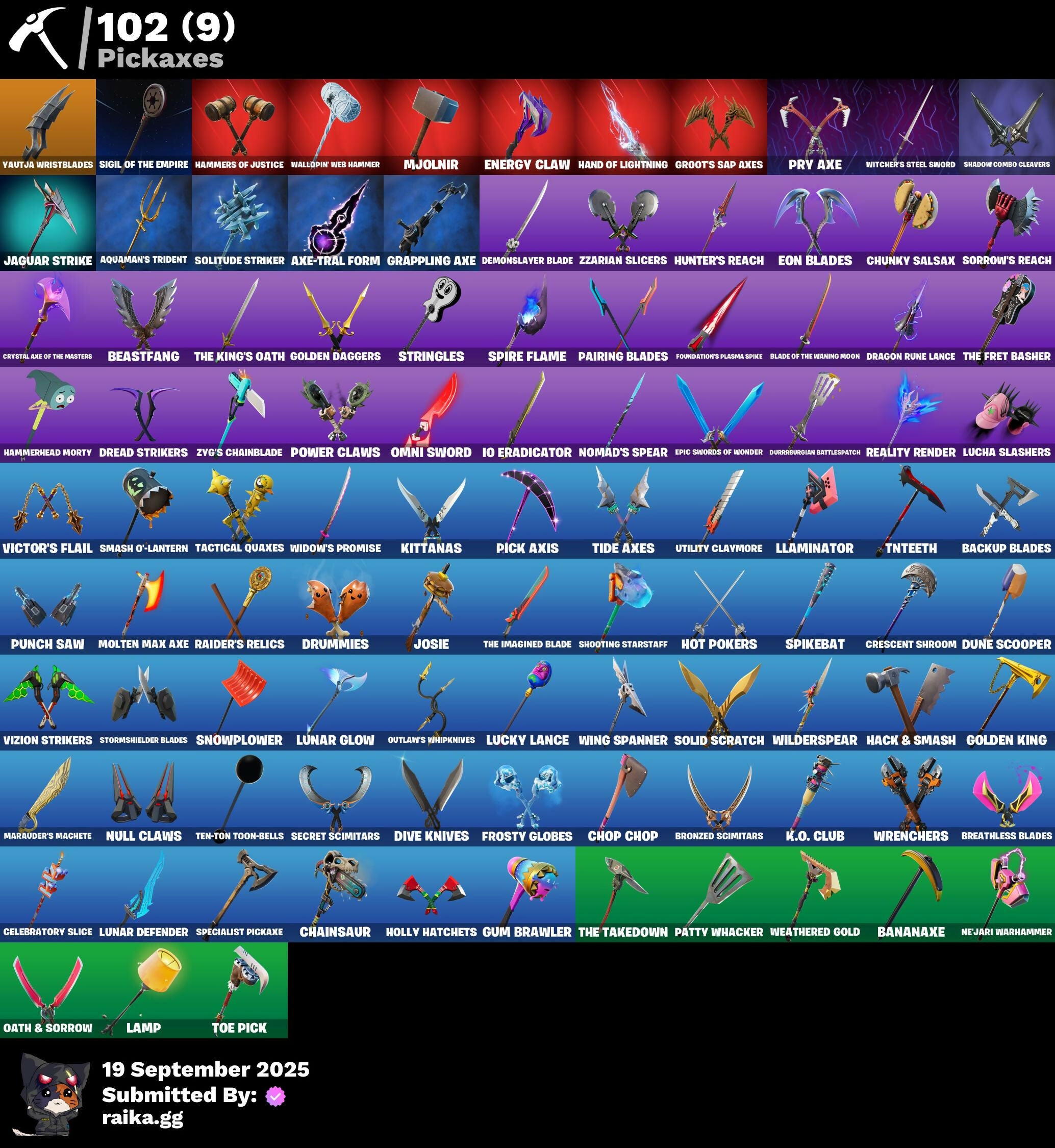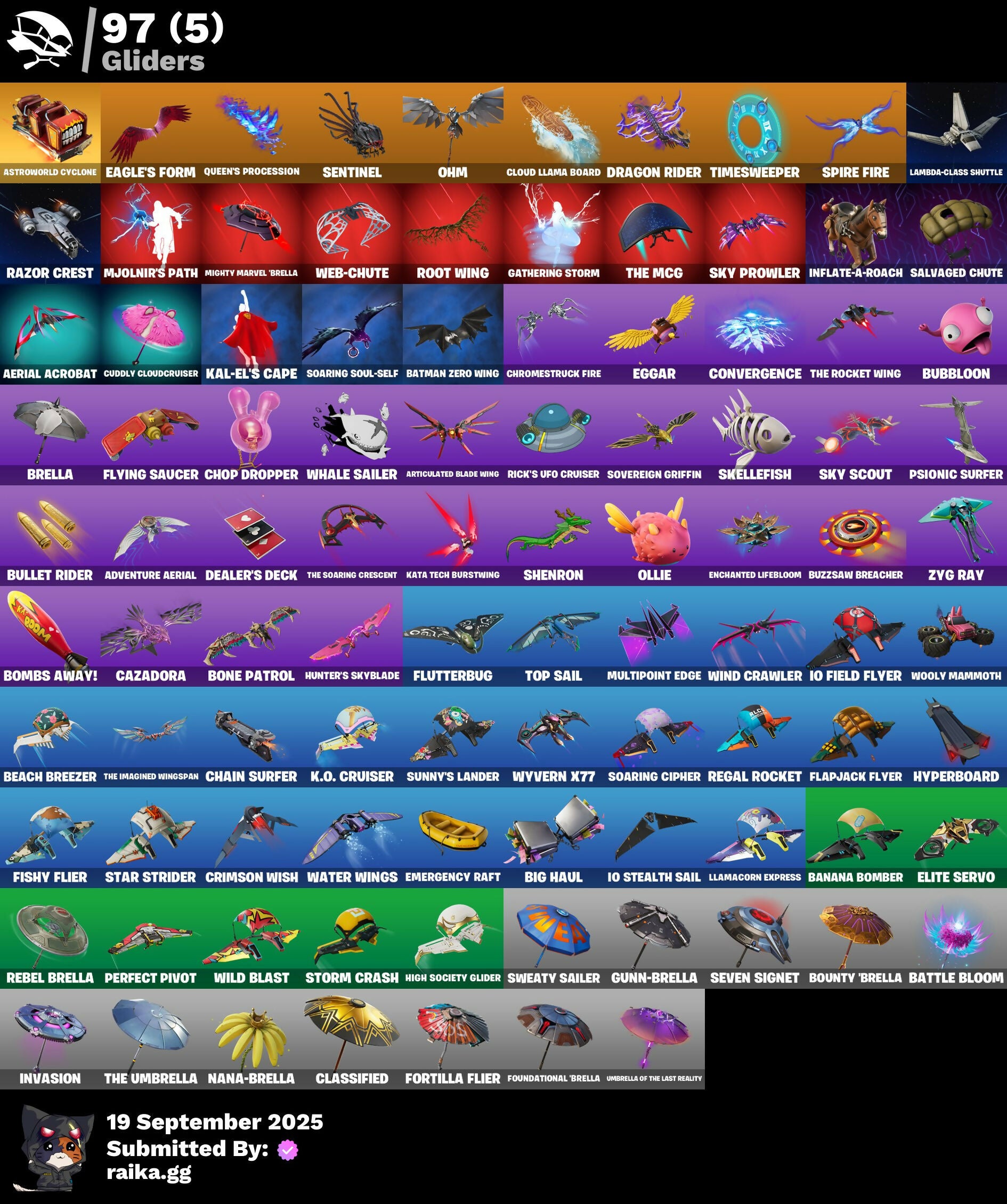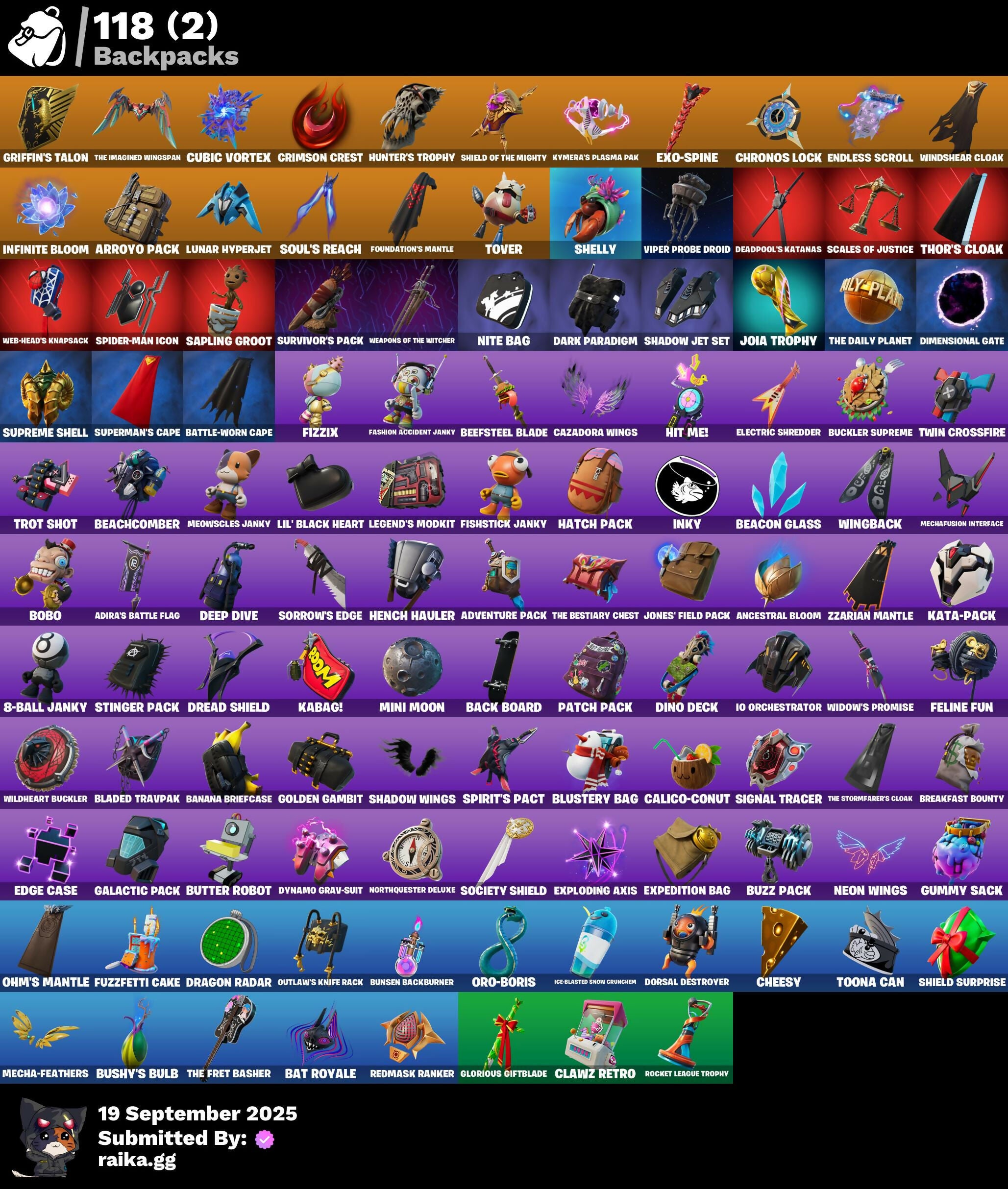 2.0's Revenge, 2022, 8-Ball Janky, Abduction, Above the Clouds, Acolyte's Curse, Adira, Adira (Battle Mask), Adira's Armor, Adira's Battle Flag, Adventure Aerial, Adventure Pack, Aerial Acrobat, Afterparty, Agent Jones, Agent Jones (Jump 31), Agent Nana, Agent Peely, Air Shredder, Ancestral Bloom, Aquaman, Aquaman's Trident, Arcade Kid, Arm The Pumpkin!, Arroyo Pack, Arthur Curry, Articulated Blade Wing, Astroworld Cyclone, Axe-Tral Form, Azarath Metrion Zinthos!, Back Board, Backup Blades, Banana Bomber, Banana Briefcase, Bananaxe, Banner, Banner Icon, Bat Royale, Batman Zero, Batman Zero Wing, Battle Bloom, Battle Mode, Battle Ready Era, Battle-Worn Cape, Bawk Off, Beach Breezer, Beachcomber, Beacon Glass, Beamers, Bean Bag, Beastfang, Beef Blade, Beefsteel Blade, Beep Beep, Berserker Barrage!, Big Guns, Big Haul, Bim Bam Boom, Bitter Sweets, Blade Of The Waning Moon, Bladed Travpak, Blasted, Blocko, Blowin' Up, Blustery Bag, Bobo, Bombastic Winterfest, Bombs Away!, Bone Patrol, Boogie Down, Boomin', Boop!, Boosting Ki, Boot It, Boots 'n' Cats, Both Eyes Open, Bounty 'Brella, Breakfast Bounty, Breathless Blades, Brella, Bronzed Scimitars, Brutus, Bubbloon, Buckler Supreme, Bullet Rider, Bunsen Backburner, Bushie Bright, Bushy's Bulb, Busy, Butter Robot, Buzz Pack, Buzzsaw Breacher, Bytes, Bytes' Sigil, Calico, Calico Holiday, Calico-Conut, Call Me, Cardistry, Cash Grab, Castaway Jonesy, Cazadora, Cazadora Wings, Celebratory Slice, Chain Surfer, Chainsaur, Charging Up, Charlotte, Charlotte's Logo, Cheesy, Chibi, Choice Knit, Chomp Cud!!, Chop Chop, Chop Dropper, Choppy, Chrome Marked, Chromestruck Fire, Chronos Lock, Chunky Salsax, Clark Kent, Clark Kent (Superman), Classic Age, Classified, Clawz Retro, Clean Sweep, Cloaked Shadow, Cloud Llama Board, Cloudburst, Cluck, Cluck (Slurpy), Clucking Mad, Coin Flip, Contour Camo, Contract Giller, Convergence, Count It!, Cowboy Chat, Crabby King, Crescent Shroom, Crimson Crest, Crimson Wish, Crowning Achievement, Crystal Axe Of The Masters, Cube Marking, Cubic Vortex, Cuddly Cloudcruiser, Cyclo, Cyclo Curl, D.C. 63, Daisies, Dark Paradigm, Dark Side Rising, Darth Shader, Darth Vader, Daughter of Trigon, Daywalker's Kata, Deadpool, Deadpool Unmasked, Deadpool's Katanas, Dealer's Deck, Deep Dive, Deep Future, Deimos, Demons Beware, Demonslayer Blade, Denim Destiny, Dimensional Gate, Dino Deck, Dive Knives, Doctor Slone, Dolphin, Doomed Echo, Dorsal Destroyer, Dragon Radar, Dragon Rider, Dragon Rune Lance, Dragon Rune Lances, Dragon Spirit, Dread Fate, Dread Shield, Dread Strikers, Dropout, Drummies, Dune Scooper, Durrrburgian Battlespatch, Dynamite, Dynamo Grav-Suit, Eagle's Form, Edge Case, Eggar, Electric Shredder, Elite Servo, Emergency Raft, Enchanted Lifebloom, Endless Scroll, Energy Claw, Ensnared, Eon Blades, Epic Swords Of Wonder, Era, Evasive Maneuvers, Everything's Fine, Evie, Evie (Summer Strider), Exo-Spine, Expedition Bag, Exploding Axis, Eye of Agamotto, Fade, Fade Out, Fashion Accident Janky, Feelin' Jaunty, Feline Fun, Ferocious, Fishbone, Fishstick Janky, Fishy Flier, Fist, Fizzix, Flapjack Flyer, Flippin' Away, Flutterbug, Flying Saucer, Foil Flex, Fortilla Flier, Foundation's Mantle, Foundation's Plasma Spike, Foundational, Foundational 'Brella, Frosty Globes, Fusion!, Fuzzfetti Cake, Galactic Pack, Gathering Storm, Gear Specialist Maya, Geared Up, Geralt, Geralt of Rivia, Get Griddy, Get Out Of Your Mind, Get Schwifty, Glorious Giftblade, Glyph Master, Goku's Kanji, Gold Touch, Golden Daggers, Golden Gambit, Golden Goal, Golden King, Good Guy, Grappling Axe, Grav-Fusion, Griffin's Talon, Groot, Groot Glow, Groot's Sap Axes, Guggi Was Here, Guggimon, Gugmon, Gum Brawler, Gumbo, Gummy Sack, Gunn-Brella, Gunnar, Gunnar's Special, Hack & Smash, Hammerhead, Hammerhead Morty, Hammers Of Justice, Hand Of Lightning, Hand of Trace, Hand-Forged, Hang Loose Celebration, Happy, Harlowe, Hatch Pack, Haven, Heart Of A King, Heart's Desire, Heat Vision Hunter, Hedron, Hench, Hench Hauler, Here Comes Trubble, Hidden Haven, High Society Glider, Hit Man, Hit Me!, Holiday Boxy, Holly Hatchets, Hope's Look, Hot Pokers, Hunter's Arsenal, Hunter's Reach, Hunter's Skyblade, Hunter's Trophy, Hyperboard, I Believe, I'm Ready!, IO Eradicator, IO Orchestrator, Ice-Blasted Snow Crunch'em, If Looks Could..., Igni Sign, Imagined Edge, Imagined Order, Imperial March, In Her Sights, Indiana Jones, Indiana Jones (Temple Explorer), Indiana Jones' Hat, Industrious, Indy's Escape, Infinite Bloom, Inflate-A-Roach, Ink Wolf, Inky, Inside Out, Interstellar Rick, Invasion, Investigate, Io Field Flyer, Io Stealth Sail, Iso, It Is Finished, It's... You?, Jaguar Strike, Jennifer Walters, Joey, Joia Trophy, Jones' Field Pack, Josie, Jules, Jules' Mask, Jurassically Charged, K.O. Club, K.O. Cruiser, Kabag!, Kablammo!, Kaboom!, Kal-El's Cape, Kata Tech Burstwing, Kata-Pack, Keyed Up, Kiara K.O., Kiara K.O. (Captain's Bomber), Kick Back, Kit, Kittanas, Kon's Bark, Kondor, Krisabelle, Kymera, Kymera Swarm, Kymera's Plasma Pak, Lambda-Class Shuttle, Lamp, Lara Croft, Laser Blaze, Last Forever, Legend's Modkit, Lexa, Lil' Black Heart, Lil' Monster, Lil' Saucer, Lithic, Llamacorn Express, Llaminator, Llamistletoe, Lloose Cannon, Lobby Classic, Lord Vader, Lorenzo, Lotus Touch, Love It!, Lt. John Llama, Lucha Slashers, Lucky Lance, Lunar Charge, Lunar Defender, Lunar Glow, Lunar Hyperjet, Lunar Party, Malik, Malik (Solitary Defender), Malik's Honor, Malik's Sigil, Mancake, Mandalorian, Marauder's Machete, Marigold, Mariposa, Mariposa's Mask, Mark of the Prowler, Mashed Potato, Masked, Master Engineer, Master Plan, Mave, Mave (Reactive Hair Off), Mecha Fish, Mecha Team Shadow, Mecha-Feathers, Mechafusion Interface, Menace, Menacing Trace, Meowabunga! The Power Inside, Meowscles, Meowscles Janky, Meowstermind, Mercurial, Merry Fishmas, Midas' Shadow, Midnight Rumble, Mighty Marvel 'Brella, Mighty Tree, Mini Moon, Mjolnir, Mjolnir Strike, Mjolnir's Path, Molten Max Axe, Mothmando,