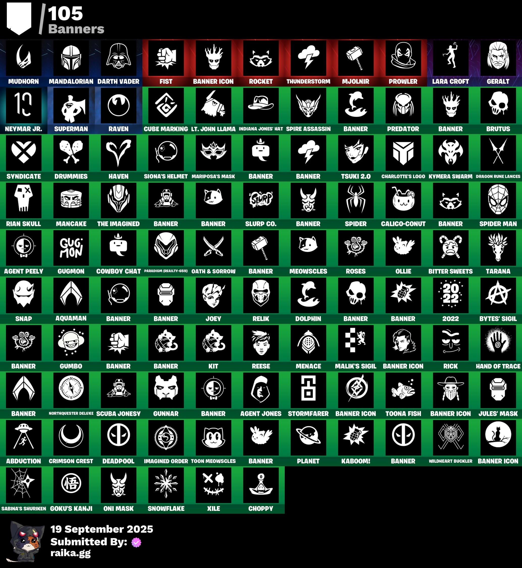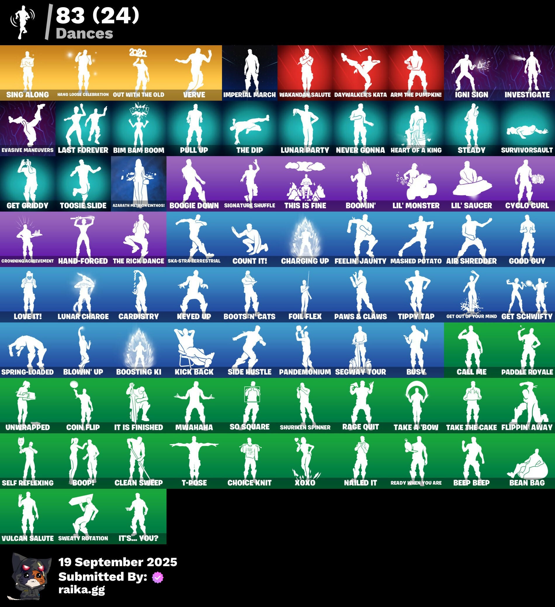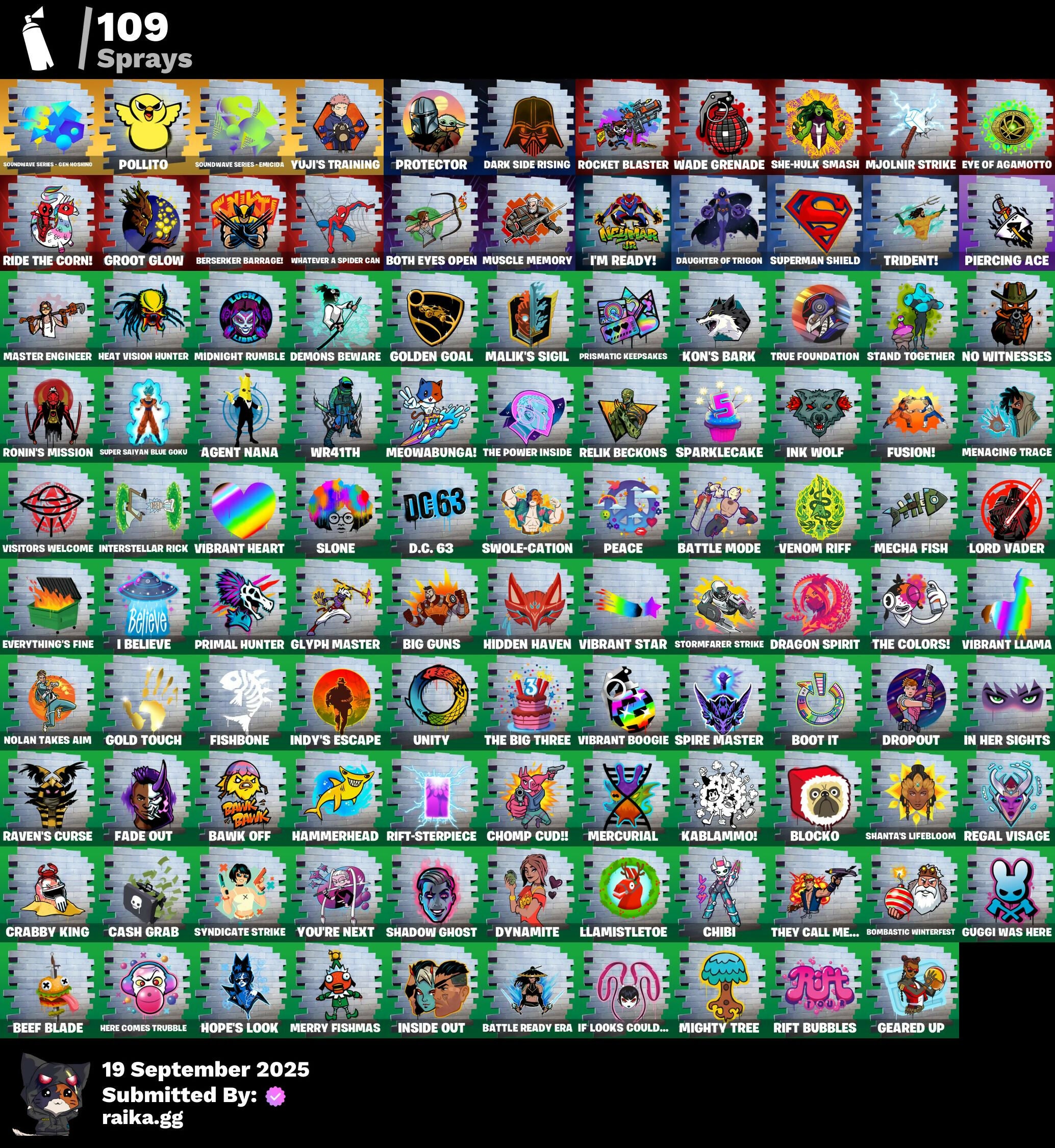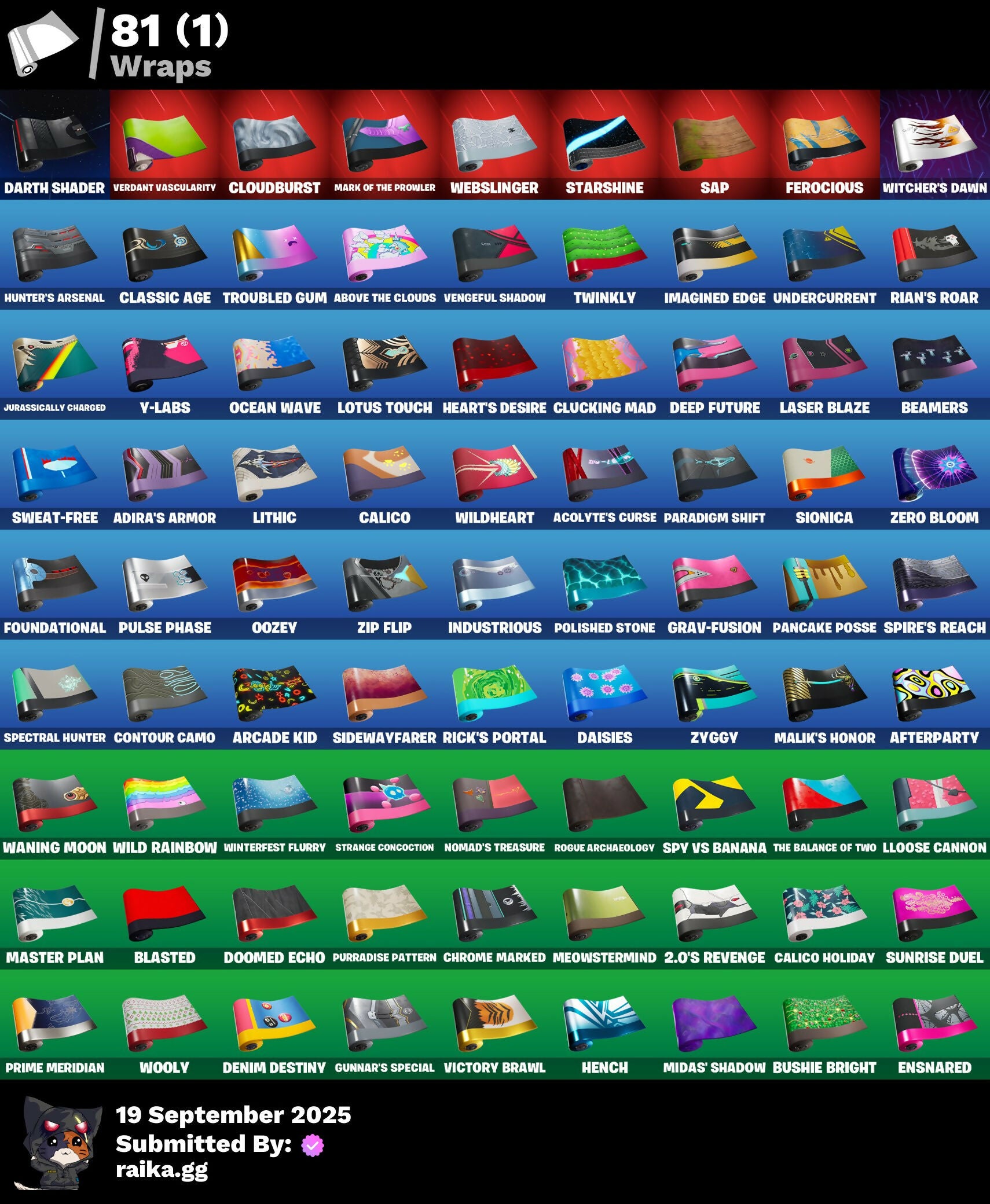 2.0's Revenge, 2022, 8-Ball Janky, Abduction, Above the Clouds, Acolyte's Curse, Adira, Adira (Battle Mask), Adira's Armor, Adira's Battle Flag, Adventure Aerial, Adventure Pack, Aerial Acrobat, Afterparty, Agent Jones, Agent Jones (Jump 31), Agent Nana, Agent Peely, Air Shredder, Ancestral Bloom, Aquaman, Aquaman's Trident, Arcade Kid, Arm The Pumpkin!, Arroyo Pack, Arthur Curry, Articulated Blade Wing, Astroworld Cyclone, Axe-Tral Form, Azarath Metrion Zinthos!, Back Board, Backup Blades, Banana Bomber, Banana Briefcase, Bananaxe, Banner, Banner Icon, Bat Royale, Batman Zero, Batman Zero Wing, Battle Bloom, Battle Mode, Battle Ready Era, Battle-Worn Cape, Bawk Off, Beach Breezer, Beachcomber, Beacon Glass, Beamers, Bean Bag, Beastfang, Beef Blade, Beefsteel Blade, Beep Beep, Berserker Barrage!, Big Guns, Big Haul, Bim Bam Boom, Bitter Sweets, Blade Of The Waning Moon, Bladed Travpak, Blasted, Blocko, Blowin' Up, Blustery Bag, Bobo, Bombastic Winterfest, Bombs Away!, Bone Patrol, Boogie Down, Boomin', Boop!, Boosting Ki, Boot It, Boots 'n' Cats, Both Eyes Open, Bounty 'Brella, Breakfast Bounty, Breathless Blades, Brella, Bronzed Scimitars, Brutus, Bubbloon, Buckler Supreme, Bullet Rider, Bunsen Backburner, Bushie Bright, Bushy's Bulb, Busy, Butter Robot, Buzz Pack, Buzzsaw Breacher, Bytes, Bytes' Sigil, Calico, Calico Holiday, Calico-Conut, Call Me, Cardistry, Cash Grab, Castaway Jonesy, Cazadora, Cazadora Wings, Celebratory Slice, Chain Surfer, Chainsaur, Charging Up, Charlotte, Charlotte's Logo, Cheesy, Chibi, Choice Knit, Chomp Cud!!, Chop Chop, Chop Dropper, Choppy, Chrome Marked, Chromestruck Fire, Chronos Lock, Chunky Salsax, Clark Kent, Clark Kent (Superman), Classic Age, Classified, Clawz Retro, Clean Sweep, Cloaked Shadow, Cloud Llama Board, Cloudburst, Cluck, Cluck (Slurpy), Clucking Mad, Coin Flip, Contour Camo, Contract Giller, Convergence, Count It!, Cowboy Chat, Crabby King, Crescent Shroom, Crimson Crest, Crimson Wish, Crowning Achievement, Crystal Axe Of The Masters, Cube Marking, Cubic Vortex, Cuddly Cloudcruiser, Cyclo, Cyclo Curl, D.C. 63, Daisies, Dark Paradigm, Dark Side Rising, Darth Shader, Darth Vader, Daughter of Trigon, Daywalker's Kata, Deadpool, Deadpool Unmasked, Deadpool's Katanas, Dealer's Deck, Deep Dive, Deep Future, Deimos, Demons Beware, Demonslayer Blade, Denim Destiny, Dimensional Gate, Dino Deck, Dive Knives, Doctor Slone, Dolphin, Doomed Echo, Dorsal Destroyer, Dragon Radar, Dragon Rider, Dragon Rune Lance, Dragon Rune Lances, Dragon Spirit, Dread Fate, Dread Shield, Dread Strikers, Dropout, Drummies, Dune Scooper, Durrrburgian Battlespatch, Dynamite, Dynamo Grav-Suit, Eagle's Form, Edge Case, Eggar, Electric Shredder, Elite Servo, Emergency Raft, Enchanted Lifebloom, Endless Scroll, Energy Claw, Ensnared, Eon Blades, Epic Swords Of Wonder, Era, Evasive Maneuvers, Everything's Fine, Evie, Evie (Summer Strider), Exo-Spine, Expedition Bag, Exploding Axis, Eye of Agamotto, Fade, Fade Out, Fashion Accident Janky, Feelin' Jaunty, Feline Fun, Ferocious, Fishbone, Fishstick Janky, Fishy Flier, Fist, Fizzix, Flapjack Flyer, Flippin' Away, Flutterbug, Flying Saucer, Foil Flex, Fortilla Flier, Foundation's Mantle, Foundation's Plasma Spike, Foundational, Foundational 'Brella, Frosty Globes, Fusion!, Fuzzfetti Cake, Galactic Pack, Gathering Storm, Gear Specialist Maya, Geared Up, Geralt, Geralt of Rivia, Get Griddy, Get Out Of Your Mind, Get Schwifty, Glorious Giftblade, Glyph Master, Goku's Kanji, Gold Touch, Golden Daggers, Golden Gambit, Golden Goal, Golden King, Good Guy, Grappling Axe, Grav-Fusion, Griffin's Talon, Groot, Groot Glow, Groot's Sap Axes, Guggi Was Here, Guggimon, Gugmon, Gum Brawler, Gumbo, Gummy Sack, Gunn-Brella, Gunnar, Gunnar's Special, Hack & Smash, Hammerhead, Hammerhead Morty, Hammers Of Justice, Hand Of Lightning, Hand of Trace, Hand-Forged, Hang Loose Celebration, Happy, Harlowe, Hatch Pack, Haven, Heart Of A King, Heart's Desire, Heat Vision Hunter, Hedron, Hench, Hench Hauler, Here Comes Trubble, Hidden Haven, High Society Glider, Hit Man, Hit Me!, Holiday Boxy, Holly Hatchets, Hope's Look, Hot Pokers, Hunter's Arsenal, Hunter's Reach, Hunter's Skyblade, Hunter's Trophy, Hyperboard, I Believe, I'm Ready!, IO Eradicator, IO Orchestrator, Ice-Blasted Snow Crunch'em, If Looks Could..., Igni Sign, Imagined Edge, Imagined Order, Imperial March, In Her Sights, Indiana Jones, Indiana Jones (Temple Explorer), Indiana Jones' Hat, Industrious, Indy's Escape, Infinite Bloom, Inflate-A-Roach, Ink Wolf, Inky, Inside Out, Interstellar Rick, Invasion, Investigate, Io Field Flyer, Io Stealth Sail, Iso, It Is Finished, It's... You?, Jaguar Strike, Jennifer Walters, Joey, Joia Trophy, Jones' Field Pack, Josie, Jules, Jules' Mask, Jurassically Charged, K.O. Club, K.O. Cruiser, Kabag!, Kablammo!, Kaboom!, Kal-El's Cape, Kata Tech Burstwing, Kata-Pack, Keyed Up, Kiara K.O., Kiara K.O. (Captain's Bomber), Kick Back, Kit, Kittanas, Kon's Bark, Kondor, Krisabelle, Kymera, Kymera Swarm, Kymera's Plasma Pak, Lambda-Class Shuttle, Lamp, Lara Croft, Laser Blaze, Last Forever, Legend's Modkit, Lexa, Lil' Black Heart, Lil' Monster, Lil' Saucer, Lithic, Llamacorn Express, Llaminator, Llamistletoe, Lloose Cannon, Lobby Classic, Lord Vader, Lorenzo, Lotus Touch, Love It!, Lt. John Llama, Lucha Slashers, Lucky Lance, Lunar Charge, Lunar Defender, Lunar Glow, Lunar Hyperjet, Lunar Party, Malik, Malik (Solitary Defender), Malik's Honor, Malik's Sigil, Mancake, Mandalorian, Marauder's Machete, Marigold, Mariposa, Mariposa's Mask, Mark of the Prowler, Mashed Potato, Masked, Master Engineer, Master Plan, Mave, Mave (Reactive Hair Off), Mecha Fish, Mecha Team Shadow, Mecha-Feathers, Mechafusion Interface, Menace, Menacing Trace, Meowabunga! The Power Inside, Meowscles, Meowscles Janky, Meowstermind, Mercurial, Merry Fishmas, Midas' Shadow, Midnight Rumble, Mighty Marvel 'Brella, Mighty Tree, Mini Moon, Mjolnir, Mjolnir Strike, Mjolnir's Path, Molten Max Axe, Mothmando,