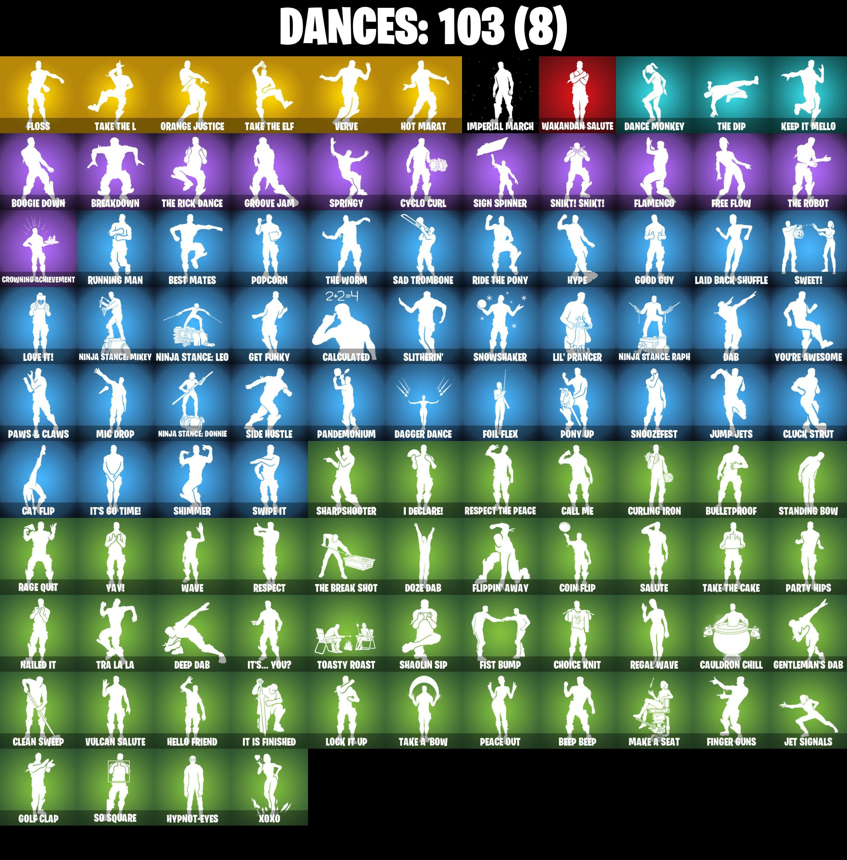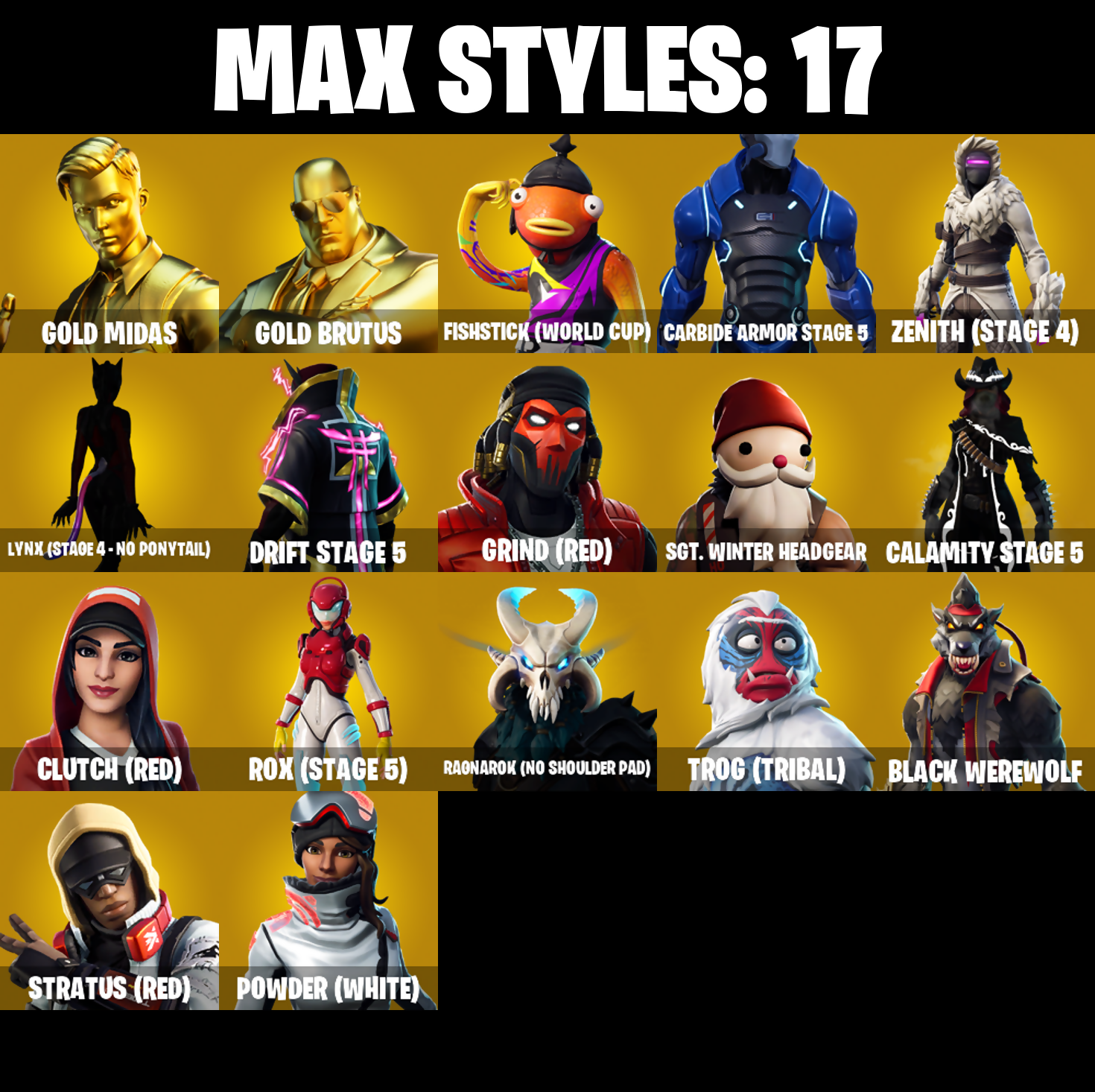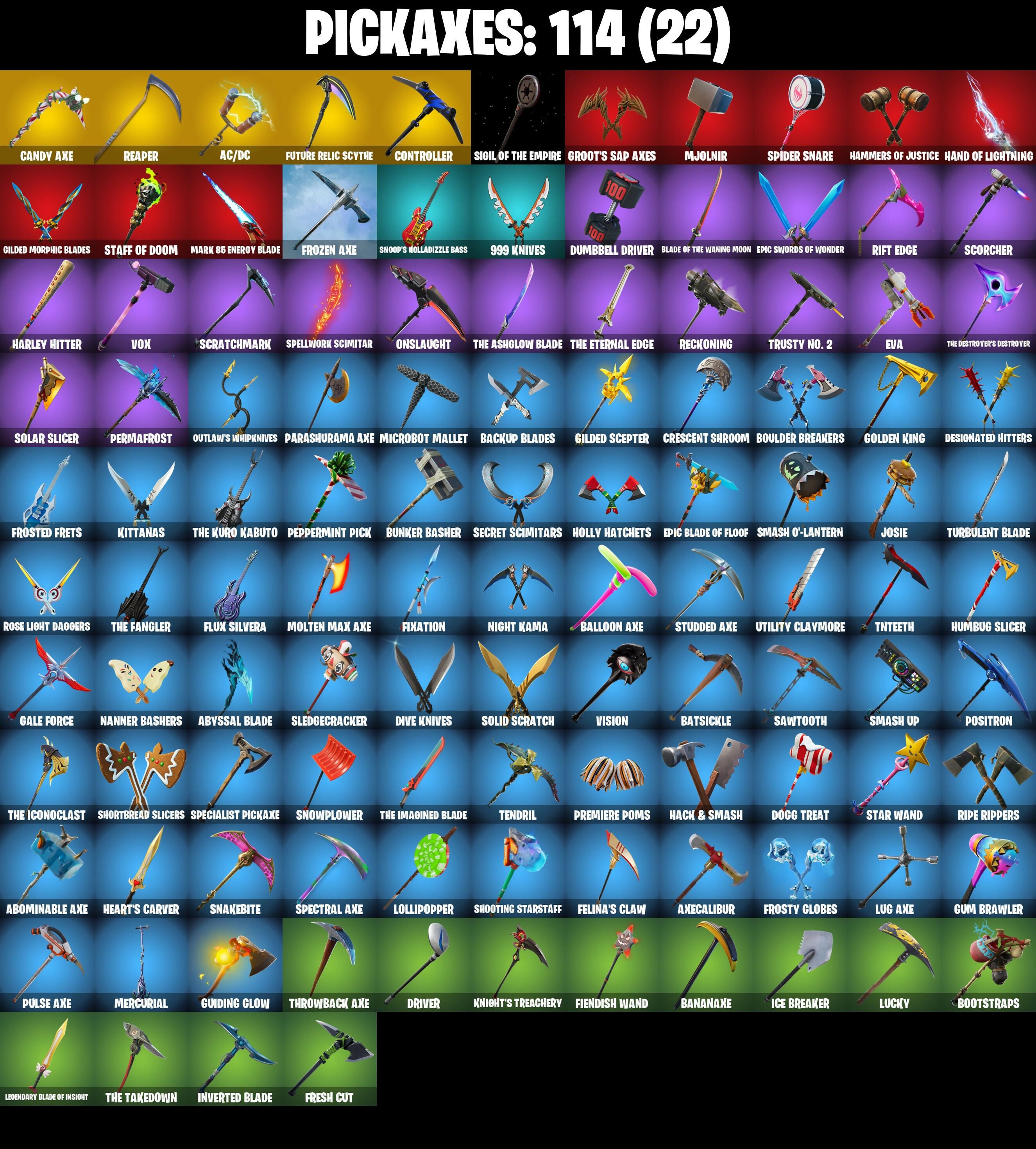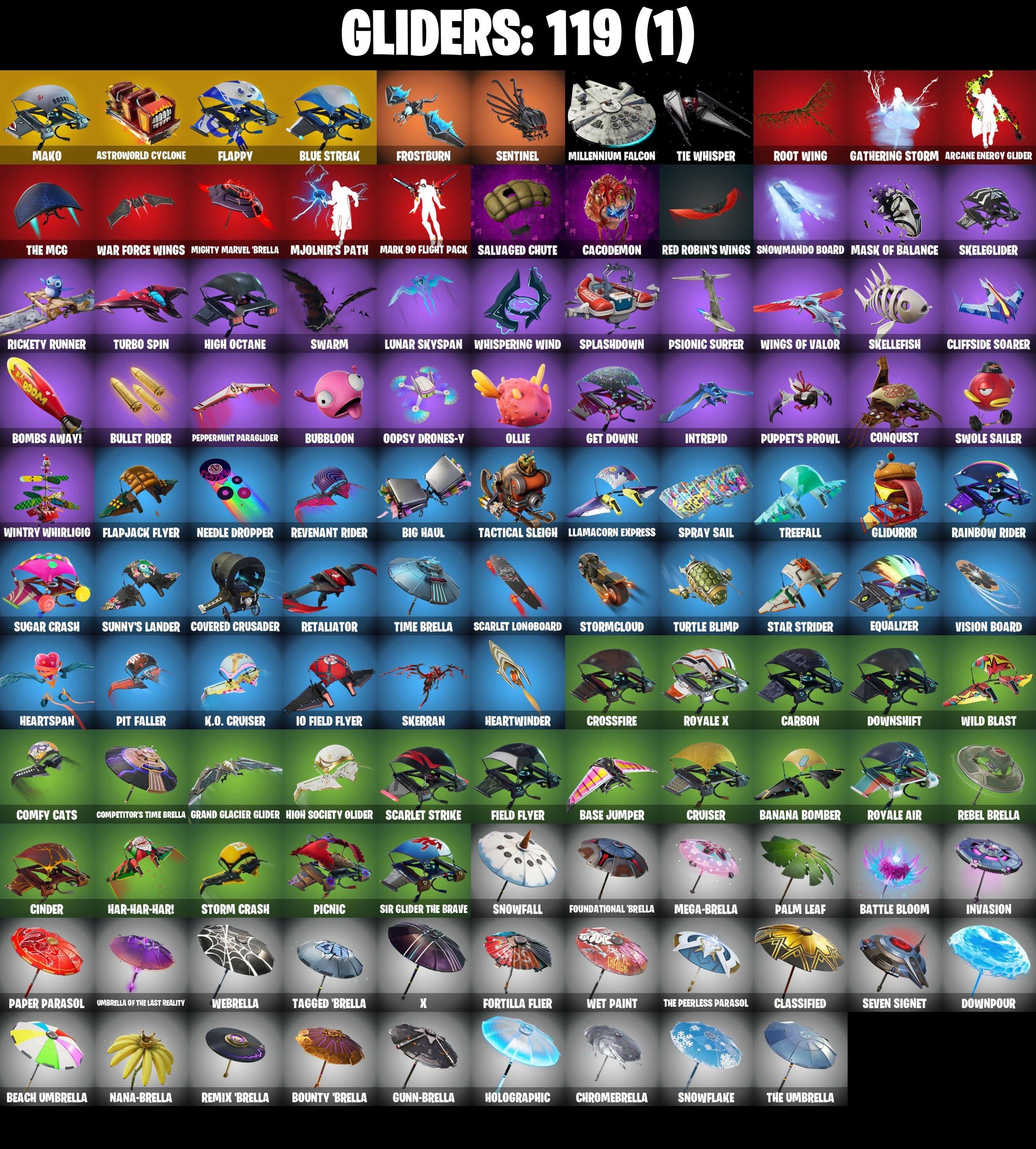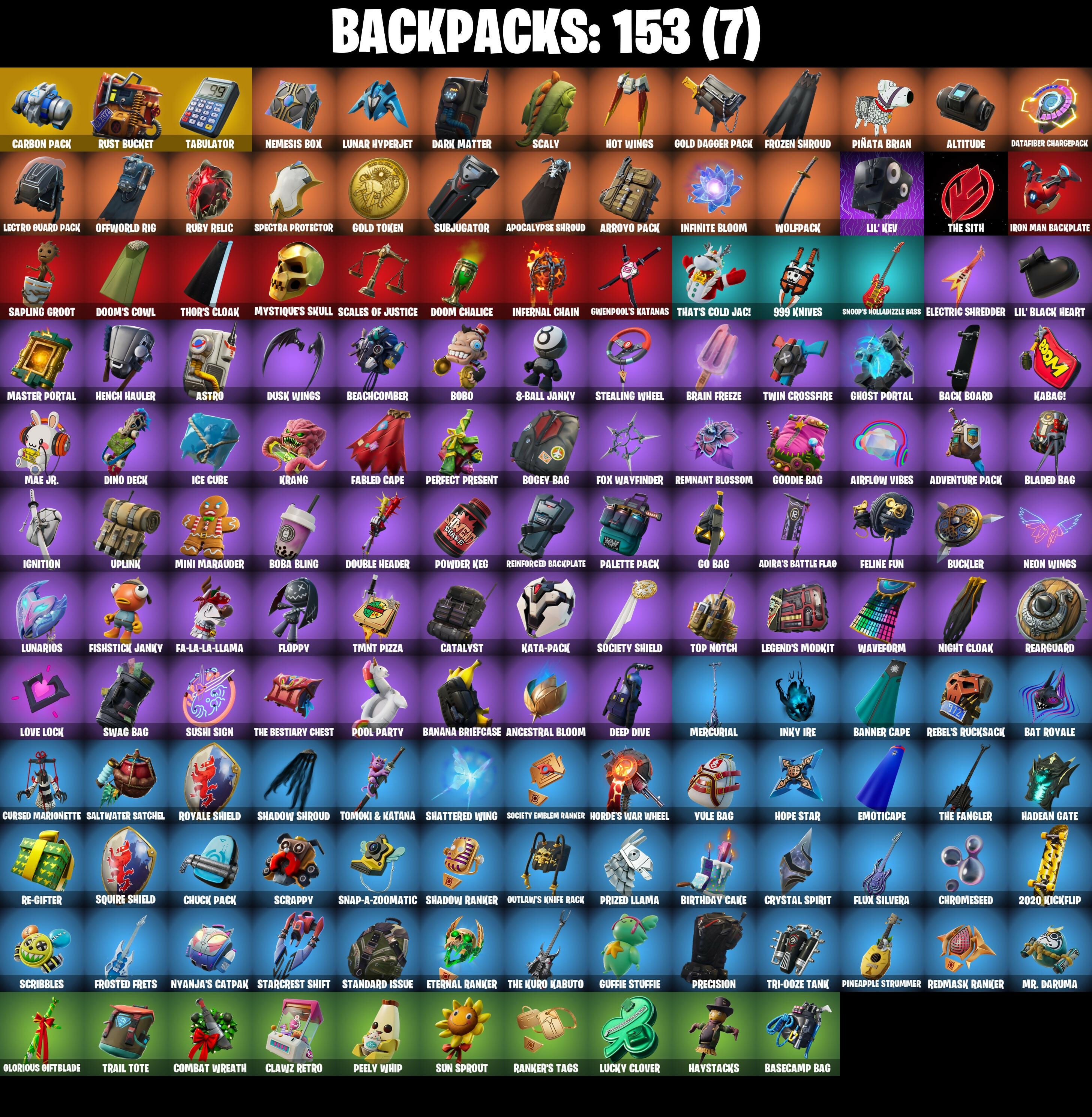 2020 Kickflip, 8-Ball Janky, 999 Knives, AC/DC, Abbsenz, Abominable Axe, Abyssal Blade, Adira's Battle Flag, Adventure Pack, Agent Peely, Airflow Vibes, Altitude, Ancestral Bloom, Apocalypse Shroud, Arcane Energy Glider, Arctic Adeline, Arroyo Pack, Assault Trooper, Astro, Astroworld Cyclone, Axecalibur, B.R.U.T.E. Gunner, Back Board, Backup Blades, Balloon Axe, Banana Bomber, Banana Briefcase, Bananaxe, Banner Cape, Base Jumper, Basecamp Bag, Bat Royale, Batsickle, Battle Bloom, Battlehawk, Beach Umbrella, Beachcomber, Beep Beep, Best Mates, Big Haul, Birthday Cake, Black Werewolf, Blade of the Waning Moon, Bladed Bag, Blue Squire, Blue Streak, Blue Team Leader, Boba Bling, Bobo, Bogey Bag, Bombs Away!, Boogie Down, Bootstraps, Boulder Breakers, Bounty 'Brella, Bracer, Brain Freeze, Breakdown, Brilliant Striker, Brite Bomber, Bubbloon, Buckler, Bullet Rider, Bulletproof, Bullseye, Bunker Basher, Bunker Jonesy, Cacodemon, Calamity, Calamity Stage 5, Calculated, Call Me, Candy Axe, Carbide, Carbide Armor Stage 5, Carbon, Carbon Commando, Carbon Pack, Cat Flip, Catalyst, Cauldron Chill, Choice Knit, Chrome Punk, Chromebrella, Chromeseed, Chuck Pack, Cinder, Classified, Clawz Retro, Clean Sweep, Cliffside Soarer, Cluck Strut, Clutch, Clutch (Red), Cobalt, Coin Flip, Combat Wreath, Comfy Cats, Commando, Competitor's Time Brella, Conquest, Controller, Covered Crusader, Crescent Shroom, Crossfire, Crowning Achievement, Cruiser, Crystal Spirit, Curling Iron, Cursed Marionette, Cyclo Curl, Dab, Dagger Dance, Dance Monkey, Dark Matter, Dark Voyager, Datafiber Chargepack, Deep Dab, Deep Dive, Demi, Desert Dawn Lyric, Designated Hitters, Dino Deck, Dire, Dive Knives, Dj Yonder, Doctor Doom, Dogg Treat, Doom Chalice, Doom's Cowl, Double Header, Downpour, Downshift, Doze Dab, Dream, Drift, Drift Stage 5, Driver, Dumbbell Driver, Dusk, Dusk Wings, Electric Shredder, Elite Agent, Emoticape, Enforcer, Epic Blade of Floof, Epic Swords of Wonder, Equalizer, Eternal Ranker, Etheria, Eva, Fa-La-La-Llama, Fable, Fabled Cape, Felina's Claw, Feline Fun, Field Flyer, Fiendish Wand, Finger Guns, Fishstick (World Cup), Fishstick Janky, Fist Bump, Fixation, Flamenco, Flapjack Flyer, Flappy, Flippin' Away, Floppy, Floss, Flux Silvera, Focus, Foil Flex, Fortilla Flier, Foundational 'Brella, Fox Wayfinder, Free Flow, Fresh Cut, Frostburn, Frosted Frets, Frosty Globes, Frozen Axe, Frozen Shroud, Future Relic Scythe, Gale Force, Gathering Storm, Gear Specialist Maya, Gentleman's Dab, Get Down!, Get Funky, Ghost Portal, Ghost Rider, Giddy-Up, Gilded Morphic Blades, Gilded Scepter, Glidurrr, Glorious Giftblade, Go Bag, Gold Brutus, Gold Dagger Pack, Gold Midas, Gold Token, Golden King, Golf Clap, Good Guy, Goodie Bag, Grand Glacier Glider, Grind, Grind (Red), Groot, Groot's Sap Axes, Groove Jam, Guffie Stuffie, Guiding Glow, Gum Brawler, Gunn-Brella, Gwenpool's Katanas, Hack & Smash, Hadean Gate, Hammers of Justice, Hand of Lightning, Har-Har-Har!, Harley Hitter, Haystacks, Heart's Carver, Heartspan, Heartwinder, Hello Friend, Hench Hauler, High Octane, High Society Glider, Highland Warrior, Holly Hatchets, Holographic, Hope Star, Horde's War Wheel, Hot Marat, Hot Wings, Humbug Slicer, Huntress, Hype, Hypnot-Eyes, I Declare!, Ice Breaker, Ice Cube, Ignition, Imperial March, Infernal Chain, Infinite Bloom, Inky Ire, Intrepid, Invasion, Inverted Blade, Io Field Flyer, Iron Man Backplate, It Is Finished, It's Go Time!, It's... You?, Jennifer Walters, Jet Signals, Josie, Jump Jets, K.O. Cruiser, Kabag!, Kata-Pack, Keep It Mello, Kittanas, Knight's Treachery, Krang, Krisabelle, Laguna, Laid Back Shuffle, Lectro Guard Pack, Legend's Modkit, Legendary Blade of Insight, Lil' Black Heart, Lil' Kev, Lil' Prancer, Llamacorn Express, Lock It Up, Lollipopper, Love It!, Love Lock, Lt. Evergreen, Lucky, Lucky Clover, Lug Axe, Lunar Hyperjet, Lunar Skyspan, Lunarios, Lynx, Lynx (Stage 4 - No Ponytail), Mae Jr., Make A Seat, Mako, Marius, Mark 85 Energy Blade, Mark 90 Flight Pack, Mask Of Balance, Master Portal, Mat Master, Mega-Brella, Meowscles, Mercurial, Merry Marauder, Mic Drop, Microbot Mallet, Mighty Marvel 'Brella, Millennium Falcon, Mini Marauder, Mission Specialist, Mjolnir, Mjolnir's Path, Molten Max Axe, Moonwalker, Mr. Daruma, Mystique, Mystique's Skull, Nailed It, Nana-'Brella, Nanner Bashers, Needle Dropper, Nemesis Box, Neon Wings, Night Cloak, Night Kama, Nightshade, Ninja Stance: Donnie, Ninja Stance: Leo, Ninja Stance: Mikey, Ninja Stance: Raph, Nitehare, Nitelite, Nog Ops, Nyanja's Catpak, Offworld Rig, Ollie, Omega, Onesie, Onslaught, Oopsy Drones-y, Orange Justice, Original Renegade, Outlaw's Knife Rack, Outlaw's Whipknives, Palette Pack, Palm Leaf, Pandemonium, Paper Parasol, Parashurama Axe, Party Hips, Paws & Claws, Peace Out, Peely Whip, Peppermint Paraglider, Peppermint Pick, Perfect Present, Permafrost, Picnic, Pineapple Strummer, Pit Faller, Piñata Brian, Polar Peely, Pony Up, Pool Party, Popcorn, Positron, Powder, Powder (White), Powder Keg, Precision, Premiere Poms, Prized Llama, Prodigy, Psionic Surfer, Pulse Axe, Puppet's Prowl, Rage Quit, Ragnarok, Ragnarok (No Shoulder Pad), Rainbow Rider, Ranker's Tags, Re-Gifter, Reaper, Rearguard, Rebel Brella, Rebel's Rucksack, Reckoning, Recon Specialist, Red Robin's Wings, Red Strike, Redline, Redmask Ranker, Regal Wave, Reinforced Backplate, Remix 'Brella, Remnant Blossom, Respect, Respect The Peace, Retaliator, Revenant Rider, Rex, Rickety Runner, Ride The Pony, Rift Edge, Ripe Rippers, Rogue Agent, Rook, Root Wing, Rose Light Daggers, Rox, Rox (Stage 5), Royale Air, Royale Knight, Royale Shield, Royale X, Ruby Relic, Running Man, Rust Bucket, Rust Lord, Sad Trombone, Saltwater Satchel, Salute, Salvaged Chute, Santa Dogg, Sapling Groot, Sawtooth, Scales of Justice, Scaly, Scarlet Longboard, Scarlet Strike, Scorcher, Scrappy, Scratchmark, Scribbles, Secret Scimitars, Sentinel, Seven Signet, Sgt. Winter, Sgt. Winter Headgear, Shadow Ranker, Shadow Shroud, Shaolin