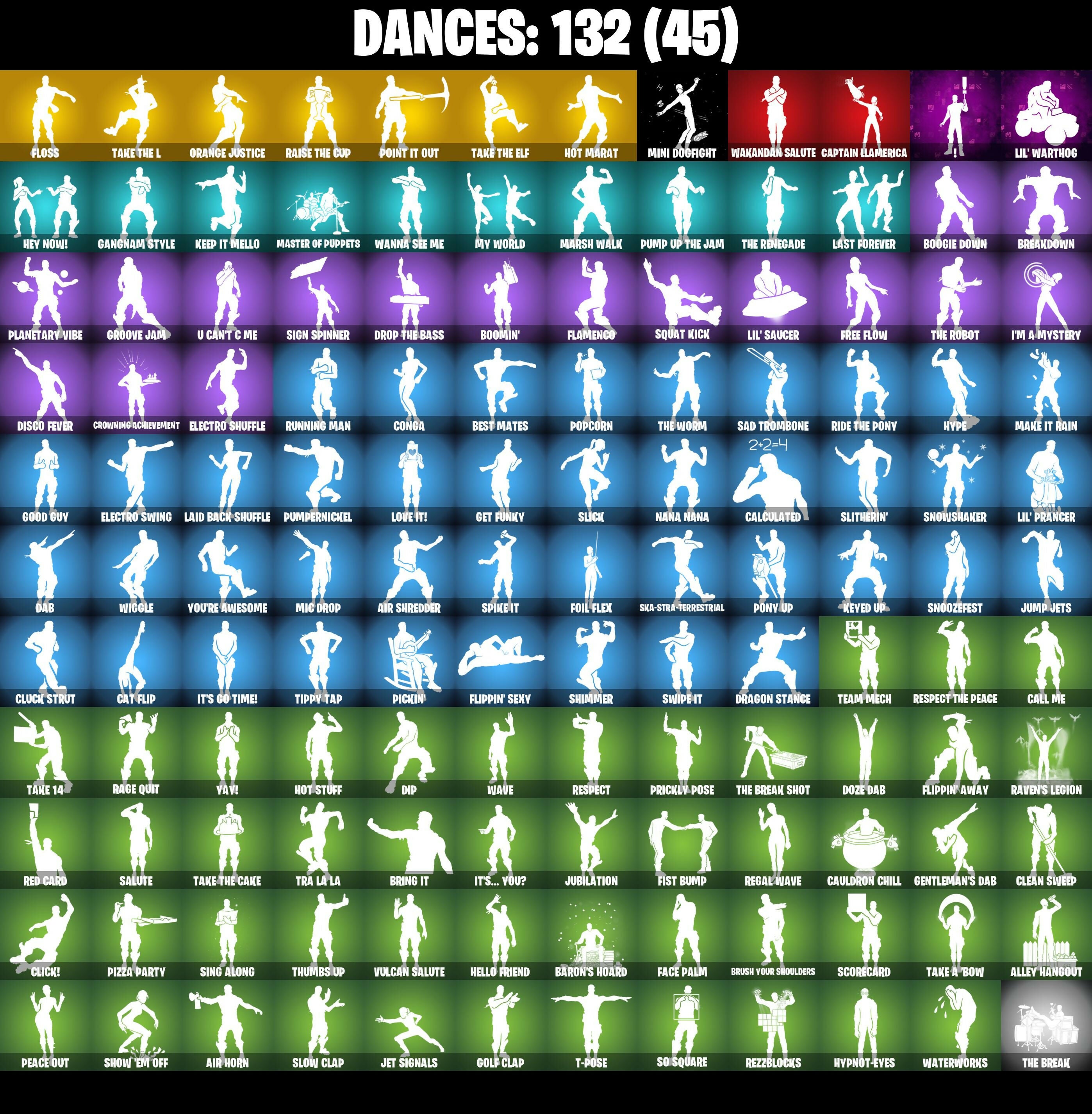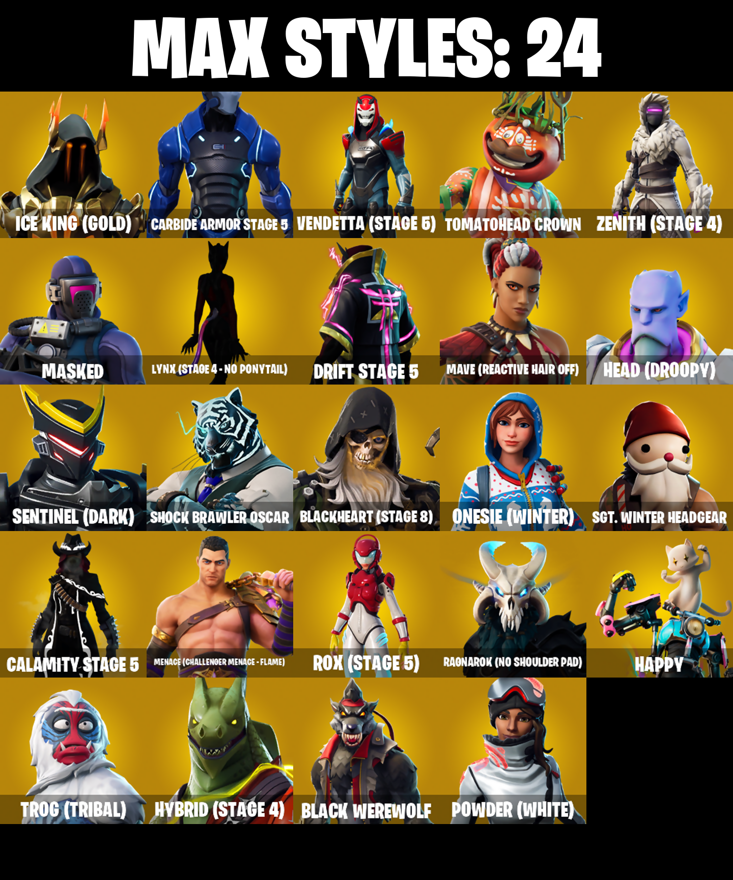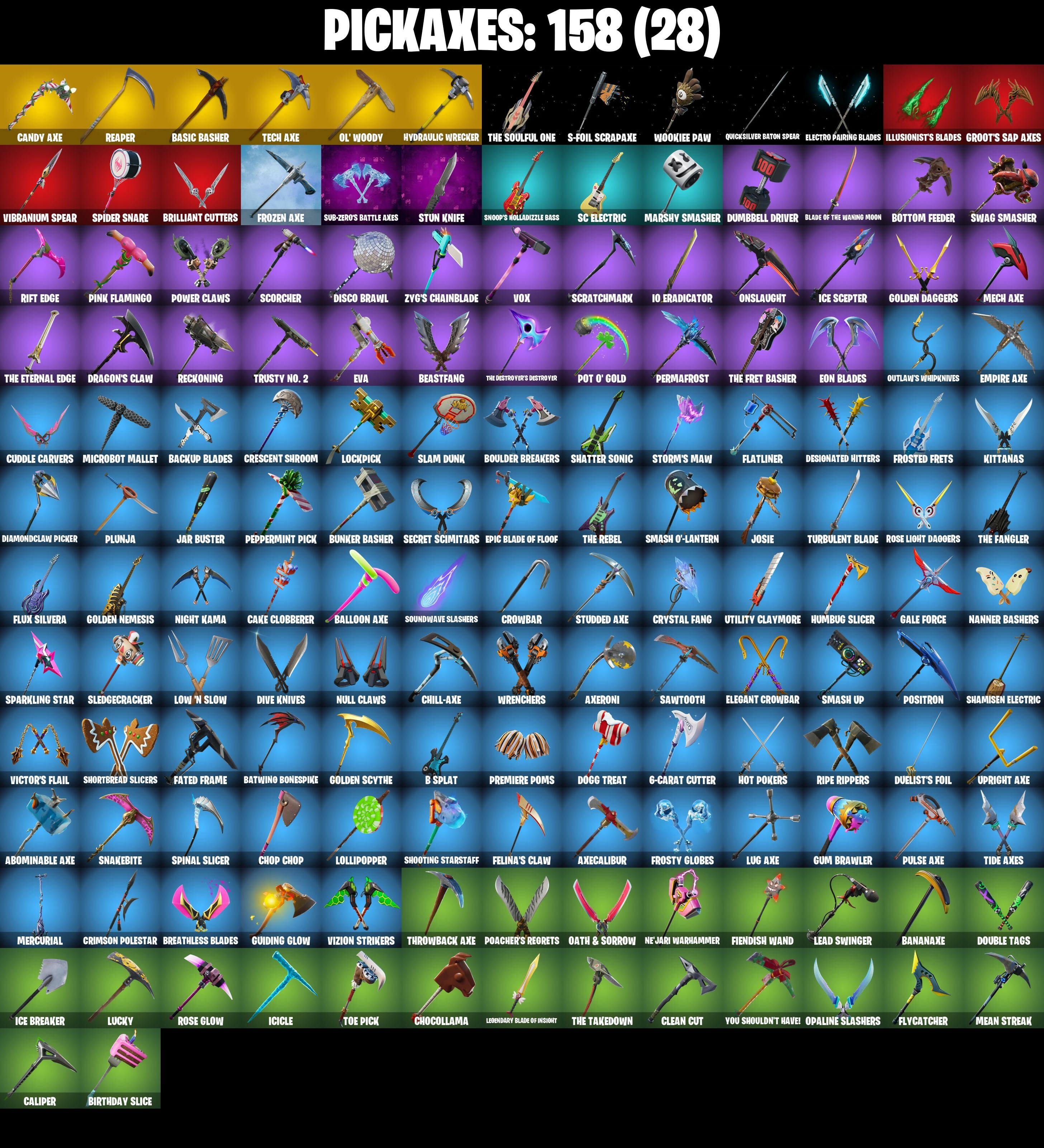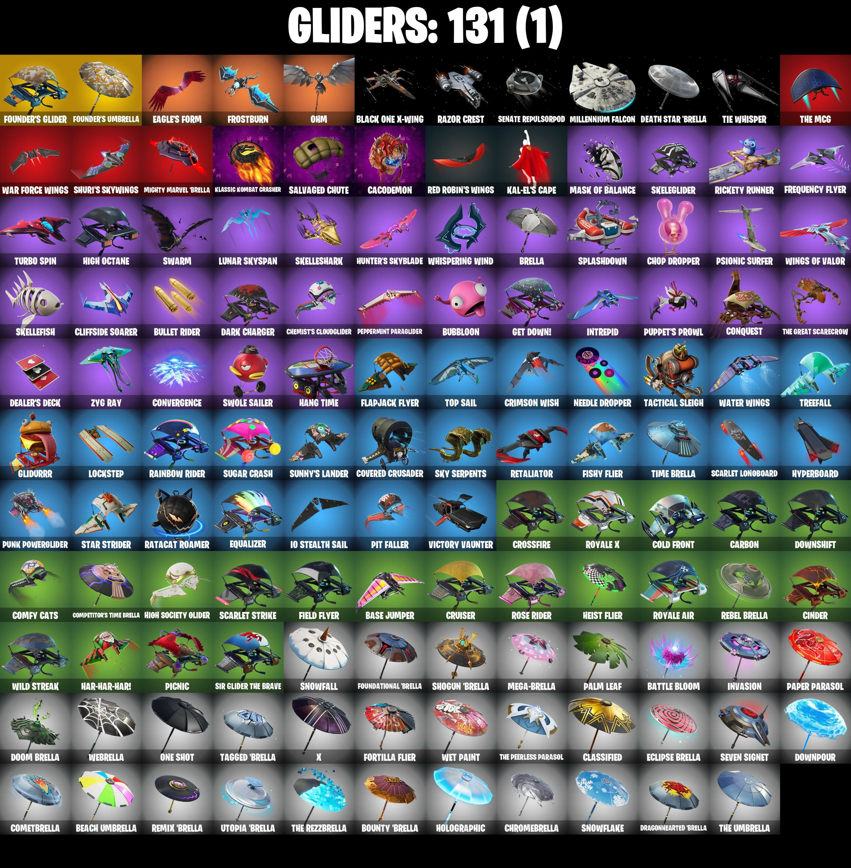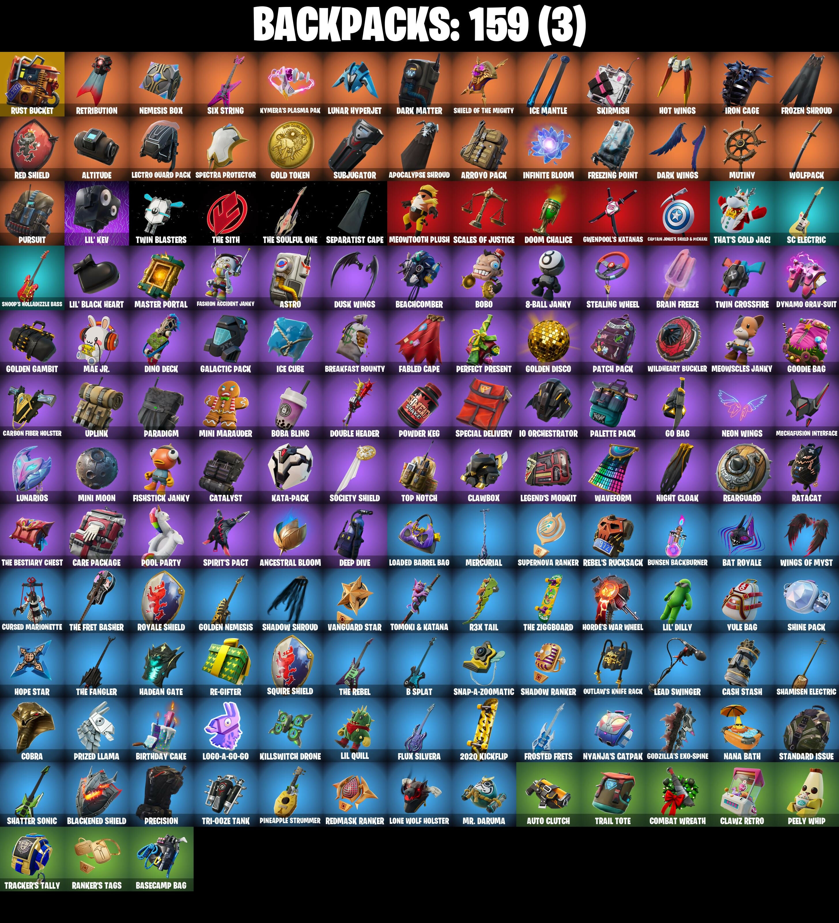 10 Orchestrator, 10 Stealth Sail, 2020 Kickflip, 6-Carat Cutter, 8-Ball Janky, Abominable Axe, Air Horn, Air Shredder, Alley Hangout, Altitude, Ancestral Bloom, Apocalypse Shroud, Archetype, Arroyo Pack, Astro, Auto Clutch, Axecalibur, Axeroni, B Splat, Backup Blades, Balloon Axe, Bananaxe, Baron's Hoard, Base Jumper, Basecamp Bag, Basic Basher, Bat Royale, Battle Bloom, Battlehawk, Batwing Bonespike, Beach Umbrella, Beachcomber, Beastfang, Best Mates, Birthday Cake, Birthday Slice, Black One X-Wing, Black Werewolf, Blackened Shield, Blackheart, Blackheart (Stage 8), Blade Of The Waning Moon, Blue Squire, Boba Bling, Bobo, Boogie Down, Boomin', Bottom Feeder, Boulder Breakers, Bounty 'Brella, Brain Freeze, Breakdown, Breakfast Bounty, Breathless Blades, Brella, Brilliant Cutters, Bring It, Brite Bomber, Brush Your Shoulders, Bubbloon, Bullet Rider, Bunker Basher, Bunker Jonesy, Bunsen Backburner, Cacodemon, Cake Clobberer, Calamity, Calamity Stage 5, Calculated, Caliper, Call Me, Candy Axe, Captain Llamerica, Carbide, Carbide Armor Stage 5, Carbon, Carbon Fiber Holster, Care Package, Cash Stash, Cat Flip, Catalyst, Cauldron Chill, Chemist's Cloudglider, Chill-Axe, Chocollama, Chop Chop, Chop Dropper, Chromebrella, Cinder, Classified, Clawbox, Clawz Retro, Clean Cut, Clean Sweep, Click!, Cliffside Soarer, Cluck Strut, Cobra, Cold Front, Combat Wreath, Cometbrella, Comfy Cats, Competitor's Time Brella, Conga, Conquest, Convergence, Covered Crusader, Cozy Commander, Crescent Shroom, Crimson Polestar, Crimson Wish, Crossfire, Crowbar, Crowning Achievement, Cruiser, Crystal Fang, Cuddle Carvers, Cursed Marionette, DJ Yonder, Dab, Dark Charger, Dark Matter, Dark Voyager, Dark Wings, Dealer's Deck, Death Star 'Brella, Deep Dive, Demi, Designated Hitters, Desperado, Devastator, Diamond Diva, Diamondclaw Picker, Dino Deck, Dip, Dire, Disco Brawl, Disco Fever, Dive Knives, Dogg Treat, Doom Brella, Doom Chalice, Double Header, Double Tags, Downpour, Downshift, Doze Dab, Dragon Stance, Dragon's Claw, Dragonhearted 'Brella, Drift, Drift Stage 5, Drop The Bass, Duelist's Foil, Dumbbell Driver, Dusk, Dusk Knight, Dusk Wings, Dynamo Grav-Suit, Eagle's Form, Eclipse Brella, Electro Pairing Blades, Electro Shuffle, Electro Swing, Elegant Crowbar, Elite Agent, Empire Axe, Enforcer, Eon Blades, Epic Blade Of Floof, Equalizer, Eva, Fable, Fabled Cape, Face Palm, Fade, Fashion Accident Janky, Fated Frame, Felina, Felina's Claw, Field Flyer, Fiendish Wand, Fishstick Janky, Fishy Flier, Fist Bump, Flamenco, Flapjack Flyer, Flatliner, Flippin' Away, Flippin' Sexy, Floss, Flux Silvera, Flycatcher, Foil Flex, Fortilla Flier, Foundational 'Brella, Founder's Glider, Founder's Umbrella, Free Flow, Freezing Point, Frequency Flyer, Frostbite, Frostburn, Frosted Frets, Frosty Globes, Frozen Axe, Frozen Shroud, Funk Ops, Galactic Pack, Gale Force, Gangnam Style, Gentleman's Dab, Get Down!, Get Funky, Giddy-Up, Glidorr, Go Bag, Godzilla's Exo-Spine, Gold Token, Golden Daggers, Golden Disco, Golden Gambit, Golden Nemesis, Golden Scythe, Golf Clap, Good Guy, Goodie Bag, Groot's Sap Axes, Groove Jam, Guggimon, Guiding Glow, Gum Brawler, Gwenpool's Katanas, Hadean Gate, Hang Time, Happy, Har-Har-Har!, Head (Droopy), Heist Flier, Hello Friend, Hey Now!, High Octane, High Society Glider, Holographic, Hope, Hope Star, Horde's War Wheel, Hot Marat, Hot Pokers, Hot Stuff, Hot Wings, Humbug Slicer, Hunter's Skyblade, Huntress, Hybrid, Hybrid (Stage 4), Hydraulic Wrecker, Hype, Hyperboard, Hypnot-Eyes, I'm A Mystery, IO Eradicator, Ice Breaker, Ice Cube, Ice King (Gold), Ice Mantle, Ice Scepter, Icicle, Illusionist's Blades, Infinite Bloom, Intrepid, Invasion, Iron Cage, It's Go Time!, It's... You?, Jack Gourdon, Jar Buster, Jet Signals, Joey, Josie, Jubilation, Jules, Jump Jets, Jumpshot, Kal-El's Cape, Kata-Pack, Keep It Mello, Keyed Up, Killswitch Drone, Kit, Kittanas, Klassic Kombat Crasher, Kondor, Kymera, Kymera's Plasma Pak, Laguna, Laid Back Shuffle, Last Forever, Lead Swinger, Lectro Guard Pack, Legend's Modkit, Legendary Blade Of Insight, Lexa, Lil Quill, Lil' Black Heart, Lil' Dilly, Lil' Kev, Lil' Prancer, Lil' Saucer, Lil' Warthog, Loaded Barrel Bag, Lockpick, Lockstep, Logo-A-Go-Go, Lollipopper, Lone Wolf Holster, Love It!, Low 'N Slow, Lt. Evergreen, Lucky, Lug Axe, Lunar Hyperjet, Lunar Skyspan, Lunarios, Lynx, Lynx (Stage 4 - No Ponytail), Mae Jr., Make It Rain, Mancake, Mandalorian, Marigold, Marsh Walk, Marshmello, Marshy Smasher, Mask Of Balance, Masked, Master Of Puppets, Master Portal, Mave, Mave (Reactive Hair Off), Mean Streak, Mech Axe, Mechafusion Interface, Mega-Brella, Menace, Menace (Challenger Menace - Flame), Meowscles Janky, Meowtooth Plush, Mercurial, Merry Marauder, Mic Drop, Microbot Mallet, Mighty Marvel 'Brella, Millennium Falcon, Mini Dogfight, Mini Marauder, Mini Moon, Mission Specialist, Montague, Moonwalker, Mr. Daruma, Munitions Expert, Mutiny, My World, Nana Bath, Nana Nana, Nanner Bashers, Ne'jari Warhammer, Needle Dropper, Nemesis Box, Neon Wings, Night Cloak, Night Kama, Nightshade, Nisha, Null Claws, Nyanja's Catpak, Oath & Sorrow, Ocean, Ohm, Ol' Woody, Omega, One Shot, Onesie, Onesie (Winter), Onslaught, Opaline Slashers, Orange Justice, Oscar, Outlaw's Knife Rack, Outlaw's Whipknives, Palette Pack, Palm Leaf, Paper Parasol, Paradigm, Patch Pack, Peace Out, Peely, Peely Whip, Peppermint Paraglider, Peppermint Pick, Perfect Present, Permafrost, Pickin', Picnic, Pineapple Strummer, Pink Flamingo, Pit Faller, Pizza Party, Planetary Vibe, Plunja, Poacher's Regrets, Point It Out, Poised Playmaker, Pony Up, Pool Party, Popcorn, Positron, Pot O' Gold, Powder, Powder (White), Powder Keg, Power Chord, Power Claws, Precision, Premiere Poms, Prickly Patroller, Prickly Pose, Prized Llama, Psionic Surfer, Pulse Axe, Pump Up The Jam, Pumpernickel, Punk Powerglider, Puppet's Prowl, Pursuit, Quicksilver Baton Spear, R3X Tail, Rage Quit, Ragnarok, Ragnarok (No Shoulder Pad), Rainbow Rider, Raise The C