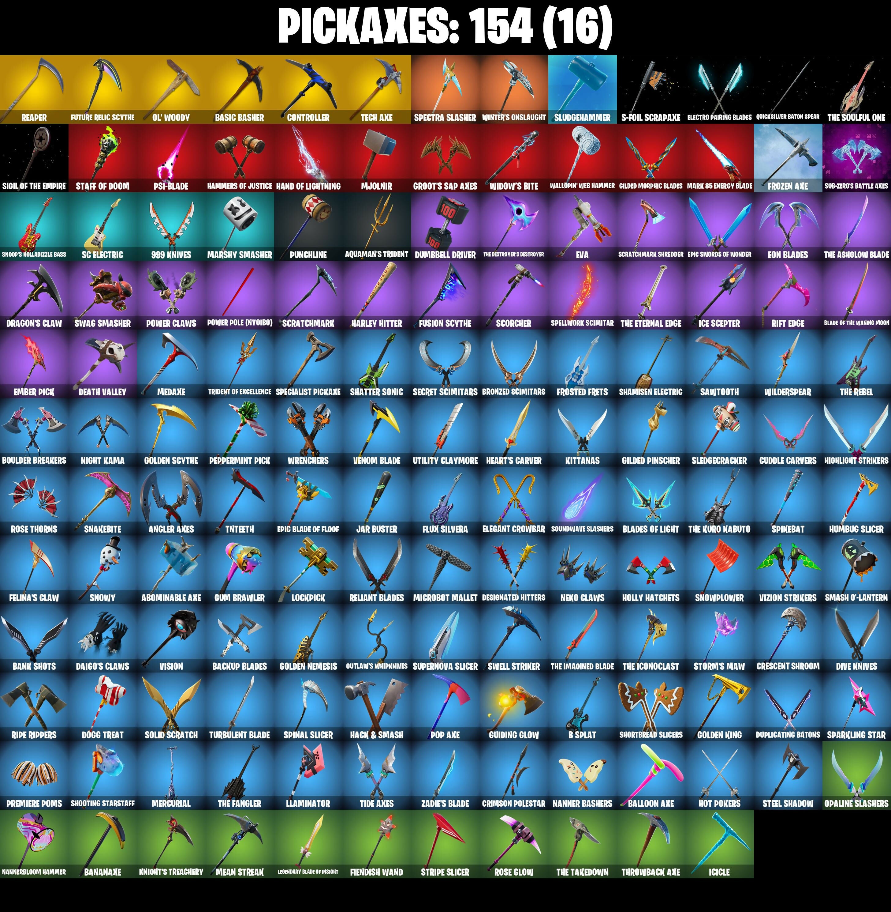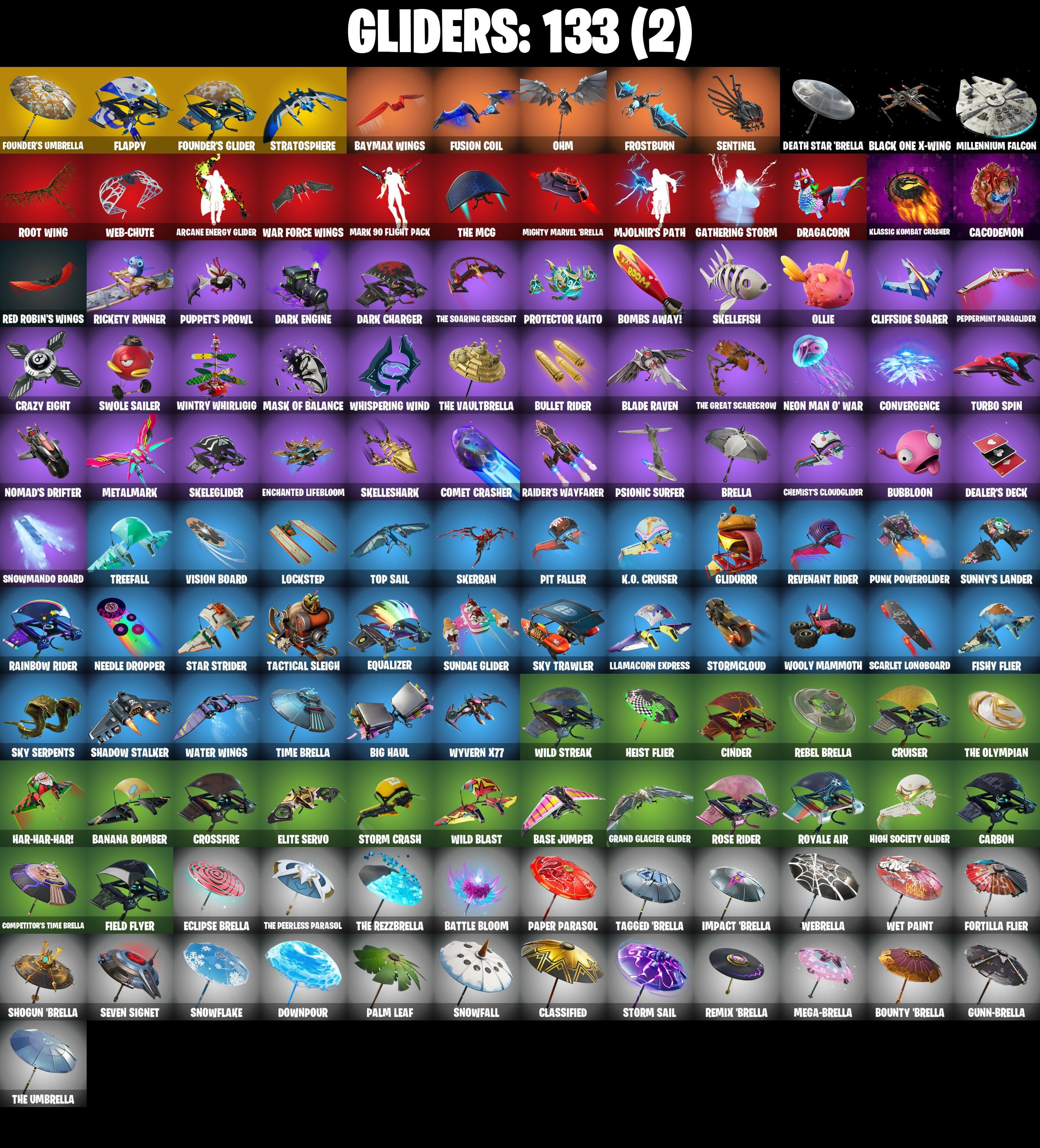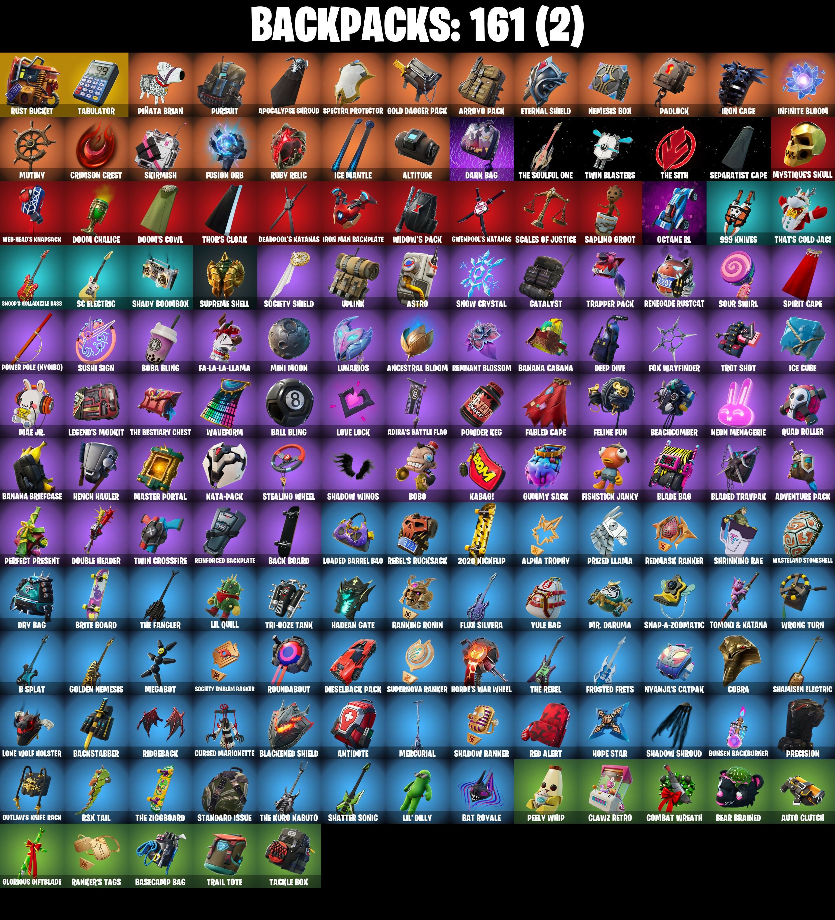 2020 Kickflip, 8-Ball vs Scratch, 999 Knives, Abominable Axe, Adira's Battle Flag, Adventure Pack, Agent Peely, Air Shredder, Alpha Trophy, Altitude, Ancestral Bloom, Angler Axes, Antidote, Apocalypse Shroud, Aquaman, Aquaman's Trident, Arcane Energy Glider, Arctic Adeline, Arroyo Pack, Arthur Curry, Astro, Auto Clutch, B Splat, Back Board, Backstabber, Backup Blades, Ball Bling, Balloon Axe, Banana Bomber, Banana Briefcase, Banana Cabana, Bananaxe, Bank Shots, Baron's Hoard, Base Jumper, Basecamp Bag, Basic Basher, Bat Royale, Battle Bloom, Battle Call, Baymax Wings, Beach Bomber, Beachcomber, Bear Brained, Beep Beep, Behold!, Big Haul, Billy Bounce, Black, Black One X-wing, Black Widow Outfit, Blackened Shield, Blackheart, Blackheart (Stage 8), Blade Bag, Blade Raven, Blade of the Waning Moon, Bladed Travpak, Blades of Light, Blinding Lights, Blizzabelle, Boba Bling, Bobo, Boing!, Bombs Away!, Boogie Down, Boulder Breakers, Bouncer, Bounty 'brella, Breakin', Brella, Brite Board, Bronzed Scimitars, Brush Your Shoulders, Brutus, Bubbloon, Bullet Rider, Bunker Jonesy, Bunsen Backburner, Cacodemon, Call Me, Cameo vs Chic, Cap Kick, Carbon, Cat Flip, Catalyst, Cauldron Chill, Chemist's Cloudglider, Chimichanga!, Choice Knit, Cinder, Classified, Clawz Retro, Clean Groove, Clean Sweep, Cliffside Soarer, Cloaked Shadow, Cobalt, Cobra, Coin Flip, Combat Wreath, Comet Crasher, Competitor's Time Brella, Conga, Controller, Convergence, Crazy Eight, Crescent Shroom, Crimson Crest, Crimson Polestar, Criss Cross, Crossfire, Crowning Achievement, Cruiser, Cuddle Carvers, Curling Iron, Cursed Marionette, Cyclo Curl, Dagger Dance, Daigo, Daigo's Claws, Dante, Dark Bag, Dark Bomber, Dark Charger, Dark Engine, Daywalker's Kata, Deadpool, Deadpool Unmasked, Deadpool's Katanas, Dealer's Deck, Death Star 'brella, Death Valley, Deep Dive, Derby Dynamo, Designated Hitters, Dieselback Pack, Dive Knives, Do The Split, Doctor Doom, Dogg Treat, Doom Chalice, Doom's Cowl, Double Header, Downpour, Doze Dab, Dragacorn, Dragon Stance, Dragon's Claw, Drift, Drift Stage 5, Droop, Drop The Bass, Dry Bag, Dumbbell Driver, Dummy, Dupli-Kate, Duplicating Batons, Duplikates, Dusk Knight, Eclipse Brella, Electro Pairing Blades, Electro Swing, Elegant Crowbar, Elite Servo, Ember Pick, Enchanted Lifebloom, Eon Blades, Epic Blade of Floof, Epic Swords of Wonder, Equalizer, Eternal Knight, Eternal Shield, Eva, Fa-la-la-llama, Fabled Cape, Fade, Fancy Feet, Felina, Felina's Claw, Feline Fun, Field Flyer, Fiendish Wand, Fishstick Janky, Fishy Flier, Fist Bump, Flappy, Flashback Breakdown, Flippin' Away, Flux Silvera, Focused, Foil Flex, Fortilla Flier, Founder's Glider, Founder's Umbrella, Fox Wayfinder, Free Flow, Fright Funk, Frostburn, Frosted Frets, Frozen Axe, Full Tilt, Fusion, Fusion Coil, Fusion Orb, Fusion Scythe, Fusion! Hah!!, Future Relic Scythe, Gathering Storm, Gear Specialist Maya, Gear Specialist Maya (Hat - Dark), Gentleman's Dab, Get Funky, Ghoul Trooper, Gilded Morphic Blades, Gilded Pinscher, Glidurr, Glorious Giftblade, Gold Dagger Pack, Gold Midas, Golden King, Golden Nemesis, Golden Scythe, Golf Clap, Grand Glacier Glider, Groot, Groot's Sap Axes, Ground Pound, Guardian Jade, Guiding Glow, Gum Brawler, Gumbo, Gummy Sack, Gun Show, Gunn-Brella, Gwenpool's Katanas, Hack & Smash, Hadean Gate, Hammers of Justice, Hand of Lightning, Hang On, Happy, Har-Har-Har!, Harbinger Armor Omegorok, Harley (Always Fantabulous), Harley Hitter, Harley Quinn, Harlowe, Have A Seat, Haven, Haze, Heart's Carver, Heist Flier, Hello Friend, Hench Hauler, Hero Baymax, High Five, High Society Glider, Highlight Strikers, Holiday Boxy, Holly Hatchets, Hope Star, Horde's War Wheel, Hot Marat, Hot Pokers, Hot Stuff, Howl, Hula Hoopin', Humbug Slicer, Hunter, Huntress, Hybrid, Hybrid (Stage 4), Hypnot-Eyes, I Declare!, Ice Cube, Ice King (Gold), Ice Mantle, Ice Scepter, Icicle, Impact 'brella, Imperial March, Infinite Bloom, Introducing..., Invisible Cut, Iris, Iron Cage, Iron Man Backplate, It Is Finished, It's Go Time!, It's... You?, Jabba Switchway, Jade, Jar Buster, Jennifer Walters, Jet Signals, Job Well Done, Journey vs Hazard, Jubilation, Jules, K.O. Cruiser, Kabag!, Kata Captain, Kata-Pack, Keep It Mello, Kendo, Keyed Up, Kick Ups, Kintsugi Daigo, Kit, Kittanas, Klassic Kombat Crasher, Knee Slapper, Knight's Treachery, Krisabelle, Lara Croft (2000s), Laugh It Up, Legend's Modkit, Legendary Blade of Insight, Lil Quill, Lil Split, Lil' Dilly, Lil' Longboat, Lil' Monster, Lil' Prancer, Llamacorn Express, Llaminator, Loaded Barrel Bag, Lock It Up, Lockpick, Lockstep, Lone Wolf Holster, Love It!, Love Lock, Lt. John Llama, Lunar Charge, Lunarios, Lynx, Lynx (Stage 4 - No Ponytail), M-Jolnir, Mae Jr., Make A Seat, Mark 85 Energy Blade, Mark 90 Flight Pack, Marshmello, Marshy Smasher, Mask Of Balance, Masked, Master Portal, Mean Streak, Medaxe, Mega-Brella, Megabot, Melody Maverick, Meowscles, Mercurial, Metalmark, Mic Drop, Microbot Mallet, Mighty Marvel 'brella, Millennium Falcon, Mini Moon, Mission Specialist, Mjolnir's Path, Moonwalker, Mr. Daruma, Mutiny, Mwahaha, Mystique, Mystiques Skull, Nanner Bashers, Nannerbloom Hammer, Needle Dropper, Neko Claws, Nemesis Box, Neon Man O' War, Neon Menagerie, Never Gonna, Night Kama, Ninja Stance: Leo, Nomad's Drifter, Nyanja, Nyanja's Catpak, Ocean, Octane RL, Ohm, Ol' Woody, Ollie, Omegarok, Onesie, Opaline Slashers, Out West, Outlaw's Knife Rack, Outlaw's Whipknives, Pac-Brained, Padlock, Palm Leaf, Pandemonium, Paper Parasol, Party Hips, Paws & Claws, Peace Out, Peely, Peely Whip, Peppermint Paraglider, Peppermint Pick, Perfect Present, Pirouette, Pit Faller, Piñata Brian, Planetary Vibe, Point It Out, Polar Peely, Pony Up, Pop Axe, Popular Vibe, Powder, Powder Keg, Power Claws, Power Pole (Nyoibo), Precision, Premiere Poms, Prized Llama, Prodigy, Protector Kaito, Psi-Blade, Psionic Surfer, Punched Up, Punchline, Punk Powerglider, Puppet Dance, Puppet's Prowl, Pursuit, Quad Roller, Quicksil