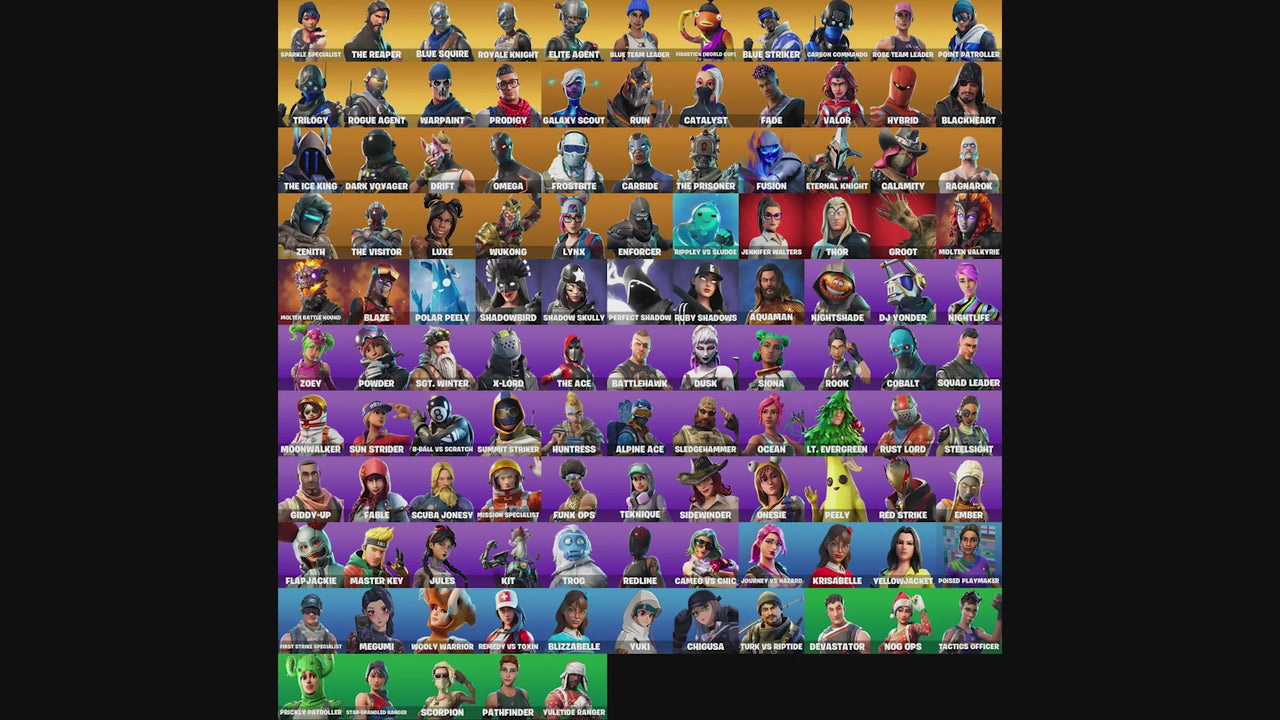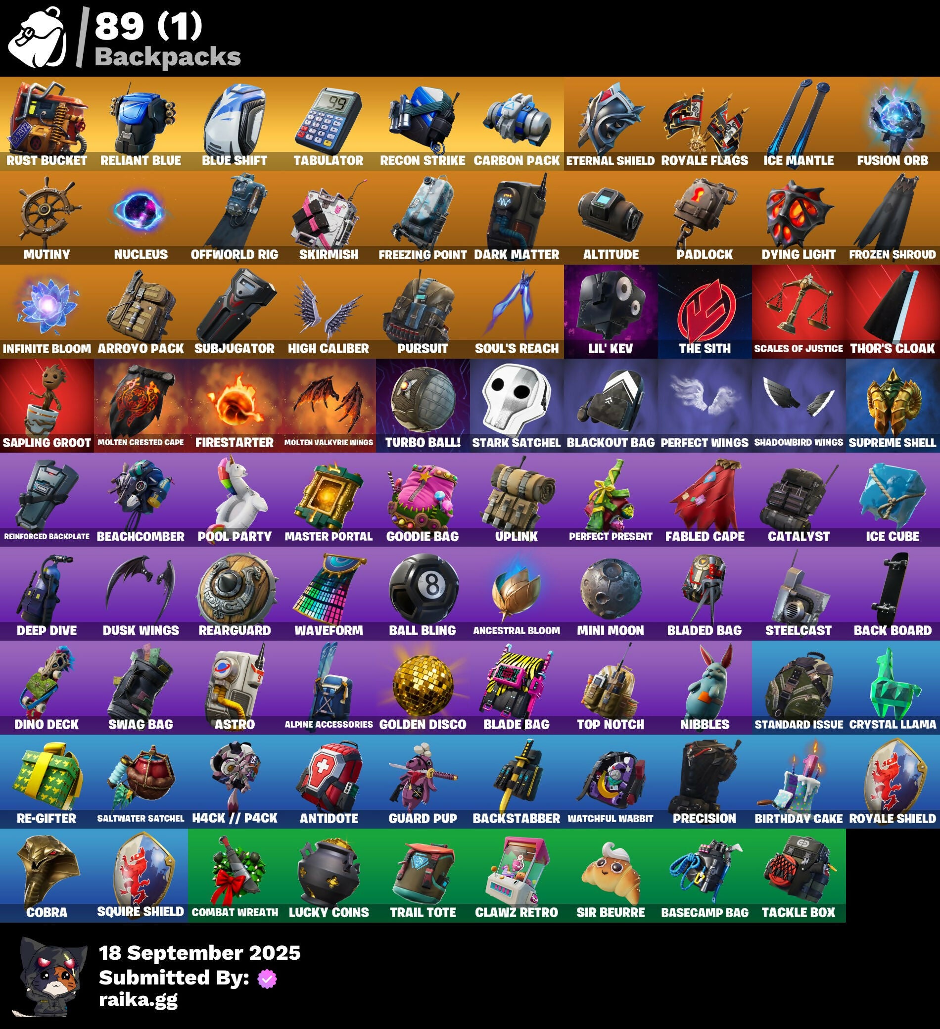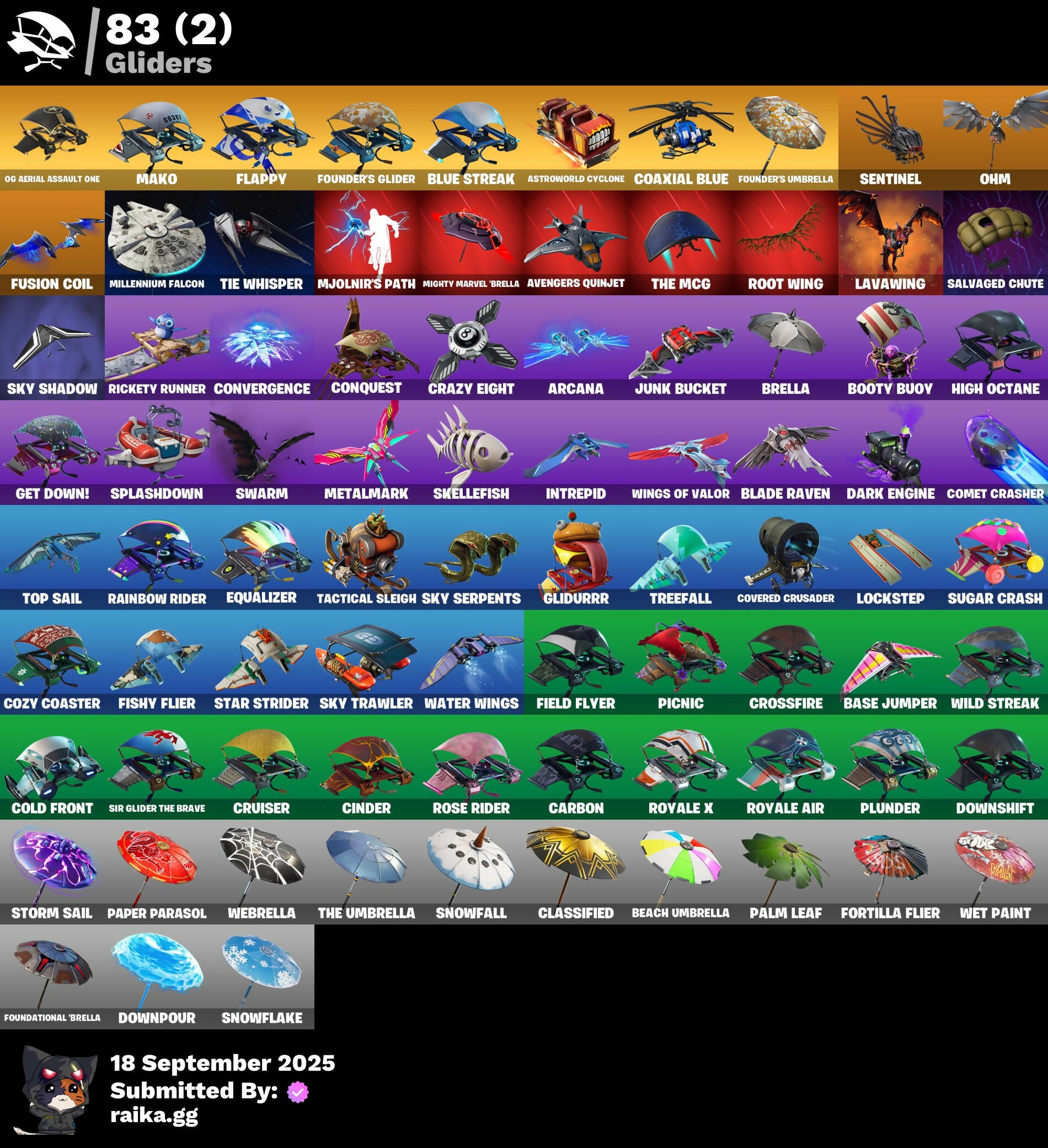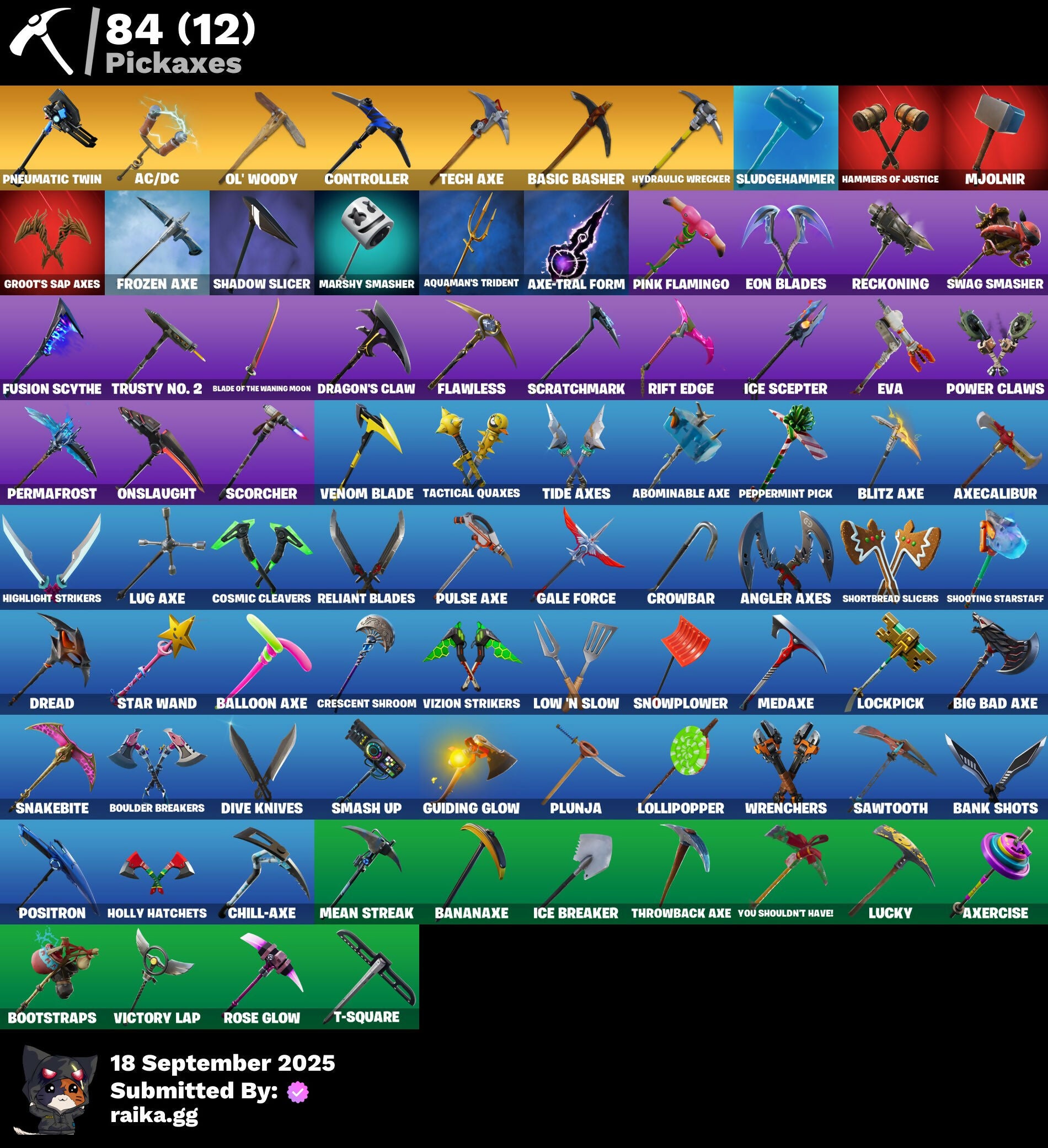 8-Ball, 8-Ball vs Scratch, A.L.T.E.R., AC/DC, Abominable Axe, Abstract, Afterparty, Agent Jones, Agent Peely, Air Shredder, Alpine Accessories, Alpine Ace, Altitude, Ancestral Bloom, Angler Axes, Antidote, Aquaman, Aquaman's Trident, Arcana, Arctic Camo, Array, Arrow, Arroyo Pack, Arthur Curry, Astro, Astroworld Cyclone, Avengers Logo, Avengers Quinjet, Axe-tral Form, Axecalibur, Axercise, Back Board, Backstabber, Bag Of Coal, Baited, Ball Bling, Balloon Axe, Bananas, Bananaxe, Bank Shots, Banner, Banner Icon, Base Jumper, Basecamp Bag, Basic Basher, Bat, Battle Bus, Battle Call, Battlehawk, Beach Umbrella, Beachcomber, Bee, Beep Beep, Bees!, Behold!, Best Mates, Big Bad Axe, Birthday Cake, Black, Blackheart, Blackheart (Stage 8), Blackout Bag, Blade Bag, Blade Raven, Blade of the Waning Moon, Bladed Bag, Blasted, Blaze, Blitz Axe, Blizzabelle, Blue Shift, Blue Squire, Blue Streak, Blue Striker, Blue Team Leader, Boing!, Bolt, Bombastic Winterfest, Boneless, Boogeyman, Boogie, Boogie Down, Bootstraps, Booty Buoy, Both Eyes Open, Boulder Breakers, Bow, Bowling, Breakdown, Brella, Brite Bomber, Brood, Brush Your Shoulders, Bulletproof, Bush, Cactus Maze, Cake, Calamity, Calamity Stage 5, Calculated, Call Me, Callsign Falcon, Callsign Skull, Cameo, Cameo vs Chic, Camera, Campfire, Candy Cane, Captain America's Shield, Carbide, Carbon, Carbon & Gold, Carbon Commando, Carbon Fiber, Carbon Pack, Cash Grab, Cat Flip, Cat Soldier, Catalyst, Chains, Chalk Outline, Chic, Chick, Chigusa, Chill-axe, Choice Knit, Cinder, Circle, Classified, Clawz Retro, Clean Sweep, Cloudburst, Coaxial Blue, Cobalt, Cobra, Coconuts, Cold Front, Combat Wreath, Comet, Comet Crasher, Conga, Conquest, Constructor, Controller, Convergence, Cosmic Cleavers, Covered Crusader, Cowboy Chat, Cozy Coaster, Crab, Crabby King, Crazy Castle, Crazy Eight, Crescent Shroom, Crossfire, Crosshair, Crowbar, Cruiser, Crystal Llama, Cuddle Hearts, Cuddle Team Hula, Cuddly Bear, D.C. 63, DJ Yonder, Dab, Dance Mat, Dance Therapy, Dark Engine, Dark Matter, Dark Voyager, Daughter Of Trigon, Deep Dive, Deep End, Denim Destiny, Devastator, Diamond Shapes, Dice, Dino Deck, Dinosaur, Dinosaur Skull, Dire, Disco, Dive Knives, Do It!, Dog Bowl, Dog Collar, Doggo, Dolphin, Downpour, Downshift, Dragon, Dragon Scales, Dragon Stance, Dragon's Claw, Dread, Drift, Drift Stage 5, Driftwood, Droop, Drummies, Duck, Durrr, Durrr Burger, Dusk, Dusk Wings, Dying Light, E.G.O., Eagle, Egg, Electro Shuffle, Electro-fied!, Elite Agent, Ember, Ember (Night), Emote Camo, Enforcer, Eon Blades, Equalizer, Eternal Emblem, Eternal Knight, Eternal Shield, Eva, Everything’s Fine, Fable, Fabled Cape, Face Palm, Fade, Fade Out, Fake Door, Falcon, Fallen Love Ranger, Falling Leaf, Fence, Festive Paper, Field Flyer, Fierce, Finger Wag, Firestarter, First Strike Specialist, Fish Hook, Fishstick (World Cup), Fishy Flier, Fist, Fiststick (World Cup), Flail, Flapjackie, Flappy, Flawless, Flippin Away, Floating Island, Floss, Flowy Hat, Fly, Fortilla Flier, Foundational 'Brella, Founder's Glider, Founder's Umbrella, Fox, Fox Clan Mask, Fractal Zero, Free Flow, Freezing Point, Fresh, Frostbite, Frosted, Frostwing, Frozen Axe, Frozen Shroud, Fryangles, Funk Ops, Fusion, Fusion Coil, Fusion Orb, Fusion Scythe, GG Ornament, GG Potion, GG Smiley, GG Snakes, GG Snowman, Galaxy Scout, Gale Force, Game Over, Gas Mask, Gemstone, Gentleman's Dab, Get Down!, Get Funky, Get Loose, Giddy-Up, Glidurrr, Glitter, Golden Disco, Golf Ball, Golf Clap, Good Vibes, Goodie Bag, Grand Salute, Gremlins, Groot, Groot Glow, Groots Sap Axes, Groove Jam, Grumpy Tree, Guard Pup, Guiding Glow, Gun Show, H4ck // P4ck, Hack // Pack, Ham, Hammerhead, Hammers of Justice, Hand Horns, Hand Signals, Happy, Happy Birthday!, Happy Cloud, Hazard, Heart's Desire, Hearts, Hello Friend, Hero Emblem, High Caliber, High Five, High Octane, Highlight Strikers, Holly Hatchets, Hoop Master, Hot Dog, Hot Marat, Howl, Hula Hoopin', Huntress, Hybrid, Hybrid (Stage 4), Hybrid Egg, Hydraulic Wrecker, Hype, Ice Breaker, Ice Cream, Ice Cream Truck, Ice Cube, Ice King (Gold), Ice Mantle, Ice Scepter, Indigo Ice, Industrious, Infinite Bloom, Infinity Blade, Infinity Gauntlet, Intrepid, It's Go Time!, Jellyfish, Jennifer Walters, Jolly Roger, Journey, Journey vs Hazard, Jules, Jules' Mask, Jumping Jacks, Junk Bucket, Jurassically Charged, Keep It Mello, Keyed Up, King’s Wrath, Kiss, Kit, Knight’s Helm, Krisabelle, Laser Chomp, Lavawing, Leave The Door Open, Lightning, Lil' Kev, Lion Herald, Llama De Muertos, Lobby Classic, Lockpick, Lockstep, Log, Lollipopper, Looted, Love Ranger, Low 'n Slow, Lt. Evergreen, Lucha GG, Lucky, Lucky Coins, Lug Axe, Luxe, Luxe (Gold Clothing), Lynx, Lynx (Stage 4 - No Ponytail), Make It Rain, Mako, Manhole Cover, Marshy Smasher, Mask, Masked, Master Engineer, Master Key, Master Key (Masked), Master Portal, Mean Streak, Mecha Fish, Mecha Team Banner, Medaxe, Megumi, Mello Made It Right, Melting Snowman, Meow Moon, Meowabunga!, Meowstermind, Mermaid, Merry Marauder, Metalmark, Mic Drop, Mighty Marvel 'Brella, Millennium Falcon, Mini Moon, Mission Specialist, Mjolnir, Mjolnir Strike, Mjolnir's Path, Moisty Mire, Molten Battle Hound, Molten Crested Cape, Molten Valkyrie, Molten Valkyrie Wings, Monks, Monster Team Banner, Monster Truck, Moonwalker, Moth, Mushroom, Mutiny, Nana Nana, Neon Cat, New Year 2020, Nibbles, Nightlife, Nightshade, Ninja, Nog Ops, Norse Llama, Nucleus, Ocean, Ocean Wave, Octopus, Offworld Rig, Og Aerial Assault One, Ohm, Ol' Woody, Omega, Onesie, Onesie (Winter), Oni, Oni Mask, Only 90's Kids, Onslaught, Orange Justice, Outlander, Padlock, Paintbrush, Palm Leaf, Palm Trees, Paper Parasol, Paper Plane, Pathfinder, Paw, Paw Mark, Peeled, Peely, Pencil, Peppermint Pick, Perfect Present, Perfect Shadow, Perfect Wings, Permafrost, Phantom, Pickaxe, Picnic, Pigskin, Pineapple, Pink, Pink Flamingo, Pirate Parrot, Pixel Ramirez, Pixels Royale, Pizza, Pizza Party, Planet, Planetary Vibe, Plu