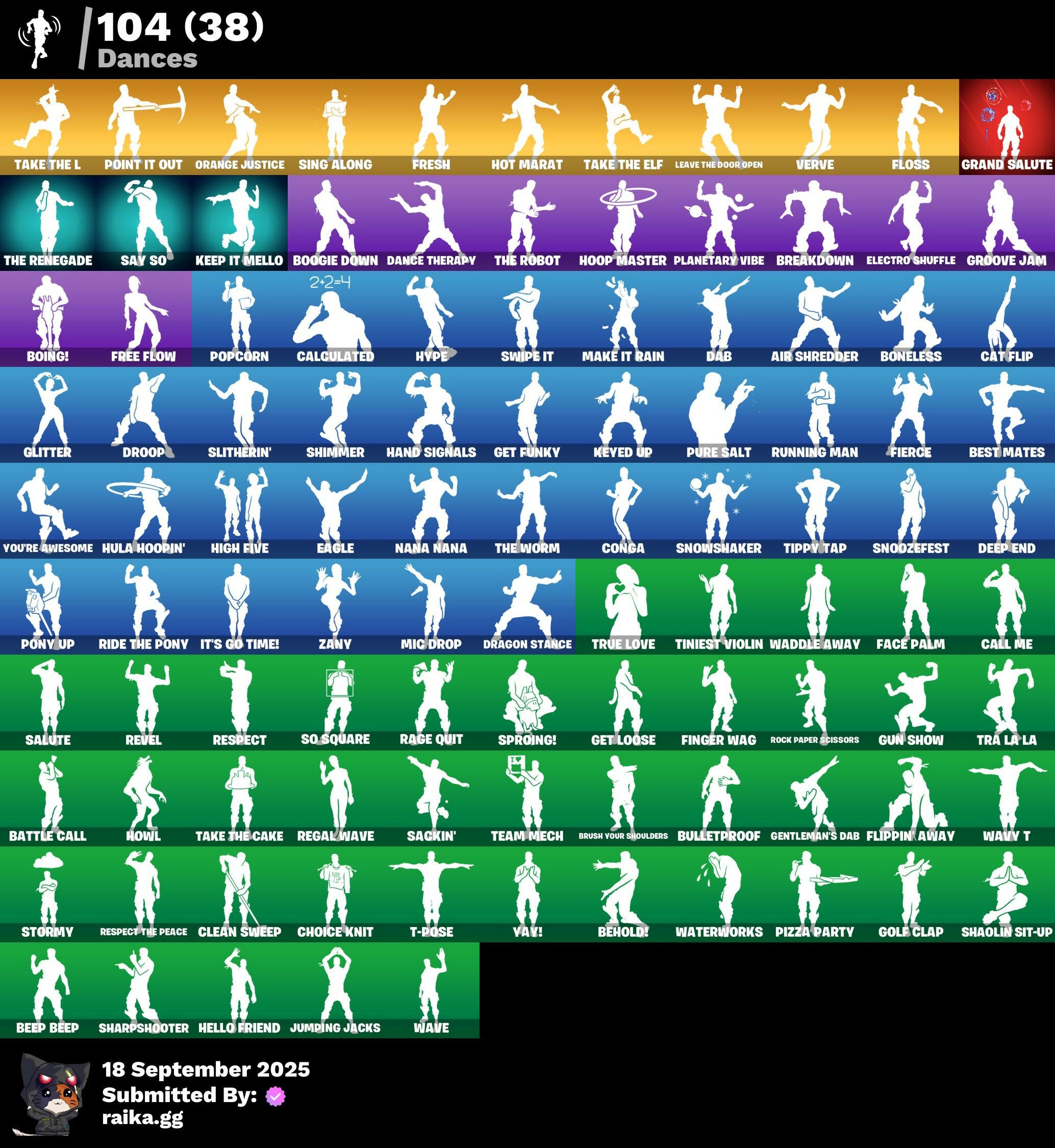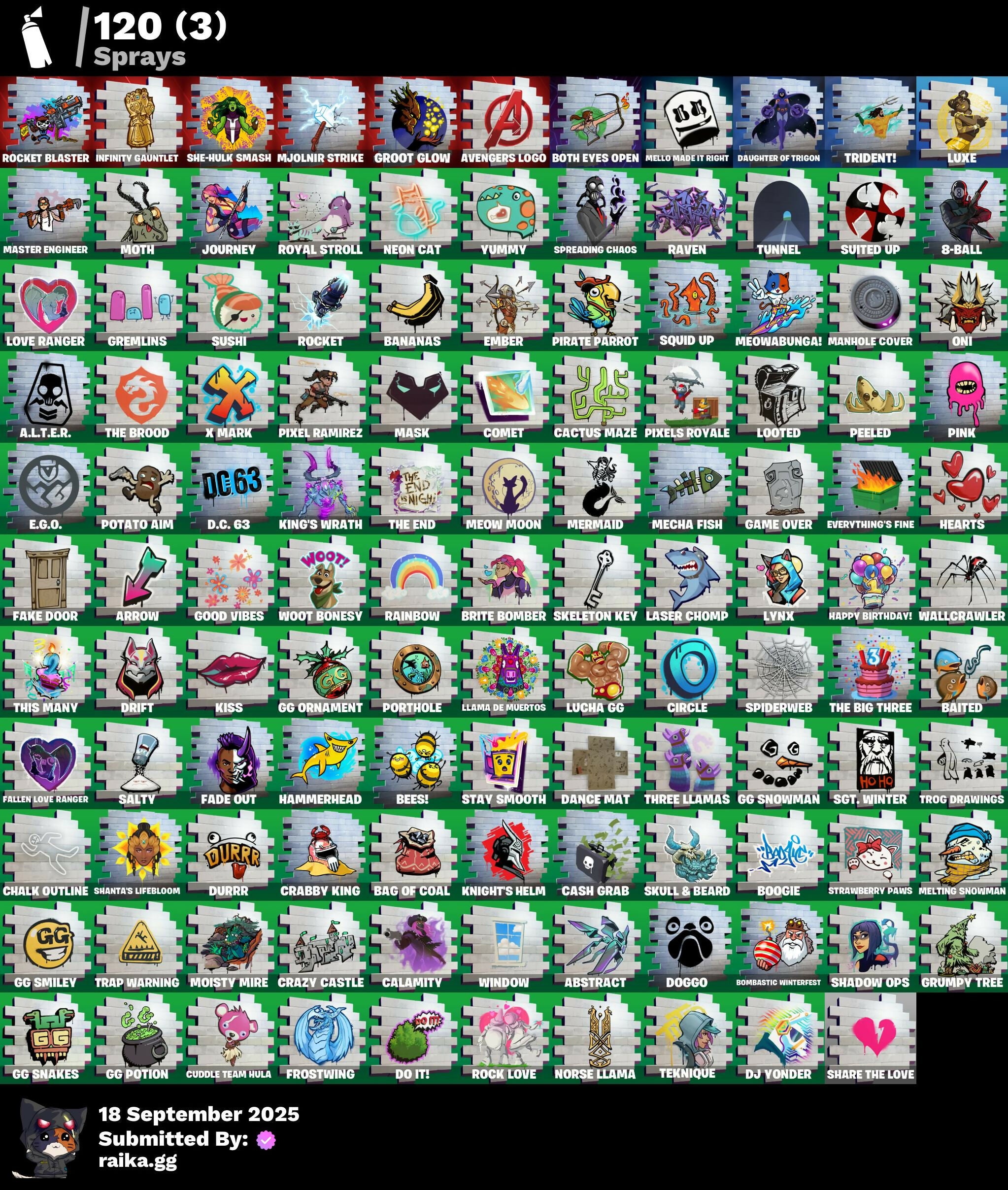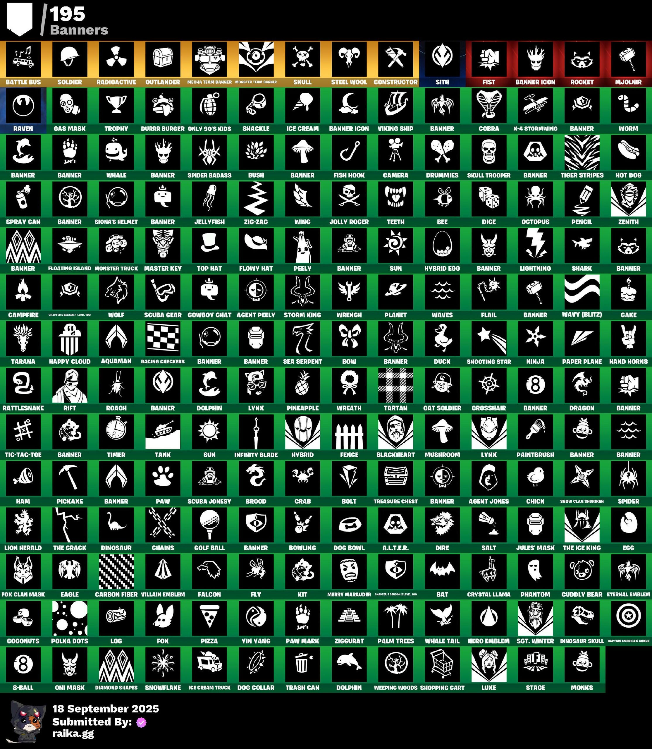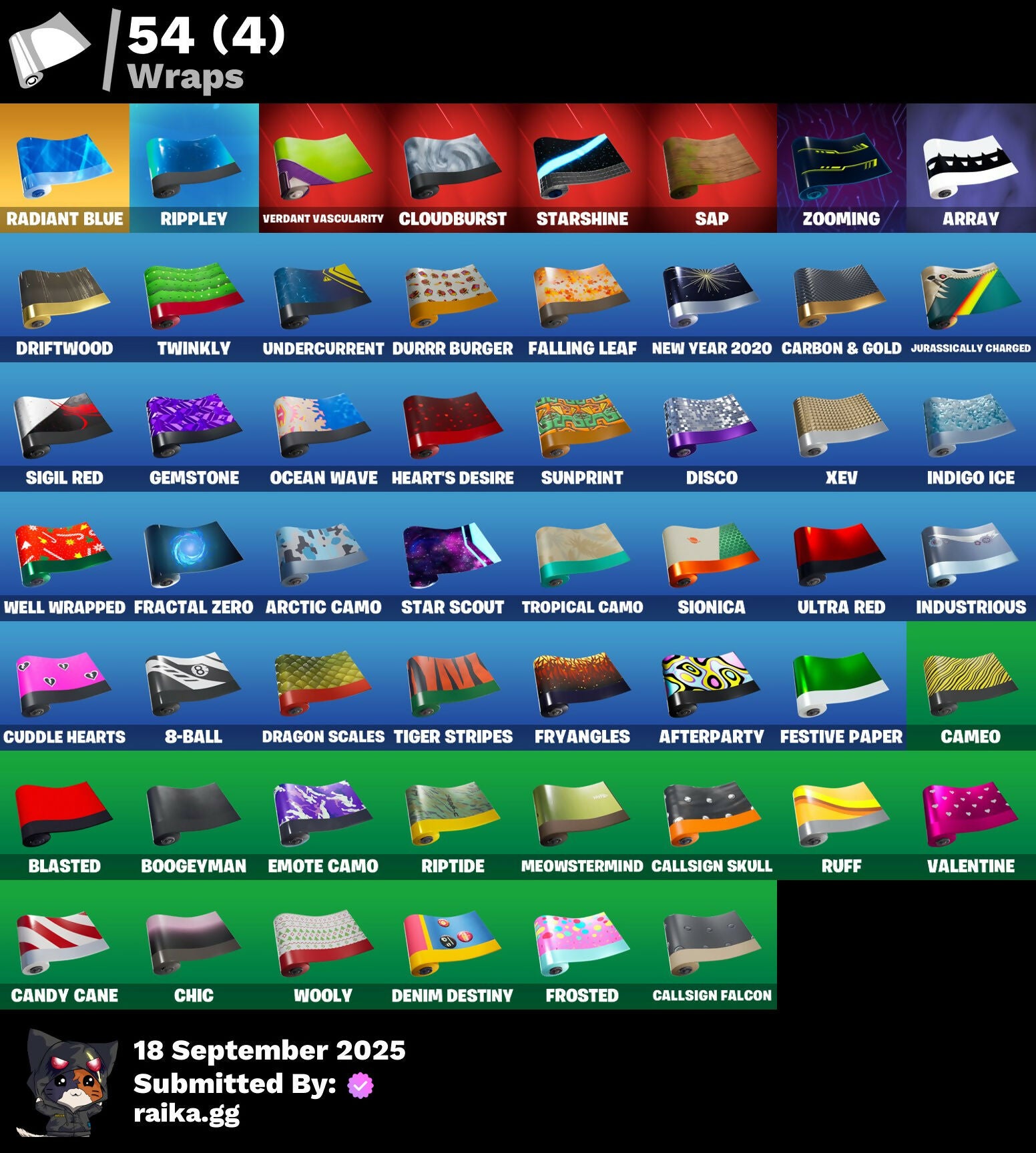 8-Ball, 8-Ball vs Scratch, A.L.T.E.R., AC/DC, Abominable Axe, Abstract, Afterparty, Agent Jones, Agent Peely, Air Shredder, Alpine Accessories, Alpine Ace, Altitude, Ancestral Bloom, Angler Axes, Antidote, Aquaman, Aquaman's Trident, Arcana, Arctic Camo, Array, Arrow, Arroyo Pack, Arthur Curry, Astro, Astroworld Cyclone, Avengers Logo, Avengers Quinjet, Axe-tral Form, Axecalibur, Axercise, Back Board, Backstabber, Bag Of Coal, Baited, Ball Bling, Balloon Axe, Bananas, Bananaxe, Bank Shots, Banner, Banner Icon, Base Jumper, Basecamp Bag, Basic Basher, Bat, Battle Bus, Battle Call, Battlehawk, Beach Umbrella, Beachcomber, Bee, Beep Beep, Bees!, Behold!, Best Mates, Big Bad Axe, Birthday Cake, Black, Blackheart, Blackheart (Stage 8), Blackout Bag, Blade Bag, Blade Raven, Blade of the Waning Moon, Bladed Bag, Blasted, Blaze, Blitz Axe, Blizzabelle, Blue Shift, Blue Squire, Blue Streak, Blue Striker, Blue Team Leader, Boing!, Bolt, Bombastic Winterfest, Boneless, Boogeyman, Boogie, Boogie Down, Bootstraps, Booty Buoy, Both Eyes Open, Boulder Breakers, Bow, Bowling, Breakdown, Brella, Brite Bomber, Brood, Brush Your Shoulders, Bulletproof, Bush, Cactus Maze, Cake, Calamity, Calamity Stage 5, Calculated, Call Me, Callsign Falcon, Callsign Skull, Cameo, Cameo vs Chic, Camera, Campfire, Candy Cane, Captain America's Shield, Carbide, Carbon, Carbon & Gold, Carbon Commando, Carbon Fiber, Carbon Pack, Cash Grab, Cat Flip, Cat Soldier, Catalyst, Chains, Chalk Outline, Chic, Chick, Chigusa, Chill-axe, Choice Knit, Cinder, Circle, Classified, Clawz Retro, Clean Sweep, Cloudburst, Coaxial Blue, Cobalt, Cobra, Coconuts, Cold Front, Combat Wreath, Comet, Comet Crasher, Conga, Conquest, Constructor, Controller, Convergence, Cosmic Cleavers, Covered Crusader, Cowboy Chat, Cozy Coaster, Crab, Crabby King, Crazy Castle, Crazy Eight, Crescent Shroom, Crossfire, Crosshair, Crowbar, Cruiser, Crystal Llama, Cuddle Hearts, Cuddle Team Hula, Cuddly Bear, D.C. 63, DJ Yonder, Dab, Dance Mat, Dance Therapy, Dark Engine, Dark Matter, Dark Voyager, Daughter Of Trigon, Deep Dive, Deep End, Denim Destiny, Devastator, Diamond Shapes, Dice, Dino Deck, Dinosaur, Dinosaur Skull, Dire, Disco, Dive Knives, Do It!, Dog Bowl, Dog Collar, Doggo, Dolphin, Downpour, Downshift, Dragon, Dragon Scales, Dragon Stance, Dragon's Claw, Dread, Drift, Drift Stage 5, Driftwood, Droop, Drummies, Duck, Durrr, Durrr Burger, Dusk, Dusk Wings, Dying Light, E.G.O., Eagle, Egg, Electro Shuffle, Electro-fied!, Elite Agent, Ember, Ember (Night), Emote Camo, Enforcer, Eon Blades, Equalizer, Eternal Emblem, Eternal Knight, Eternal Shield, Eva, Everything’s Fine, Fable, Fabled Cape, Face Palm, Fade, Fade Out, Fake Door, Falcon, Fallen Love Ranger, Falling Leaf, Fence, Festive Paper, Field Flyer, Fierce, Finger Wag, Firestarter, First Strike Specialist, Fish Hook, Fishstick (World Cup), Fishy Flier, Fist, Fiststick (World Cup), Flail, Flapjackie, Flappy, Flawless, Flippin Away, Floating Island, Floss, Flowy Hat, Fly, Fortilla Flier, Foundational 'Brella, Founder's Glider, Founder's Umbrella, Fox, Fox Clan Mask, Fractal Zero, Free Flow, Freezing Point, Fresh, Frostbite, Frosted, Frostwing, Frozen Axe, Frozen Shroud, Fryangles, Funk Ops, Fusion, Fusion Coil, Fusion Orb, Fusion Scythe, GG Ornament, GG Potion, GG Smiley, GG Snakes, GG Snowman, Galaxy Scout, Gale Force, Game Over, Gas Mask, Gemstone, Gentleman's Dab, Get Down!, Get Funky, Get Loose, Giddy-Up, Glidurrr, Glitter, Golden Disco, Golf Ball, Golf Clap, Good Vibes, Goodie Bag, Grand Salute, Gremlins, Groot, Groot Glow, Groots Sap Axes, Groove Jam, Grumpy Tree, Guard Pup, Guiding Glow, Gun Show, H4ck // P4ck, Hack // Pack, Ham, Hammerhead, Hammers of Justice, Hand Horns, Hand Signals, Happy, Happy Birthday!, Happy Cloud, Hazard, Heart's Desire, Hearts, Hello Friend, Hero Emblem, High Caliber, High Five, High Octane, Highlight Strikers, Holly Hatchets, Hoop Master, Hot Dog, Hot Marat, Howl, Hula Hoopin', Huntress, Hybrid, Hybrid (Stage 4), Hybrid Egg, Hydraulic Wrecker, Hype, Ice Breaker, Ice Cream, Ice Cream Truck, Ice Cube, Ice King (Gold), Ice Mantle, Ice Scepter, Indigo Ice, Industrious, Infinite Bloom, Infinity Blade, Infinity Gauntlet, Intrepid, It's Go Time!, Jellyfish, Jennifer Walters, Jolly Roger, Journey, Journey vs Hazard, Jules, Jules' Mask, Jumping Jacks, Junk Bucket, Jurassically Charged, Keep It Mello, Keyed Up, King’s Wrath, Kiss, Kit, Knight’s Helm, Krisabelle, Laser Chomp, Lavawing, Leave The Door Open, Lightning, Lil' Kev, Lion Herald, Llama De Muertos, Lobby Classic, Lockpick, Lockstep, Log, Lollipopper, Looted, Love Ranger, Low 'n Slow, Lt. Evergreen, Lucha GG, Lucky, Lucky Coins, Lug Axe, Luxe, Luxe (Gold Clothing), Lynx, Lynx (Stage 4 - No Ponytail), Make It Rain, Mako, Manhole Cover, Marshy Smasher, Mask, Masked, Master Engineer, Master Key, Master Key (Masked), Master Portal, Mean Streak, Mecha Fish, Mecha Team Banner, Medaxe, Megumi, Mello Made It Right, Melting Snowman, Meow Moon, Meowabunga!, Meowstermind, Mermaid, Merry Marauder, Metalmark, Mic Drop, Mighty Marvel 'Brella, Millennium Falcon, Mini Moon, Mission Specialist, Mjolnir, Mjolnir Strike, Mjolnir's Path, Moisty Mire, Molten Battle Hound, Molten Crested Cape, Molten Valkyrie, Molten Valkyrie Wings, Monks, Monster Team Banner, Monster Truck, Moonwalker, Moth, Mushroom, Mutiny, Nana Nana, Neon Cat, New Year 2020, Nibbles, Nightlife, Nightshade, Ninja, Nog Ops, Norse Llama, Nucleus, Ocean, Ocean Wave, Octopus, Offworld Rig, Og Aerial Assault One, Ohm, Ol' Woody, Omega, Onesie, Onesie (Winter), Oni, Oni Mask, Only 90's Kids, Onslaught, Orange Justice, Outlander, Padlock, Paintbrush, Palm Leaf, Palm Trees, Paper Parasol, Paper Plane, Pathfinder, Paw, Paw Mark, Peeled, Peely, Pencil, Peppermint Pick, Perfect Present, Perfect Shadow, Perfect Wings, Permafrost, Phantom, Pickaxe, Picnic, Pigskin, Pineapple, Pink, Pink Flamingo, Pirate Parrot, Pixel Ramirez, Pixels Royale, Pizza, Pizza Party, Planet, Planetary Vibe, Plu