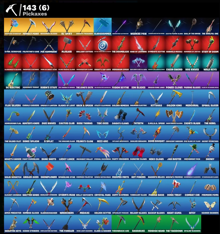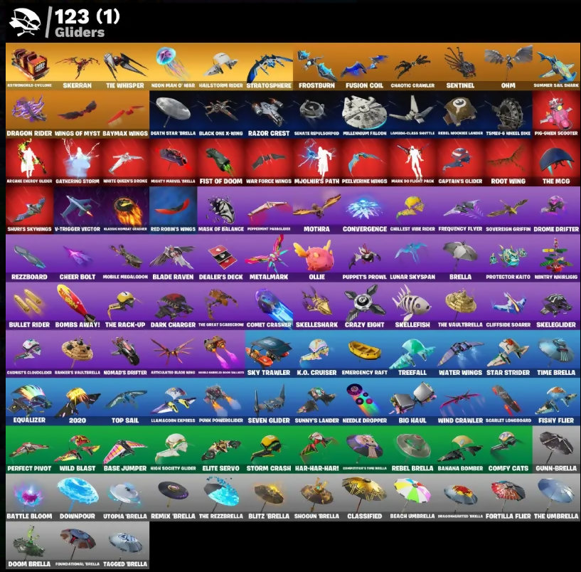 (Snikt!), 2020, 501st Trooper, 999 Knives, Adira (Battle Mask), Aerial Assault Trooper, Agent Peely, Air Shredder, Angler Axes, Apex Predator, Apprentice Evie, Aquaman's Trident, Arcane Energy Glider, Arcane Research, Arctic Adeline, Arctic Assassin, Armored Clone Trooper, Arthur Curry, Articulated Blade Wing, Astroworld Cyclone, B Splat, Backup Blades, Banana Bomber, Bananaxe, Bank Shots, Baron's Hoard, Base Jumper, Battle Blessing, Battle Bloom, Battle Call, Baymax Wings, Beach Umbrella, Bear Hug, Beep Beep, Big Haul, Billy, Bird Call, Birdarang Flourish, Bitev, Black, Black One X-Wing, Black Panther (World), Black Queen, Blade Of The Nunno Moon, Blade Raven, Blades Of Light, Blinky, Blitz 'Brella, Blowin' Up, Boing!, Bomb Bouquet, Bombs Away!, Boogie Down, Boulder Breakers, Brella, Brilliant Cutters, Bullet Rider, Bulletproof, Buzz (Guardian Strider), Cactus Club, Call Me, Camo War Machine, Captain America, Captain America's Shield & Pickaxe, Captain Phasma, Captain's Glider, Cauldron Chill, Chain-Sword, Chained Up 1-Ball, Chaotic Crawler, Cheer Bolt, Chic (Yellow), Chillest Vibe Rider, Choice Knit, Christs Cloudglider, Chun-Li (Street Fighter), Clang & Basher, Classic Peleverde, Classified, Clean Sweep, Cliffside Soarer, Clone Trooper, Coin Flip, Combat Cue, Comet Crasher, Comfy Cats, Competitor's Tye Brella, Convergence, Coruscant Guard, Crazy Eight, Crescent Shroom, Crimson Polestar, Crooning Cleverbot, Crystal Fang, Cuddle Carvers, Cyclo Curl, Daigo's Claws, Dark Charger, Dark Gwenpool, Darkfire Claws, Darth Vader, Deadpool Unmasked, Dealer's Deck, Death Star Brella, Demon Hunter Hope, Dive Knives, Doctor Doom (Job Member), Dogg Treat, Doom, Doom Brella, Doom's Domain, Double-Barrelled Boom Sabers, Downpour, Doze Dab, Dragon Rider, Dragon Rune Lance, Dragon-Daunted Brella, Drome Drifter, Droop!, Dupli-Kate, Duplicating Batons, Duplikates, Dusk Knight, Dynamo Tntoon-A, Eddie Brock, Electro Riffing Blades, Elegant Crowbar, Elite Servo, Emergency Raft, Emperor Palpatine, Energized Godzilla, Eon Blades, Epic Blade Of Flood, Epic Swords Of Wonder, Equalizer, Eternal Razorwing, Explorer Emilie, Fade, Feel The Force, Felina, Felina's Claw, Fiendish Wand, Firework, Fireworks Salvo, Fishy Flier, Fist Bump, Fist Of Doom, Flippin' Away, Flux Silvera, Focused, Foil Flex, Fortilla Flier, Foundational 'Brella, Frequency Flyer, Frostburn, Frosted Frets, Full Tilt, Fusion Coil, Fusion Scythe, Gathering Storm, Gear Specialist Maya, General Grievous, Gentleman's Dab, Get Griddy, Gilded Morphic Blades, Gold Brutus, Gold Midas, Golden King, Golden Nemesis, Golden Scythe, Good Game, Well Played, Groot, Groots Sap Axes, Guardian Jade, Guffy G-String, Gunn-Brella, Gwen-Step, Hack & Smash, Hailstorm Rider, Hammers Of Justice, Hand Of Lightning, Handheld Missile, Happy, Har-Har-Har!, Have A Seat, Haylee Skye, Hazard, Heart's Carver, Hellfire Dance, High Five, High Society Glider, Highlight Strikers, Holiday Boxy, Holly Hatchets, Homegrown Flail, Hot Pokers, Hula Hoopin', Humbug Slicer, Hunter's Knife, Hype!, I Declare!, Illusionist's Blades, Illusory Mysterio, Imperial March, Indiana Jones, Introducing..., Invisible Cut, Iridia Vayne, It Is Finished, Jar Buster, Jennifer Walters, Jet Signals, Joltara, Juice Wrld, K.O. Cruiser, Keyed Up, Killswitch, Kintsugi Daigo, Kittanas, Klassic Kombat Glider, Knight's Treachery, Kofi Graves, Krisabelle, Lambda-Class Shuttle, Leafy Longboardin', Leatherface, Lightrider, Lil' Godzilla Attack, Lil' Prancer, Lil' Resistance Bomber, Lil' Shady Mobile, Lil' Treadspeeder, Live From Hallowdell, Llamacorn Express, Love It!, Lt. Evergreen, Lucid Dreams, Lucky Lance, Lucky Nyanja, Lunar Skyspan, Mahagorg Electrostaff, Make A Seat, Mandalorian, Manic, Mark 85 Energy Blade, Mark 90 Flight Pack, Mask Of Balance, Masked, Medaxe, Meowscles, Mercurial, Metalmark, Michael Myers, Microbot Mallet, Midnight Skye, Mighty Marvel Brella, Millennium Falcon, Mini Dogfight, Mjolnir, Mjolnir's Path, Mobile Megalodon, Morgan Myst, Mothra, My World, Mysterio's Magic Trick, Mystique (Tactical), Nakamartum Claws, Nanner Bashers, Needle Dropper, Neko Claws, Neon Man O' War, Night Kama, Nomad's Drifter, O.M.E.G.A. Spear, Obi-Wan's Message, Ohm, Ol Spiky, Ollie, Opaline Slashers, Origami Battalion, Outlaw's Whipnives, Owenpool's Katanas, Paddle Bass, Paint Pummellers, Pairing Blades, Palpatine's Cane, Pandemonium, Party Crashers, Party Hips, Patch Patroller, Paws & Claws, Payback, Peel Out, Peppermint Paraglider, Peppermint Pick, Peregrine Wings, Perfect Pivot, Perfect Point, Pig-Queen Scooter, Planetary Vibe, Poe Dameron, Poe Hammerin', Point Patroller, Polar Peely, Power Claws, Premiere Poms, Protector Kaito, Punk Powerglider, Puppet Dance, Puppets Prowl, Purr-Demonium, Pwr Punch, Quicksilver Baton Spear, Racer Kendo, Raider's Relics, Ranker's Vaultbrella, Rap Boy Reloaded, Raven's Legion, Razor Crest, Rebel Brella, Rebel Moonkie Lander, Reckoner's Blades, Red Robin's Wings, Reliant Blades, Remedy (Purple), Remix 'Brella, Renegade Raider, Respect The Peace, Restored Night Rose, Rezz-Arc, Rezzblocks, Rezzboard, Rhythm Of Chaos, Rippley (Purple), Riptide, Robin, Robin's Staff, Root Wing, Rose Light Daggers, Rose Thorns, Runway Racer, S-Foil Scrapaxe, SC Electric, Sabina (Ponytail), Samurai Baymax, Samurai-Sadonal, Santa Dogg, Say So, Scarlet Longboard, Scorecard, Scratch (Virus), Secret Scimitars, Senate Repulsorpod, Sentinel, Seven Glider, Shadow Meowdas, Shadowstrider Outlaw Rampage, Shadowstruck Director, Shamisen Electric, Shaolin Sip, Sharpshooter, Shatter Sonic, Shogun 'Brella, Shooting Starstaff, Shortbread Slicers, Show 'Em Off, Showtime, Shuri's Skywings, Shuriken Spinner, Side Hustle, Sigil Of The Empire, Siona, Skatemonster, Skeleglider, Skeleton Keys, Skellefish, Skelleshark, Skerran, Sky Trawler, Skye, Slaver Juice Wrld, Sled Ready Guff, Sledgecracker, Sludgehammer, Smash O'-Lantern, Snap, Snoop Dogg, Snoppy's Golduzzle Bass, Snowplower, Snowshaker, Snowy, So Square, Solid Scratch, Sonic S