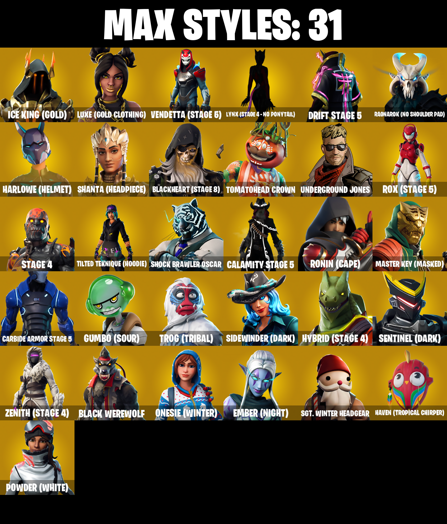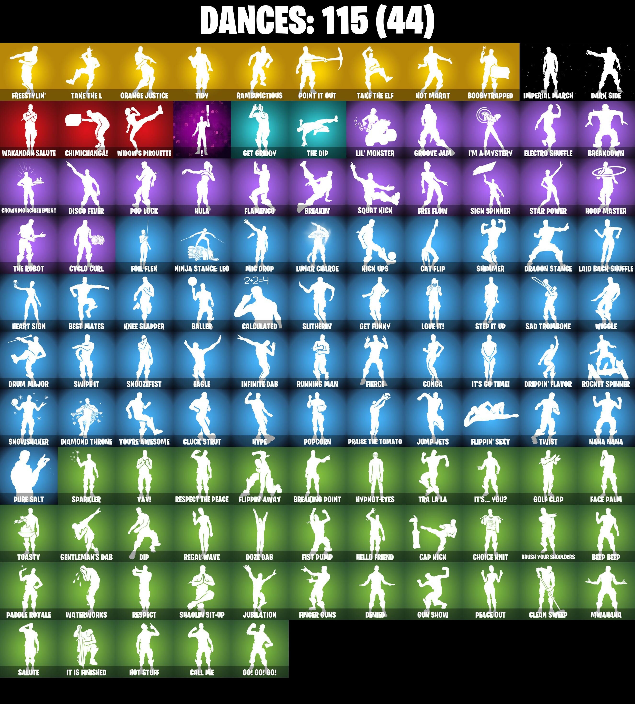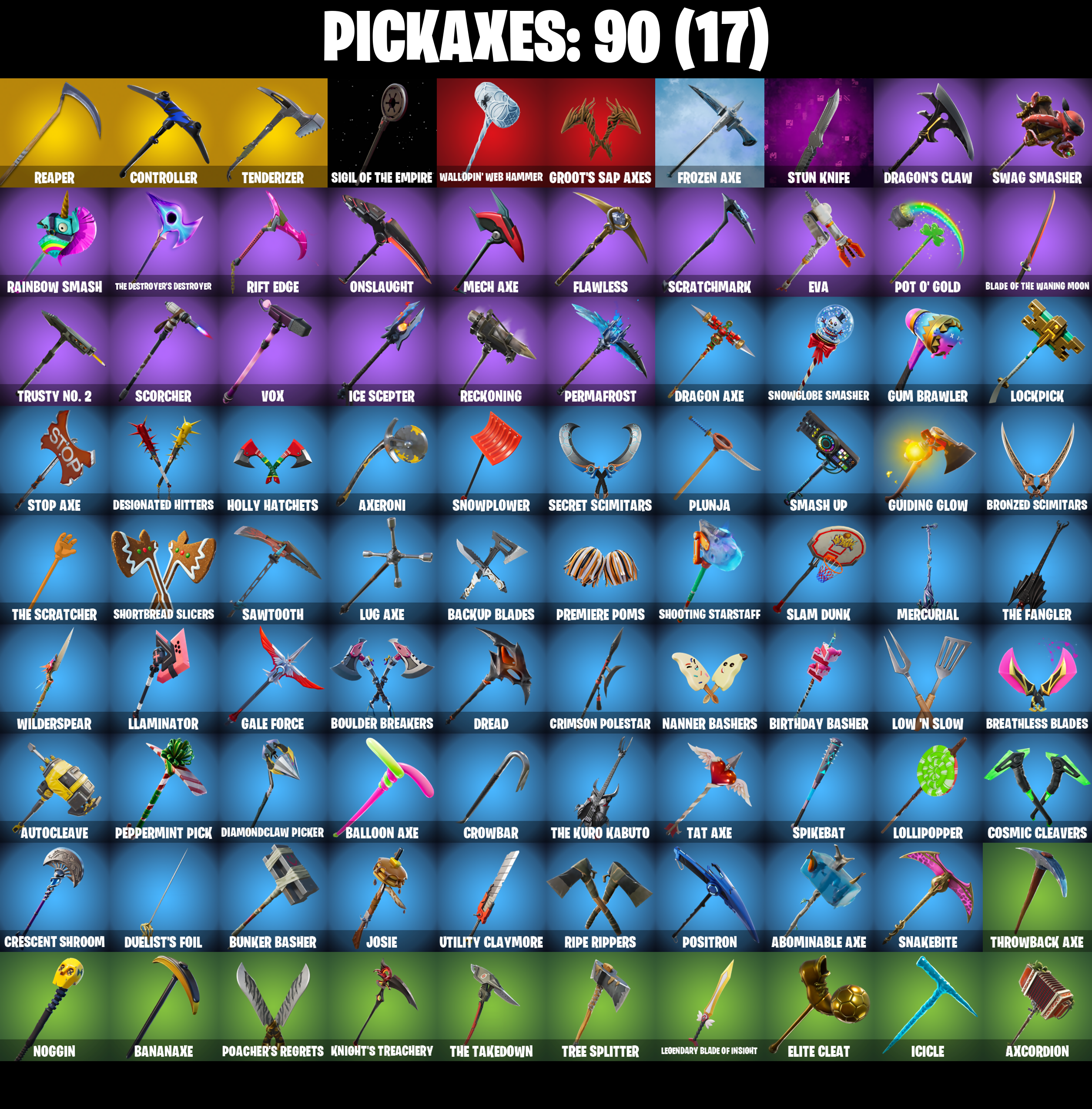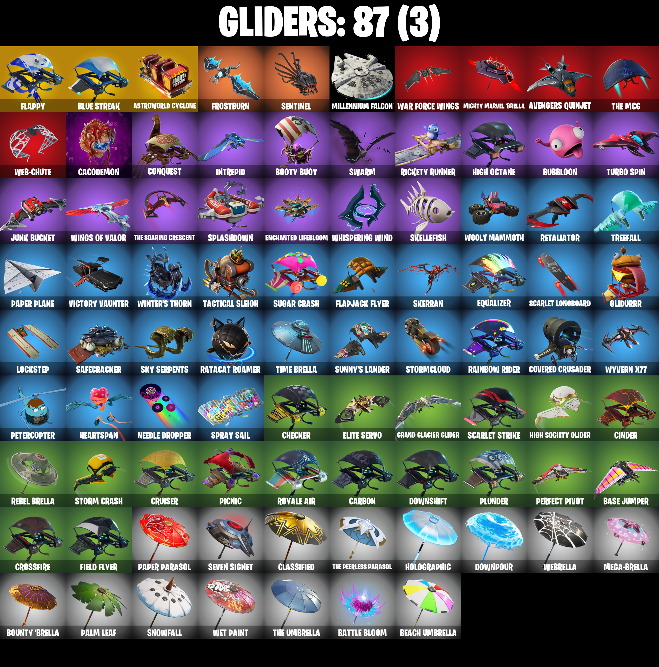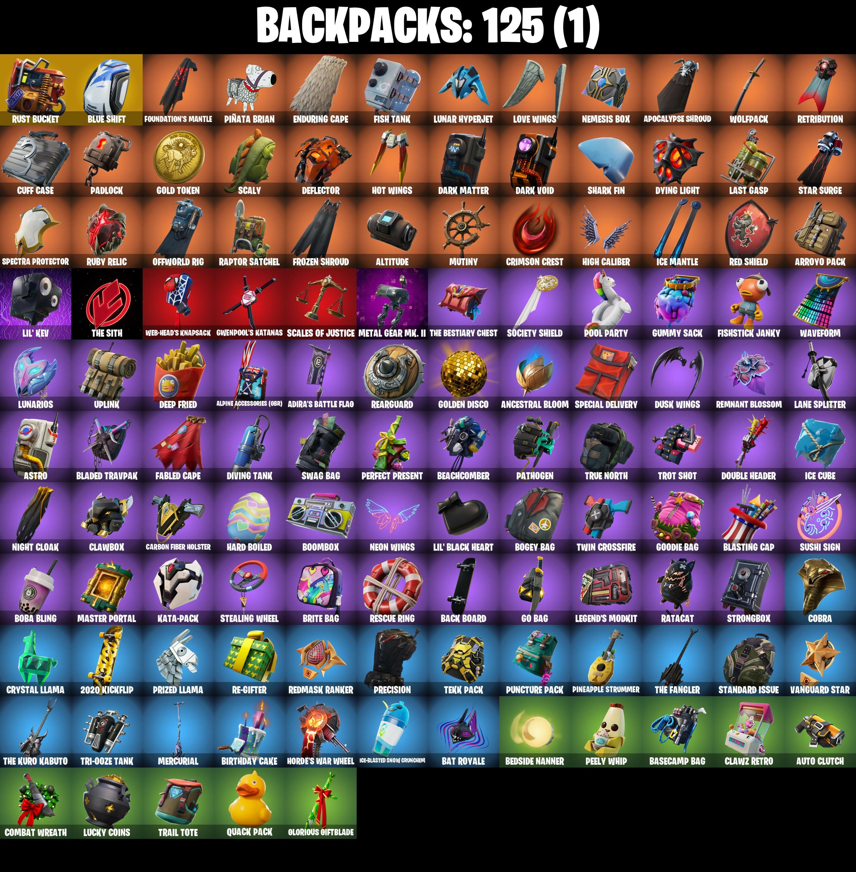 2020 Kickflip, Abominable Axe, Adira's Battle Flag, Alpine Accessories (OBR), Alpine Ace (GBR), Altitude, Ancestral Bloom, Apocalypse Shroud, Arroyo Pack, Astro, Astroworld Cyclone, Auto Clutch, Autocleave, Avengers Quinjet, Axcordion, Axeroni, Back Board, Backup Blades, Baller, Balloon Axe, Bananaxe, Base Jumper, Basecamp Bag, Bat Royale, Battle Bloom, Battlehawk, Beach Umbrella, Beachcomber, Bedside Nanner, Beef Boss, Beep Beep, Best Mates, Birthday Basher, Birthday Cake, Black Werewolf, Blackheart, Blackheart (Stage 8), Blade of the Waning Moon, Bladed Travpak, Blasting Cap, Blue Shift, Blue Streak, Blue Striker, Blue Team Leader, Boba Bling, Bogey Bag, Boobytrapped, Boombox, Booty Buoy, Boulder Breakers, Bounty 'Brella, Breakdown, Breakin', Breaking Point, Breathless Blades, Brite Bag, Brite Bomber, Brite Gunner, Bronzed Scimitars, Brush Your Shoulders, Bubblicon, Bunker Basher, Bunker Jonesy, Cacodemon, Calamity, Calamity Stage 5, Calculated, Call Me, Cap Kick, Carbide, Carbide Armor Stage 5, Carbon, Carbon Fiber Holster, Cat Flip, Catalyst, Checker, Chimichanga!, Choice Knit, Chomp Sr., Cinder, Classified, Clawbox, Clawz Retro, Clean Sweep, Cluck Strut, Cobra, Combat Wreath, Conga, Conquest, Controller, Cosmic Cleavers, Covered Crusader, Crescent Shroom, Crimson Crest, Crimson Polestar, Crossfire, Crowbar, Crowning Achievement, Cruiser, Crystal Llama, Cuff Case, Cyclo Curl, DJ Yonder, Dark Matter, Dark Side, Dark Vanguard, Dark Void, Dark Voyager, Deep Fried, Deflector, Demi, Denied, Designated Hitters, Diamond Throne, Diamondclaw Picker, Diecast, Dip, Dire, Disco Fever, Diving Tank, Double Header, Downpour, Downshift, Doze Dab, Dragon Axe, Dragon Stance, Dragon's Claw, Dread, Drift, Drift Stage 5, Drippin' Flavor, Drum Major, Duelist's Foil, Dusk, Dusk Wings, Dying Light, Eagle, Electro Shuffle, Elite Agent, Elite Cleat, Elite Servo, Ember, Ember (Night), Enchanted Lifebloom, Enduring Cape, Equalizer, Eva, Fable, Fabled Cape, Face Palm, Field Flyer, Fierce, Finger Guns, Fireworks Team Leader, Fish Tank, Fishstick Janky, Fist Pump, Flamenco, Flapjack Flyer, Flappy, Flawless, Flippin' Away, Flippin' Sexy, Foil Flex, Foundation's Mantle, Free Flow, Freestylin', Frostburn, Frozen Axe, Frozen Shroud, Funk Ops, Gale Force, Gentleman's Dab, Get Funky, Get Griddy, Giddy-Up, Glidurrr, Glorious Giftblade, Go Bag, Go! Go! Go!, Gold Token, Golden Disco, Golf Clap, Goodie Bag, Grand Glacier Glider, Groot's Sap Axes, Groove Jam, Guiding Glow, Gum Brawler, Gumbo, Gumbo (Sour), Gummy Sack, Gun Show, Gwenpool's Katanas, Hard Boiled, Harlowe, Harlowe (Helmet), Haven, Haven (Tropical Chirper), Heart Sign, Heartspan, Hello Friend, High Caliber, High Octane, High Society Glider, Holiday Boxy, Holly Hatchets, Holographic, Hoop Master, Hope, Horde's War Wheel, Hot Marat, Hot Stuff, Hot Wings, Hula, Huntress, Hybrid, Hybrid (Stage 4), Hype, Hypnot-Eyes, I'm A Mystery, Ice Cube, Ice King (Gold), Ice Mantle, Ice Scepter, Ice-Blasted Snow Cruncher, Icicle, Imperial March, Infinite Dab, Intrepid, It Is Finished, It's Go Time!, It's... You?, Josie, Jubilation, Jump Jets, Jumpshot, Junk Bucket, Kata-Pack, Kick Ups, Knee Slapper, Knight's Treachery, Krisabelle, Lagona, Laid Back Shuffle, Lane Splitter, Last Gasp, Legend's Modkit, Legendary Blade of Insight, Leviathan, Lil' Black Heart, Lil' Key, Lil' Monster, Liteshow, Llaminator, Lockpick, Lockstep, Lollipopper, Love It!, Love Ranger, Love Wings, Low 'N Slow, Lt. Evergreen, Lt. John Llama, Lucky Coins, Lug Axe, Lunar Charge, Lunar Hyperjet, Lunarios, Luxe, Luxe (Gold Clothing), Lynx, Lynx (Stage 4 - No Ponytail), Magnus, Master Key, Master Key (Masked), Master Portal, Mayhem, Mech Axe, Mega-Brella, Mercurial, Metal Gear Mk. II, Mic Drop, Midfield Maestro, Mighty Marvel 'Brella, Millennium Falcon, Mission Specialist, Montague, Moonwalker, Mullet Marauder, Mutiny, Mwahaha, Nana Nana, Nanner Bashers, Needle Dropper, Nemesis Box, Neon Wings, Night Cloak, Nightshade, Ninja Stance: Leo, Nisha, Nog Ops, Noggin, Offworld Rig, Omega, Onesie, Onesie (Winter), Onslaught, Orange Justice, Oscar, Overtaker, Paddle Royale, Padlock, Palm Leaf, Paper Parasol, Paper Plane, Pathogen, Peace Out, Peely, Peely Whip, Peppermint Pick, Perfect Pivot, Perfect Present, Permafrost, Peter Griffin, Petercopter, Picnic, Pineapple Strummer, Piñata Brian, Plunder, Plunja, Poacher's Regrets, Point It Out, Polar Peely, Pool Party, Pop Lock, Popcorn, Positron, Pot O' Gold, Powder, Powder (White), Praise The Tomato, Precision, Premiere Poms, Prized Llama, Puncture Pack, Pure Salt, Quack Pack, Rabbit Raider, Ragnarok, Ragnarok (No Shoulder Pad), Rainbow Rider, Rainbow Smash, Rambunctious, Raptor, Raptor Satchel, Ratacat, Ratacat Roamer, Re-Gifter, Reaper, Rearguard, Rebel Brella, Reckoning, Red Knight, Red Shield, Redline, Redmask Ranker, Regal Wave, Remnant Blossom, Rescue Ring, Respect, Respect The Peace, Retaliator, Retribution, Rex, Rickety Runner, Rift Edge, Ripe Rippers, Rocket Spinner, Ronin, Ronin (Cape), Rook, Rox, Rox (Stage 5), Royale Air, Ruby Relic, Ruin, Running Man, Runway Racer, Rust Bucket, Rust Lord, Sad Trombone, Safecracker, Salute, Sash Sergeant, Sawtooth, Scales of Justice, Scaly, Scarlet Lonoboard, Scarlet Strike, Scorcher, Scoundrel, Scratchmark, Secret Scimitars, Sentinel, Sentinel (Dark), Seven Signet, Sgt. Green Clover, Sgt. Winter, Sgt. Winter Headgear, Shanta, Shanta (Headpiece), Shaolin Sit-Up, Shark Fin, Shimmer, Shock Brawler Oscar, Shooting Starstaff, Shortbread Slicers, Sidewinder, Sidewinder (Dark), Sigil of the Empire, Sign Spinner, Skellefish, Skerran, Sky Serpents, Sky Stalker, Slam Dunk, Sledgehammer, Slitherin', Smash Up, Snakebite, Snoozefest, Snorkel Ops, Snowfall, Snowglobe Smasher, Snowplower, Snowshaker, Society Shield, Solid Snake, Sonflower, Sparkler, Special Delivery, Spectra Protector, Spider-Man, Spikebat, Splashdown, Spray Sail, Squad Leader, Squat Kick, Stage 4, Standard Issue, Star Power, Star Surge, Star-Spangled Trooper, Stealing Wheel, Step 