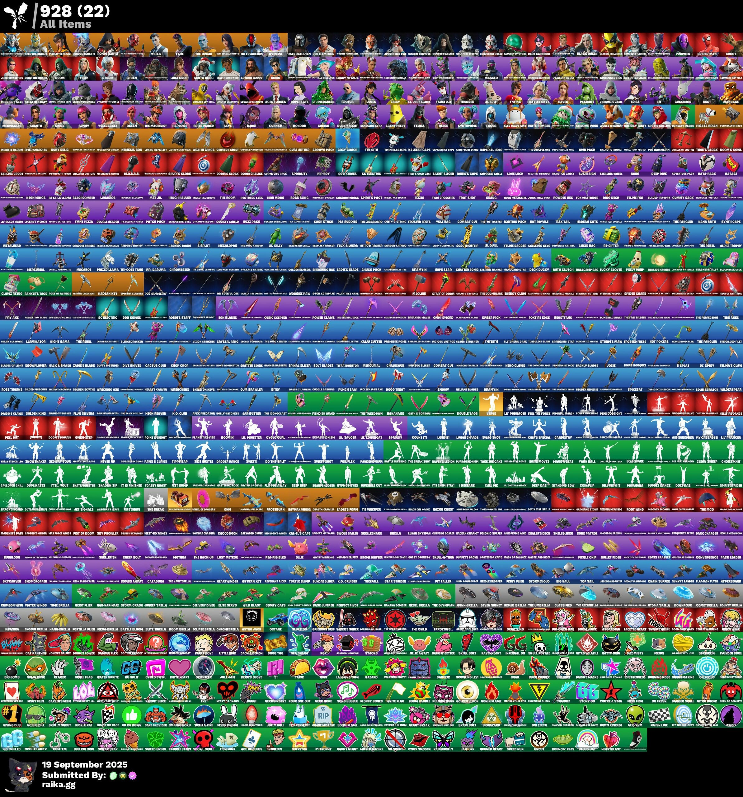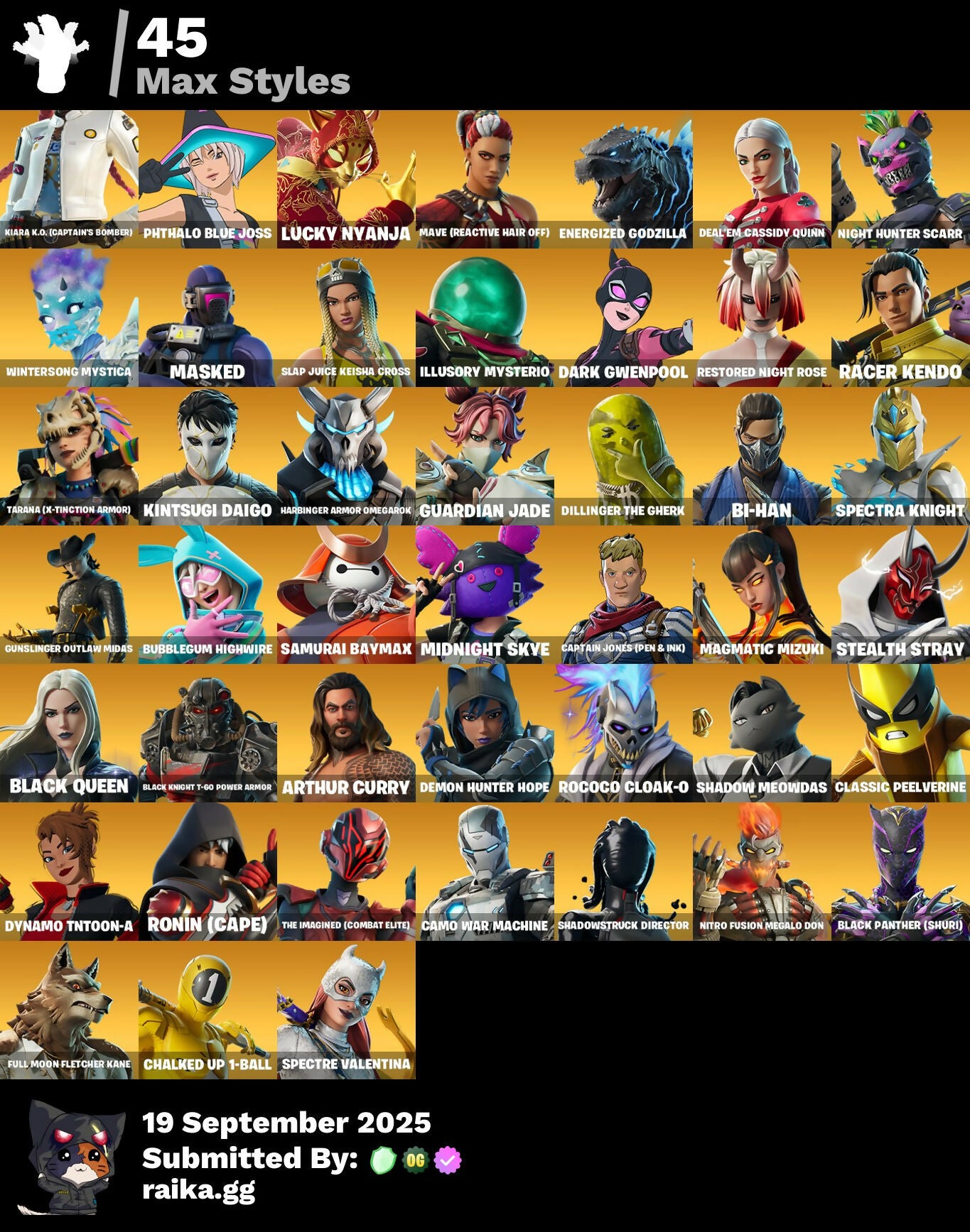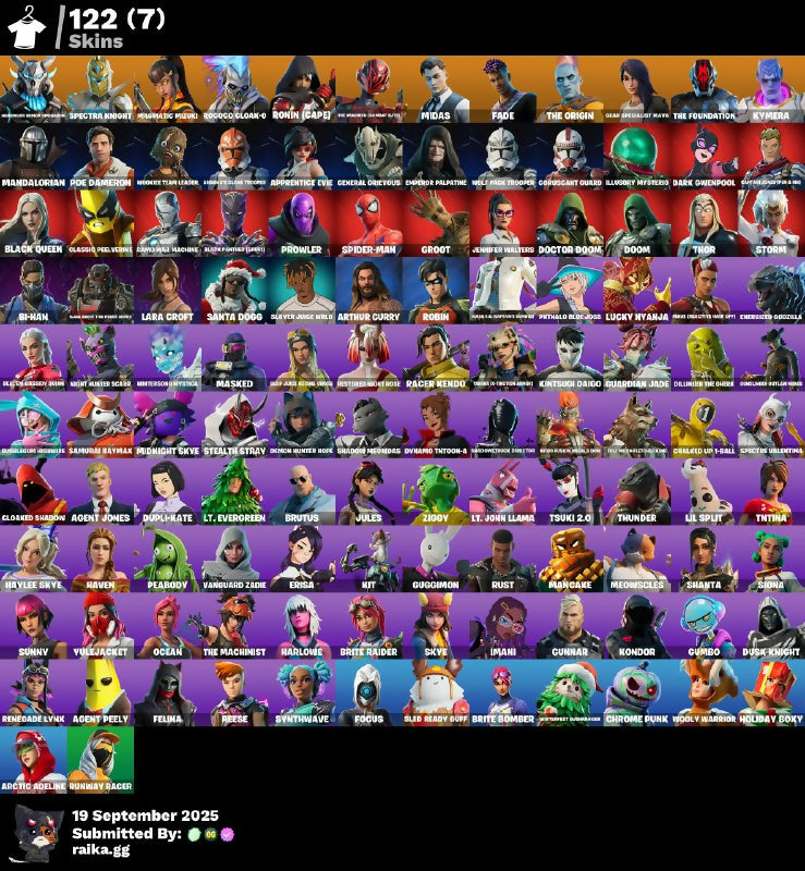 (The list contains many more small icons and text elements, but these above are the comprehensible names extracted with confidence.), 1E, 2020 Kickflip, Acestral Bloom, Adventure Pack, Aerosmith Cryo Ghost, Agent Jones, Agent Peely, Alpha Trophy, Among Us, Ani Siren, Anna (Lara Croft Hair Option), Apex Predator, Apprentice Evie, Apprentice Eye, Arctic Adeline, Arm Raise, Arroyo Pack, Arthur Curry, Arthur Currys, Assaultman Blad, Astari, Astro Jack, Astroworld Cyclone, Audio L4 Machine, Auto Clutch, AwR Pack, Awayboy’s Torch, Axe Slicer, B-Splat, Backling Robin, Backup Blades, Bananake, Basecamp Bag, Bat Royale, Beachcomber, Bearpaw, Beastfang, Beastie Monty, Bedge Kickler, Berserker, Beside Mid Knight, Bi-Han, Bitey, Blaad Trivka, Black Clover, Black Hand (NYC?), Black Knight T-60 Power Armor, Black Panther, Black Panther (Shuri), Black Queen, Blacksend Bell, Blades of Light, Blank Chor, Bloomback Bag, Blue Legendary John, Bluesteady Tiger, Boba Bling, Bobo, Bolt Blades, Bomb Bouquet, Breaking Knives, Brilliant Outfit, Brilliant Outfits, Brite Bomber, Brite Raider, Broken Storms, Brutus, Bubblegum Highwire, Bully Maw, Bunny Brawler, Cactus Club, Camo War Machine, Canguin, Captain Jones (Pen & Ink), Cash Stash, Cassie Peterson, Cathedral, Chainsaw, Chalked Up 1-Ball, Chalked Up L-RAL, Chaud & Banana, Cheer Bag, Chop Chop, Chrome Punk, Chromehead, Chuck Pack, Classic Peel Vinnie, Classic Peelverine, Cloaked Shadow, Coldjar (Apprentice Evie), Combat Cue, Condor, Cozy Conch, Crescent Sceodor, Crimson Crest, Crimson Striker, Crystal Fangs, Cube Aether, Cubed Pinscher, Cubic Scepter, Cuddly Carvers, DJ YAB0 Suisse, Daigo’s Claws, Dark Gwenpool, Dark Slayer's Tale, Day, Deadpool, Deal'em Cassidy Quinn, Deck Ducky, Deep Dive, Delirium The Queen, Demon Hunter Hope, Demon Hunter Rote, Devils Backplate, Devourer's Pack, Dillinger The Gherk, Dilly, Dino Deck, Dirk Evil, Dixie Knives, Doctor Doom, Dog Knives, Dog Treat, Doom, Doom's Cloak, Door Garlic, Doors of Coru, Dots & Doromo, Dots Dormant, Double Falch, Double Header, Double Tags, Dream Finn, Dreaminn, Drem, Drongo, Dryvus, Dumbbell Driver, Dupli-Kate, Duplicate, Dusk Knight, Duzz Pack, Dynamo Tnt109-8, Dynamo Tntoon-A, Dyno, Eagle, Elephant Command, Elsa, Ember Pick, Emperor Palpatine, Energized Godzilla, Energy Claw, Eon Blades, Erisa, Eternal Ranger, Eyeballs Catnap, F.R.I.-A Llama, Fade, Feel the Force, Felina, Felina's Cape, Feline Dagger, Feline Fun, Fever Guardian, Firestick Jacky, Fizzix, Flamewake, Flick, Floatmoths, Floon, Flux Silvera, Focus, Fool Scrapple, Foxfire Edge, Friednsh Wand, Frosted Feets, Frosted Pets, Full Moon Fletcher Kane, Full Necromancer, Galactic Smoker, Gamma Brand, Gargamel Griffon, Gear Specialist Maya, General Grievous, Geules of Annihilation, Ghosts Eyes Mask, Giant, Glanez Retro, Glory Orbs, Godzilla Momento, Gold Dagger Body, Golden Basher, Golden Daggers, Golden Emress, Golden Kensei, Golden King, Golden Scythe, Groot, Guardian Jade, Guardian Jude, Gudomon, Guffy 6-String, Guggimon, Gumbo, Gummy Sacks, Gun Brawler, Gunnar, Gunner, Gunny 6-String, Gunslinger Outlaw Midas, HaHa La Surprise (Spider-Man), Hack & Smash, Hadean Gate, Hadean Key, Handa-Ken, Harambeology Club, Harbinger Armor Omegarok, Harlowe, Hawk Pick, Haylee Skye, Hayvon, Head Kidder, Heart's Carver, Helpath's Cage, Henley's Roseback, Heroic, Hoaders Trophy, Holiday Bow, Holiday Boxy, Holly Hatchets, Hookie Team Leader, Hope Star, Hot Pockets, Humbug Slicer, Hunter's Dollar, Huntress Lyre, Illusory Mysterio, Illusory Mystery, Imani, Imperial Hawk, Imperial Molo, Infinite Bloom, Ioruscant Guard, Jan Star, Jar Buster, Jennifer Walters, Jim, Jines Fired Pack, John Cena, Josie, Journey VersioN, Jules, K.O. Club, Kabag!, Kaleesh Cap, Karma, Kata-Pack, Kendrick, Keno Hailer, Kevin, Kiara K.O. (Captain's Bomber), King Doom, Kintsugi Daido, Kintsugi Daigo, Kit, Knots and Knaves, Knuckle, Kondor, Krang, Kymera, Lagoon Roubait, Lara Croft, Lil Quill, Lil Split, Lil Spud, Lil' Black Heart, Lil' Podracer, Llaminator, Loaded Bones Bat, Looter Squad Rock, Love Lock, Loveless Rodney, Lt. Evergreen, Lt. John Llama, Lucky Clover, Lucky Nyanja, Lucky Nyjah, Lucky Sambroo, Lucky Vyanja, Lunar Hyper-Lit, Lunarios, Lyla Skye, M.O.A.B.B., Maddo, Magmatic Mizuki, Magnetised Scarf, Maj-Jarl, Maka Bath, Male (Apple Hair), ManCake, Mandalorian, Marlowe, Masai, Masked, Mave (Reactive Hair Off), Megabot, Megalopalx, Melt Pack Trooper, Mendes of Barga, Meowscles, Mercurial, Metal Rock, Metalhead, Microbot Mallet, Midas, Midas Rex, Midnight Kane, Midnight Skye, Mini Druid, Mini Moon, Mitrod Ranger, Mitsuga Daigo, Mojolnir, Molten Hawk Axe, Monolith Patrol Unit, Morgan, Mourning Bells, Mr. Bojangles, Mr. Daruma, My Cabbages!, Mystery's Cloak, Naniyah Bashers, Neil Play, Neko Claws, Nemesis Box, Neon Megacore, Neon Reaver, Neon Scycles, Neon Wings, Night Hunter Scarr, Night Hunter Soler, Night Kalan, Night Rose, Nitro Fusion Megalo Don, Nutrition Pack, Oaf Spiky, Ocean, Old Man Doom, Omen, One, Oniishi Sword, Onward, Onyx's Fang, Operation: Mysterium, Orb, Ornate Organ Strike, Oversight Guard, P.I.A. Dodgers, Patch Pack, Peabody, Pedverpoint Pick, Petrov, Phoenix, Phthalo Blue Joss, Pig Boy, Pinery Moon, Pizza Llama, Pocket Dreamer, Poe Dameron, Poe Hammer, Pokata Brian, Powder Keg, Power Clank, Pragmatic Muzki, Prized Llama, Prophet, Protect Sustainable, Prowler, Pry Axe, Punch Sash, Pythalo Bluejoss, Racer, Racer Kendo, Racer Xendo, Ranger's Tags, Raven, Raven (Father Series), Rax Yak, Re-Gifter, Red Death, Red Mask, Reese, Reliant Blades, Remach Knives, Remnant Blossom, Renegade Lynx, Renegade Raider, Republic Glider Trooper, Restored Night Rose, Rick Grimes, Robin, Robin's Cape, Robin's Stabs, Rock, Rococo Cloak-O, Rok Haytinder, Ronin (Cape), Rose Thorns, Rose of Avarice, Royale Knight, Ruby Relic, Ruinous Paradise, Runway Racer, Rush's Cloak, Rust, SG Electric, Sabertooth Cape, Sakura Beriyaki, Samurai Baymax, Samurai Raynas, Santa Dogg, Santa Doggo, Sapling Groot, 