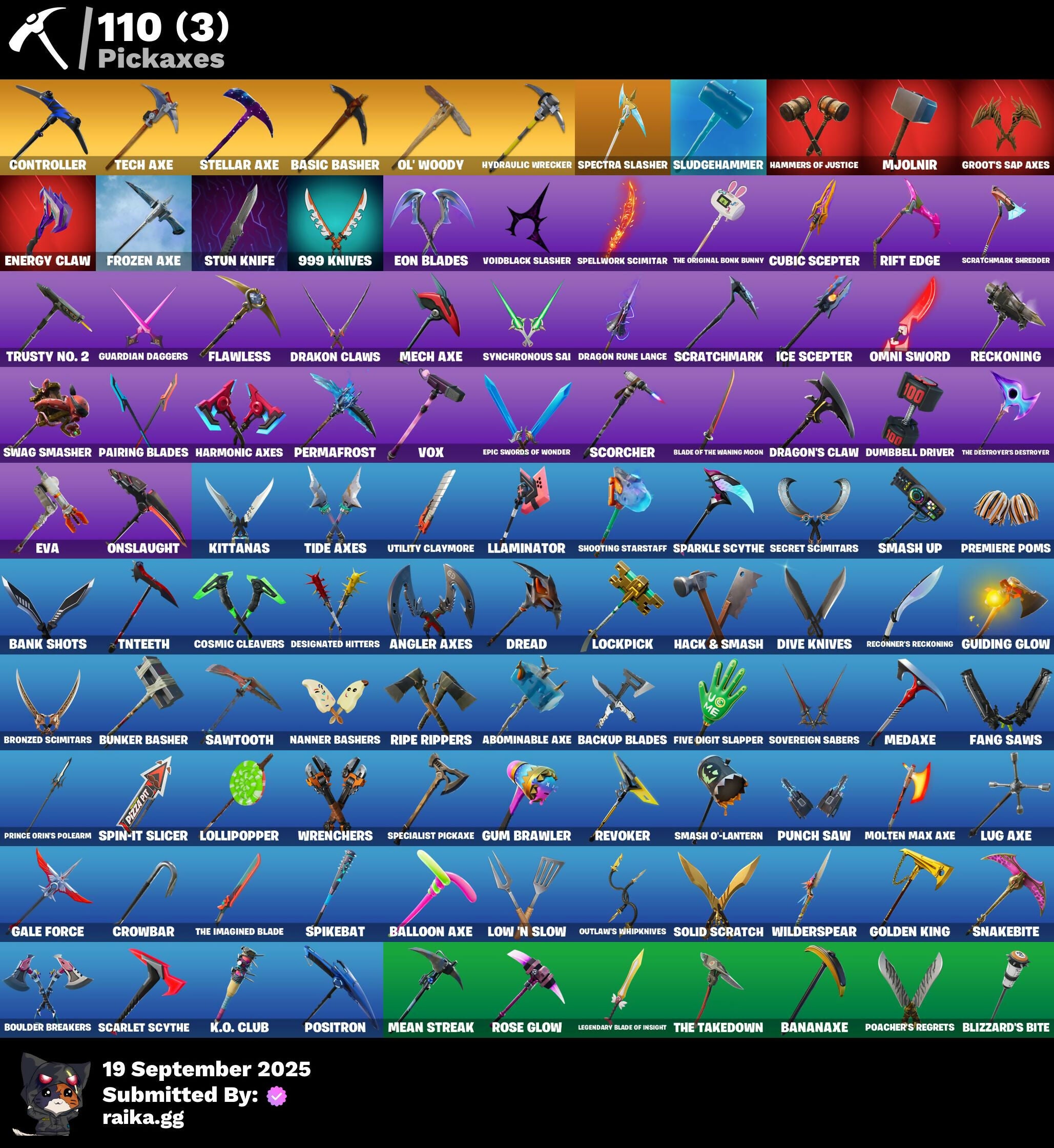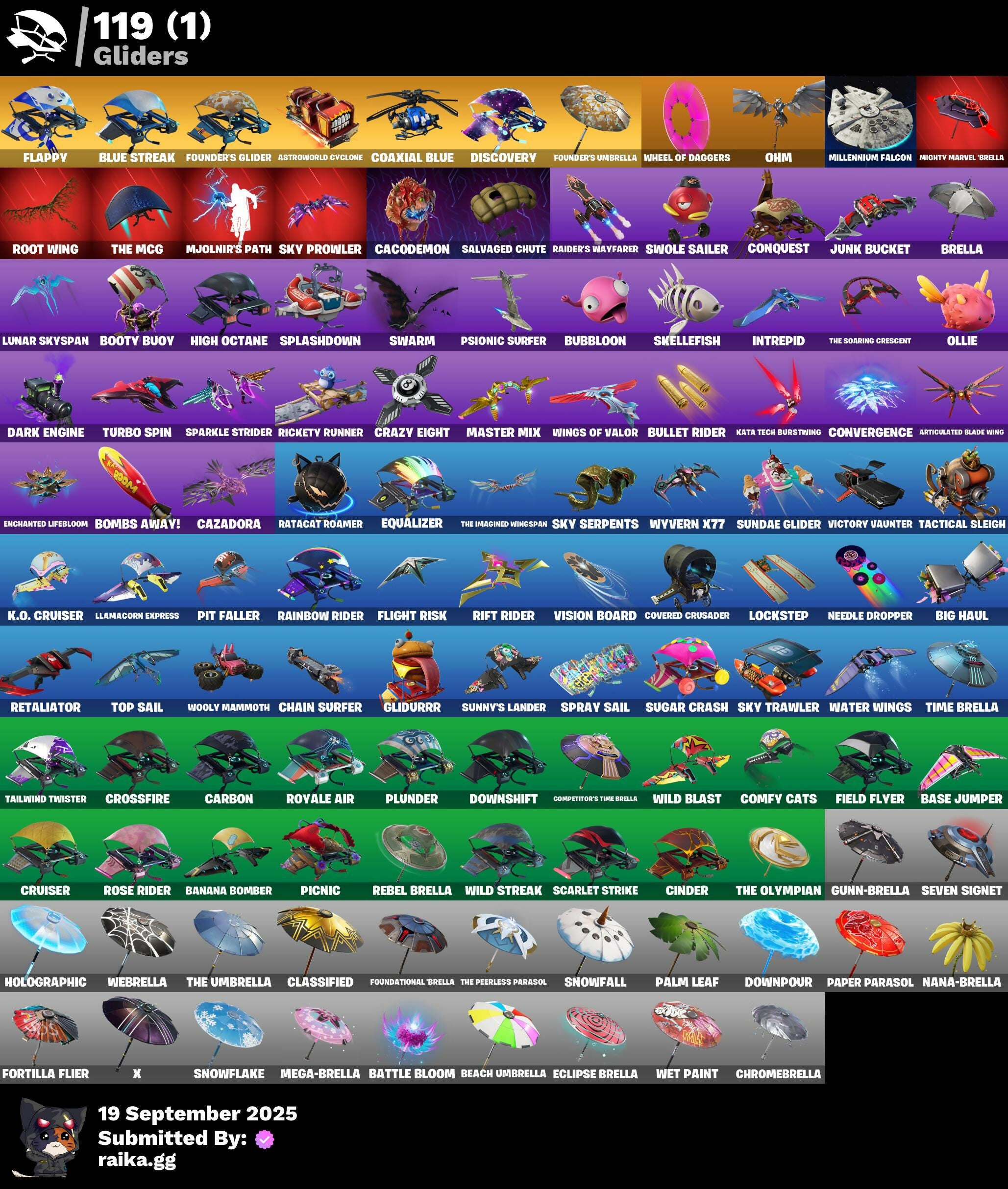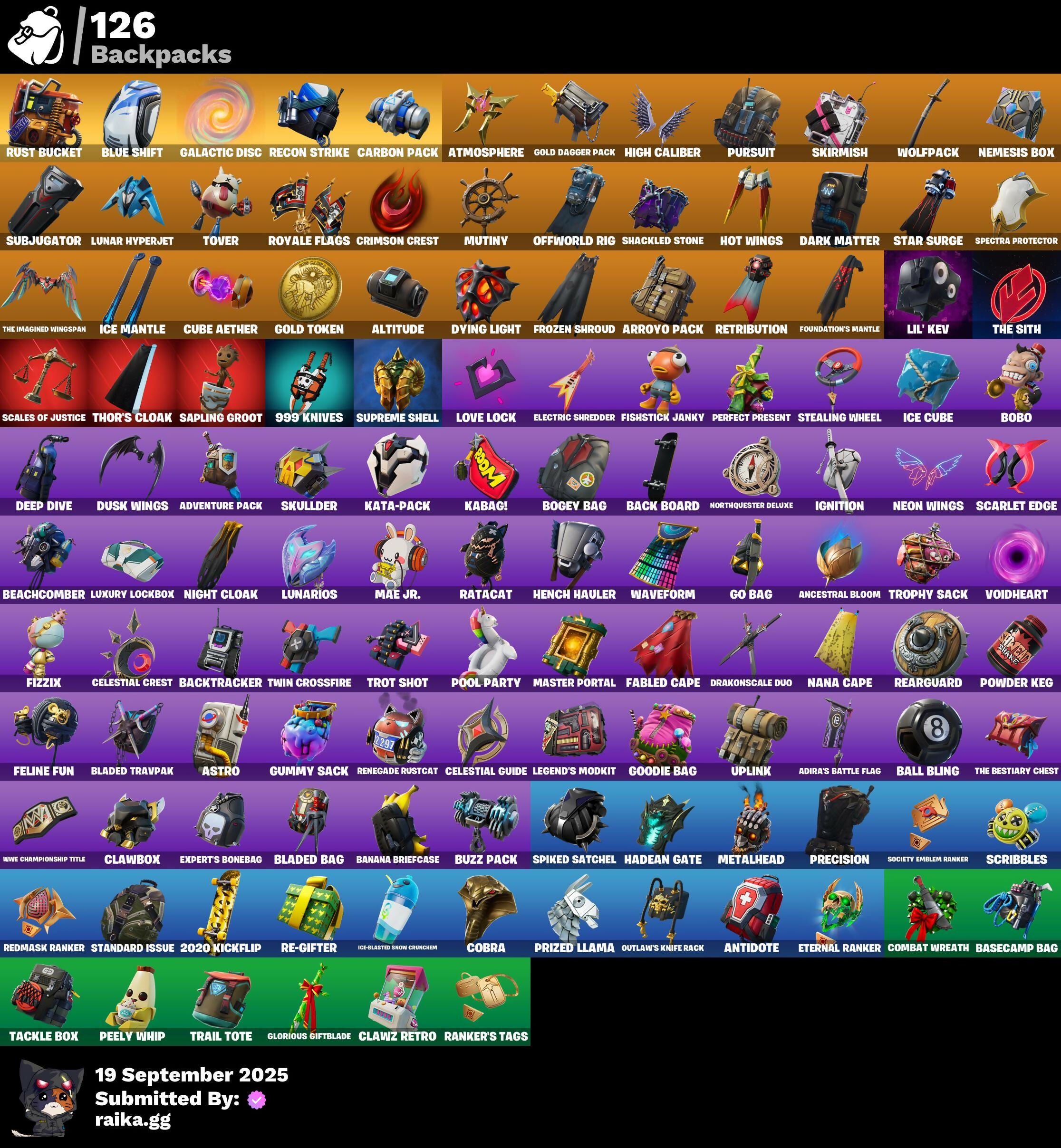 2.0's Revenge, 2020 Kickflip, 8-Ball, 8-Ball Vs Scratch, 999 Knives, A.L.T.E.R., Abominable Axe, Abstract, Adira, Adira's Armor, Adira's Battle Flag, Adventure Pack, Aerial, Agent Jones, Agent Nana, Agent Peely, Air Shredder, Altitude, Ancestral Bloom, Angler Axes, Antidote, Aquaman, Arctic Camo, Ark, Arrow, Arroyo Pack, Articulated Blade Wing, Astrea, Astro, Astro Jack, Astroworld Cyclone, Atmosphere, Back Board, Backtracker, Backup Blades, Bacon, Bag Of Coal, Baited, Ball Bling, Balloon Axe, Banana Bomber, Banana Briefcase, Bananas, Bananaxe, Bank Shots, Banner, Banner Icon, Base Jumper, Basecamp Bag, Basic Basher, Bat, Batman, Battle Bloom, Battle Mode, Battlehawk, Be The Mastermind, Beach Chair, Beach Umbrella, Beachcomber, Bee, Beep Beep, Bees!, Berserker Barrage, Best Mates, Big Guns, Big Haul, Black Werewolf, Blackheart, Blackheart (Stage 8), Blade Of The Waning Moon, Bladed Bag, Bladed Travpak, Blasted, Blizzard's Bite, Blowin' Up, Blowing Bubbles, Blue Metallic, Blue Shift, Blue Streak, Blue Striker, Blue Team Leader, Bobo, Bogey Bag, Bombs Away!, Bone, Boogeyman, Boogie, Boogie Down, Boot It, Booty Buoy, Bot, Both Eyes Open, Boulder Breakers, Bouncer, Bow, Breakdown, Breezy, Brella, Brite Bomber, Bronzed Scimitars, Brutus, Bubbloon, Bullet Rider, Bunker Basher, Bunker Jonesy, Burning Dragon, Bush Peek, Butterfly, Buzz Pack, Bytes' Sigil, Cacodemon, Cactus Maze, Calamity, Calamity Stage 5, Calculated, Calico, Call Me, Cameo, Camera, Campfire, Captain America's Shield, Carbide, Carbide Armor Stage 5, Carbon, Carbon & Gold, Carbon Commando, Carbon Fiber, Carbon Pack, Cash Grab, Cat Flip, Catalyst, Cazadora, Celestial Crest, Celestial Guide, Cerberus Bite, Chain Surfer, Chains, Chalk Outline, Chapter 3 Season 8 Level 100, Chick, Chillshot, Chomp Cudd!!, Chrome Marked, Chromebrella, Chronos Lock, Cinder, Circle, Classified, Clawbox, Clawz Retro, Clean Sweep, Cluck Strut, Clutch, Coaxial Blue, Cobra, Coconuts, Coin Flip, Combat Wreath, Comet, Comfy Cats, Competitor's Time Brella, Conga, Conquest, Constructor, Contour Camo, Controlled Focus, Controller, Convergence, Coral Crush, Cosmic Cleavers, Count It!, Courageous Mikasa, Covered Crusader, Cowboy Chat, Crab, Crabby King, Crazy Castle, Crazy Eight, Crimson Crest, Crossfire, Crowbar, Crowning Achievement, Cruiser, Crystal Llama, Cube, Cube Aether, Cubic Scepter, Cuddle Team Hula, Cuddly Bear, Cursed, Cyclo Curl, D.C. 63, DJ Yonder, Dabstand, Dagger Dance, Dance Mat, Dark Engine, Dark Matter, Dark Voyager, Deadfire, Deadpool, Deep Dab, Deep Dive, Demi, Denim Destiny, Designated Hitters, Determined Renegade, Diamond Shapes, Dice, Dice Roll, Dinosaur, Dinosaur Skull, Dire, Disco, Discovery, Dive Knives, Do It!, Dog Bowl, Dog Collar, Doggo, Dolphin, Downpour, Downshift, Doze Dab, Dragon Rune Lance, Dragon Rune Lances, Dragon Scales, Dragon Spirit, Dragon Stance, Dragon's Claw, Drakon Claws, Drakon Steel Hybrid, Drakonscale Duo, Dread, Drift, Drift Stage 5, Driftwood, Drones-V View, Droop, Duck, Dumbbell Driver, Dumbell Driver, Durrr, Durrr Burger, Dusk, Dusk Wings, Dying Light, Dynamite, E.G.O., Eagle, Eclipse Brella, Egg, Electric Shredder, Electro Swing, Elite Agent, Ember, Emote Camo, Enchanted Lifebloom, Energy Claw, Enforcer, Eon Blades, Epic Swords Of Wonder, Eq, Equalizer, Erisa, Erisa Alert, Erisa's Crest, Eternal Ranker, Eva, Everything's Fine, Evie, Expedition, Experts Bonebag, Explosion, Eye Of Agamotto, Fable, Fabled Cape, Fade, Fake Door, Falcon, Fallen Love Ranger, Falling Leaf, Fang Saws, Fate, Feline Fun, Fence, Festive Paper, Field Flyer, Fierce, Fire Vice, Fish Hook, Fish Thicc, Fishbone, Fishstick Janky, Fist, Five Digit Slapper, Fizzix, Flail, Flaky Feast, Flamenco, Flappy, Flashback Breakdown, Flawless, Flex On 'Em, Flight Risk, Flippin' Away, Floating Island, Flowy Hat, Fly, Fortilla Flier, Foundation's Mantle, Foundational, Foundational 'Brella, Founder's Glider, Founder's Umbrella, Fox, Fox Clan Mask, Free Flow, Frostwing, Frozen Axe, Frozen Shroud, Fryangles, G.O.A.T., GG Ornament, GG Potion, GG Smiley, GG Snakes, GG Snowman, Galactic Disc, Galaxy, Gale Force, Game Over, Gameface, Gear Specialist Maya, Geared Up, Gemstone, Gentleman's Dab, Get Funky, Giddy-Up, Glidurr, Glorious Giftblade, Go Bag, Gold Dagger Pack, Gold Midas, Gold Token, Gold Touch, Golden King, Golden Shine, Golf Ball, Golf Clap, Good Vibes, Goodie Bag, Gravestone, Gremlins, Grid, Grind, Groot, Groot Glow, Groot's Sap Axes, Groove Jam, Grriz, Grumpy Tree, Guardian Daggers, Guggi Was Here, Guiding Glow, Gum Brawler, Gumbo, Gummy Sack, Gunn-Brella, Gunnar, Gunnar's Special, Hack & Smash, Hadean Gate, Ham, Hammerhead, Hammers Of Justice, Hand Horns, Hand Of Trace, Happy Cloud, Harbinger Of Victory, Harlowe, Harmonic Axes, Haute Hustle, Haven, Hearts, Hello Friend, Hench, Hench Hauler, Here Comes Trubble, Hero Emblem, Hidden Haven, High Caliber, High Five, High Octane, Holiday Stormwing, Holographic, Hoop Master, Hope, Hope's Look, Hot Wings, Hula Hoopin', Huntress, Hybrid, Hybrid (Stage 4), Hybrid Egg, Hydraulic Wrecker, Hype, I Declare!, I'm A Mystery, Ice Cream Truck, Ice Cube, Ice King (Gold), Ice Mantle, Ice Scepter, Ice-Blasted Snow Cruncher, If Looks Could..., Ignition, Imagined, In Her Sights, Indigo Ice, Industrious, Infinity Blade, Intrepid, It's Go Time!, Jaywalking, Jellyfish, Jennifer Walters, John Cena, Jolly Roger, Journey, Journey Vs Hazard, Jujutsu Kaisen Emblem, Jules, Jump Jets, Jungle King, Junk Bucket, Jurassically Charged, K.O. Club, K.O. Cruiser, Kabag!, Kaboom!, Kata Tech Burstwing, Kata-Pack, Kevin, Kevin Runes, Kiara K.O., Kiara K.O. (Captain's Bomber), Kick Ups, Kiss, Kittanas, Knight's Honor, Knighted, Kon's Bark, Kymera Swarm, Laid Back Shuffle, Laser Chomp, Legend's Modkit, Legend's Retribution, Legendary Blade Of Insight, Lightning, Lil Split, Lil' Kev, Lil' Monster, Lithic, Llama De Muertos, Llamacorn, Llamacorn Express, Llaminator, Lloose Cannon, Lobby Classic, Lockpick, Lockstep, Lollipopper, Looted, Lotus Touch, Lo