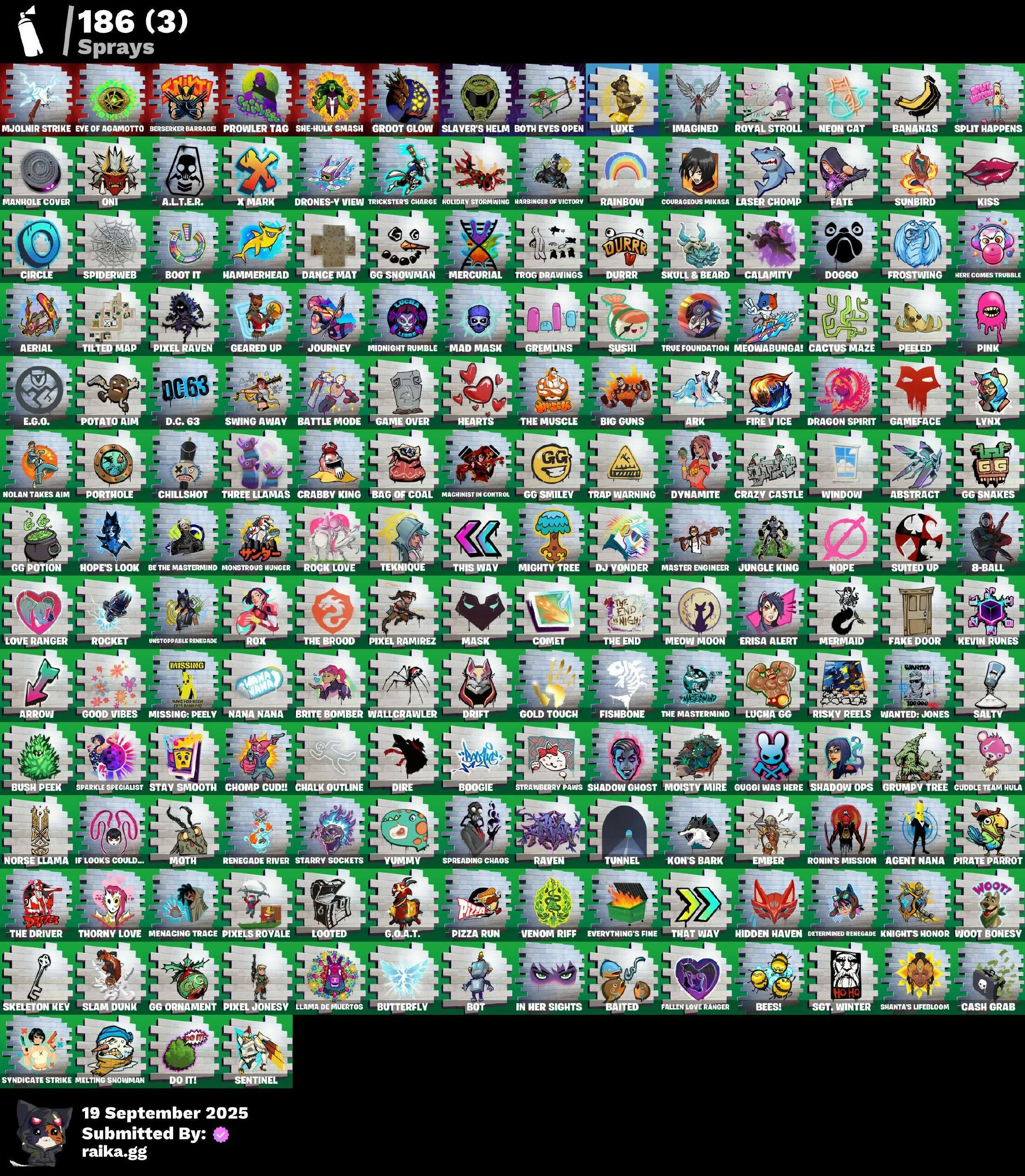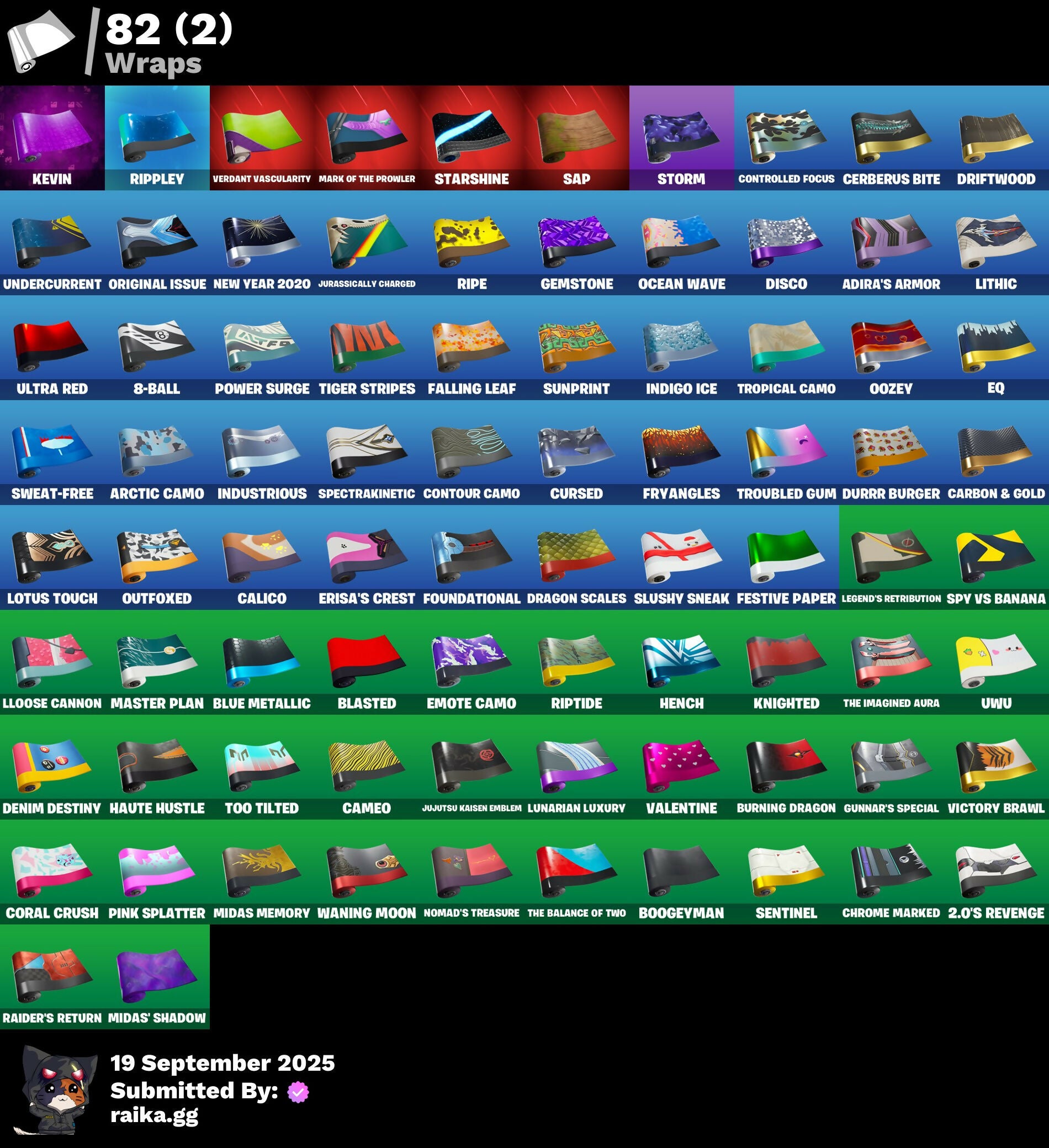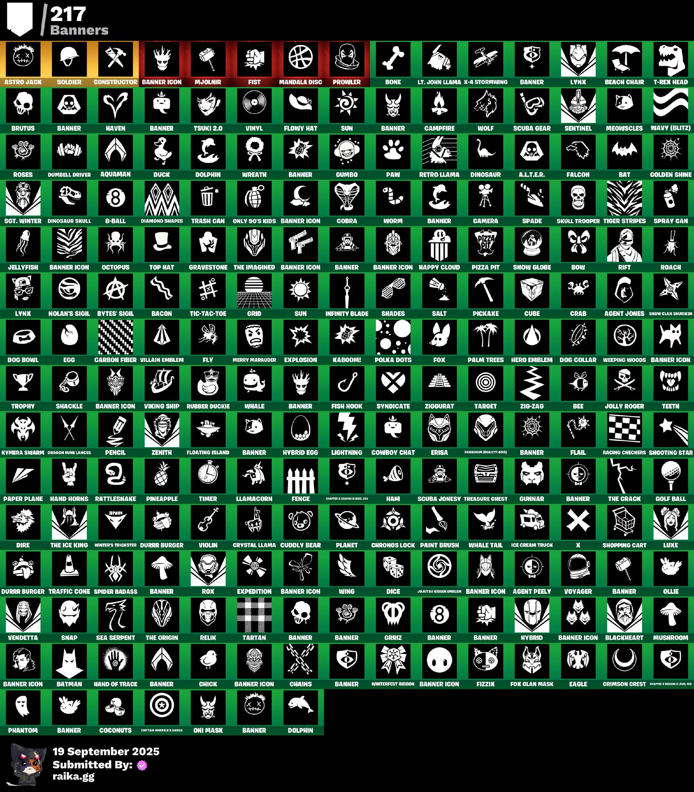 2.0's Revenge, 2020 Kickflip, 8-Ball, 8-Ball Vs Scratch, 999 Knives, A.L.T.E.R., Abominable Axe, Abstract, Adira, Adira's Armor, Adira's Battle Flag, Adventure Pack, Aerial, Agent Jones, Agent Nana, Agent Peely, Air Shredder, Altitude, Ancestral Bloom, Angler Axes, Antidote, Aquaman, Arctic Camo, Ark, Arrow, Arroyo Pack, Articulated Blade Wing, Astrea, Astro, Astro Jack, Astroworld Cyclone, Atmosphere, Back Board, Backtracker, Backup Blades, Bacon, Bag Of Coal, Baited, Ball Bling, Balloon Axe, Banana Bomber, Banana Briefcase, Bananas, Bananaxe, Bank Shots, Banner, Banner Icon, Base Jumper, Basecamp Bag, Basic Basher, Bat, Batman, Battle Bloom, Battle Mode, Battlehawk, Be The Mastermind, Beach Chair, Beach Umbrella, Beachcomber, Bee, Beep Beep, Bees!, Berserker Barrage, Best Mates, Big Guns, Big Haul, Black Werewolf, Blackheart, Blackheart (Stage 8), Blade Of The Waning Moon, Bladed Bag, Bladed Travpak, Blasted, Blizzard's Bite, Blowin' Up, Blowing Bubbles, Blue Metallic, Blue Shift, Blue Streak, Blue Striker, Blue Team Leader, Bobo, Bogey Bag, Bombs Away!, Bone, Boogeyman, Boogie, Boogie Down, Boot It, Booty Buoy, Bot, Both Eyes Open, Boulder Breakers, Bouncer, Bow, Breakdown, Breezy, Brella, Brite Bomber, Bronzed Scimitars, Brutus, Bubbloon, Bullet Rider, Bunker Basher, Bunker Jonesy, Burning Dragon, Bush Peek, Butterfly, Buzz Pack, Bytes' Sigil, Cacodemon, Cactus Maze, Calamity, Calamity Stage 5, Calculated, Calico, Call Me, Cameo, Camera, Campfire, Captain America's Shield, Carbide, Carbide Armor Stage 5, Carbon, Carbon & Gold, Carbon Commando, Carbon Fiber, Carbon Pack, Cash Grab, Cat Flip, Catalyst, Cazadora, Celestial Crest, Celestial Guide, Cerberus Bite, Chain Surfer, Chains, Chalk Outline, Chapter 3 Season 8 Level 100, Chick, Chillshot, Chomp Cudd!!, Chrome Marked, Chromebrella, Chronos Lock, Cinder, Circle, Classified, Clawbox, Clawz Retro, Clean Sweep, Cluck Strut, Clutch, Coaxial Blue, Cobra, Coconuts, Coin Flip, Combat Wreath, Comet, Comfy Cats, Competitor's Time Brella, Conga, Conquest, Constructor, Contour Camo, Controlled Focus, Controller, Convergence, Coral Crush, Cosmic Cleavers, Count It!, Courageous Mikasa, Covered Crusader, Cowboy Chat, Crab, Crabby King, Crazy Castle, Crazy Eight, Crimson Crest, Crossfire, Crowbar, Crowning Achievement, Cruiser, Crystal Llama, Cube, Cube Aether, Cubic Scepter, Cuddle Team Hula, Cuddly Bear, Cursed, Cyclo Curl, D.C. 63, DJ Yonder, Dabstand, Dagger Dance, Dance Mat, Dark Engine, Dark Matter, Dark Voyager, Deadfire, Deadpool, Deep Dab, Deep Dive, Demi, Denim Destiny, Designated Hitters, Determined Renegade, Diamond Shapes, Dice, Dice Roll, Dinosaur, Dinosaur Skull, Dire, Disco, Discovery, Dive Knives, Do It!, Dog Bowl, Dog Collar, Doggo, Dolphin, Downpour, Downshift, Doze Dab, Dragon Rune Lance, Dragon Rune Lances, Dragon Scales, Dragon Spirit, Dragon Stance, Dragon's Claw, Drakon Claws, Drakon Steel Hybrid, Drakonscale Duo, Dread, Drift, Drift Stage 5, Driftwood, Drones-V View, Droop, Duck, Dumbbell Driver, Dumbell Driver, Durrr, Durrr Burger, Dusk, Dusk Wings, Dying Light, Dynamite, E.G.O., Eagle, Eclipse Brella, Egg, Electric Shredder, Electro Swing, Elite Agent, Ember, Emote Camo, Enchanted Lifebloom, Energy Claw, Enforcer, Eon Blades, Epic Swords Of Wonder, Eq, Equalizer, Erisa, Erisa Alert, Erisa's Crest, Eternal Ranker, Eva, Everything's Fine, Evie, Expedition, Experts Bonebag, Explosion, Eye Of Agamotto, Fable, Fabled Cape, Fade, Fake Door, Falcon, Fallen Love Ranger, Falling Leaf, Fang Saws, Fate, Feline Fun, Fence, Festive Paper, Field Flyer, Fierce, Fire Vice, Fish Hook, Fish Thicc, Fishbone, Fishstick Janky, Fist, Five Digit Slapper, Fizzix, Flail, Flaky Feast, Flamenco, Flappy, Flashback Breakdown, Flawless, Flex On 'Em, Flight Risk, Flippin' Away, Floating Island, Flowy Hat, Fly, Fortilla Flier, Foundation's Mantle, Foundational, Foundational 'Brella, Founder's Glider, Founder's Umbrella, Fox, Fox Clan Mask, Free Flow, Frostwing, Frozen Axe, Frozen Shroud, Fryangles, G.O.A.T., GG Ornament, GG Potion, GG Smiley, GG Snakes, GG Snowman, Galactic Disc, Galaxy, Gale Force, Game Over, Gameface, Gear Specialist Maya, Geared Up, Gemstone, Gentleman's Dab, Get Funky, Giddy-Up, Glidurr, Glorious Giftblade, Go Bag, Gold Dagger Pack, Gold Midas, Gold Token, Gold Touch, Golden King, Golden Shine, Golf Ball, Golf Clap, Good Vibes, Goodie Bag, Gravestone, Gremlins, Grid, Grind, Groot, Groot Glow, Groot's Sap Axes, Groove Jam, Grriz, Grumpy Tree, Guardian Daggers, Guggi Was Here, Guiding Glow, Gum Brawler, Gumbo, Gummy Sack, Gunn-Brella, Gunnar, Gunnar's Special, Hack & Smash, Hadean Gate, Ham, Hammerhead, Hammers Of Justice, Hand Horns, Hand Of Trace, Happy Cloud, Harbinger Of Victory, Harlowe, Harmonic Axes, Haute Hustle, Haven, Hearts, Hello Friend, Hench, Hench Hauler, Here Comes Trubble, Hero Emblem, Hidden Haven, High Caliber, High Five, High Octane, Holiday Stormwing, Holographic, Hoop Master, Hope, Hope's Look, Hot Wings, Hula Hoopin', Huntress, Hybrid, Hybrid (Stage 4), Hybrid Egg, Hydraulic Wrecker, Hype, I Declare!, I'm A Mystery, Ice Cream Truck, Ice Cube, Ice King (Gold), Ice Mantle, Ice Scepter, Ice-Blasted Snow Cruncher, If Looks Could..., Ignition, Imagined, In Her Sights, Indigo Ice, Industrious, Infinity Blade, Intrepid, It's Go Time!, Jaywalking, Jellyfish, Jennifer Walters, John Cena, Jolly Roger, Journey, Journey Vs Hazard, Jujutsu Kaisen Emblem, Jules, Jump Jets, Jungle King, Junk Bucket, Jurassically Charged, K.O. Club, K.O. Cruiser, Kabag!, Kaboom!, Kata Tech Burstwing, Kata-Pack, Kevin, Kevin Runes, Kiara K.O., Kiara K.O. (Captain's Bomber), Kick Ups, Kiss, Kittanas, Knight's Honor, Knighted, Kon's Bark, Kymera Swarm, Laid Back Shuffle, Laser Chomp, Legend's Modkit, Legend's Retribution, Legendary Blade Of Insight, Lightning, Lil Split, Lil' Kev, Lil' Monster, Lithic, Llama De Muertos, Llamacorn, Llamacorn Express, Llaminator, Lloose Cannon, Lobby Classic, Lockpick, Lockstep, Lollipopper, Looted, Lotus Touch, Lo