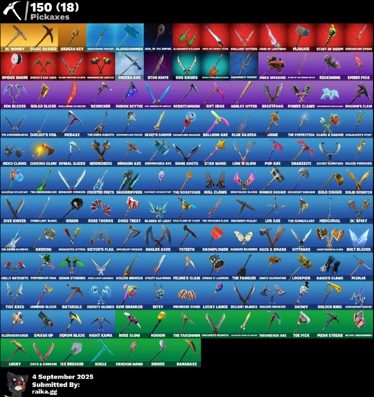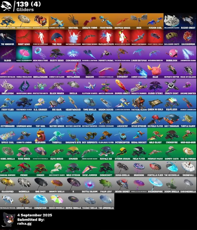 10 Field Flyer, 8-Ball Vs Scratch, 999 Knives, @Root's Sap Axes, A.I.M., Abominable Axe, Agent Peely, Air Shredder, Amazing Guide, Angler Axes, Aphrodite, Aquaman, Aquaman's Trident, Arcane Energy Glider, Arctic Adeline, Arrowpoint Carver, Artemis, Astroworld Cyclone, Avateer's Flair Show, Axeroni, Balloon Axe, Banana Axe, Banana Bomber, Bank Shots, Base Jumper, Basic Basher, Batsickle, Battle Blessing, Battle Bloom, Battle Call, Baymax Wings, Beach Umbrella, Bear Hug, Beastfang, Beep Beep, Big Haul, Billy Bounce, Bisa Stance Pinky, Bitey, Blackheart, Blade Of The Warriors Roar, Blade Raven, Blades Of Light, Boing!, Bolt Blades, Bombs Away!, Boogie Down, Boomin', Boulder Breakers, Bounty Brella, Breakin', Breaking Point, Breakroom Trooper, Breathless Blades, Brella, Brilliant Cutters, Bubloon, Bunker Basher, Bunnymoon, Calamity, Calculated, Call Me, Cameo Vs Chic, Camo Ranger Glider, Captain La Rencla, Card Drop, Cat Flip, Cauldron Chill, Cerberus, Challenger's Staff, Choice Knit, Chrome Punk, Chromebrella, Cinder, Clang & Basher, Classified, Clean Sweep, Cliffside Soarer, Clinical Crosser, Cloud Strike, Coin Flip, Comet Crasher, Comfy Cats, Conch Call, Conga, Congress Worship, Conquest, Convergence, Covered Crusader, Crazy Eight, Crescent Sirloon, Crimson Wish, Crisis Cross, Crossfire, Cruiser, Crystal, Curling Iron, Cyclo Curl, DJ Yonder, Dagger Dance, Daigo, Daigo's Claws, Dark Bomber, Dark Tricera Ops, Deadpool, Deep Dab, Deep End, Designated Hitters, Diamond Throne, Dire, Dive Knives, Doctor Doom, Dogg Treat, Doom Brella, Downpour, Downshift, Dozed Dab, Dragon Axe, Dragon Stance, Dragon's Claw, Drift, Driver, Drome Drifter, Droop, Duelist's Foil, Dusk, Eagle's Form, Elite Servo, Elmira, Elucidator's Blade, Ember, Ember Pick, Emeraldclaw Phore, Eon Blades, Epic Blade Of Flood, Epic Swords Of Wonder, Equalizer, Eternal Knight, Extraterrestrial, Fable, Face Palm, Fade, Feathered Flyer, Felina, Felina's Claw, Field Flyer, Fiendish Wand, Fishstick, Fishy Flier, Fist Bump, Flamenco, Flapjack Flyer, Flippin' Away, Flux Silvera, Focused, Foil Flex, Fortilla Flier, Founder's Glider, Founder's Umbrella, Frostburn, Frosted Frets, Frosty Globes, Frozen Axe, Full Tilt, Fusion, Fusion Coil, Fusion Scythe, Gagodemon, Gathering Storm, Gear Specialist Maya, Gentleman's Dab, Get Funky, Giddy-Up, Gilded Pinscher, Glide Morphic Blades, Glidurra, Godly Cloudcruiser, Gold Brutus, Gold Digger, Gold Midas, Golden King, Golden Nemesis, Golf Clap, Groot, Growling Werewolf, Guiding Glow, Gum Brawler, Gunn-Brella, Hack & Smash, Hadean Key, Hades, Hammers Of Justice, Hand Of Lightning, Hang Loose, Harley Hitter, Have A Seat, Haze, Heart Sign, Heart's Carver, Heartwinder, Hello Friend, Hero Baymax, High Five, High Society Glider, Holiday Boxy, Holly Hatchets, Holographic, Hooplight Strikers, Hootenanny, Hope, Hot Parat, Hot Stuff, Hula Hoopin', Hunter's Skyblade, Huntress, Hwang Hammerhammer, Hybrid, Hyperboard, Hypnoteyes, I Declare!, I'm A Mystery, Ice Breaker, Icicle, Imperial March, Infinite Dab, Invasion, Invisible Cut, Iris, It Is Finished, It's Complicated, It's Go Time!, It's... You?, Jackie, Jade, Jazz Hands, Jennifer Walters, Jet Signals, Joltara, Josie, Journey Vs Hazard, Jules, K.O. Cruiser, Kendo, Keyed Up, Kick Ups, Kiss Your Shoulders, Kit, Kittanas, Knife & Sharpener, Kondor, Korra, Korra's Air Glider, Krisabelle, Legendary Hunter Of Neon, Lexa, Lil' Prancer, Llama Bell, Llamacorn Express, Lockpick, Lockstep, Love It!, Low 'n Slow, Lt. Evergreen, Lucky, Lucky Lance, Lug Axe, Lunar Skyspan, Lynx, Major Mancake, Make A Seat, Mancake, Mandalorian, Manic, Mark 90 Flight Pack, Mashed Potato, Mask Of Balance, Master Of Puppets, Mave, Mean Streak, Medaxe, Medusa, Menace, Meowscles, Mercurial, Metalmark, Mic Drop, Microbot Mallet, Mighty Marvel Delta, Millennium Falcon, Mjollnir, Mjolnir's Path, Mobile Megalodon, Montague, Moon / Mystery, Moonbow Breezer, Mystique, Nailed It, Nana Nana, Nanner Bashers, Neko Claws, Neko No Kenin Kenge, Neon Man O' War, Night Kama, Nightshade, Ninja Stance - Leo, Ninja Stance - Ram, Nisha, Noggin, Nomad's Drifter, Null Claws, Nyanja, Oath & Sorrow, Ocean, Ohm, Ol' Spiky, Ol' Woody, Ollie, One Shot, Onesie, Oscar, Paddle Royale, Palm Leaf, Pandemonium, Party Hips, Paws & Claws, Peely, Peppermint Parachute, Peppermint Pick, Perfect Pivot, Peter Griffin, Petercopter, Picnic, Planetary Ride, Plunja, Poacher's Reports, Polar Peely, Pop Axe, Popular Vibe, Poseidon, Powder, Power Claws, Premiere Poms, Protector Kaito, Puppet Dance, Puppet's Prowl, Queen In Gold, Quick!, Rage Out, Ramsonctions, Ratcat Roamer, Razor Crest, Rebel Brella, Reckoning, Recon Expert, Red Card, Redline, Reese, Regal Rocket, Regal Wave, Reliant Blades, Remain The Vote, Remedy Vs Toxin, Remember Doing, Remix Brella, Respectful Dance, Revel, Reverie, Reverse Obliterator, Rickety Runner, Ride The Pony, Rift Edge, Rippley Vs Sludge, Rock Paper Scissors, Rogue Light Daggers, Roman Candle, Root Wing, Rose Glow, Rose Rider, Rose Team Leader, Rose Thorns, Royale Air, Rumbugo Slicer, Running Man, Runway Racer, Rusty Rider, Sad Trombone, Sail Of The Springs, Salvaged Chute, Santa Dogg, Say So, Scarlet Loneboard, Scorcher, Score Card, Scratchmark, Scuba Jonesy, Secret Scimitars, Sentinel, Seven Signet, Sgt. Winter, Shadedrippers, Shader Box, Shadow Blade Hope, Shadow Khopesh Axes, Shadow's Bite, Shaolin Git-Up, Shaolin Sip, Sharpshooter, Shimmer, Shogun Brella, Shooting Starstaff, Shortsword Slicers, Shuffle Optional, Shuri's Skywings, Side Hustle, Sidewinder, Sing Along, Siona, Skellefish, Skelleshark, Skull Trooper, Sky Serpents, Sky Trawler, Skye, Slayer Juice Wrld, Sled Ready Guff, Sledgecracker, Sledgehammer, Slider, Slingshot, Slitherin', Sludgehammer, Smash O-Lantern, Smash Up, Snakebite, Snoozefest, Snow Shaker, Snowfall, Snowglobe Smasher, Snowmando Board, Snowplower, Snowy, So So Square, Solar Slicer, Solid Scratch, Solid Snake, Specialist Pickaxe, Spellbreak Scimitar, Spicy's Survival, Spider Snare, Spinal