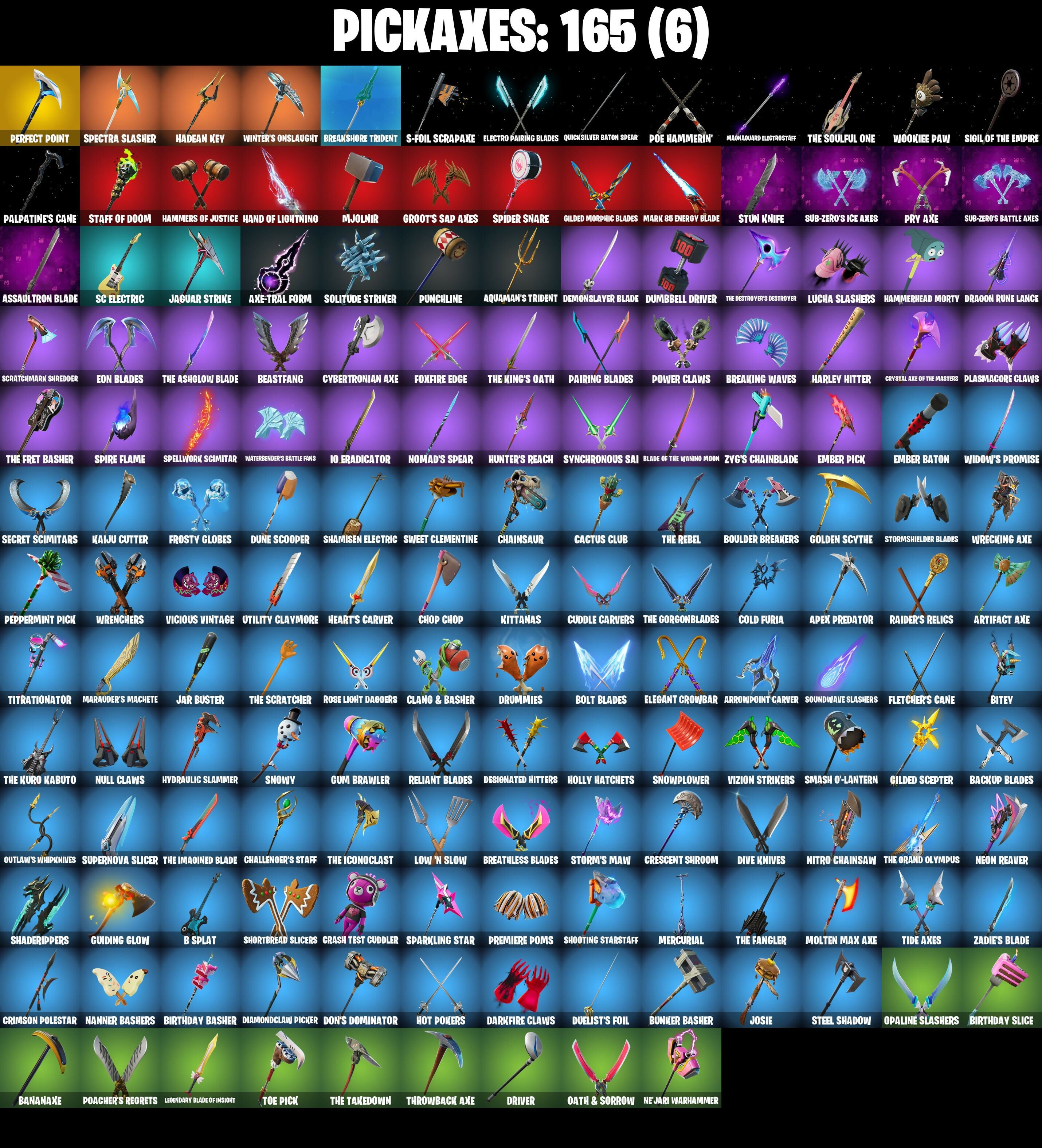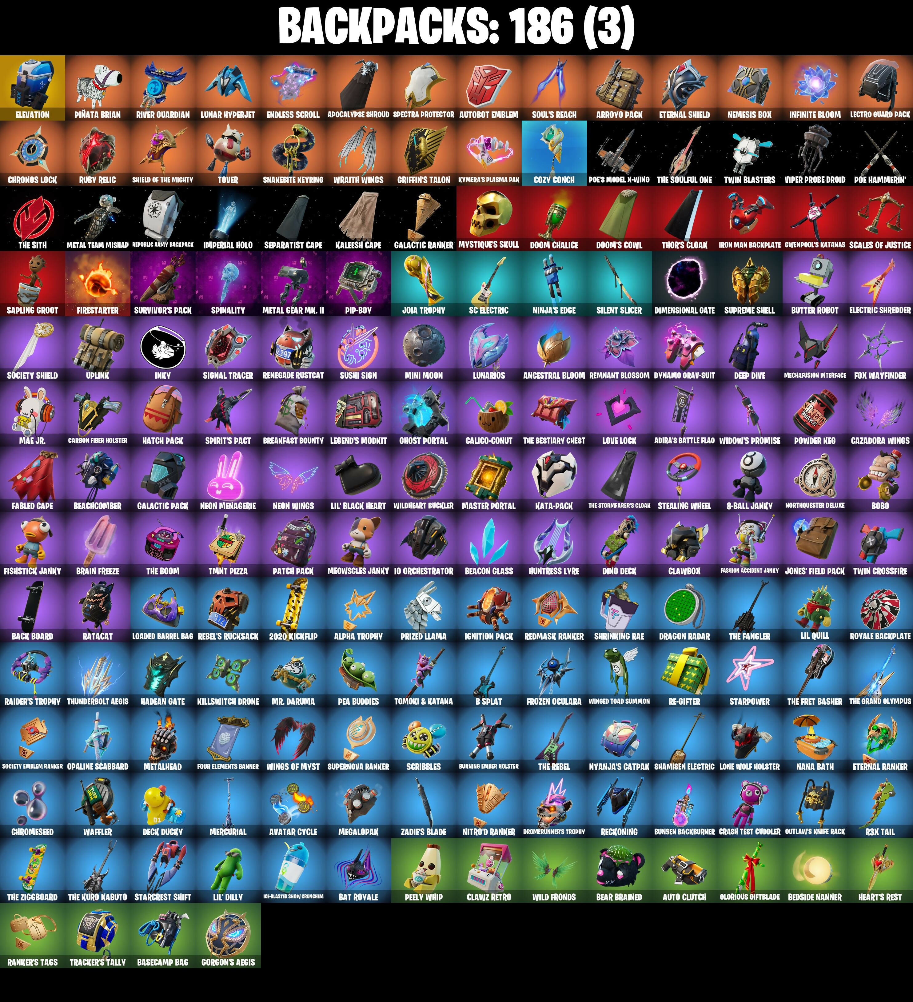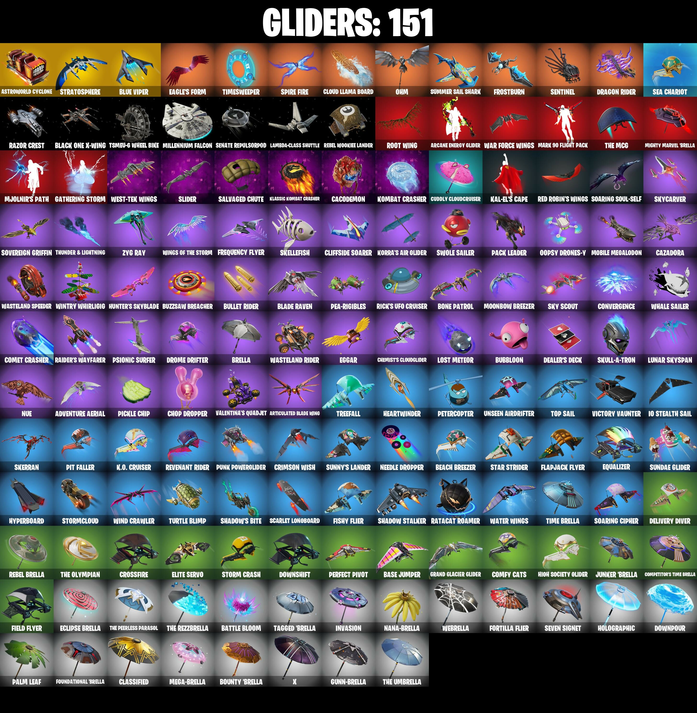 2020 Kickflip, 8-Ball Janky, Adira, Adira (Battle Mask), Adira's Battle Flag, Adventure Aerial, Agent Jones, Agent Jones (Jump 31), Air Shredder, Alpha Trophy, Ancestral Bloom, Apex Predator, Aphrodite, Apocalypse Shroud, Apprentice Evie, Aquaman, Aquaman's Trident, Arcane Energy Glider, Arrowpoint Carver, Arroyo Pack, Artemis, Arthur Curry, Articulated Blade Wing, Artifact Axe, Assaultron Blade, Astroworld Cyclone, Auto Clutch, Autobot Emblem, Avatar Cycle, Avatar's Flourish, Axe-Tral Form, Azarath Metrion Zinthos!, B Splat, Back Board, Backup Blades, Balanced, Bananaxe, Baron's Hoard, Base Jumper, Basecamp Bag, Bat Royale, Battle Bloom, Battle-Tested, Beach Breezer, Beachcomber, Beacon Glass, Bean Bag, Bear Brained, Bear Hug, Beastfang, Bedside Nanner, Beep Beep, Bi-Han, Big Dill, Big Fan, Billy Bounce, Birthday Basher, Birthday Slice, Bitey, Black, Black Knight T-60 Power Armor, Black One X-Wing, Blade Of The Waning Moon, Blade Raven, Blaze, Blowin' Up, Blue Viper, Bobo, Bold Stance, Bolt Blades, Bone Patrol, Boomin', Boots 'N' Cats, Boulder Breakers, Bounty 'Brella, Brain Freeze, Breakfast Bounty, Breaking Waves, Breakshore Trident, Breathless Blades, Brella, Brite Moves, Brite Raider, Bubbloon, Bullet Rider, Bunker Basher, Bunsen Backburner, Burn Bright, Burning Ambition Valeria, Burning Ember Holster, Butter Robot, Buzzsaw Breacher, Cacodemon, Cactus Club, Calico-Conut, Call Me, Carbon Fiber Holster, Card Drop, Cardistry, Cassidy Quinn, Cazadora, Cazadora Wings, Cerberus, Chainsaur, Challenger's Staff, Champion Siren, Charlotte, Chef's Special, Chemist's Cloudglider, Choice Knit, Chop Chop, Chop Dropper, Chromeseed, Chronos Lock, Clang & Basher, Classified, Clawbox, Clawz Retro, Clean Sweep, Cliffside Soarer, Cloud Llama Board, Cloud Striker, Cluck, Cluck (Slurpy), Codsworth's Cleanup, Cold Furia, Comet Crasher, Comfy Cats, Competitor's Time Brella, Conch Call, Convergence, Count It!, Cozy Conch, Crash Test Cuddler, Crescent Shroom, Crimson Polestar, Crimson Wish, Crossfire, Crowning Achievement, Crystal Axe Of The Masters, Cuddle Carvers, Cuddly Cloudcruiser, Cybertronian Axe, Cyclo Curl, Dagger Dance, Darkfire Claws, Darth Vader, Dawn Duelist Nisha, Dealer's Deck, Dealm Cassidy Quinn, Deck Ducky, Deep Dive, Delivery Diver, Demonslayer Blade, Denied, Desionated Hitters, Diamond Throne, Diamondclaw Picker, Dill With It, Dillinger The Qherk, Dimensional Gate, Dino Deck, Dive Knives, Do The 'Split, Doctor Doom, Doctor Slone, Don's Dominator, Doom Chalice, Doom's Cowl, Downpour, Downshift, Doze Dab, Dragon Radar, Dragon Rider, Dragon Rune Lance, Dramatic Flares, Driver, Drome Drifter, Dromerunner's Trophy, Drummies, Duelist's Card Trick, Duelist's Foil, Dumbbell Driver, Dune Scooper, Dusk Knight, Dynamo Grav-Suit, Eagle's Form, Eclipse Brella, Eggar, Electric Shredder, Electro Pairing Blades, Elegant Crowbar, Elevation, Elite Servo, Ember Baton, Ember Pick, Emperor Palpatine, Empress Fan Dance, Endless Scroll, Eon Blades, Equalizer, Era, Eternal Knight, Eternal Ranker, Eternal Shield, Evasive Maneuvers, Evie, Evie (Summer Strider), Expressionism, Fabled Cape, Fade, Fancy Peter Griffin, Fang Dance, Fashion Accident Janky, Feel The Force, Field Flyer, Fire Show, Firestarter, Fishstick Janky, Fishy Flier, Fixer, Flapjack Flyer, Flashback Breakdown, Fletcher Kane, Fletcher's Cane, Flippin' Away, Foil Flex, Force Lightning, Fortilla Flier, Foundational 'Brella, Four Elements Banner, Fox Wayfinder, Foxfire Edge, Frequency Flyer, Frostburn, Frosty Globes, Frozen Oculära, Frozen Treat Cart, Full Moon Fletcher Kane, Galactic Pack, Galactic Ranker, Gathering Storm, General Grievous, Gentleman's Dab, Get Out Of Your Mind, Ghost Portal, Ghoul Trooper, Gilded Morphic Blades, Gilded Scepter, Glorious Giftblade, Golden Scythe, Golf Clap, Good Game, Well Played, Good Guy, Gorgon's Aegis, Grand Glacier Glider, Griffin's Talon, Groot, Groot (Silver Foil), Groot's Sap Axes, Guggimon, Guiding Glow, Gum Brawler, Gunn-Brella, Gunslinger Outlaw Midas, Gwenpool's Katanas, Hadean Gate, Hadean Key, Hammerhead Morty, Hammers Of Justice, Hand Of Lightning, Hand-Forged, Happy, Harbinger Armor Omegadrok, Harley (Always Fantabulous), Harley Hitter, Harley Quinn, Hatch Pack, Have A Seat, Head (Droopy), Heart's Carver, Heart's Rest, Heartburst, Heartwinder, Hello Friend, High Society Glider, Highwire, Holiday Boxy, Holly Hatchets, Holographic, Hope, Hot Marat, Hot Pokers, Howl, Hunter's Reach, Hunter's Skyblade, Huntress Lyre, Hydraulic Slammer, Hyperboard, I'm A Mystery, IO Eradicator, IO Orchestrator, IO Stealth Sail, Ice-Blasted Snow Crunch, Iconic Era, Ignition Pack, Imani, Imperial Holo, Imperial March, Infinite Bloom, Inky, Introducing..., Invasion, Iridia Vayne, Iron Man Backplate, It Is Finished, It's Chemistry!, It's... You?, Jaguar Strike, Jar Buster, Jennifer Walters, Joey, Joia Trophy, Jones' Field Pack, Josie, Joss, Jubilation, Jules, Jun-Hwan, Junker 'Brella, K.O. Cruiser, Kaiju Cutter, Kal-El's Cape, Kalesh Cape, Kata-Pack, Keep It Mello, Keisha Cross, Keyed Up, Kick Back, Killswitch Drone, Kit, Kittanas, Klassic Kombat Crasher, Knife Sharpener, Kombat Crasher, Kondor, Korra, Korra's Air Glider, Krisabelle, Kymera, Kymera's Plasma Pak, Lambda-Class Shuttle, Lara Croft, Lealt Elomr, Lectro Guard Pack, Legend's Modkit, Legendary Blade Of Insight, Lexa, Lil Quill, Lil Split, Lil' Black Heart, Lil' Dilly, Lil' Longboat, Lil' Resistance Bomber, Lil' Saucer, Loaded Barrel Bag, Lone Wolf Holster, Lorenzo, Lorenzo The Reckless, Lost Meteor, Love It!, Love Lock, Low N' Slow, Lt. Evergreen, Lucha Slashers, Lunar Hyperjet, Lunar Skyspan, Lunarios, Madquard Electrostaff, Mae Jr., Magmatic Mizuki, Major Mancake, Make A Seat, Malik, Malik (Solitary Defender), Mancake, Mandalorian, Marauder's Machete, Mariposa, Mark 85 Energy Blade, Mark 90 Flight Pack, Mashed Potato, Masked, Master Portal, Mave, Mave (Reactive Hair Off), Mechafusion Interface, Medusa, Mega Wave Thunder, Mega-Brella, Megalo Don, Megalopak, Meowscles