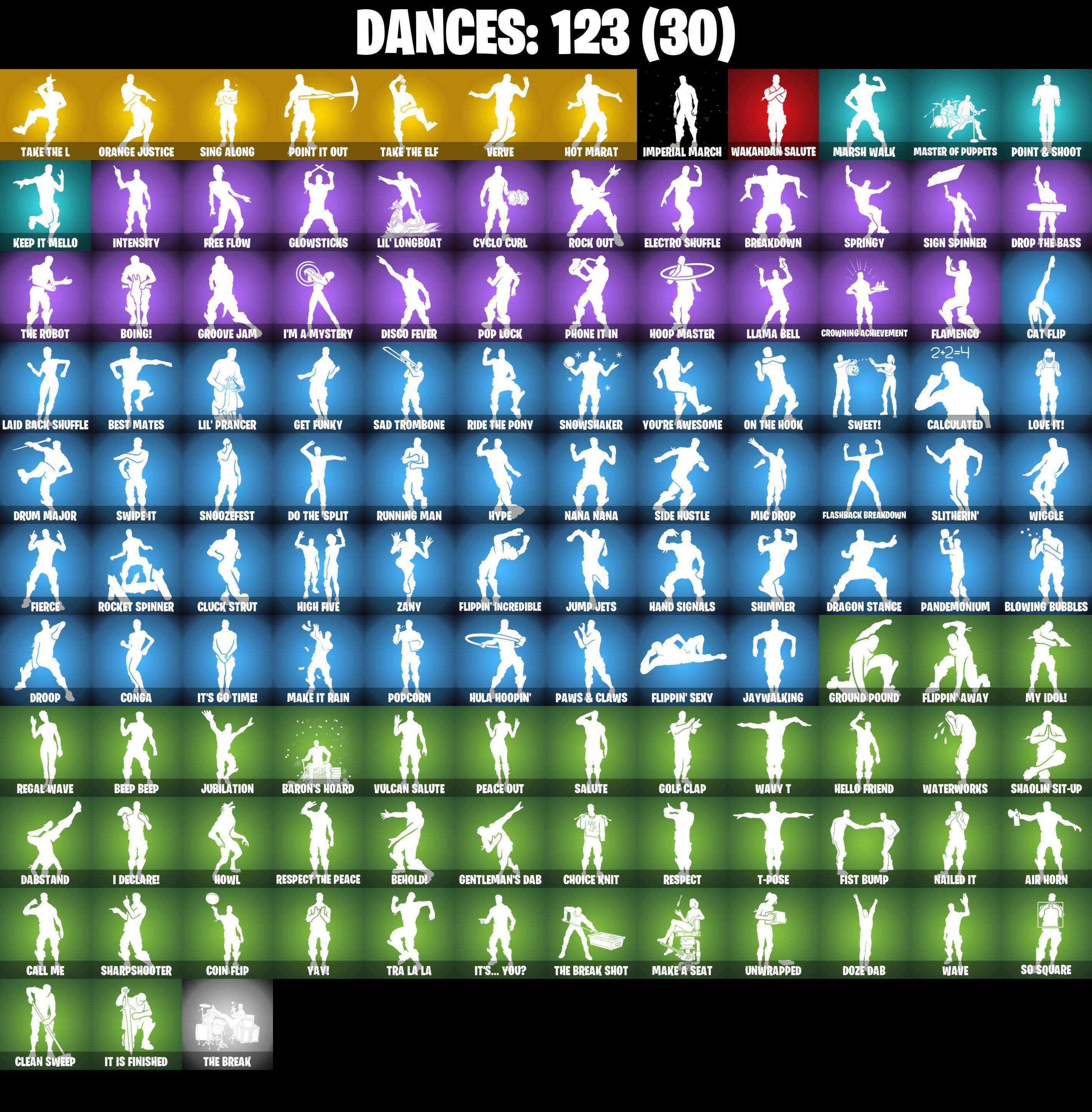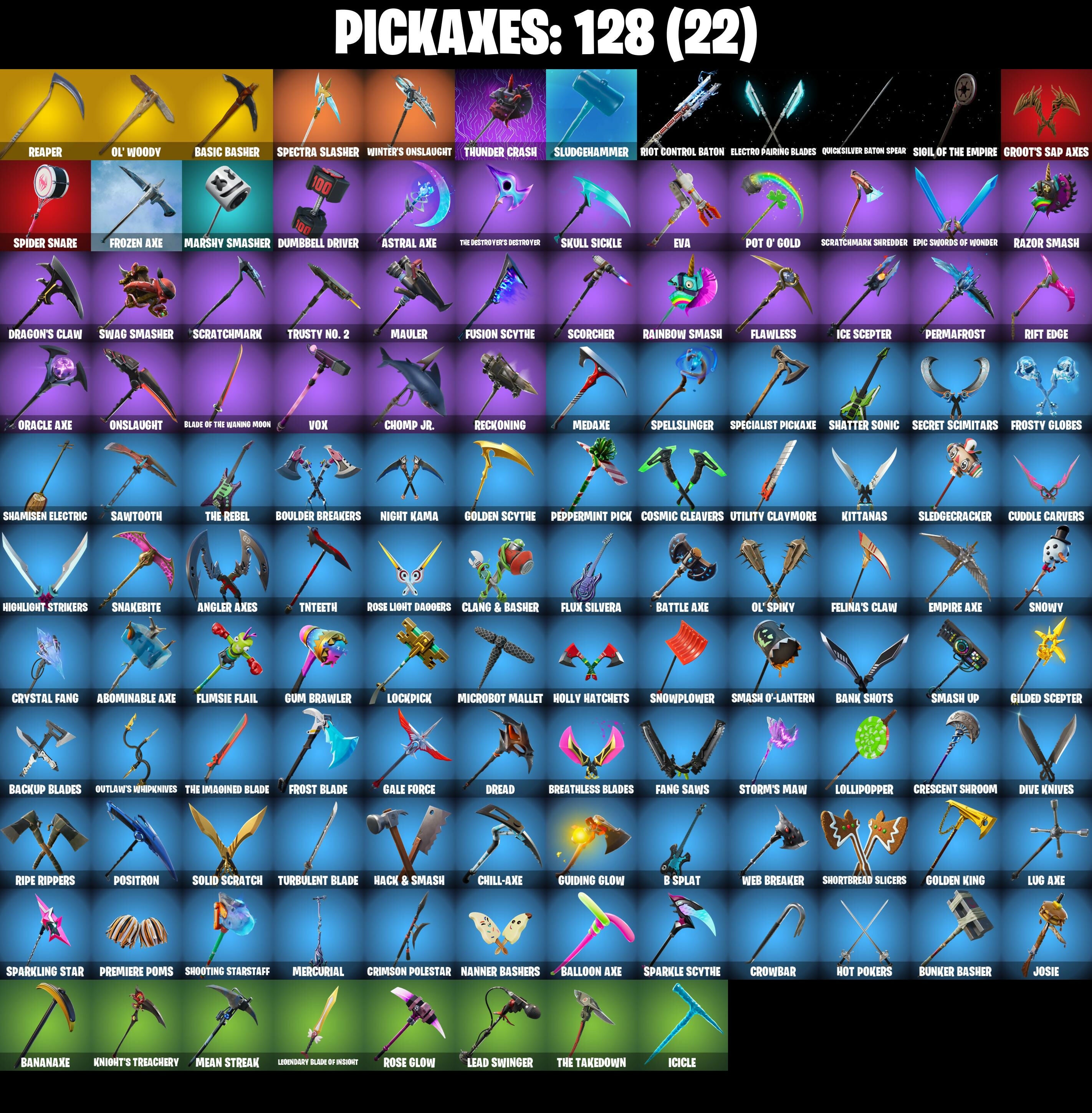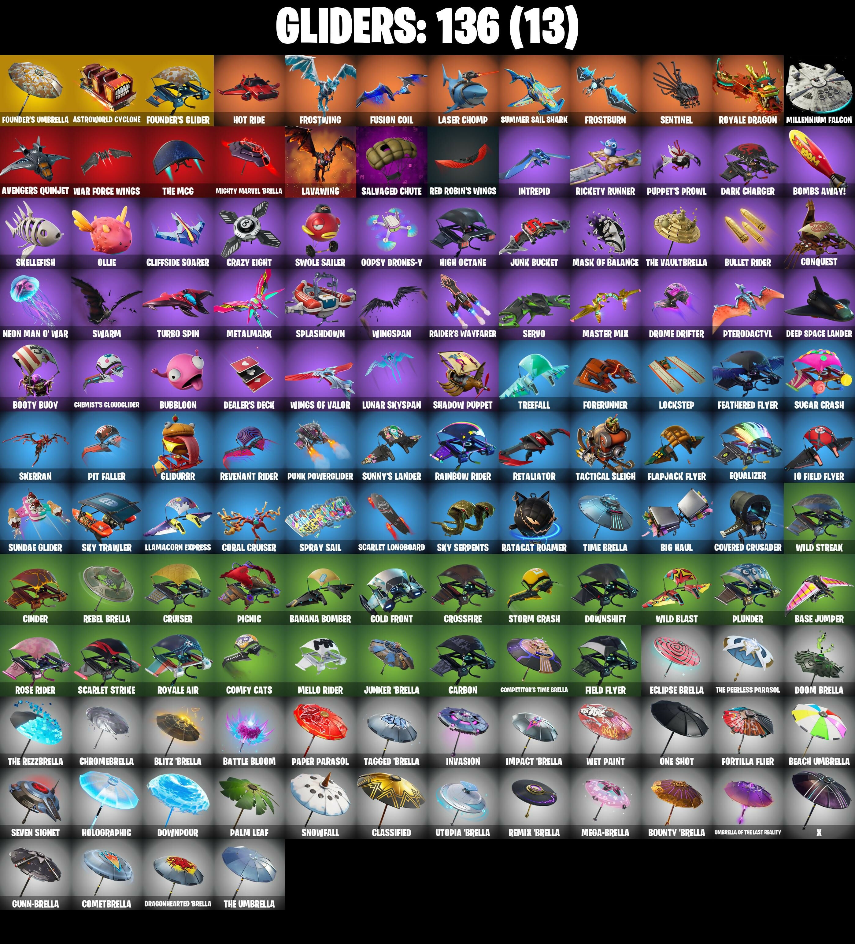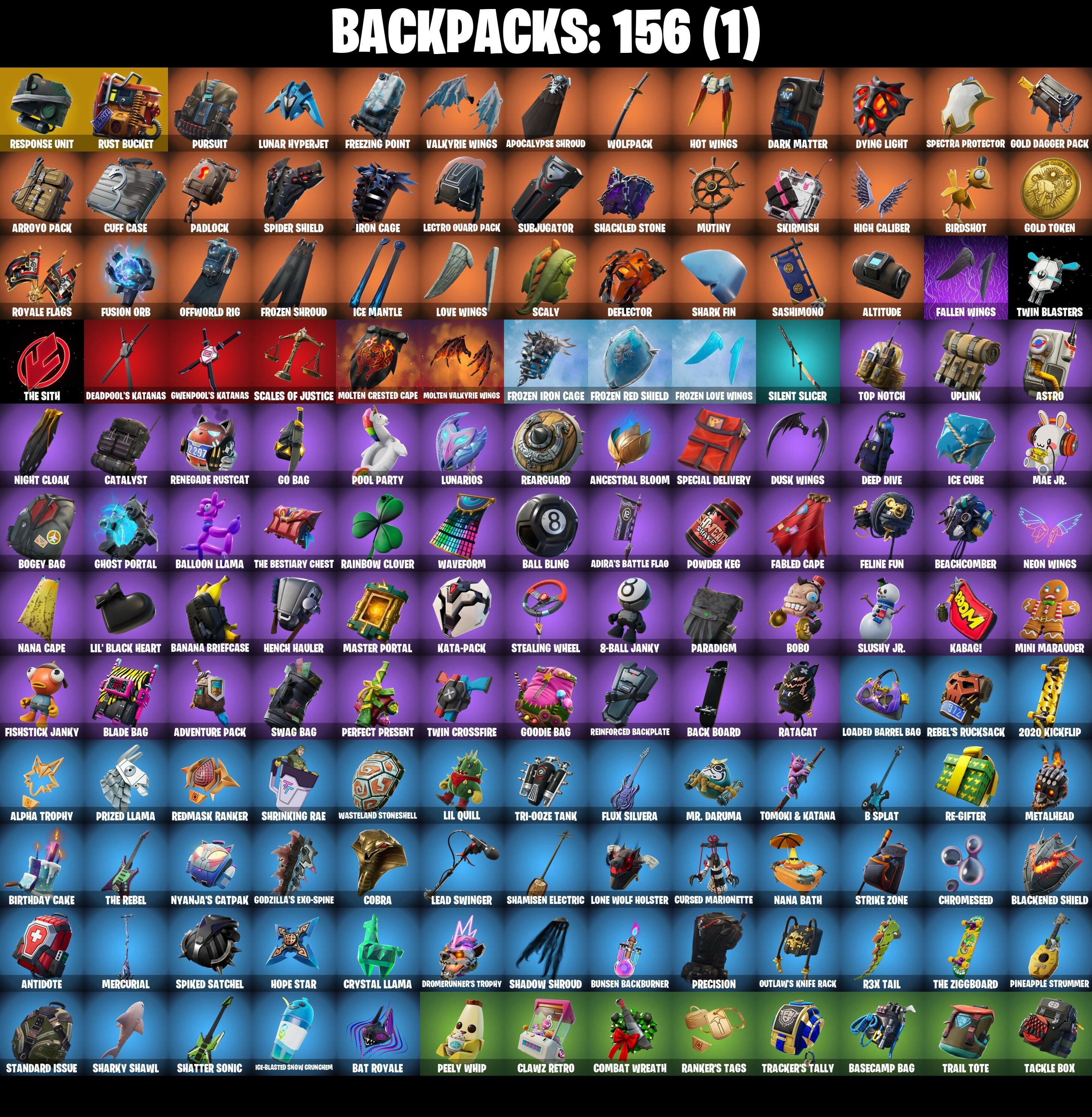 10 Field Flyer, 2020 Kickflip, 8-Ball Janky, 8-Ball Vs Scratch, Abominable Axe, Adira's Battle Flag, Adventure Pack, Agent Peely, Air Horn, Alpha Trophy, Altitude, Ancestral Bloom, Angler Axes, Antidote, Apocalypse Shroud, Archetype, Arroyo Pack, Astral Axe, Astro, Astroworld Cyclone, Avengers Quinjet, B Splat, Back Board, Backup Blades, Ball Bling, Balloon Axe, Balloon Llama, Banana Bomber, Banana Briefcase, Bananaxe, Bank Shots, Baron's Hoard, Base Jumper, Basecamp Bag, Basic Basher, Bat Royale, Battle Axe, Battle Bloom, Battlehawk, Beach Umbrella, Beachcomber, Beep Beep, Behold!, Best Mates, Big Haul, Birdshot, Birthday Cake, Black Werewolf, Blackened Shield, Blackheart, Blackheart (Stage 8), Blade Bag, Blade Of The Waning Moon, Blitz 'Brella, Blowing Bubbles, Bobo, Bogey Bag, Boing!, Bombs Away!, Booty Buoy, Boulder Breakers, Bounty 'Brella, Breakdown, Breathless Blades, Bubbloon, Bullet Rider, Bunker Basher, Bunker Jonesy, Bunsen Backburner, Burnoff, Calamity, Calamity Stage 5, Calculated, Call Me, Cameo Vs Chic, Carbide, Carbon, Cat Flip, Catalyst, Chemist's Cloudglider, Chill-Axe, Choice Knit, Chomp Jr., Chomp Sr., Chromebrella, Chromeseed, Cinder, Clang & Basher, Classified, Clawz Retro, Clean Sweep, Cliffside Soarer, Clock Strut, Cobalt, Cobra, Coin Flip, Cold Front, Combat Wreath, Cometbrella, Comfy Cats, Competitor's Time Brella, Conga, Conquest, Coral Cruiser, Cosmic Cleavers, Covered Crusader, Cozy Chomps, Crackshot, Crazy Eight, Crescent Shroom, Crimson Polestar, Crossfire, Crowbar, Crowning Achievement, Cruiser, Crystal Fang, Crystal Llama, Cuddle Carvers, Cuff Case, Cursed Marionette, Cyclo Curl, DJ Yonder, Dabstand, Dark Charger, Dark Matter, Dark Voyager, Deadfire, Deadpool, Deadpool Unmasked, Deadpool's Katanas, Dealer's Deck, Deep Dive, Deep Space Lander, Deflector, Demi, Dire, Disco Fever, Dive Knives, Do The Split, Doom Brella, Downpour, Downshift, Doze Dab, Dragon Stance, Dragon's Claw, Dragonhearted 'Brella, Dread, Drift, Drift Stage 5, Drome Drifter, Dromerunner's Trophy, Droop, Drop The Bass, Drum Major, Dumbbell Driver, Dusk, Dusk Knight, Dusk Wings, Dying Light, Eclipse Brella, Electro Pairing Blades, Electro Shuffle, Elite Agent, Ember, Ember (Night), Empire Axe, Enforcer, Epic Swords Of Wonder, Equalizer, Eva, Fable, Fabled Cape, Fallen Love Ranger, Fallen Wings, Fang Saws, Feathered Flyer, Felina's Claw, Feline Fun, Field Flyer, Fierce, Fishstick Janky, Fist Bump, Flamenco, Flapjack Flyer, Flashback Breakdown, Flawless, Flimsie Flail, Flippin' Away, Flippin' Incredible, Flippin' Sexy, Flux Silvera, Forerunner, Fortilla Flier, Founder's Glider, Founder's Umbrella, Free Flow, Freezing Point, Frost Blade, Frostbite, Frostburn, Frostwing, Frosty Globes, Frozen Axe, Frozen Iron Cage, Frozen Love Ranger, Frozen Love Wings, Frozen Raven, Frozen Red Knight, Frozen Red Shield, Frozen Shroud, Fusion, Fusion Coil, Fusion Orb, Fusion Scythe, Gale Force, Garrison, Gear Specialist Maya, Gentleman's Dab, Get Funky, Ghost Portal, Giddy-Up, Gilded Scepter, Glidurrr, Glowsticks, Go Bag, Godzilla's Exo-Spine, Gold Brutos, Gold Brutus, Gold Dagger Pack, Gold Midas, Gold Token, Golden King, Golden Scythe, Golf Clap, Goodie Bag, Groot's Sap Axes, Groove Jam, Ground Pound, Guiding Glow, Gum Brawler, Gunn-Brella, Gwenpool's Katanas, Hack & Smash, Hand Signals, Harbinger Armor Omegarok, Hello Friend, Hench Hauler, High Caliber, High Five, High Octane, Highlight Strikers, Holly Hatchets, Holographic, Hoop Master, Hope, Hope Star, Hot Marat, Hot Pokers, Hot Ride, Hot Wings, Howl, Hula Hoopin', Huntress, Hybrid, Hybrid (Stage 4), Hype, I Declare!, I'm A Mystery, Ice Cube, Ice King (Gold), Ice Mantle, Ice Scepter, Icicle, Impact 'Brella, Imperial March, Intensity, Intrepid, Invasion, Iron Cage, It Is Finished, It's Go Time!, It's... You?, Jack Gourdon, Jaywalking, Josie, Journey Vs Hazard, Jubilation, Jump Jets, Junk Bucket, Junker 'Brella, Kabag!, Kata-Pack, Keep It Mello, Kittanas, Knight's Treachery, Krisabelle, Laguna, Laid Back Shuffle, Laser Chomp, Lavawing, Lead Swinger, Lectro Guard Pack, Legendary Blade Of Insight, Lil Quill, Lil Split, Lil' Black Heart, Lil' Longboat, Lil' Prancer, Llama Bell, Llamacorn Express, Loaded Barrel Bag, Lockpick, Lockstep, Lollipopper, Lone Wolf Holster, Love It!, Love Ranger, Love Wings, Lt. Evergreen, Lucky Rider, Lug Axe, Lunar Hyperjet, Lunar Skyspan, Lunarios, Luxe, Luxe (Gold Clothing), Lynx, Lynx (Stage 4 - No Ponytail), Mae Jr., Make A Seat, Make It Rain, Marsh Walk, Marshmello, Marshy Smasher, Mask of Balance, Master Key, Master Key (Masked), Master Mix, Master Of Puppets, Master Portal, Mauler, Mean Streak, Medaxe, Mega-Brella, Mello Rider, Meowscles, Mercurial, Merry Marauder, Metalhead, Metalmark, Mic Drop, Microbot Mallet, Mighty Marvel 'Brella, Millennium Falcon, Mini Marauder, Mission Specialist, Molten Battle Hound, Molten Crested Cape, Molten Valkyrie, Molten Valkyrie Wings, Moonwalker, Mr. Daruma, Musha, Mutiny, My Idol!, Nailed It, Nana Bath, Nana Cape, Nana Nana, Nanner Bashers, Neon Man O' War, Neon Wings, Night Cloak, Night Kama, Nightshade, Nite Nite, Nyanja's Catpak, Offworld Rig, Ol' Spiky, Ol' Woody, Ollie, Omega, Omegarok, On The Hook, One Shot, Onesie, Onesie (Winter), Onslaught, Oopsy Drones-Y, Oracle Axe, Orange Justice, Oscar, Outlaw's Knife Rack, Outlaw's Whipknives, Padlock, Palm Leaf, Pandemonium, Paper Parasol, Paradigm, Paws & Claws, Peace Out, Peely, Peely Whip, Peppermint Pick, Perfect Present, Permafrost, Phone It In, Picnic, Pineapple Strummer, Pit Faller, Plunder, Point & Shoot, Point It Out, Poised Playmaker, Polar Pelly, Pool Party, Pop Lock, Popcorn, Positron, Pot O' Gold, Powder, Powder (White), Powder Keg, Precision, Premiere Poms, Prized Llama, Pterodactyl, Punk Powerglider, Puppet's Prowl, Pursuit, Quicksilver Baton Spear, R3X Tail, Ragnarok, Ragnarok (No Shoulder Pad), Raider's Wayfarer, Rainbow Clover, Rainbow Rider, Rainbow Smash, Ranker's Tags, Ratacat, Ratacat Roamer, Raven, Razor Smash, Re-Gifte