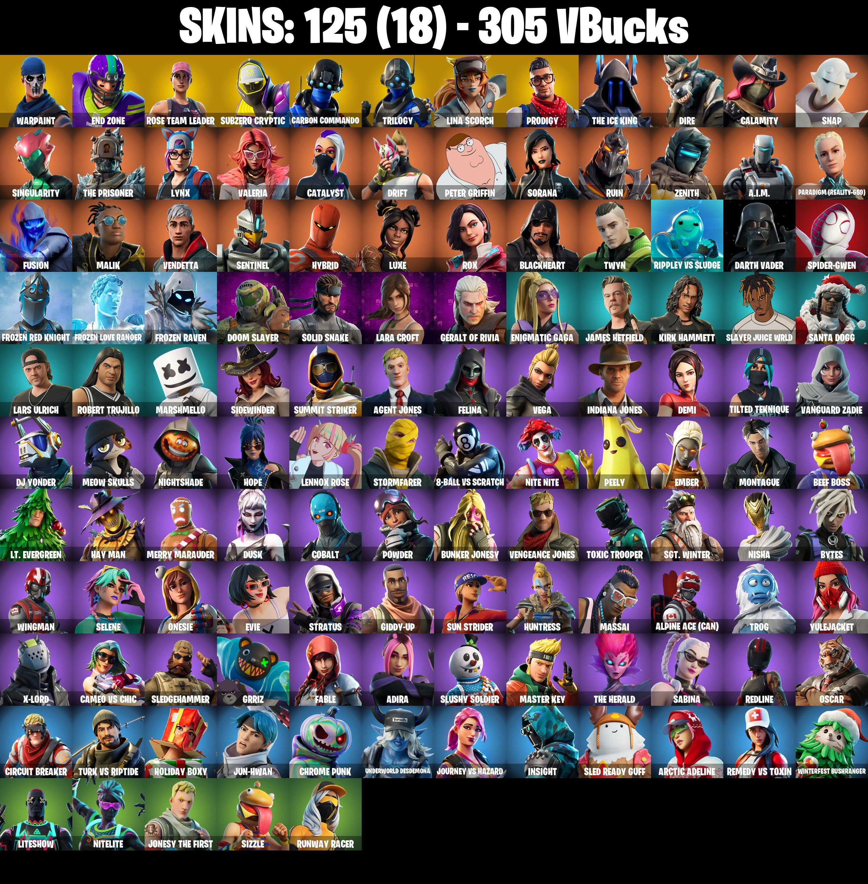 PC/PSN/XBOX |125 skins | OG STW | Lara Croft | Spider-Gwen | End Zone | Drift | Dire | The Ice King | Luxe | Peely | Vendetta | Fusion | #B798