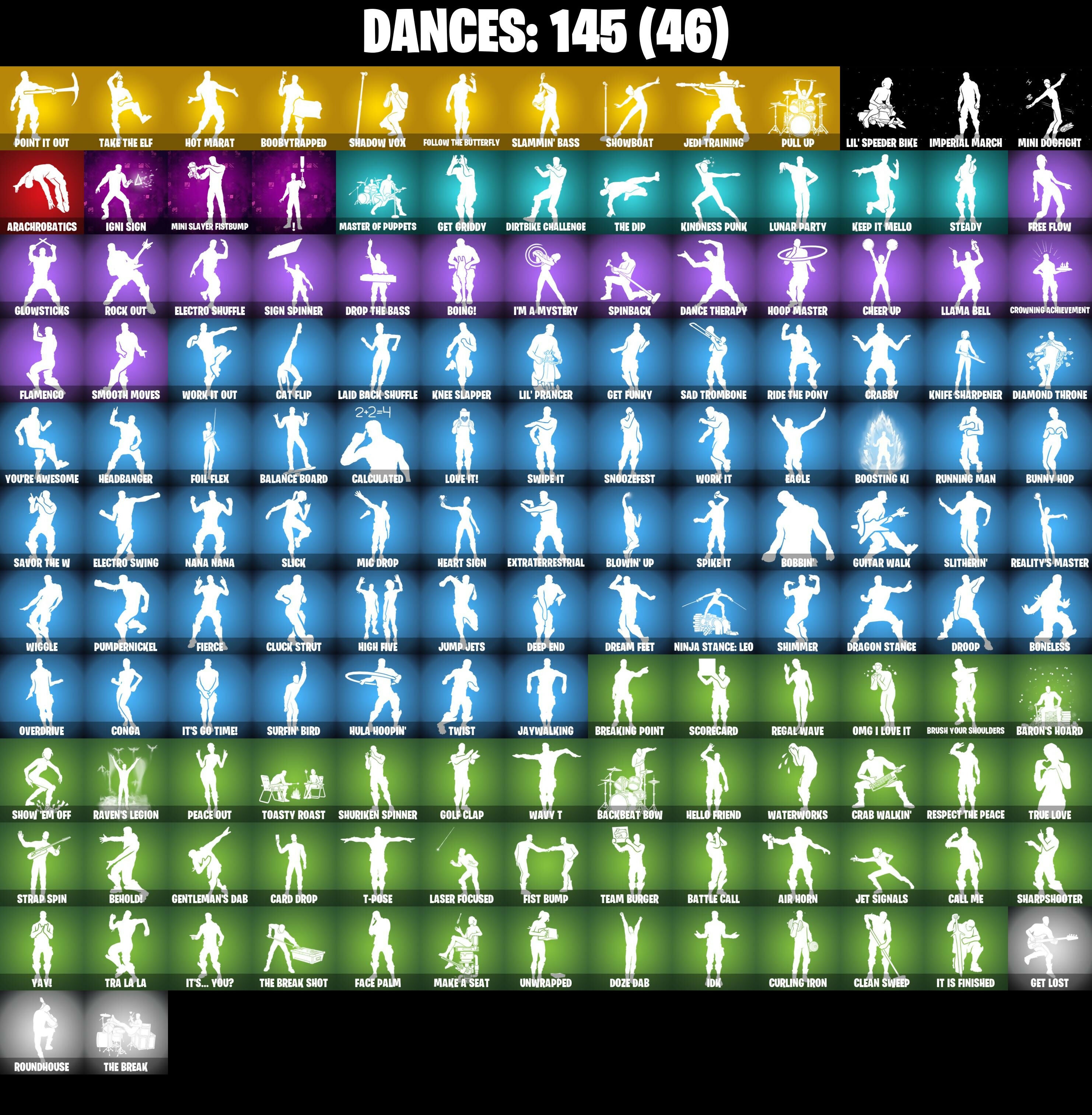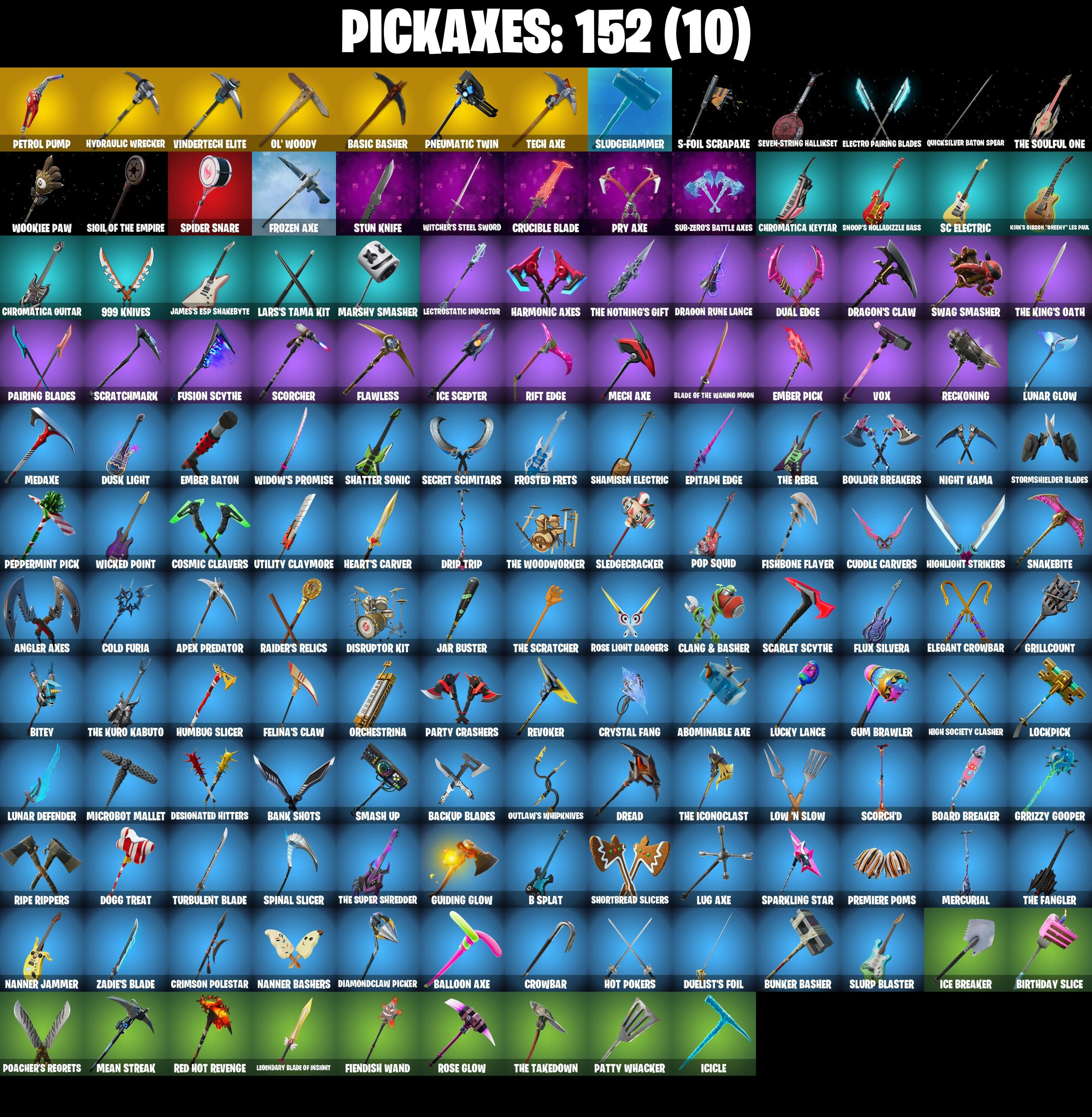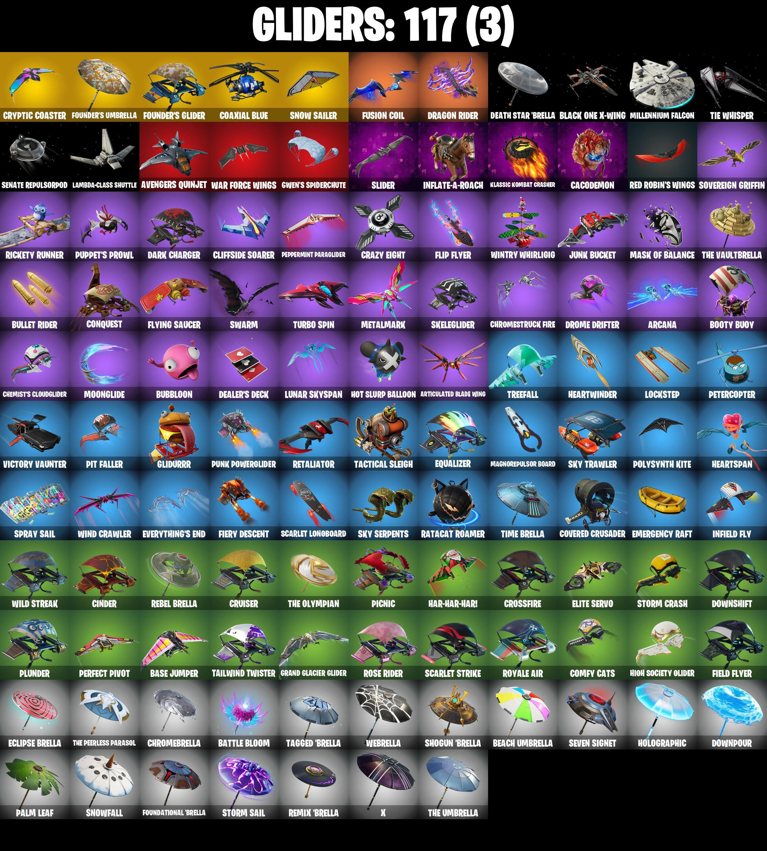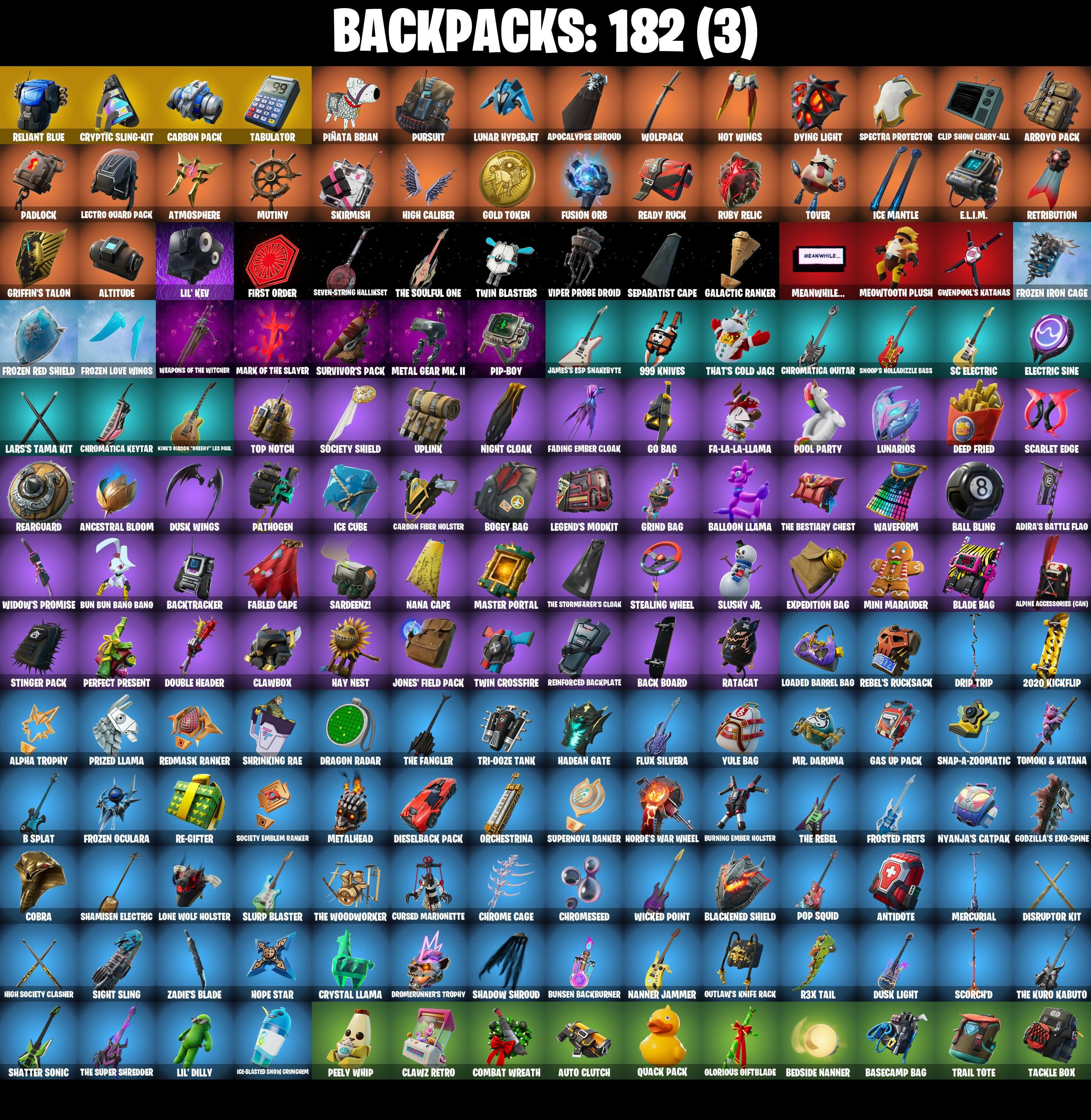 2020 Kickflip, 8-Ball vs Scratch, 999 Knives, A.I.M., Abominable Axe, Adira, Adira (Battle Mask), Adira's Battle Flag, Agent Jones, Air Horn, Alpha Trophy, Alpine Accessories (Can), Alpine Ace (Can), Altitude, Ancestral Bloom, Angler Axes, Antidote, Apex Predator, Apocalypse Shroud, Arachnobatics, Arcana, Arctic Adeline, Arroyo Pack, Articulated Blade Wing, Astro Armor, Atmosphere, Auto Clutch, Avengers Quinjet, B Splat, Back Board, Backbeat Bow, Backtracker, Backup Blades, Balance Board, Ball Bling, Balloon Axe, Balloon Llama, Bank Shots, Baron's Hoard, Base Jumper, Basecamp Bag, Basic Basher, Battle Bloom, Battle Call, Beach Umbrella, Bedside Nanner, Beef Boss, Behold!, Birthday Slice, Bitey, Black One X-Wing, Black Werewolf, Blackened Shield, Blackheart, Blackheart (Stage 8), Blade Bag, Blade of the Waning Moon, Blowin' Up, Board Breaker, Bobbin', Bogey Bag, Boing!, Boneless, Boobytrapped, Boosting Ki, Booty Buoy, Boulder Breakers, Breaking Point, Brush Your Shoulders, Bubbloon, Bullet Rider, Bun Bun Bang Bang, Bunker Basher, Bunker Jonesy, Bunny Hop, Bunsen Backburner, Burning Ambition Valeria, Burning Ember Holster, Bytes, Bytes (Lone Traveler), Cacodemon, Calamity, Calamity Stage 5, Calculated, Call Me, Cameo vs Chic, Carbon Commando, Carbon Fiber Holster, Carbon Pack, Card Drop, Cat Flip, Catalyst, Cheer Up, Chemist's Cloudglider, Chromatica Guitar, Chromatica Keytar, Chrome Cage, Chrome Punk, Chromebrella, Chromeseed, Chromestruck Fire, Cinder, Circuit Breaker, Clang & Basher, Clawbox, Clawz Retro, Clean Sweep, Cliffside Soarer, Clip Show Carry-All, Cluck Strut, Coaxial Blue, Cobalt, Cobra, Cold Furia, Combat Wreath, Comfy Cats, Conga, Conquest, Cosmic Cleavers, Covered Crusader, Crab Walkin', Crabby, Crazy Eight, Crimson Polestar, Crossfire, Crowbar, Crowning Achievement, Crucible Blade, Cruiser, Cryptic Coaster, Cryptic Sling-Kit, Crystal Fang, Crystal Llama, Cuddle Carvers, Curling Iron, Cursed Marionette, DJ Yonder, Dance Therapy, Dark Charger, Darth Vader, Dealer's Deck, Death Star 'Brella, Deep End, Deep Fried, Demi, Designated Hitters, Diamond Throne, Diamondclaw Picker, Dieselback Pack, Dire, Dirtbike Challenge, Disruptor Kit, Dogg Treat, Doom Slayer, Double Header, Downpour, Downshift, Doze Dab, Dragon Radar, Dragon Rider, Dragon Rune Lance, Dragon Stance, Dragon's Claw, Dread, Dream Feet, Drift, Drift Stage 5, Drip Trip, Drome Drifter, Dromrunner's Trophy, Droop, Drop The Bass, Dual Edge, Duelist's Foil, Dusk, Dusk Light, Dusk Wings, Dying Light, E.L.I.M., Eagle, Eclipse Brella, Electric Sine, Electro Pairing Blades, Electro Shuffle, Electro Swing, Elegant Crowbar, Elite Servo, Ember, Ember Baton, Ember Pick, Emergency Raft, End Zone, Enigmatic Gaga, Epitaph Edge, Equalizer, Everything's End, Evie, Expedition Bag, Extraterrestrial, Fa-La-La-Llama, Fable, Fabled Cape, Face Palm, Fading Ember Cloak, Fancy Peter Griffin, Felina, Felina's Claw, Field Flyer, Fiendish Wand, Fierce, Fiery Descent, First Order, Fishbone Flayer, Fist Bump, Flamenco, Flawless, Flip Flyer, Flux Silvera, Flying Saucer, Foil Flex, Follow The Butterfly, Foundational 'Brella, Founder's Glider, Founder's Umbrella, Free Flow, Frosted Frets, Frozen Axe, Frozen Iron Cage, Frozen Love Ranger, Frozen Love Wings, Frozen Oculata, Frozen Raven, Frozen Red Knight, Frozen Red Shield, Fusion, Fusion Coil, Fusion Orb, Fusion Scythe, Galactic Ranker, Gas Up Pack, Gentleman's Dab, Geralt of Rivia, Get Funky, Get Griddy, Get Lost, Giddy-Up, Glidurr, Glorious Giftblade, Glowsticks, Go Bag, Godzilla's Exo-Spine, Gold Token, Golf Clap, Grand Glacier Glider, Griffin's Talon, Grillcount, Grind Bag, Grizzly Gooper, Grriz, Guiding Glow, Guitar Walk, Gum Brawler, Gwen's Spiderchute, Gwenpool's Katanas, Hadean Gate, Har-Har-Har!, Harmonic Axes, Hay Man, Hay Nest, Hazard, Headbanger, Heart Sign, Heart's Carver, Heartspan, Heartwinder, Hello Friend, High Caliber, High Five, High Society Clasher, High Society Glider, Highlight Strikers, Holiday Boxy, Holographic, Hoop Master, Hope, Hope Star, Horde's War Wheel, Hot Marat, Hot Pokers, Hot Slurp Balloon, Hot Wings, Hula Hoopin', Humbug Slicer, Huntress, Hybrid, Hybrid (Stage 4), Hydraulic Wrecker, I'm A Mystery, Ice Breaker, Ice Cube, Ice King (Gold), Ice Mantle, Ice Scepter, Ice-Blasted Snow Crunchum, Icicle, Idk, Igni Sign, Imperial March, Indiana Jones, Indiana Jones (Temple Explorer), Infield Fly, Inflate-A-Roach, Insight, It Is Finished, It's Go Time!, It's... You?, James Hetfield, James's ESP Snakebyte, Jar Buster, Jaywalking, Jedi Training, Jet Signals, Jones' Field Pack, Jonesy the First, Journey vs Hazard, Jump Jets, Jun-Hwan, Junk Bucket, Keep It Mello, Kindness Punk, Kirk Hammett, Kirk's Gibson "Dreeny" Les Paul, Klassic Kombat Crasher, Knee Slapper, Knife Sharpener, Kurt's Gibson "Greency" Les Paul, Laid Back Shuffle, Lambda-Class Shuttle, Lara Croft, Lars Ulrich, Lars's Tama Kit, Laser Focused, Lectro Guard Pack, Lectrostatic Impactor, Legend's Modkit, Legendary Blade of Insight, Lennox Rose, Lil' Dilly, Lil' Kev, Lil' Prancer, Lil' Speeder Bike, Lina Scorch, Liteshow, Llama Bell, Loaded Barrel Bag, Lockpick, Lockstep, Lone Wolf Holster, Love It!, Low 'N Slow, Lt. Evergreen, Lucky Lance, Lug Axe, Lunar Defender, Lunar Glow, Lunar Hyperjet, Lunar Party, Lunar Skyspan, Lunarios, Luxe, Luxe (Gold Clothing), Lynx, Lynx (Stage 4 - No Ponytail), Magnorepulsor Board, Make A Seat, Malik, Malik (Solitary Defender), Mark of The Slayer, Marshmello, Marshy Smasher, Mask of Balance, Massai, Master Key, Master Key (Masked), Master Of Puppets, Master Portal, Mean Streak, Meanwhile..., Mech Axe, Medaxe, Meow Skulls, Meowtooth Plush, Mercurial, Merry Marauder, Metal Gear Mk. II, Metalarmark, Metalhead, Mic Drop, Microbot Mallet, Millennium Falcon, Mini Dogfight, Mini Marauder, Mini Slayer Fistbump, Montague, Moonglide, Mr. Daruma, Mutiny, Nana Cape, Nana Nana, Nanner Bashers, Nanner Jammer, Night Cloak, Night Kama, Nightshade, Ninja Stance: Leo, Nisha, Nite Nite, Nitelite, Nyanja's Ca