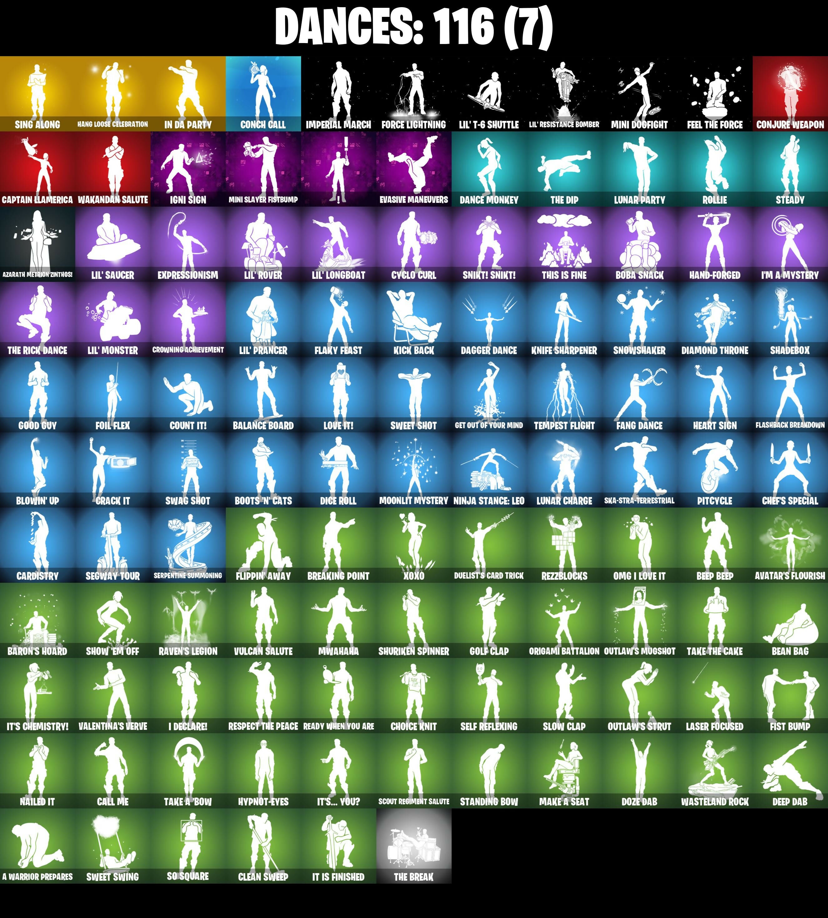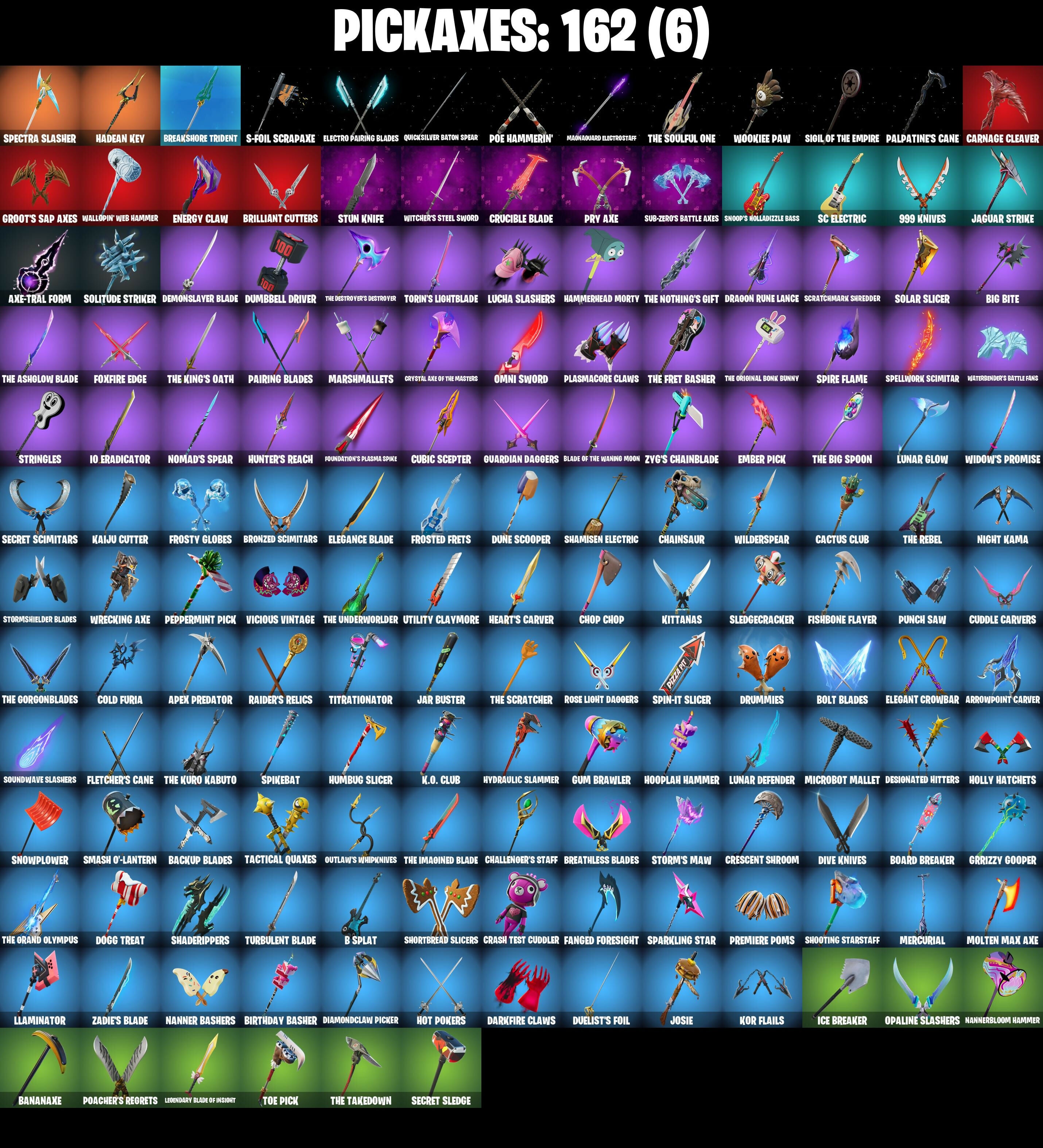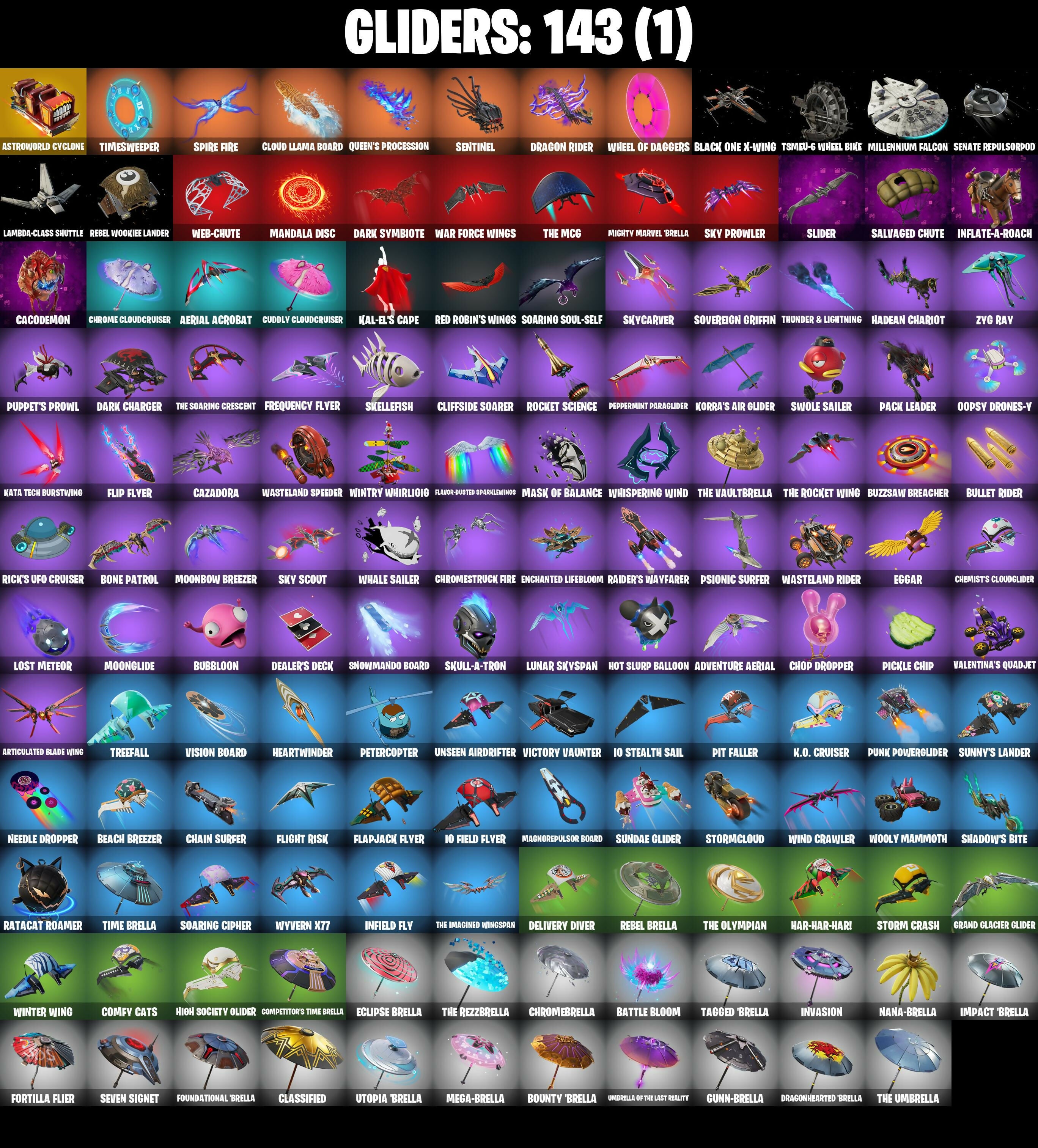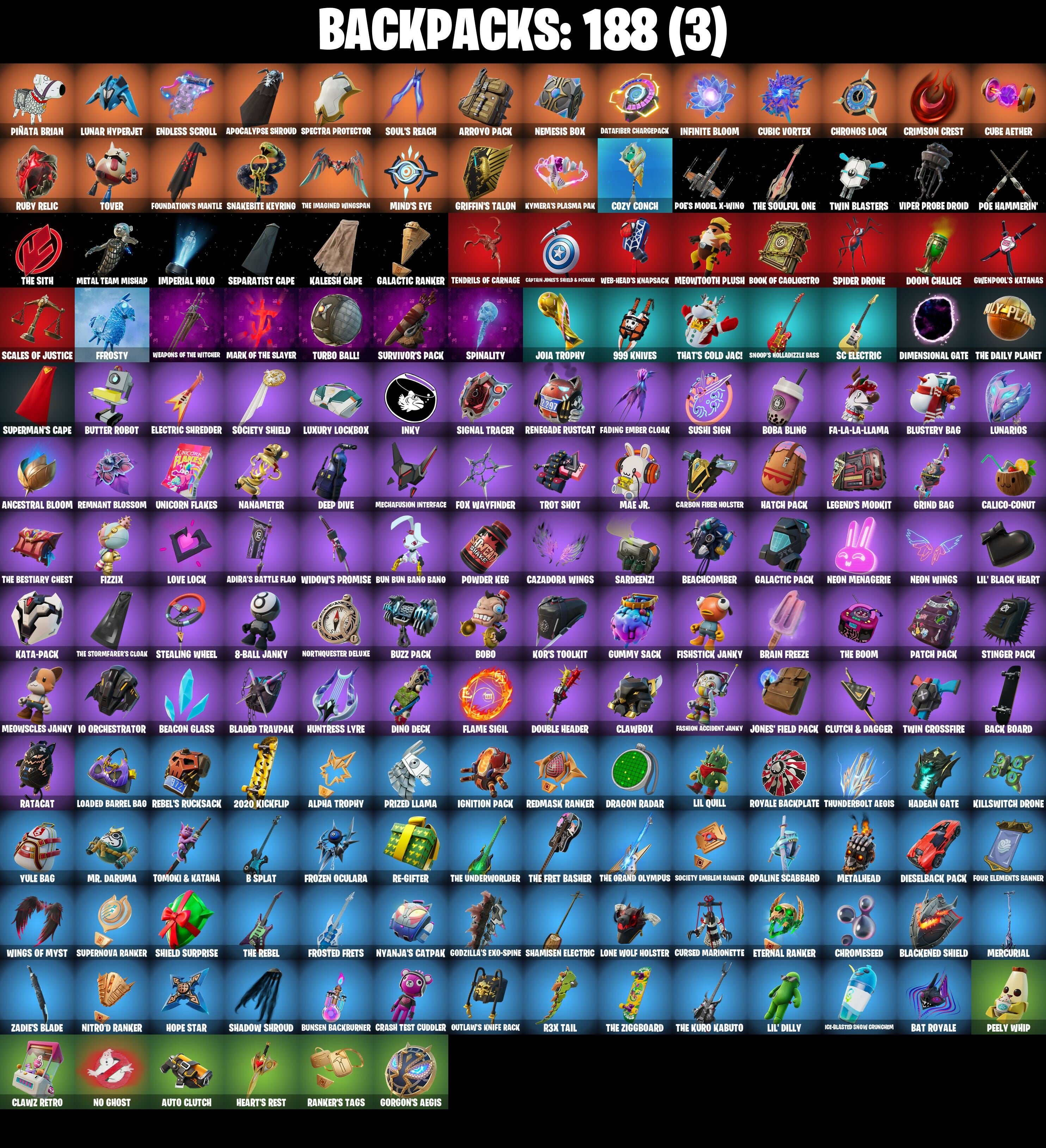 10 Eradicator, 10 Orchestrator, 2020 Kickflip, 8-Ball Janky, 999 Knives, A Warrior Prepares, Adira, Adira (Battle Mask), Adira's Battle Flag, Adventure Aerial, Aerial Acrobat, Agent Jones, Agent Jones (Jump 31), Alpha Trophy, Ancestral Bloom, Antonia, Apex Predator, Aphrodite, Apocalypse Shroud, Apprentice Evie, Arctic Adeline, Arrowpoint Carver, Arroyo Pack, Artemis, Articulated Blade Wing, Ascension Nezumi, Astro Armor, Astroworld Cyclone, Auto Clutch, Avatar's Flourish, Axe-Tral Form, Azarath Metrion Zinthisos, B Splat, Back Board, Backup Blades, Balance Board, Balanced, Bananaxe, Baron's Hoard, Bat Royale, Battle Bloom, Beach Breezer, Beachcomber, Beacon Glass, Bean Bag, Beep Beep, Bi-Han, Big Bite, Big Dill, Birthday Basher, Black One X-Wing, Blackened Shield, Blade Of The Waning Moon, Bladed Travpak, Blazing Fire Cerberus, Blowin' Up, Blustery Bag, Board Breaker, Boba Bling, Boba Snack, Bobo, Bolt Blades, Bone Patrol, Book of Cagliostro, Boots 'N Cats, Bounty 'Brella, Brain Freeze, Breaking Point, Breakshore Trident, Breathless Blades, Brilliant Cutters, Bronzed Scimitars, Bubbloon, Bullet Rider, Bun Bun Bang Bang, Bunsen Backburner, Burning Ambition Valeria, Butter Robot, Buzz Pack, Buzzsaw Breacher, Bytes, Bytes (Lone Traveler), Cacodemon, Cactus Club, Calico-Conut, Call Me, Captain Jones's Shield & Pickle, Captain Llamerica, Carbon Fiber Holster, Cardistry, Carnage, Carnage (Maximum), Carnage Cleaver, Cassidy Quinn, Cazadora, Cazadora Wings, Cerberus, Chain Surfer, Chainsaur, Challenger's Staff, Charlotte, Charlotte (Golden Rune), Chef's Special, Chemist's Cloudglider, Choice Knit, Chop Chop, Chop Dropper, Chrome Cloudcruiser, Chromebrella, Chromeseed, Chromestruck Fire, Chronos Lock, Clark Kent, Clark Kent (Superman), Classified, Clawbox, Clawz Retro, Clean Sweep, Cliffside Soarer, Cloud Llama Board, Cluck, Cluck (Slurpy), Clutch & Dagger, Cold Furia, Comfy Cats, Competitor's Time Brella, Conch Call, Conjure Weapon, Count It!, Cozy Conch, Crack It, Crash Test Cuddler, Crescent Shroom, Crimson Crest, Crowning Achievement, Crucible Blade, Crystal Axe Of The Masters, Cube Aether, Cubic Scepter, Cubic Vortex, Cuddle Carvers, Cuddly Cloudcruiser, Cursed Marionette, Cyclo Curl, Dagger Dance, Dance Monkey, Dark Charger, Dark Symbiote, Darkfire Claws, Darth Vader, Datafiber Chargepack, Dealer's Deck, Deep Dab, Deep Dive, Delivery Diver, Demonslayer Blade, Designated Hitters, Diamond Throne, Diamondclaw Picker, Dice Roll, Dieselback Pack, Dillinger The Otherk, Dimensional Gate, Dino Deck, Dive Knives, Doctor Slone, Doctor Slone (Prismatic), Doctor Strange, Dogg Treat, Dominion, Doom Chalice, Doom Slayer, Double Header, Doze Dab, Dragon Radar, Dragon Rider, Dragonhearted 'Brella, Dragoon Rune Lance, Drummies, Duelist's Card Trick, Duelist's Foil, Dumbbell Driver, Dune Scooper, Dusk Knight, Dusty, Eclipse Brella, Eggar, Electric Shredder, Electro Pairing Blades, Elegance Blade, Elegant Crowbar, Ember Pick, Emperor Palpatine, Enchanted Lifebloom, Endless Scroll, Energy Claw, Era, Erisa, Eternal Ranker, Evasive Maneuvers, Evie, Expressionism, Fa-La-La-Llama, Fabio Sparklemane, Fabio Sparklemane (Golden Rune), Fading Ember Cloak, Fang Dance, Fanged Foresight, Fashion Accident Janky, Feel The Force, Ffrosty, Fish Thicc, Fishbone Flayer, Fishstick Janky, Fist Bump, Fizzix, Flaky Feast, Flame Sigil, Flapjack Flyer, Flashback Breakdown, Flavor-Dusted Sparklewings, Fletcher Kane, Fletcher's Cane, Flight Risk, Flip Flyer, Flippin' Away, Foil-Flex, Force Lightning, Fortilla Flier, Foundation's Mantle, Foundation's Plasma Spike, Foundational 'Brella, Four Elements Banner, Fox Wayfinder, Foxfire Edge, Frequency Flyer, Frost Squad, Frosted Frets, Frosty Globes, Frozen Oculara, Galactic Pack, Galactic Ranker, General Grievous, Geralt Of Rivia, Get Out Of Your Mind, Godzilla's Exo-Spine, Golf Clap, Good Guy, Gorgon's Aegis, Grand Glacier Glider, Griffin's Talon, Grind Bag, Grizzly Gooper, Groot's Sap Axes, Grriz, Guardian Daggers, Guggimon, Guggimon (Prismatic), Gum Brawler, Gumbo, Gumbo (Sour), Gummy Sack, Gunn-Brella, Gunnar, Gunslinger Outlaw Midas, Gwenpool's Katanas, Hadean Chariot, Hadean Gate, Hadean Key, Hades, Hammerhead Morty, Hand-Forged, Hang Loose Celebration, Har-Har-Har!, Harlowe, Harlowe (Helmet), Hatch Pack, Haven, Head (Droopy), Heart Sign, Heart's Carver, Heart's Rest, Heartwinder, Helsie, High Society Glider, Highwire, Holly Hatchets, Hooplah Hammer, Hope, Hope Star, Hot Pokers, Hot Slurp Balloon, Humbug Slicer, Hunter's Reach, Huntress Lyre, Hydraulic Slammer, Hypnot-Eyes, I Declare!, I'm A Mystery, IO Field Flyer, IO Stealth Sail, Ice Breaker, Ice-Blasted Snow Crunchum, Igni Sign, Ignition Pack, Imani, Immortal Form, Immortal Zeus, Impact 'Brella, Imperial Holo, Imperial March, In Da Party, Infield Fly, Infinite Bloom, Inflate-A-Roach, Inky, Invasion, Iridia Vayne, It Is Finished, It's Chemistry!, It's... You?, J.B. Chimpanski, J.B. Chimpanski (Helmet), Jaguar Strike, Jar Buster, Joey, Joia Trophy, Jones' Field Pack, Josie, Joss, K.O. Club, K.O. Cruiser, Kaiju Cutter, Kal-El's Cape, Kaleesh Cape, Kata Tech Burstwing, Kata-Pack, Keisha Cross, Kiara K.O., Kiara K.O. (Captain's Bomber), Kick Back, Killswitch Drone, Kittanas, Knife Sharpener, Kor, Kor (Trenchcoat), Kor Flails, Kor's Toolkit, Korra, Korra's Air Glider, Krisabelle, Kymera, Kymera's Plasma Pak, Lambda-Class Shuttle, Lara Croft, Lara Croft (Gold Anniversary), Laser Focused, Legend's Modkit, Legendary Blade Of Insight, Lennox Rose, Lil Quill, Lil Split, Lil' Black Heart, Lil' Dilly, Lil' Longboat, Lil' Monster, Lil' Prancer, Lil' Resistance Bomber, Lil' Rover, Lil' Saucer, Lil' T-6 Shuttle, Llaminator, Loaded Barrel Bag, Lone Wolf Holster, Lost Meteor, Love It!, Love Lock, Lt. Evergreen, Lt. John Llama, Lucha Slashers, Lunar Charge, Lunar Defender, Lunar Glow, Lunar Hyperjet, Lunar Party, Lunar Skyspan, Lunarios, Luxury Lockbox, Mae, Mae Jr., Magmatic Poseidon, Magnorepulsor Board, Make A Seat, Malik, Malik (Solitary Defend