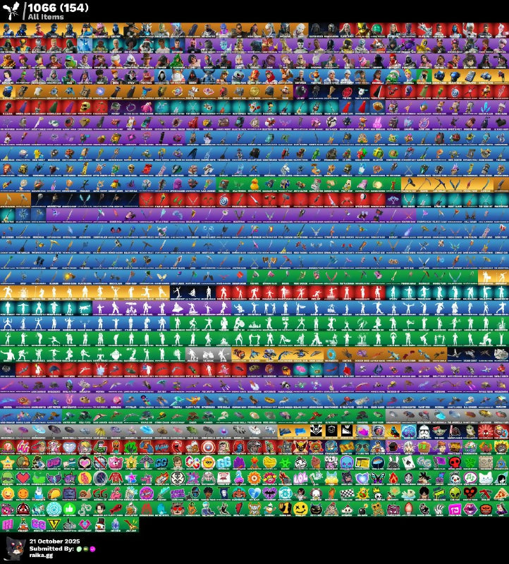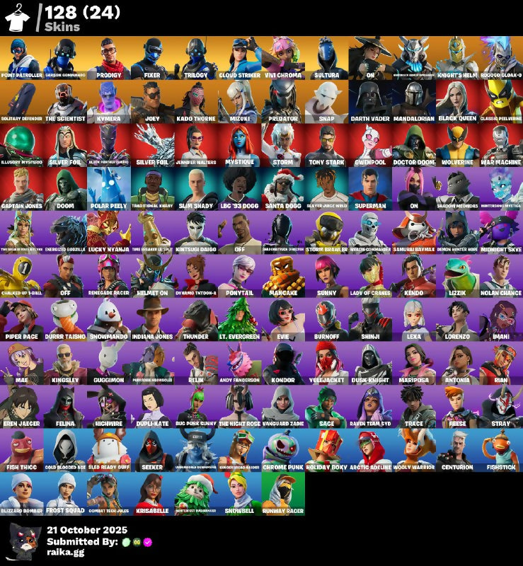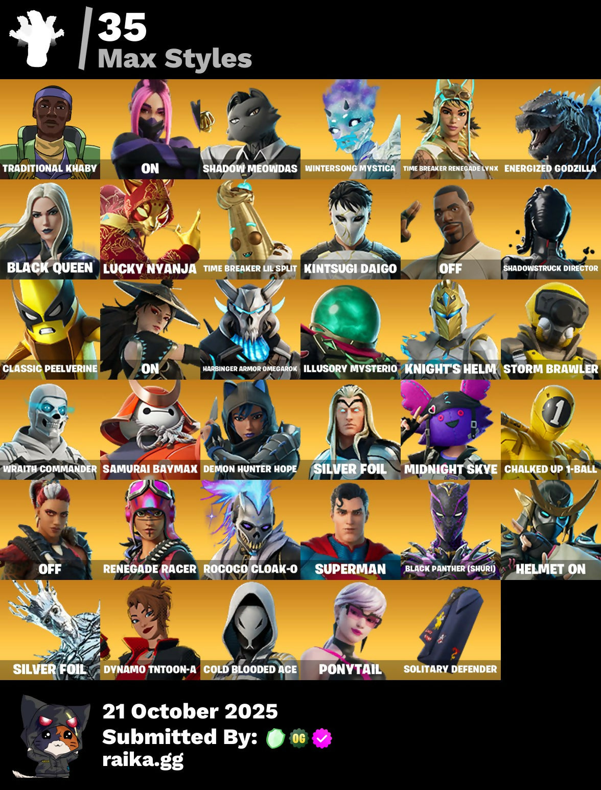 Agent Peely, Alien Panther Queen, Andy Fanderson, Antonia, Arctic Adeline, Astro Antidote, Astro Jack, Astroworld Cyclone, Ausman, Banner Icon, Battlehawk, Bhangra Boogie, Black Panther (Shuri), Black Queen, Blackheart, Blizzard Bomber, Blue Striker, Blue Viper, Boobytrapped, Brite Bomber, Brutus, Buc Punk Sunny, Bulletta, Burnoff, Captain Jones, Carbon Commando, Carbon Pack, Centurion, Chalked Up 1-Ball, Chalked Up Paul, Charlotte, Chrome Punk, Classic Peelverine, Classic Peelyvenge, Cloud Striker, Coaxial Blue, Cobalt Overdrive, Codename E.L.F., Cold Blooded Ace, Combat Tech Jules, Controller, Crystal, Cymitar, Daring Ogre, Dark Bomber, Dark Vanguard, Darth Vader, Demi, Demon Hunter Hope, Diamond Diva, Dire, Doctor Doom, Doom, Drift, Dupli-Kate, Durrr Taisho, Dusk Knight, Dynamo Tintooka, Dynamo Tntoon-A, Elevation, Elite Agent, Endorphinizado Rider, Energized Godzilla, Eren Jaeger, Eternal Knight, Evie, Felina, Fish Thicc, Fishstick, Fixer, Flappy, Flex On 'Em, Freese, Frost Squad, Fuze, Garrison Commando, Gold Midas, Guggimon, Gwenpool, Harbinger Armor Omegarok, Havoc, Helmet On, Heritage Mosswold, Highwire, Holiday Boxy, Hybrid, Illusory Mysterio, Imani, Indiana Jones, Infinity Commander, Introducing..., J.B. Chimpanski, Jennifer Walters, Joey, Jumpshot, Kado Thorne, Kendo, Kimitsugi Daigo, Kingsley, Kintsugi Daigo, Knight's Helm, Kondor, Krisabelle, Kymera, LBG '93 Dogg, Lady of Cranes, Laguna, Leather Lt. Cass, Lexa, Lizzik, Lorenzo, Lt. Evergreen, Lucky Nyanja, Mae, Magnus, Mako, Mandalorian, Mangaka, Mariposa, Maverick, Menace, Midnight Skye, Mizuki, Monster Team Banner, Mystique, Naruto, Nolan Chance, Off, Omega, On, Onesie, Peter Griffin, Petrol Pump, Piper Pace, Pneumatic Twin, Point Patroller, Polar Peely, Ponytail, Predator, Prodigy, Pull Up, Radiant Blue, Rage, Raptor, Raven Team Syd, Reaper, Recon Expert, Recon Strike, Redline, Reliant Blue, Relik, Renegade Racer, Rian, Rococo Cloak-O, Rogogo Cloak-09, Rosa, Runway Racer, Rust Lord, Sage, Samurai Baymax, Samurai Baywielder, Santa Dogg, Scuba Jonesy, Seeker, Shadow Meowdas, Shadow Vox, Shadowstruck Director, Shinji, Showboat, Silver Foil, Silver Jungle Wild, Sing Along, Siona, Skye, Slammin' Bass, Sled Ready Cuff, Slim Shady, Sludge, Snap, Snow Sailer, Snowbell, Snowmando, Solitary Defender, Sparkplug, Spire Assassin, Squad Leader, Square Up, Storm, Storm Berseker, Storm Brawler, Stratosphere, Stray, Street Brawler, Sultura, Summit Seeker, Sun Strider, Sunbird, Sunny, Superman, Synaptic Hatchets, Tabulator, Take The Elf, Tarana, The Ace, The Devourer, The Guardian Battlesuit, The Kid LAROI, The Night Rose, The Panther of Gato, The Prisoner, The Reaper, The Scientist, Thunder, Thunderstrike Director, Time Breaker Lil Split, Time Breaker Renegade Lynx, Titan, Tony Stark, Trace, Traditional Khaby, Traditional Midas, Trilogy, Unbridled Boogyman, Valor, Vanguard Zadie, Vendetta, Vivi Chroma, War Machine, War Paint, Winterbond Mystica, Wintersong Mystica, Wolverine, Wooly Warrior, Wraith Commander, Yulejackett, Zoey