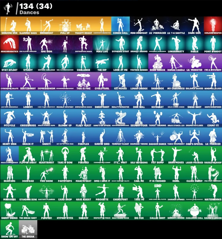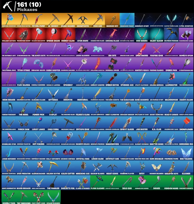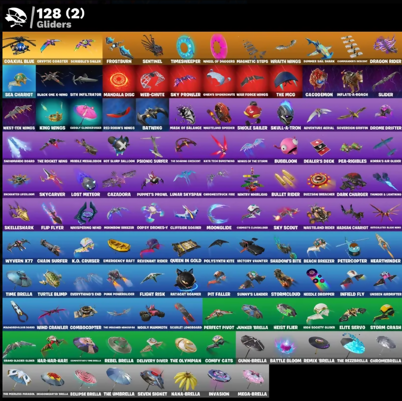 999 Knives, Aang, Aang's Air Sphere, Adira, Adventure Aerial, AeroWright Carver, Ahsoka Tano, Ahsoka's Staff, Air Nomad Staff, Antonia, Apex Predator, Aphrodite, Arachrobatics, Arctic Adeline, Articulated Blade Wings, Artifact Axe, Ascension Nezumi, Assault Ion Blade, Astro Armor, Avatar State Aang, Axiom, B Splat, Backup Blades, Balanced, Baron's Hoard, Basic Basher, Batman Long Bow Army, Batman Pickaxe, Battle Bloom, Battle-Tested, Batwing, Beach Breezer, Bear Hug, Beatzbunny, Big Fan, Bio Bite, Birthday Basher, BiteV, Black Knight of the Forbidden Lance, Black One X-Wing, Blade of the Viking King, Blazing Fire Cerberus, Blizzard Bomber, Blowin' Up, Board Breaker, Boba Snack, Bold Bar, Bolt Blades, Brave Moves, Brawler Dusty, Breaking Waves, Breakshore Trident, Brilliant Cutters, Bring It Around, Brite Raider, Bronzed Scimitars, BubblOon, Bubblegum Highwire, Bullet Rider, Bullpen, Burning Ambition Avalance, Butterfrost Burukhanser, Buzzsaw Breacher, Bytes (Lone Traveler), Cacodemon, Call Me, Called Shot, Card Drop, Cauldron Chill, Cazadora, Celebratory Slice, Chain Surfer, Challenge, Champion Kyra, Champion Stash D, Chef's Special, Chemist’s Cloudglider, Chill Count, Choice Knit, Chrome Punk, Chromebrella, Chromestruck Fire, Chrono Trigger Divergent, Clang & Basher, Clean Sweep, Cliffside Soarer, Clone Trooper, Cloudly Cloudcruiser, Club President Aelsie, Coaxial Blue, Cold Furia, Collector Halo Tracker, Combocopter, Comfy Cats, Comfy Chomps, Commander’s Descent, Conch Call, Conjure Weapon, Cosworth's Cleanup, Count It!, Crack It, Crescent Shroom, Crimson Codeblade, Crimson Polestar, Criss Cross, Crucible Blade, Cryptic Coaster, Crystal Fang, Cubic Scepter, Cuddle Carvers, Cyberdyne Salute, Cybertronian Axe, Cyclo Curl, Dagger Dance, Dark Charger, Dark Side, Dawn Duelist Nisha, Deadly Grizzly, Dealer’s Deck, Deep Core, Delivery Diver, Demogorgon, Designated Hitters, Diamond Throne, Diamondclaw Pickar, Dice Roll, Dirtbike Challenge, Distraction Dance, Doctor Strange, Don's Dominator, Double Tags, Doze Dab, Dragon Rider, Dragon Rune Lance, Dragonheart ‘Brella, Dramatic Flares, Dramvin, Driver, Drome Drifter, Duelist's Foil, Dumbbell Driver, Dune Scooper, Eclipse Brella, Electro Flaming Blades, Electrostatic Impactor, Elegance Blade, Elegant Crowbar, Elite Servo, Elysian Artemis, Ember Baton, Ember Pick, Emergency Raft, Empress Fan Dance, Enchanted Lifeloot, Energy Claw, Epic Blade of Flood, Epitaph Edge, Eren Jaeger, Erisa (Stealth Silver), Everything’s End, Evie, Expressionism, Fancy Candy Canes, Fancy Peter Griffin, Fanged Foresight, Felina, Felina's Claw, Fiendish Wand, Fire Show, Fishbone Flayer, Fist Bump, Flaky Feast, Flight Risk, Flip Flyer, Flippin' Away, Flux Silvera, Flying Slasher, Focused, Foil Flex, Fox Fire, Foxfire Edge, Frostburn, Future Relic Scythe, Gage, Get Out Of Your Mind, Golden Nemesis, Golden Scythe, Good Call, The Plants, Gorgonik Mic, Grand Glacier Glider, Grizzly Gooper, Guardian Daggers, Gum Brawler, Gumbo (Sour), Gunn-Brella, Gunnar, Gwen’s Spiderchute, Hadean Chariot, Hadean Key, Har-Har-Har!, Harlowe (Helmet), Have A Seat, Haven (Tropical Chippy), Heart Sign, Heart's Carver, Heartburst, Heartwinder, Heel Clicker Beakdown, Heist Flier, High Society Glider, Holiday Boxxy, Holly Hatchets, Hope, Hot Pokers, Hot Slurp Balloon, Hulk (Solitary Defender), Hunter's Reach, Hydraulic Slammer, Hypnoti-Eyes, I Need Your Concentrate, I'm A Mystery, Ice Moves, Iconic Era, Igni Sign, Immortal Form, Immortal Zeus, Infield Fly, Inflate-A-Roach, Invasion, It Is Finished, It's... You?, Jabba Seal Temple Reaper, Jackie, Jar Buster, Jun-Hwan, Junker 'Brella, K.O. Club, K.O. Cruiser, Kaiju Cutter, Kata Tech Burstring, King Wings, Kittanas, Knife Sharpener, Korra’s Air Glider, Krisabelle, Laser Focused, Legendary Blade Of Might, Lennox Rose, Lil' Monster, Lil' Podracer, Lil' Prancer, Lil' T-6 Shuttle, Lina Scorch, Live From Haddoffield, Llaminator, Look At Me, Lorenzo the Reckless, Lost Meteor, Love It!, Lt. John Lova Cudde Riot, Lucha Slashers, Lucky Lance, Lunar Charge, Lunar Defender, Lunar Glow, Lunar Party, Lunar Skyspan, MMA Sarmat Esun 45, Mae, Magmatic Mizuki, Magmatic Poseidon, Magnetic Steps, Magnetized Scarp, MagnoRepulsor Board, Major Mancake, Make A Seat, Mandala Disc, Marauder's Machete, Mariposa, Mask Of Balance, Master's Flourish, Mega Wave Imani, Mega Wave Thunder, Mega-Brella, Meow Skulls, Mercurial, Michael Myers, Microbot Mallet, Miku Live, Mini Dogfight, Mini Slayer Futuristic, Mobile Megalodon, Molten Max Axe, Moonbow Breezer, Moonglide, Moonlit Mystery, Mwahaha, My Cabbages! Balance Board, Namier Bashers, Namier's Look Hammer, Nana-Brella, Needle Dropper, Neon Reaver, Night Hunter Scarar, Night Kama, Ninja Stance: Donnie, Ninja Stance: Leo, Ninja Stance: Mikey, Ninja Stance: Raph, Nitro Ford Herald Boy, No Sweat, Nolan Chance, Nomad's Spear, Nutcracker Battle Axes, Ol' Woody, Old Snake, Omg I Love It, Omni Sword, Oopsy Drones-V, Opaline Slashers, Orbskewer Baton Spark, Outlaw's Whipknives, Oxide Rust, Pairing Blades, Paradigm (Aegisian), Paradise Newscicles, Party Hips, Patroitc Pikeman, Pea Party Harmony, Pea-Rigibles, Peabody, Perfect Pivot, Perfect Shadow, Petercopter, Petrol Pump, Pirouette, Pit Faller, Pitcycle, Plasmacore Claws, Poacher's Regrets, Point & Shoot, Polar Peely, Polysynth Kite, Power Pick, Premiere Poms, Prowler, Psionic Surfer, Pull Up, Pumped!, Punch Saw, Punk Powerglider, Puppet’s Prowl, Queen In Gold, Raider's Relics, Raise The Roof, Ratacat Roamer, Raven's Legion, Ravenpool, Reality's Master, Rebel Brella, Rebellion VFX Hammer, Recon Ranger, Red Robin’s Wings, Reef Cake Fish Thicc, Relik, Remix 'Brella, Respect & Peace, Revel, Revenant Rider, Rian, Robo-Kevin, Rococo Cloak-O, Rollie, Roman Candle, Ronin (Cape), Rose Light Daggers, Rough Cut Montmorale, Runway Racer, S-Foil Scrapaxe, Sabina, Scarlet Longboard, Scout Reshight Salute, Scribble's Sailer, Sea Chariot, Secret Scimitars, Segway Tour, Self Reflexing, Sentin