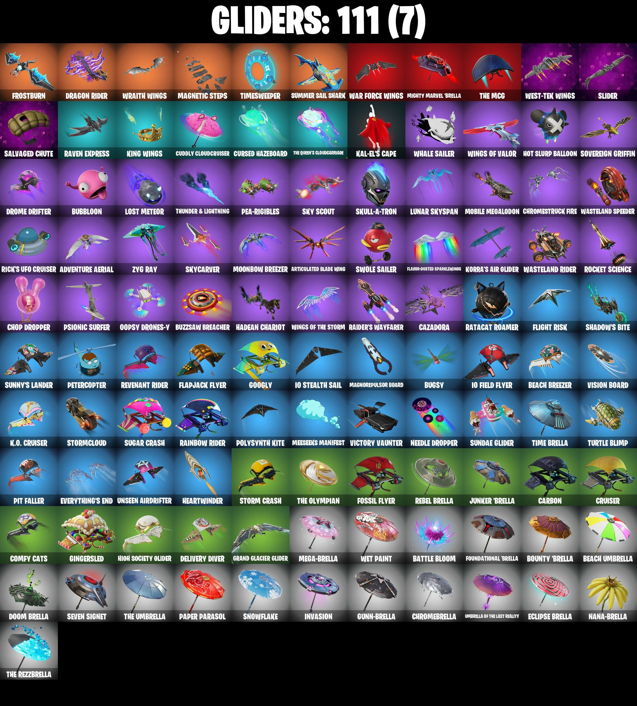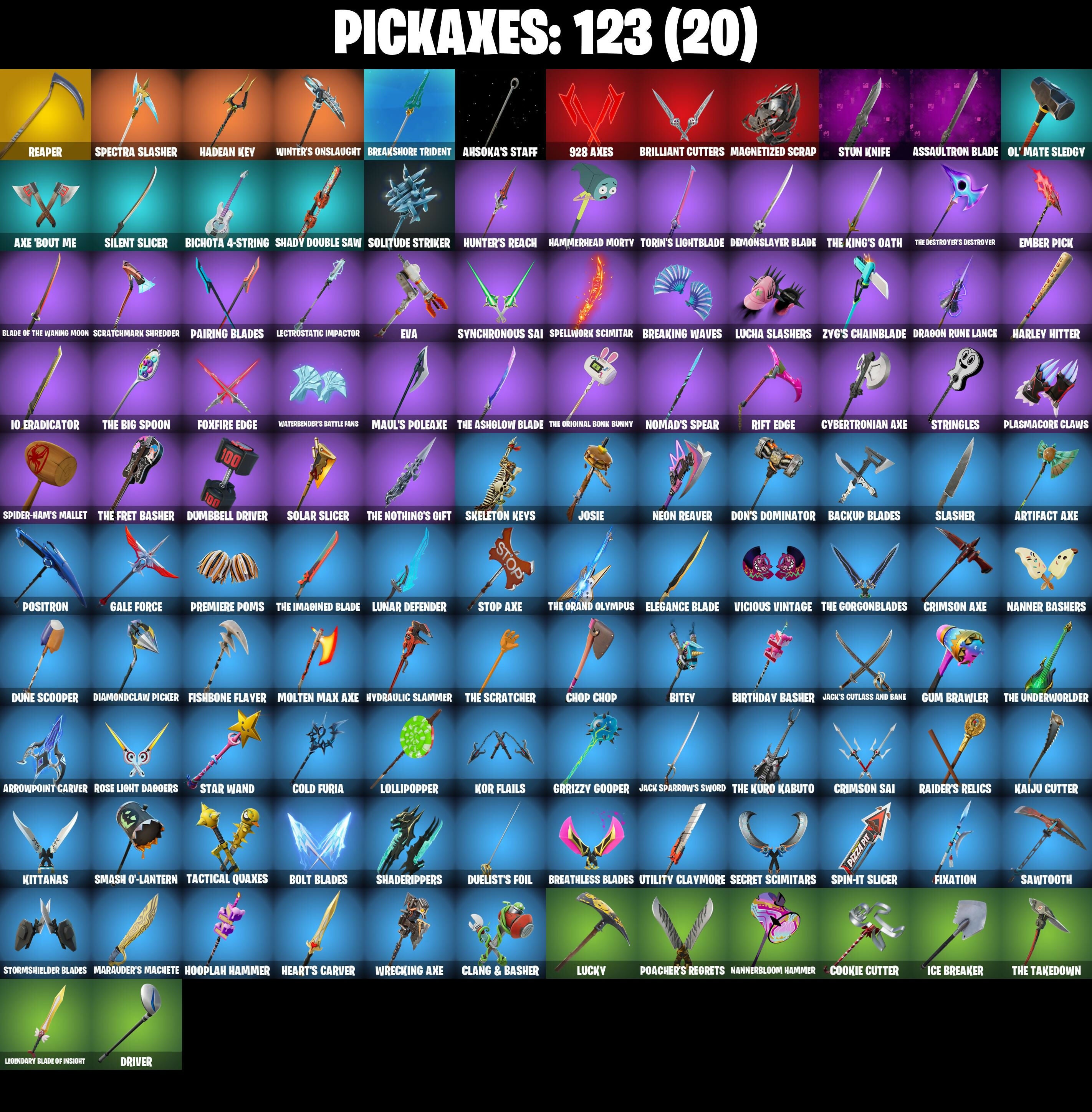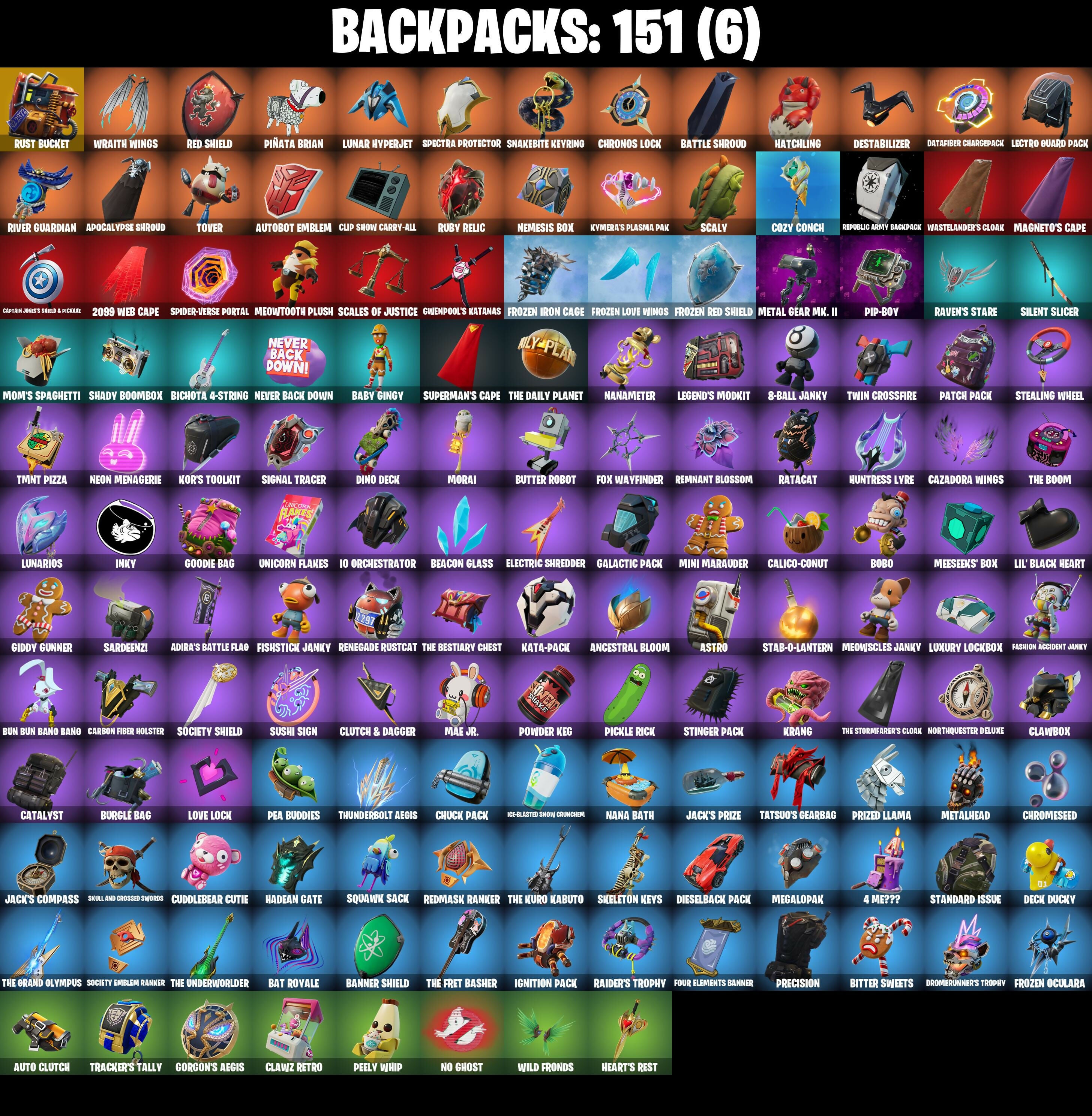 2099 Web Cape, 4 Me???, 8-Ball Janky, 928 Axes, Adira, Adira's Battle Flag, Adventure Aerial, Ahsoka Tano, Ahsoka's Staff, Alias, Alias (Cowl), Ancestral Bloom, Antonia, Aphrodite, Apocalypse Shroud, Arrowpoint Carver, Artemis, Articulated Blade Wing, Artifact Axe, Assaultron Blade, Astro, Aura, Auto Clutch, Autobot Emblem, Avatar's Flourish, Axe 'Bout Me, Baby Gingy, Backlash, Backup Blades, Balanced, Banner Shield, Bat Royale, Battle Bloom, Battle Shroud, Battle-Tested, Battlehawk, Beach Breezer, Beach Umbrella, Beacon Glass, Beatzbunny, Best Mates, Bichota 4-String, Big Fan, Birthday Basher, Bitev, Bitter Sweets, Black Knight T-60 Power Armor, Blade Of The Waning Moon, Blazing Fire Cerberus, Blowin' Up, Bobo, Bolt Blades, Bounty 'Brella, Breaking Waves, Breakshore Trident, Breathless Blades, Brilliant Cutters, Brite Moves, Brite Raider, Bubblegum Highwire, Bubloon, Budge, Bugsy, Bun Bun Bang Bang, Burgle Bag, Burn Bright, Burning Ambition Valeria, Butter Robot, Buzzsaw Breacher, Bytes, Bytes (Lone Traveler), Calico-Conut, Caper, Caper (Bunny), Captain Jones's Shield & Pickaxe, Captain Llamerica, Carbide, Carbide Armor Stage 5, Carbon, Carbon Fiber Holster, Card Drop, Catalyst, Cazadora, Cazadora Wings, Cerberus, Charlotte, Chef's Special, Chop Chop, Chop Dropper, Chromebrella, Chromeseed, Chromestruck Fire, Chronos Lock, Chuck Pack, Clang & Basher, Clark Kent, Clark Kent (Superman), Clawbox, Clawz Retro, Clean Sweep, Clip Show Carry-All, Clutch & Dagger, Codsworths Cleanup, Cold Furia, Collector Kado Thorne, Comfy Cats, Conch Call, Cookie Cutter, Count It!, Cozy Conch, Crack It, Crimson Axe, Crimson Sai, Crowning Achievement, Cruiser, Cuddlebear Cutie, Cuddly Cloudcruiser, Cursed Hazeboard, Cursed Jack Sparrow, Cybertronian Axe, Cyclo Curl, Dagger Dance, Dancin' Domino, Darklands Brite Raider, Datafiber Chargepack, Dawn Duelist Nisha, Deck Ducky, Delivery Diver, Demonslayer Blade, Destabilizer, Diamond Throne, Diamondclaw Picker, Dice Roll, Dieselback Pack, Dino Deck, Disassemble, Do The 'Split, Doctor Slone, Don's Dominator, Doom Brella, Doze Dab, Dragon Rider, Dragoon Rune Lance, Dramatic Flares, Drift, Drift Stage 5, Driver, Drome Drifter, Dromerunner's Trophy, Duelist's Foil, Dumbbell Driver, Dune Scooper, Eclipse Brella, Electric Shredder, Elegance Blade, Ember Pick, Empress Fan Dance, Era, Eva, Everything's End, Evie, Expressionism, Fabio Sparklemane, Fancy Peter Oriffin, Fang Dance, Fashion Accident Janky, Fire Show, Fish Thicc, Fishbone Flayer, Fishstick Janky, Fixation, Flaky Feast, Flapjack Flyer, Flashback Breakdown, Flavor-Dusted Sparklewings, Flight Risk, Fncs Renegade, Focus, Foil Flex, Fossil Flyer, Foundational 'Brella, Four Elements Banner, Fox Wayfinder, Foxfire Edge, Frostburn, Frozen Iron Cage, Frozen Love Ranger, Frozen Love Wings, Frozen Oculata, Frozen Raven, Frozen Red Knight, Frozen Red Shield, Furmidable Meowscles, Galactic Pack, Gale Force, Gentleman's Dab, Get Griddy, Get Out Of Your Mind, Get Schwifty, Giddy Gunner, Ginger Gunner, Gingerbread Raider, Gingersled, Goodie Bag, Googly, Gorgon's Aegis, Grand Glacier Glider, Green Roots Billie, Grizzly Gooper, Grriz, Guggimon, Gum Brawler, Gunn-Brella, Gwenpool's Katanas, Hadean Chariot, Hadean Gate, Hadean Key, Hades, Hammerhead Morty, Hand-Forged, Harbinger Armor Omegadon, Harley Hitter, Hatchling, Head (Droopy), Heart's Carver, Heart's Rest, Heartwinder, High Society Glider, Highwire, Hooplah Hammer, Hope, Hot Slurp Balloon, Hunter's Reach, Huntress, Huntress Lyre, Hydraulic Slammer, Hype, I'm A Mystery, IO Eradicator, IO Field Flyer, IO Orchestrator, IO Stealth Sail, Ice Breaker, Ice-Blasted Snow Crunch'em, Iconic Era, Ignition Pack, Imani, Immortal Form, Inky, Invasion, It's... You?, J.B. Chimpanski, Jack Sparrow, Jack Sparrow's Sword, Jack's Compass, Jack's Cutlass And Bane, Jack's Prize, Jar Of Dirt, Joey, Joltara, Josie, Junker 'Brella, K.O. Cruiser, Kado Thorne, Kaiju Cutter, Kal-El's Cape, Kata-Pack, Khaby Lame, Kick Back, King Wings, Kittanas, Knife Sharpener, Kor, Kor (Trenchcoat), Kor Flails, Kor's Toolkit, Korra, Korra's Air Glider, Krang, Kymera, Kymera's Plasma Pak, Laser Focused, Lazarbeam, Lectro Guard Pack, Lectrostatic Impactor, Legend's Modkit, Legendary Blade Of Insight, Lennox Rose, Lil Split, Lil' Black Heart, Lil' Longboat, Lil' Podracer, Lil' Rover, Lil' Saucer, Lil' T-6 Shuttle, Live From Haddonfield, Lollipopper, Lorenzo, Lorenzo The Reckless, Lost Meteor, Love It!, Love Lock, Lucha Slashers, Lucky, Lunar Defender, Lunar Hyperjet, Lunar Skyspan, Lunarios, Lunch Break, Luxury Lockbox, Mae, Mae Jr., Magmatic Mizuki, Magmatic Poseidon, Magnetic Steps, Magnetized Scrap, Magneto, Magneto's Cape, Magnorepulsor Board, Make A Seat, Marauder's Machete, Mariposa, Marshall Never More, Marshall Never More (Marshall Magma), Maul's Poleaxe, Medusa, Meeseeks Manifest, Meeseeks' Box, Mega-Brella, Megalo Don, Megalopak, Meow Skulls, Meowscles Janky, Meowtooth Plush, Merry Marauder, Metal Gear Mk. II, Metalhead, Michael Myers, Mighty Marvel 'Brella, Mini Marauder, Mission Specialist, Mizuki, Mobile Megalodon, Molten Max Axe, Mom's Spaghetti, Montague, Moonbow Breezer, Moonlit Mystery, Moonwalker, Morai, Mr. Meeseeks, Mystica, Nailed It, Nana Bath, Nana-Brella, Nanameter, Nanner Bashers, Nannerbloom Hammer, Needle Dropper, Nemesis Box, Neon Menagerie, Neon Reaver, Never Back Down, Nick Eh 30, Night Hunter Scarr, Ninja Stance: Donnie, Ninja Stance: Leo, Ninja Stance: Mikey, Ninja Stance: Raph, Nisha, Nitro Flare Machinist, Nitro Fusion Megalo Don, No Ghost, Nog Ops, Nolan Chance, Nomad's Spear, Northquester Deluxe, Oblivion, Ol' Mate Sledge, Old Snake, Omegarok, Omen, Omg I Love It, Oopsy Drones-V, Optimus Prime, Orange Justice, Oscar, Oxide Rust, Pairing Blades, Paper Parasol, Parade Riffs, Paradigm (Aurelian), Paradigm (Reality-659), Patch Pack, Pea Buddies, Pea Part Harmony, Pea-Rigibles, Peabody, Peely Whip, Peter Griffin, Petercopter, Pickle Rick, Pinata Brian, Pip-Boy, Piper Pace, Pit Faller, Pitcy