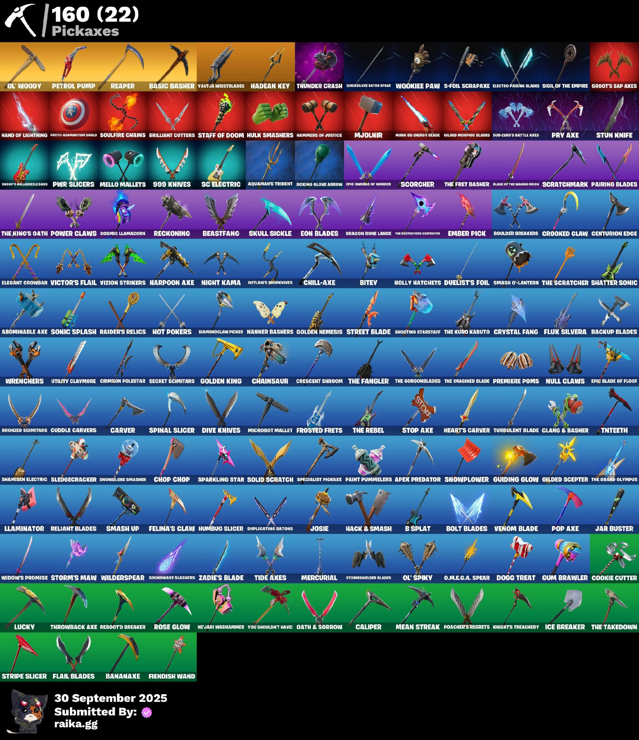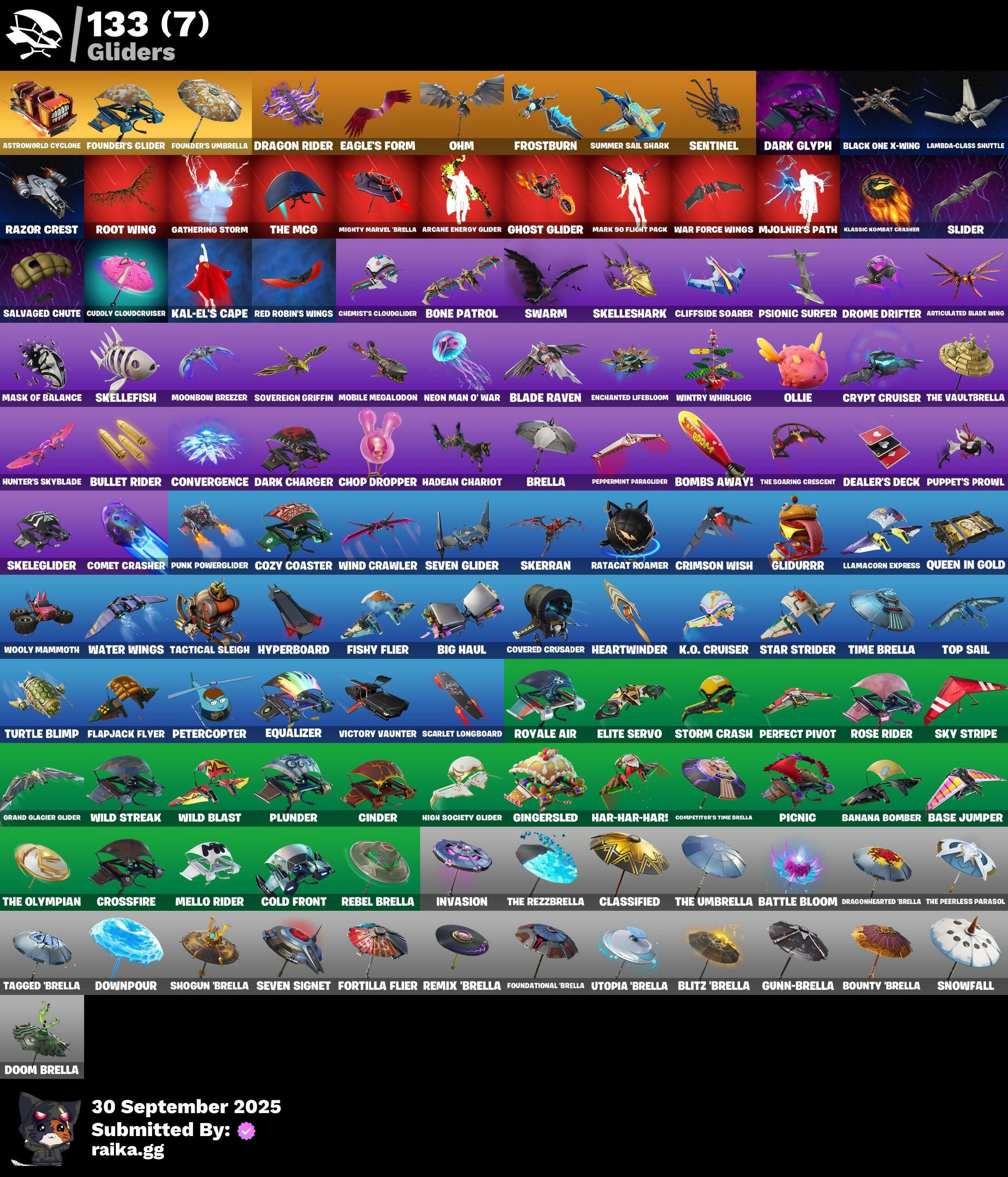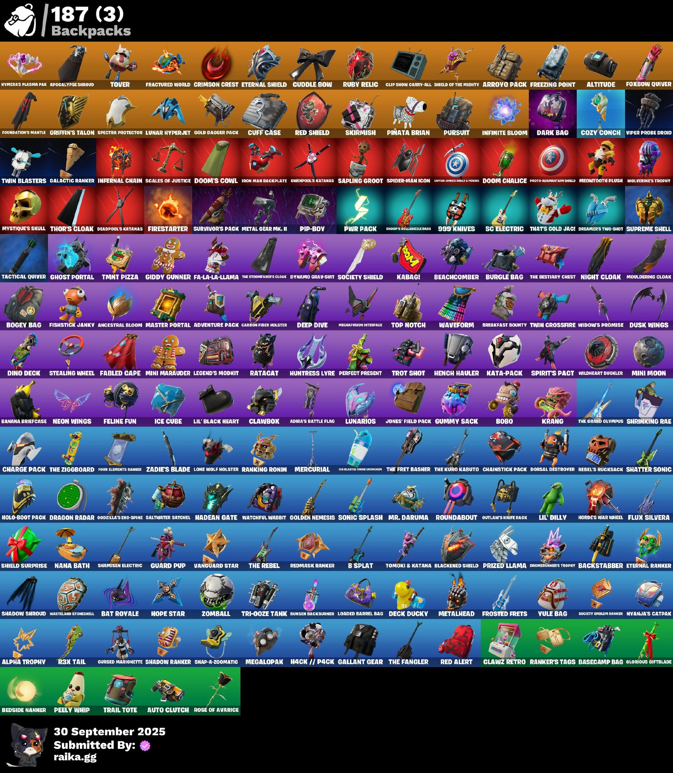 999 Knives, Abominable Axe, Adira, Adira's Battle Flag, Adventure Pack, Agent Jones, Agent Peely, Air Shredder, Alpha Trophy, Altitude, Ancestral Bloom, Apex Predator, Apocalypse Shroud, Aquaman, Aquaman's Trident, Arcane Energy Glider, Arctic Assassin, Armadillo, Arroyo Pack, Articulated Blade Wing, Astroworld Cyclone, Aura, Auto Clutch, B Splat, Backlash, Backstabber, Backup Blades, Banana Bomber, Banana Briefcase, Bananaxe, Baron's Hoard, Base Jumper, Basecamp Bag, Basic Basher, Bat Royale, Battle Bloom, Beachcomber, Bear Hug, Beastfang, Bedside Nanner, Beep Beep, Behold!, Big Haul, BiteV, Black One X-Wing, Blackened Shield, Blade Of The Waning Moon, Blade Raven, Blaze, Blitz 'Brella, Blowin' Up, Bobo, Bogey Bag, Bolt Blades, Bombs Away!, Bone Patrol, Boogie Down, Boomin', Boosting Ki, Boulder Breakers, Bounty 'Brella, Boxing Glove Arrow, Breakfast Bounty, Breakin', Breaking Point, Brella, Brilliant Cutters, Brite Bomber, Bronzed Scimitars, Bullet Rider, Bulletproof, Bunsen Backburner, Burgle Bag, Calamity, Caliper, Call Me, Cap Kick, Captain America, Captain Llamerica, Carbon Fiber Holster, Card Drop, Cardistry, Carver, Cat Flip, Centurion, Centurion Edge, Chainsaur, Chainstick Pack, Charge Pack, Chemist's Cloudglider, Chigusa, Chill-Axe, Choice Knit, Chop Chop, Chop Dropper, Cinder, Clang & Basher, Classified, Clawbox, Clawz Retro, Clean Sweep, Cliffside Soarer, Clip Show Carry-All, Coin Flip, Cold Front, Comet Crasher, Competitor's Time Brella, Contract Giller, Convergence, Cookie Cutter, Cosmic Llamacorn, Covered Crusader, Cozy Coaster, Cozy Conch, Crescent Shroom, Crimson Crest, Crimson Elite, Crimson Polestar, Crimson Wish, Criss Cross, Crooked Claw, Crossfire, Crypt Cruiser, Crystal, Crystal Fang, Cuddle Bow, Cuddle Carvers, Cuddle Team Leader, Cuddly Cloudcruiser, Cuff Case, Cursed Marionette, Cyclo Curl, Dark Bag, Dark Bomber, Dark Charger, Dark Glyph, Darth Vader, Deadpool, Deadpool's Katanas, Dealer's Deck, Deck Ducky, Deep Dab, Deep Dive, Denied, Diamond Throne, Diamondclaw Picker, Dino Deck, Disco Fever, Dive Knives, Dj Yonder, Doctor Doom, Dogg Treat, Doom Brella, Doom Chalice, Doom's Cowl, Dorsal Destroyer, Downpour, Doze Dab, Dragon Radar, Dragon Rider, Dragon Rune Lance, Dragonhearted 'Brella, Dreamer's Two-Shot, Drome Drifter, Duelist's Foil, Dupli-Kate, Duplicating Batons, Duplikates, Dusk, Dusk Knight, Dusk Wings, Dynamo Grav-Suit, Eagle's Form, Electro Pairing Blades, Elegant Crowbar, Elite Servo, Ember Pick, Enchanted Lifebloom, Eon Blades, Epic Blade Of Floof, Epic Swords Of Wonder, Equalizer, Eternal Knight, Eternal Ranker, Eternal Shield, Evasive Maneuvers, Evie, Fa-La-La-Llama, Fable, Fabled Cape, Face Palm, Fade, Felina, Felina's Claw, Feline Fun, Fiendish Wand, Firestarter, Fishstick, Fishstick Janky, Fishy Flier, Fist Bump, Flail Blades, Flapjack Flyer, Flippin' Away, Flux Silvera, Foil Flex, Fortilla Flier, Foundation's Mantle, Foundational 'Brella, Founder's Glider, Founder's Umbrella, Four Elements Banner, Foxbow Quiver, Fractured World, Freezing Point, Frostbite, Frostburn, Frosted Frets, Galactic Ranker, Galaxia, Gallant Gear, Gathering Storm, Gear Specialist Maya, Gentleman's Dab, Get Funky, Get Griddy, Ghost Glider, Ghost Portal, Ghost Rider, Giddy Gunner, Giddy-Up, Gilded Morphic Blades, Gilded Scepter, Ginger Gunner, Gingersled, Glidurr, Glitter, Glorious Giftblade, Godzilla's Exo-Spine, Gold Brutus, Gold Dagger Pack, Gold Meowscles, Gold Midas, Golden King, Golden Nemesis, Golf Clap, Grand Glacier Glider, Grand Salute, Green Arrow, Griffin's Talon, Groot, Groot's Sap Axes, Ground Pound, Guard Pup, Guiding Glow, Gum Brawler, Gumbo, Gummy Sack, Gunn-Brella, Gwenpool's Katanas, H4ck // Pack, Hack & Smash, Hadean Chariot, Hadean Gate, Hadean Key, Hammers Of Justice, Hand Of Lightning, Hang On, Har-Har-Har!, Harpoon Axe, Have A Seat, Haven, Head Banger, Heart's Carver, Heartwinder, Hello Friend, Hench Hauler, Hey Now!, High Society Glider, Hit It, Holiday Boxy, Hollowhead, Holly Hatchets, Holo-Boot Pack, Hope, Hope Star, Horde's War Wheel, Hot Marat, Hot Pokers, Hot Stuff, Hulk Smashers, Humbug Slicer, Hunter's Skyblade, Huntress Lyre, Hyperboard, I Declare!, I Like To Move It, I'm A Mystery, Ice Breaker, Ice Cube, Imperial March, Infernal Chain, Infinite Bloom, Invasion, Iris, Iron Man Backplate, It Is Finished, It's Go Time!, Jar Buster, Jennifer Walters, Jet Signals, Jones' Field Pack, Jonesy The First, Josie, Jubilation, Jules, Jungle Scout, K.O. Cruiser, Kabag!, Kal-El's Cape, Kata-Pack, Keep It Mello, Keyed Up, Kit, Klassic Kombat Crasher, Knife Sharpener, Knight's Treachery, Kondor, Krang, Krisabelle, Kymera, Kymera's Plasma Pak, Lachlan, Lambda-Class Shuttle, Lara Croft, Last Forever, Laugh It Up, Legend's Modkit, Lexa, Lil' Black Heart, Lil' Dilly, Lil' Monster, Lil' Saucer, Llamacorn Express, Llaminator, Loaded Barrel Bag, Lone Wolf Holster, Love It!, Lt. John Llama, Lucky, Lunar Charge, Lunar Hyperjet, Lunarios, Lynx, Make A Seat, Malik, Mancake, Mandalorian, Manic, Mark 85 Energy Blade, Mark 90 Flight Pack, Marsh Walk, Marshmello, Mask of Balance, Master Portal, Mave, Mean Streak, Mechafusion Interface, Megalopak, Megumi, Mello Mallets, Mello Rider, Members Only, Menace, Meowtooth Plush, Mercurial, Merry Marauder, Metal Gear Mk. II, Metalhead, Mic Drop, Microbot Mallet, Midfield Monstrosity, Mighty Marvel 'Brella, Mini Dogfight, Mini Marauder, Mini Moon, Mjolnir, Mjolnir's Path, Mobile Megalodon, Montague, Moonbow Breezer, Mouldering Cloak, Mr. Daruma, MrBeast, Mwahaha, Mystique, Mystique's Skull, Nana Bath, Nanner Bashers, Nejari Warhammer, Neon Man O' War, Neon Wings, Night Cloak, Night Kama, Nightshade, Nisha, Nog Ops, Null Claws, Nyanja's Catpak, O.M.E.G.A. Spear, Oath & Sorrow, Ocean, Ohm, Ol' Spiky, Ol' Woody, Ollie, Oscar, Outlaw's Knife Rack, Outlaw's Whipknives, PJ Patroller, Paint Pummellers, Pairing Blades, Pandemonium, Party Hips, Paws & Claws, Peely Whip, Peppermint Paraglider, Perfect Pivot, Perfect Present, Peter Griffin, Pe