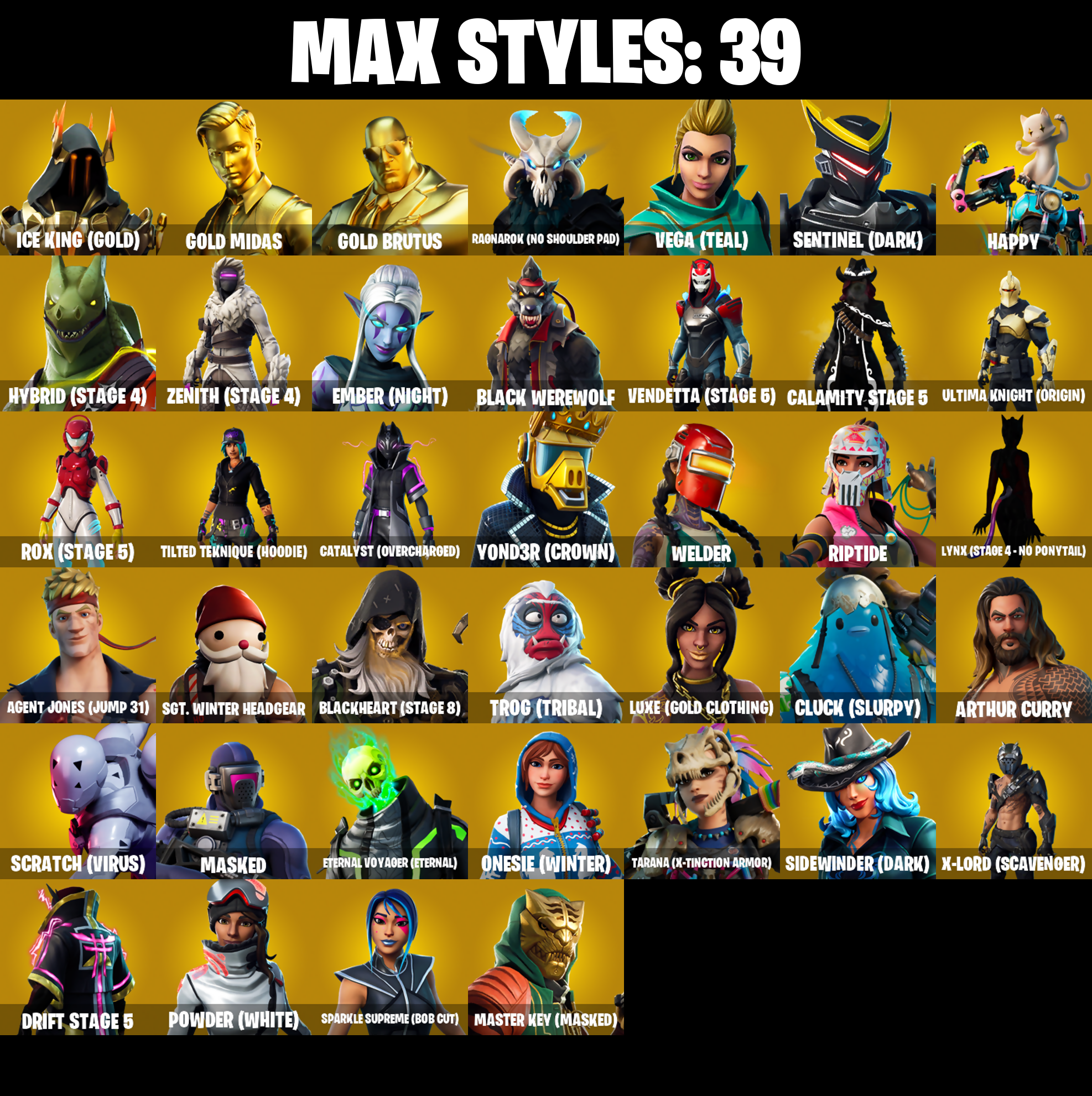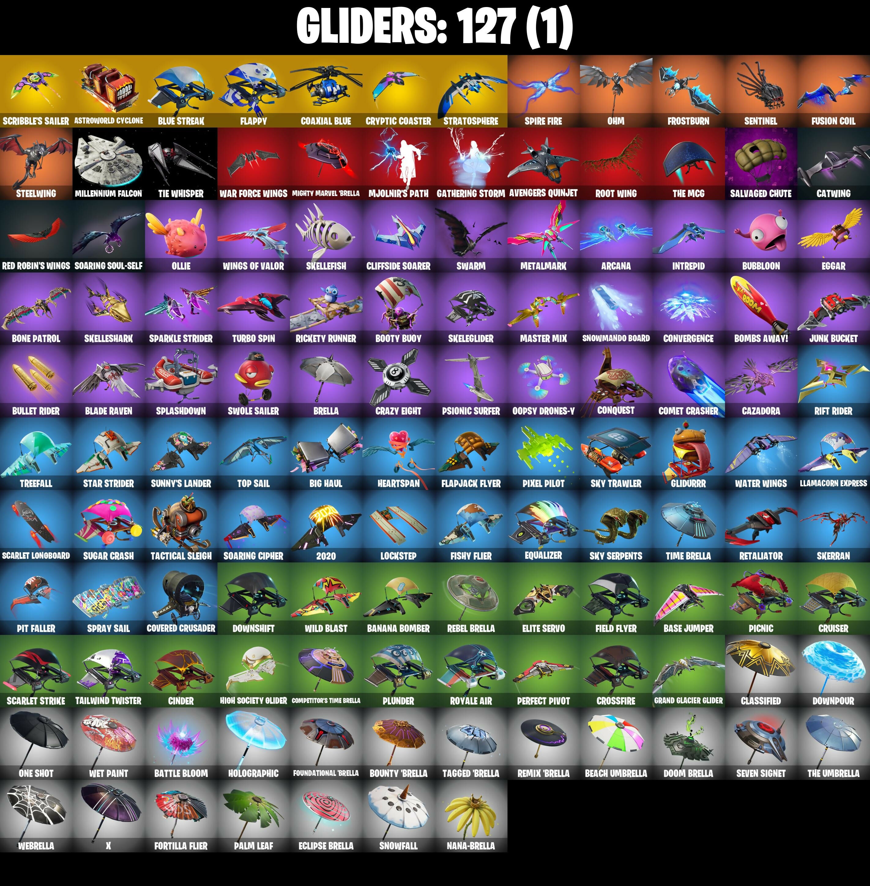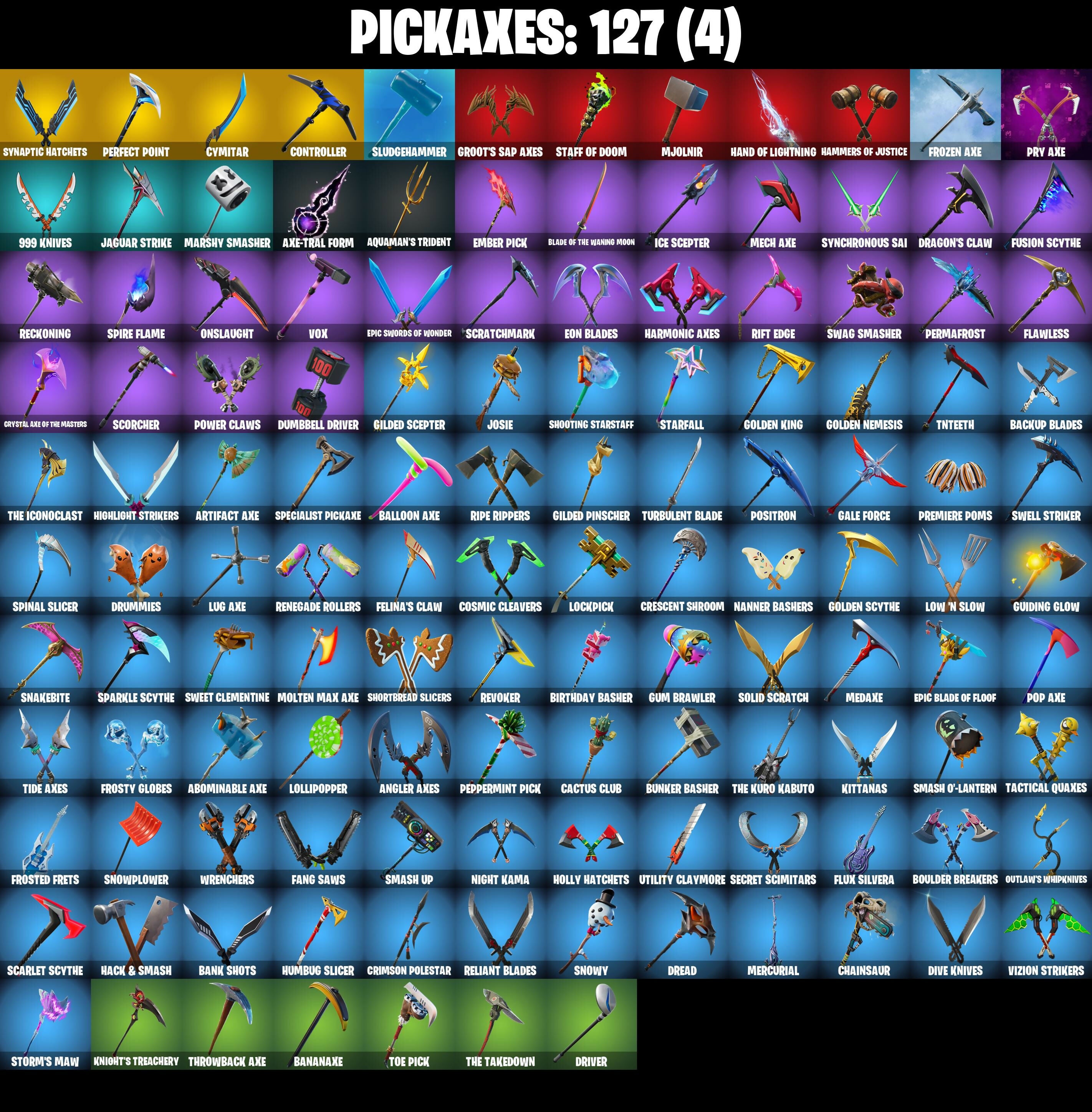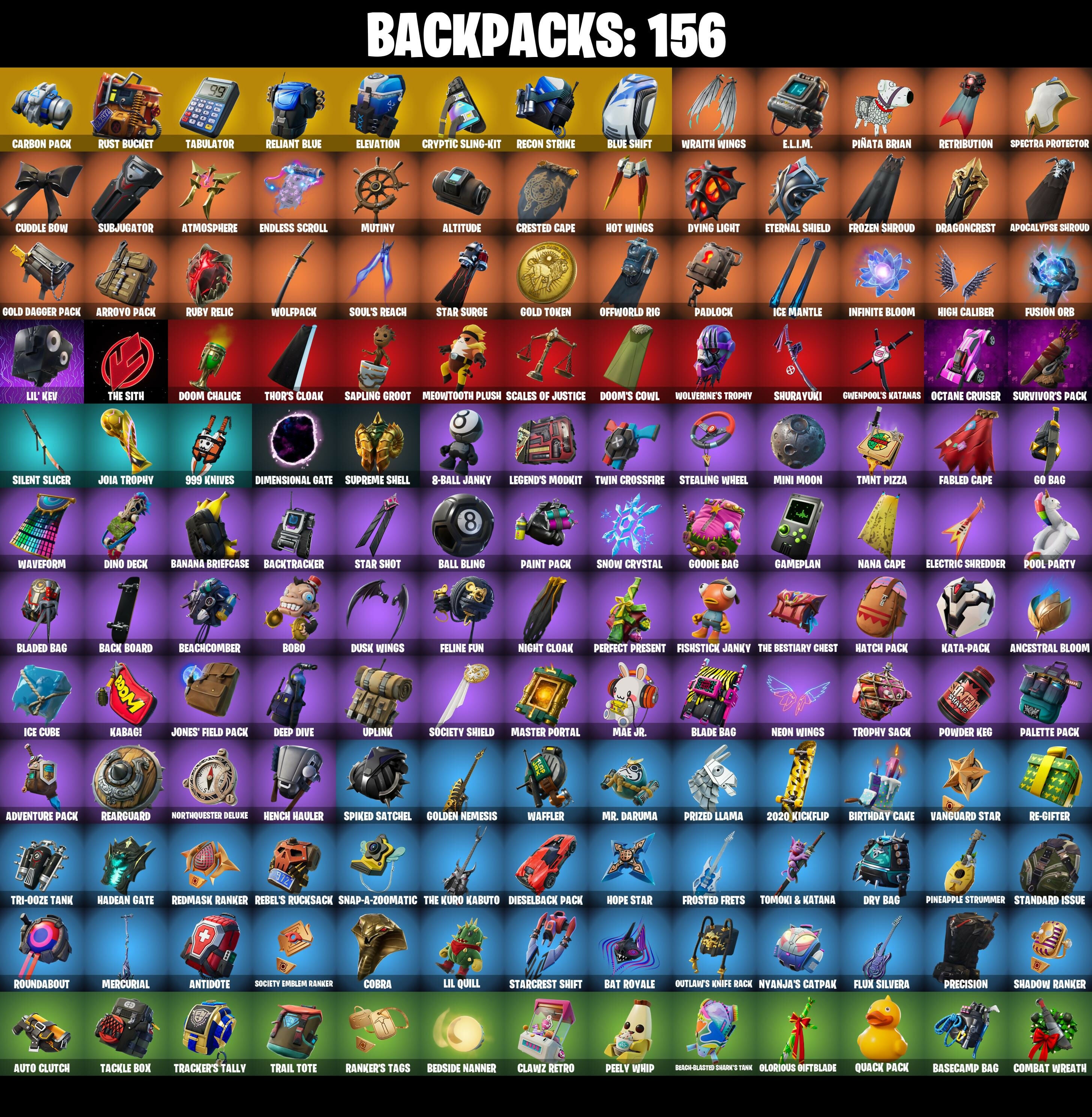 2020, 2020 Kickflip, 8-Ball Janky, 8-Ball vs Scratch, 999 Knives, A.I.M., Abominable Axe, Adventure Pack, Agent Jones, Agent Jones (Jump 31), Agent Peely, Air Horn, Air Shredder, Altitude, Amazing Cube, Ancestral Bloom, Angler Axes, Antidote, Apocalypse Shroud, Aquaman, Aquaman's Trident, Arcana, Arroyo Pack, Arthur Corry, Artifact Axe, Astroworld Cyclone, Atmosphere, Auto Clutch, Avengers Quinjet, Axe-tral Form, B.R.U.T.E. Gunner, Back Board, Backtracker, Backup Blades, Ball Bling, Balloon Axe, Banana Bomber, Banana Briefcase, Bananaxe, Bank Shots, Base Jumper, Basecamp Bag, Bat Royale, Battle Bloom, Battle Call, Battle Hound, Battlehawk, Beach Umbrella, Beach-Blasted Shark's Tank, Beachcomber, Bean Bag, Bedside Manner, Beep Beep, Behold!, Big Haul, Billy Bounce, Birdie, Birthday Basher, Birthday Cake, Black Werewolf, Blackheart, Blackheart (Stage 8), Blade Bag, Blade Raven, Blade of the Waning Moon, Bladed Bag, Blowing Bubbles, Blue Shift, Blue Streak, Blue Striker, Blue Team Leader, Bobo, Boing!, Bombs Away!, Bone Patrol, Booby Trapped, Boot Up Groove, Boots 'n' Cats, Booty Buoy, Boulder Breakers, Bouncer, Bounty 'Brella, Breakdown, Breaking Point, Breakneck, Brella, Brite Bomber, Bubbloon, Buckle Up, Bullet Rider, Bunker Basher, Bunker Jonesy, Busy V., Cactus Club, Calamity, Calamity Stage 5, Calculated, Call Me, Cameo vs Chic, Carbide, Carbon Commando, Carbon Pack, Cardistry, Cat Flip, Catalyst, Catalyst (Overcharged), Catwing, Cazadora, Chainsaur, Choice Knit, Cinder, Classified, Clawz Retro, Clean Sweep, Cliffside Soarer, Cloud Striker, Cluck, Cluck (Slurpy), Cluck Strut, Coaxial Blue, Cobra, Coin Flip, Combat Wreath, Comet Crasher, Competitor's Time Brella, Conga, Conquest, Controller, Convergence, Cosmic Cleavers, Count It!, Covered Crusader, Crazy Eight, Crescent Shroom, Crested Cape, Crimson Polestar, Crossfire, Crowning Achievement, Cruiser, Cryptic Coaster, Cryptic Sling-Xit, Crystal, Crystal Axe of the Masters, Cuddle Bow, Cuddle Team Leader, Cyclo Curl, Cymitar, DJ Yonder, Dabstand, Dance Off, Dance Therapy, Deadpool, Deep Dab, Deep Dive, Deep End, Demi, Dieselback Pack, Dimensional Gate, Dino Deck, Dip, Dire, Dive Knives, Doctor Doom, Doom Brella, Doom Chalice, Doom's Cowl, Downpour, Downshift, Doze Dab, Dragon Stance, Dragon's Claw, Dragoncrest, Dread, Dream Feet, Drift, Drift Stage 5, Driver, Droop, Drum Major, Drummies, Dry Bag, Dumbbell Driver, Dusk, Dusk Knight, Dusk Wings, Dying Light, Dynamo, E.L.I.M., Eclipse Brella, Eggar, Electric Shredder, Electro Shuffle, Electro Swing, Elevation, Elite Servo, Ember, Ember (Night), Ember Pick, Endless Scroll, Enforcer, Eon Blades, Epic Blade of Floof, Epic Swords of Wonder, Equalizer, Eternal Knight, Eternal Shield, Eternal Voyager, Eternal Voyager (Eternal), Evasive Maneuvers, Fable, Fabled Cape, Face Palm, Fade, Fang Saws, Featherweight, Felina, Felina's Claw, Feline Fun, Field Flyer, Fierce, Fishstick Janky, Fishy Flier, Flamenco, Flapjack Flyer, Flappy, Flawless, Flippin' Away, Flippin' Sexy, Flux Silvera, Foil Flex, Fortilla Flier, Foundational 'Brella, Free Flow, Fright Funk, Frostburn, Frosted Frets, Frosty Globes, Frozen Axe, Frozen Shroud, Fusion, Fusion Coil, Fusion Orb, Fusion Scythe, Gale Force, Gameplan, Gathering Storm, Gear Specialist Maya, Gentleman's Dab, Get Funky, Get Loose, Get Schwifty, Giddy-Up, Gilded Pinscher, Gilded Scepter, Glidurrr, Glitter, Glorious Giftblade, Go Bag, Gold Brutus, Gold Dagger Pack, Gold Midas, Gold Token, Golden King, Golden Nemesis, Golden Scythe, Golf Clap, Good Guy, Goodie Bag, Grand Glacier Glider, Groot, Groot's Sap Axes, Groove Jam, Guiding Glow, Gum Brawler, Gwenpool's Katanas, Hack & Smash, Hadean Gate, Hammers of Justice, Hand of Lightning, Happy, Harmonic Axes, Hatch Pack, Have A Seat, Heartspan, Hello Friend, Hench Hauler, High Caliber, High Five, High Society Glider, Highlight Strikers, Holiday Boxy, Holly Hatchets, Holographic, Hoop Master, Hootenanny, Hope Star, Hot Marat, Hot Stuff, Hot Wings, Hula Hoopin', Humbug Slicer, Huntress, Hybrid, Hybrid (Stage 4), Hype, I Declare!, Ice Cube, Ice King (Gold), Ice Mantle, Ice Scepter, Infinite Bloom, Infinite Dab, Intrepid, Introducing..., Iris, It's A Vibe, It's Go Time!, It's... You?, Jaguar Strike, Jaywalking, Jennifer Walters, Jet Signals, Joia Trophy, Jones' Field Pack, Josie, Journey vs Hazard, Jubilation, Jules, Jump Jets, Jumping Jacks, Junk Bucket, Kabag!, Kata-Pack, Keep It Mello, Keyed Up., Kit, Kittanas, Knight's Treachery, Krisabelle, Laguna, Laid Back Shuffle, Lara Croft, Legend's Modkit, Lil Quill, Lil' Kev, Living Large, Llama Bell, Llamacorn Express, Lockpick, Lockstep, Lollipopper, Love It!, Low 'N Slow, Lt. Evergreen, Lug Axe, Luxe, Luxe (Gold Clothing), Lynx, Lynx (Stage 4 - No Ponytail), Mae Jr., Major Mancake, Make A Seat, Marius, Marshy Smasher, Masked, Master Key, Master Key (Masked), Master Mix, Master Portal, Mech Axe, Medaxe, Meowscles, Meowtooth Plush, Mercurial, Metalmark, Mic Drop, Mighty Marvel 'Brella, Millennium Falcon, Mind Blown, Mini Moon, Mjolnir, Mjolnir's Path, Molten Max Axe, Mr. Daruma, Mutiny, My World, Nana Cape, Nana Nana, Nana-Brella, Nanner Bashers, Neon Wings, Neymar Jr, Night Cloak, Night Kama, Nightshade, Ninja Stance Donnie, Ninja Stance Leo, Ninja Stance Mikey, Nog Ops, Northquester Deluxe, Nyanja's Catpak, Ocean, Octane Cruiser, Offworld Rig, Ohm, Ollie, Omega, One Shot, Onesie, Onesie (Winter), Onslaught, Oopsy Drones-Y, Orange Justice, Out West, Outlaw's Knife Rack, Outlaw's Whipknives, Padlock, Paint Pack, Palette Pack, Palm Leaf, Pandemonium, Paws & Claws, Peace Out, Peely, Peely Whip, Peppermint Pick, Perfect Pivot, Perfect Point, Perfect Present, Permafrost, Picnic, Pinata Brian, Pineapple Strummer, Pit Faller, Pixel Pilot, Planetary Vibe, Plunder, Point & Shoot, Point It Out, Point Patroller, Poised Playmaker, Polar Peely, Pool Party, Pop Axe, Popcorn, Popular Vibe, Positron, Powder, Powder (White), Powder Keg, Power Claws, Precision, Premiere Poms, Prized Llama, Prodi