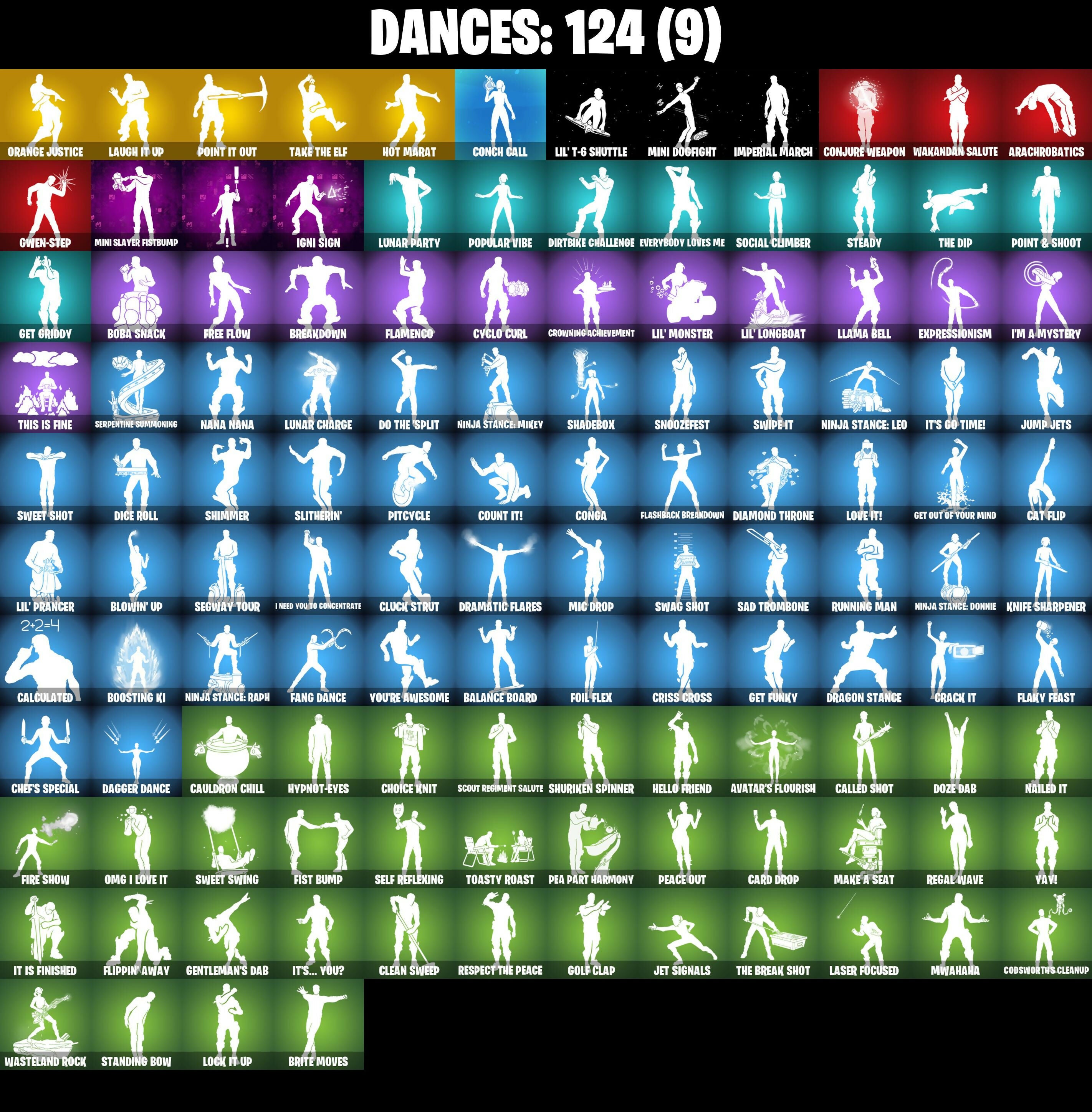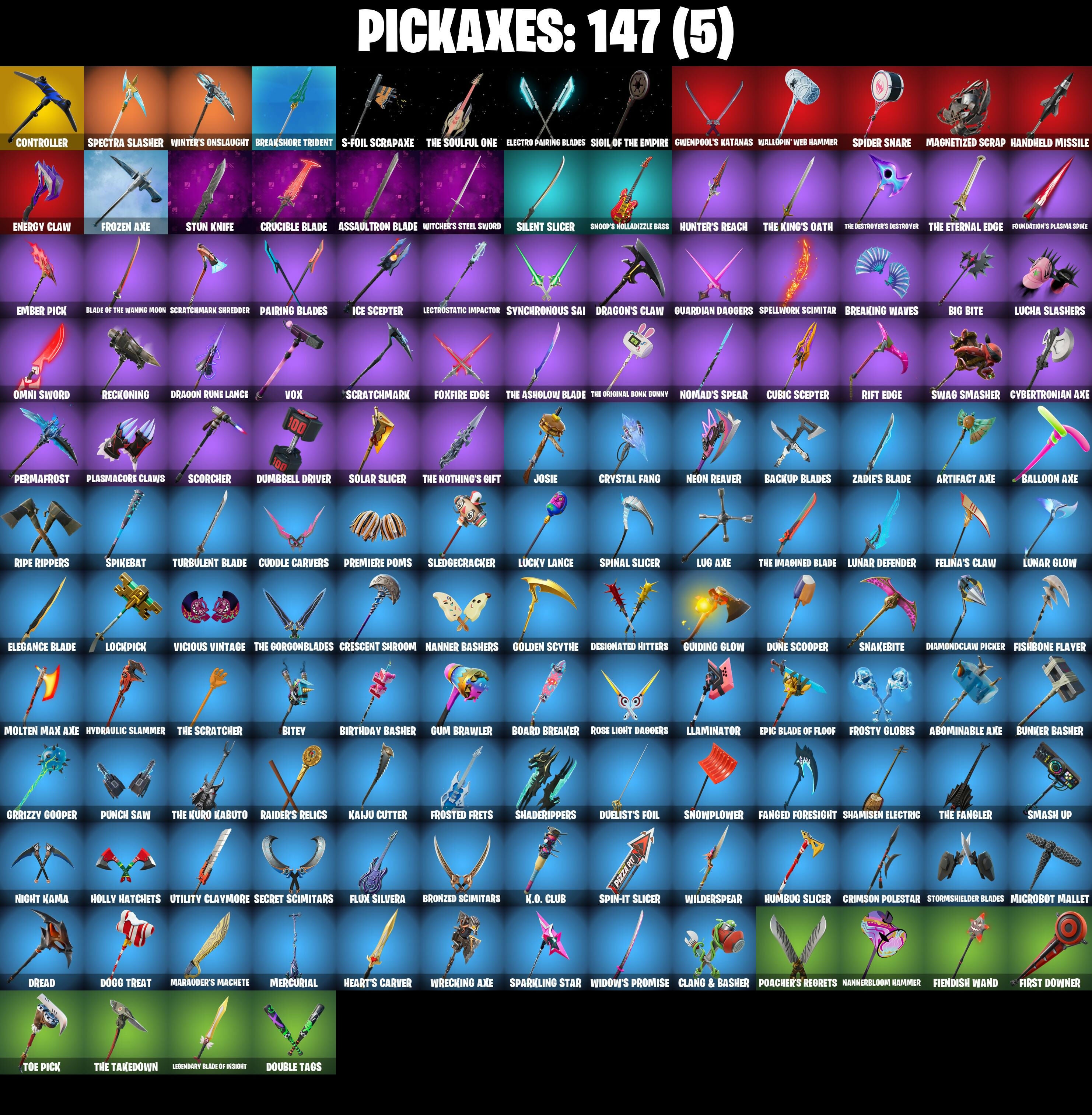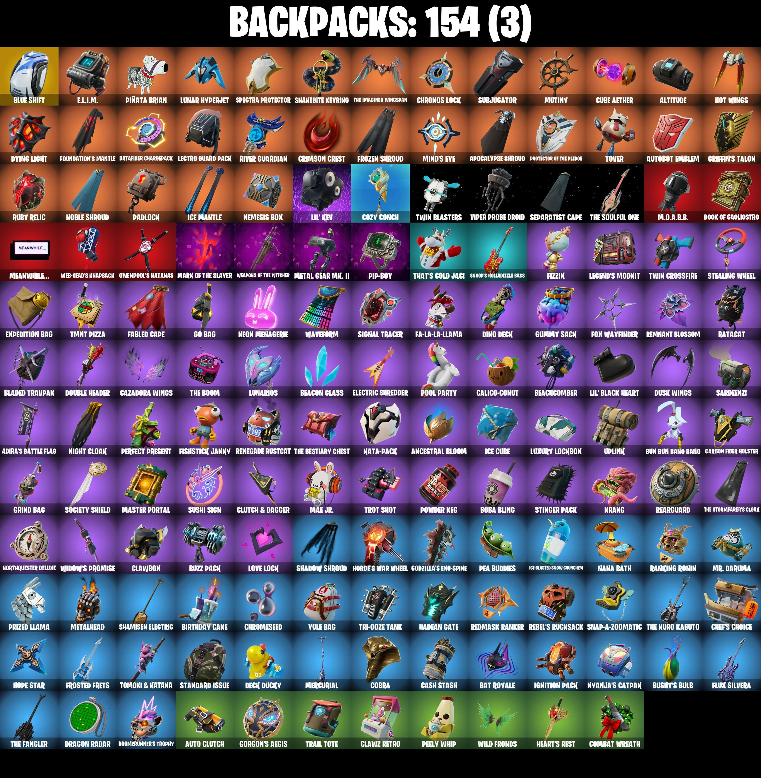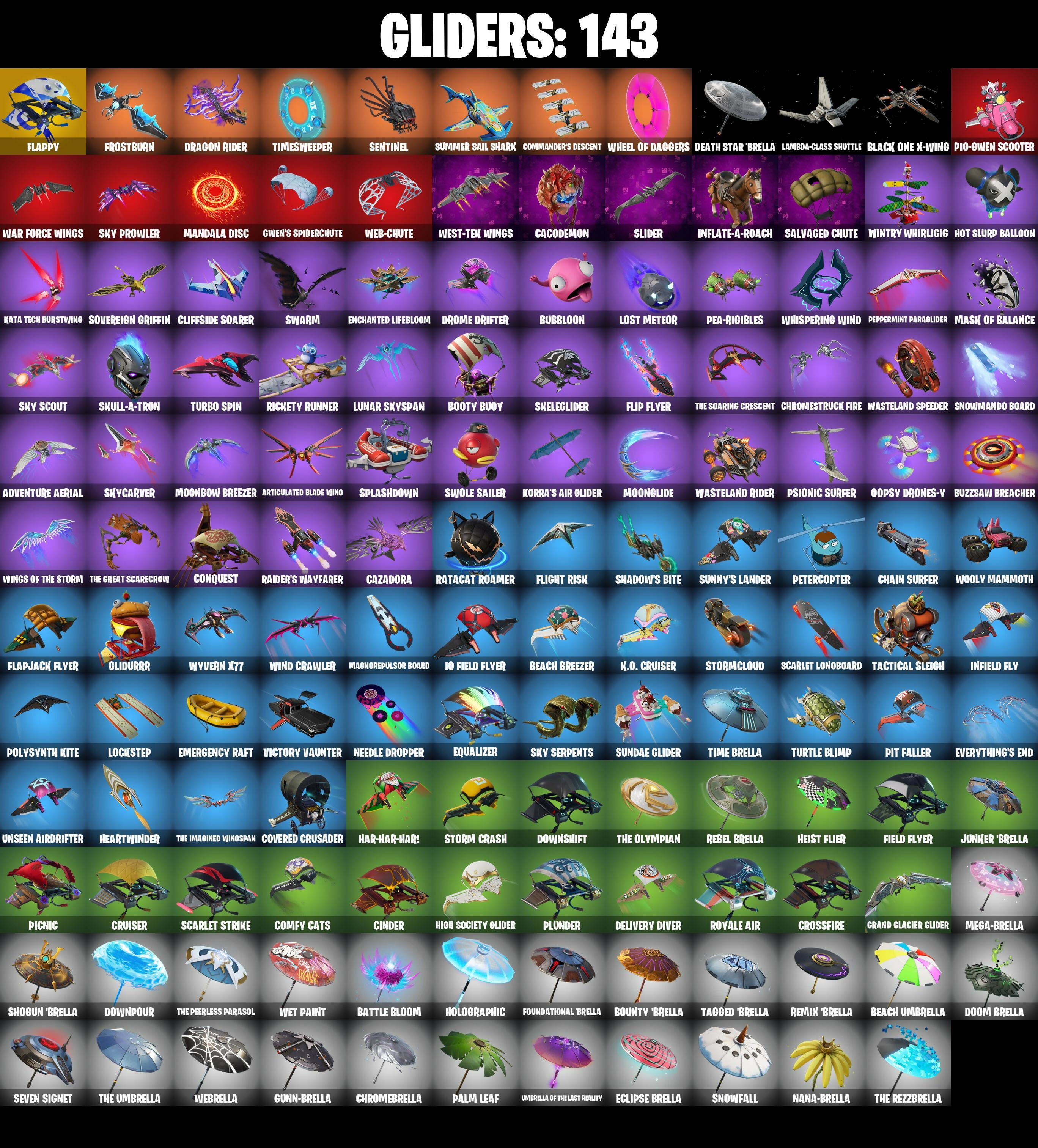 2+2=4, A Goat, A.I.M., Abominable Axe, Adira, Adira (Battle Mask), Adira's Battle Flag, Adventure Aerial, Altitude, Ancestral Bloom, Antonia, Aphrodite, Apocalypse Shroud, Arachnrobatics, Arctic Adeline, Articulated Blade Wing, Artifact Axe, Ascension Nezumi, Assaultron Blade, Astro Armor, Auto Clutch, Autobot Emblem, Avatar's Flourish, Backup Blades, Balance Board, Balanced, Balloon Axe, Bat Royale, Battle Bloom, Beach Breezer, Beach Umbrella, Beachcomber, Beacon Glass, Big Bite, Birthday Basher, Birthday Cake, Bitey, Black One X-Wing, Blackheart, Blackheart (Stage 8), Blade of the Waning Moon, Bladed Travpak, Blowin' Up, Blue Shift, Blue Striker, Board Breaker, Boba Bling, Boba Snack, Book of Caoliostro, Boosting Ki, Booty Buoy, Bounty 'Brella, Breakdown, Breaking Waves, Breakshore Trident, Brite Moves, Brite Raider, Bronzed Scimitars, Bubbloon, Bullpen Brawler Dusty, Bun Bun Bano Bano, Bunker Basher, Bunker Jonesy, Burning Ambition Valeria, Bushy's Bulb, Buzz Pack, Buzzsaw Breacher, Bytes, Bytes (Lone Traveler), Cacodemon, Calamity, Calamity Stage 5, Calculated, Calico-Conut, Called Shot, Carbon Fiber Holster, Card Drop, Cash Stash, Cat Flip, Catalyst, Cauldron Chill, Cazadora, Cazadora Wings, Cerberus, Chain Surfer, Chef's Choice, Chef's Special, Choice Knit, Chrome Punk, Chromebrella, Chromeseed, Chromestruck Fire, Chronos Lock, Cinder, Clang & Basher, Clawbox, Clawz Retro, Clean Sweep, Cliffside Soarer, Clock Strut, Club President Helsie, Clutch & Dagger, Cobra, Codsworth's Cleanup, Combat Wreath, Comfy Cats, Commander's Descent, Conch Call, Conga, Conjure Weapon, Conquest, Controller, Count It!, Covered Crusader, Cozy Conch, Crack It, Crescent Shroom, Crimson Crest, Crimson Polestar, Criss Cross, Crossfire, Crowning Achievement, Crucible Blade, Cruiser, Crystal Fang, Cube Aether, Cubic Scepter, Cuddle Carvers, Cybertronian Axe, Cyclo Curl, DJ Yonder, Dagger Dance, Darth Vader, Datafiber Chargepack, Dawn Duelist Nisha, Death Star 'Brella, Deck Ducky, Delivery Diver, Designated Hitters, Diamond Throne, Diamondclaw Picker, Dice Roll, Dino Deck, Dirtbike Challenge, Do The Split, Doctor Strange, Doctor Strange (Stealth Silver), Dogg Treat, Doom Brella, Doom Slayer, Double Header, Double Tags, Downpour, Downshift, Doze Dab, Dragon Radar, Dragon Rider, Dragon Rune Lance, Dragon Stance, Dragon's Claw, Dramatic Flares, Dread, Drift, Drift Stage 5, Drome Drifter, Dromerunner's Trophy, Duelist's Foil, Dumbbell Driver, Dune Scooper, Dusk, Dusk Wings, Dusty, Dying Light, E.L.I.M., Eclipse Brella, Electric Shredder, Electro Pairing Blades, Elegance Blade, Ember, Ember Pick, Emergency Raft, Enchanted Lifebloom, Energy Claw, Enforcer, Epic Blade of Floof, Equalizer, Era, Erisa, Erisa (Stealth Silver), Everybody Loves Me, Everything's End, Evie, Evie (Summer Strider), Expedition Bag, Expressionism, Fa-la-la-llama, Fable, Fabled Cape, Fancy Peter Griffin, Fang Dance, Fanged Foresight, Felina, Felina's Claw, Field Flyer, Fiendish Wand, Fire Show, First Downer, Fish Thicc, Fishbone Flayer, Fishstick Janky, Fist Bump, Fizzix, Flaky Feast, Flamenco, Flapjack Flyer, Flappy, Flashback Breakdown, Flight Risk, Flip Flyer, Flippin' Away, Flux Silvera, Foil Flex, Foundation's Mantle, Foundation's Plasma Spike, Foundational Brella, Fox Wayfinder, Foxfire Edge, Free Flow, Frostburn, Frosted Frets, Frosty Globes, Frozen Axe, Frozen Shroud, Gentleman's Dab, Geralt Of Rivia, Get Funky, Get Griddy, Get Out Of Your Mind, Giddy-Up, Glidurr, Go Bag, Godzilla's Exo-Spine, Golden Scythe, Golf Clap, Gorgon's Aegis, Grand Glacier Glider, Griffin's Talon, Grind Bag, Grizzy Gooper, Grriz, Guardian Daggers, Guiding Glow, Gum Brawler, Gumbo, Gumbo (Sour), Gummy Sack, Gunn-Brella, Gunnar, Gwen's Spiderchute, Gwen-Step, Gwenpool, Gwenpool's Katanas, Hadean Gate, Handheld Missile, Har-Har-Har!, Harbinger Armor Omegarok, Harlowe, Harlowe (Helmet), Haven, Haven (Tropical Chirper), Heart's Carver, Heart's Rest, Heartwinder, Heist Flier, Hello Friend, Helsie, High Society Glider, Highwire, Holly Hatchets, Holographic, Hope, Hope Star, Horde's War Wheel, Hot Marat, Hot Slurp Balloon, Hot Wings, Humbug Slicer, Hunter's Reach, Huntress, Hybrid, Hybrid (Stage 4), Hydraulic Slammer, Hypnot-Eyes, I Need You To Concentrate, I'm A Mystery, IO Field Flyer, Ice Cube, Ice King (Gold), Ice Mantle, Ice Scepter, Ice-Blasted Snow Crunchem, Iconic Era, Igni Sign, Ignition Pack, Imani, Imperial March, Indiana Jones, Infield Fly, Inflate-A-Roach, It Is Finished, It's Go Time!, It's... You?, Jet Signals, Josie, Jump Jets, Junker 'Brella, K.O. Club, K.O. Cruiser, Kaiju Cutter, Kata Tech Burstwing, Kata-Pack, Khaby Lame, Kiara K.O., Kiara K.O. (Captain's Bomber), Knife Sharpener, Korra, Korra's Air Glider, Krang, Krisabelle, Lambda-Class Shuttle, Laser Focused, Laugh It Up, Lectro Guard Pack, Lectrostatic Impactor, Legend's Modkit, Legendary Blade of Insight, Lennox Rose, Lil Split, Lil' Black Heart, Lil' Kev, Lil' Longboat, Lil' Monster, Lil' Prancer, Lil' T-6 Shuttle, Llama Bell, Llaminator, Lock It Up, Lockpick, Lockstep, Lorenzo, Lost Meteor, Love It!, Love Lock, Lt. John Llama, Lucha Slashers, Lucky Lance, Lug Axe, Lunar Charge, Lunar Defender, Lunar Glow, Lunar Hyperjet, Lunar Party, Lunar Skyspan, Lunarios, Luxury Lockbox, Lynx, Lynx (Stage 4 - No Ponytail), M.O.A.B.B., Mae, Mae Jr., Magnetized Scrap, Magnorepulsor Board, Make A Seat, Malik, Malik (Solitary Defender), Mandala Disc, Marauder's Machete, Mariposa, Mark of the Slayer, Mask of Balance, Massai, Master Key, Master Portal, Meanwhile..., Medusa, Mega-Brella, Meow Skulls, Mercurial, Metal Gear Mk. II, Metalhead, Mic Drop, Microbot Mallet, Mind's Eye, Mini Dogfight, Mini Slayer Fistbump, Mizuki, Molten Max Axe, Montague, Moonbow Breezer, Moonglide, Mr. Daruma, Mutiny, Mwahaha, Mystica, Nailed It, Nana Bath, Nana Nana, Nana-Brella, Nanner Bashers, Nannerbloom Hammer, Needle Dropper, Nemesis Box, Neon Menagerie, Neon Reaver, Nezumi, Night Cloak, Night Kama, Nightshade, Ninja Stance: Donnie, 