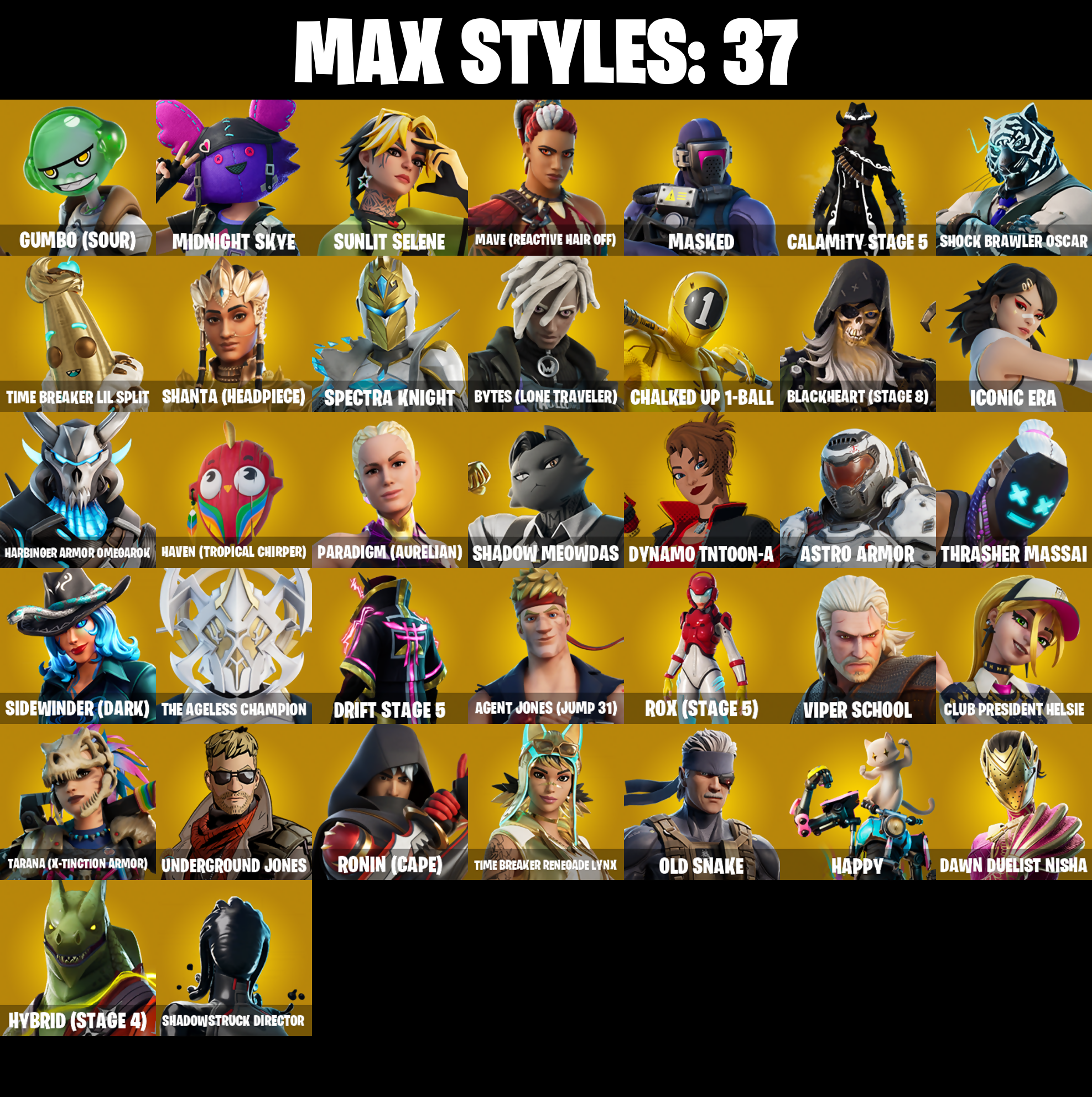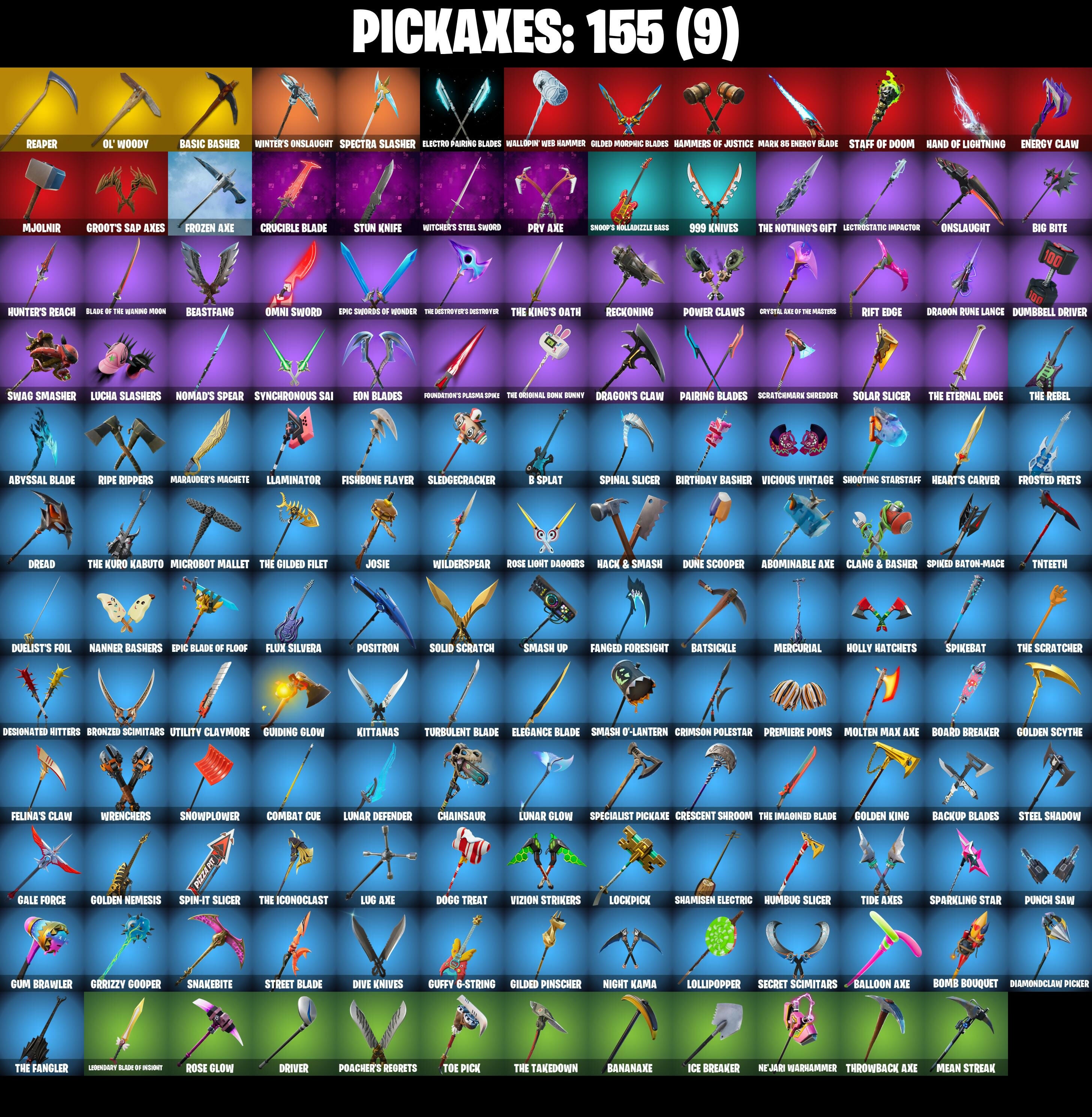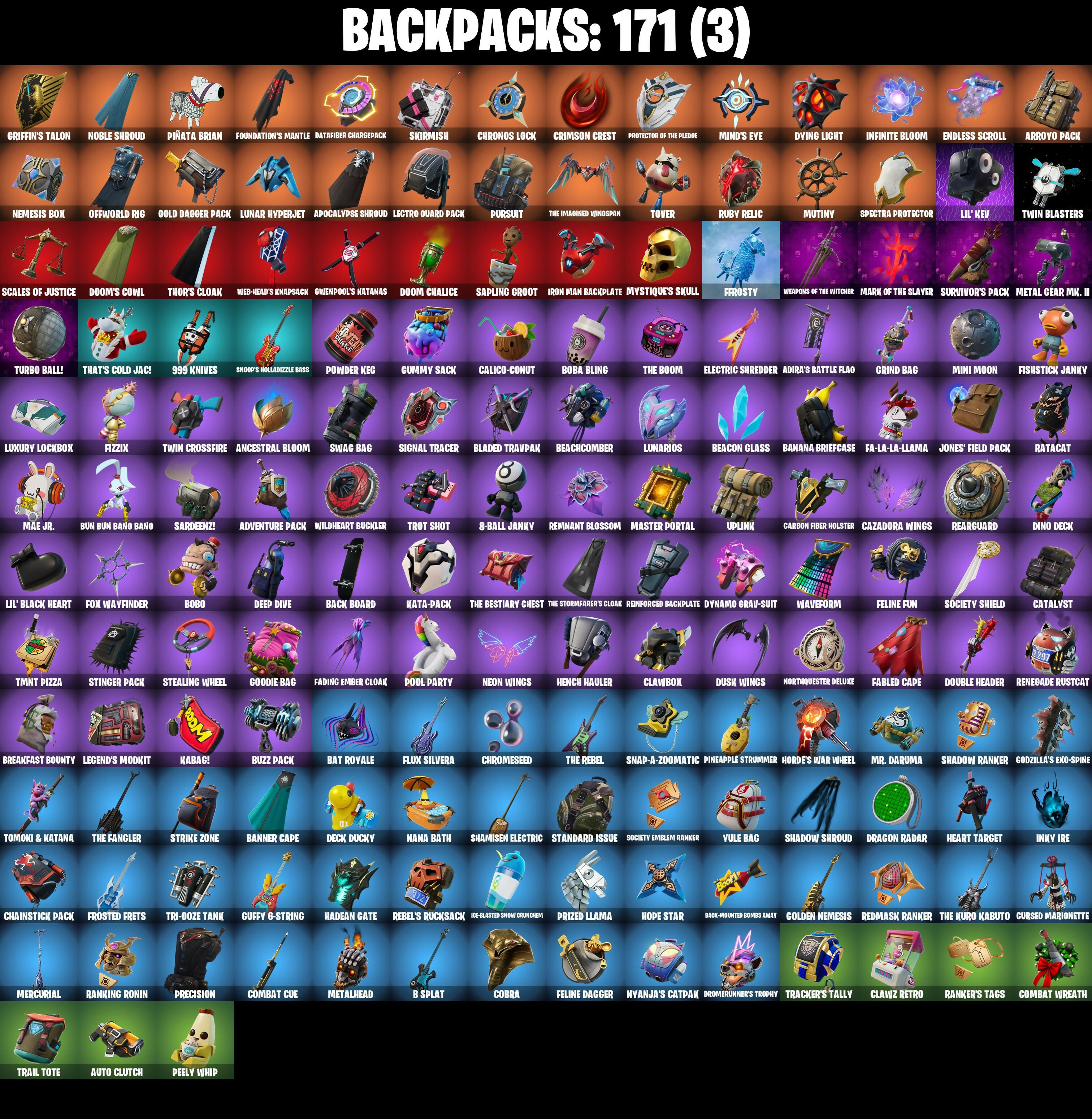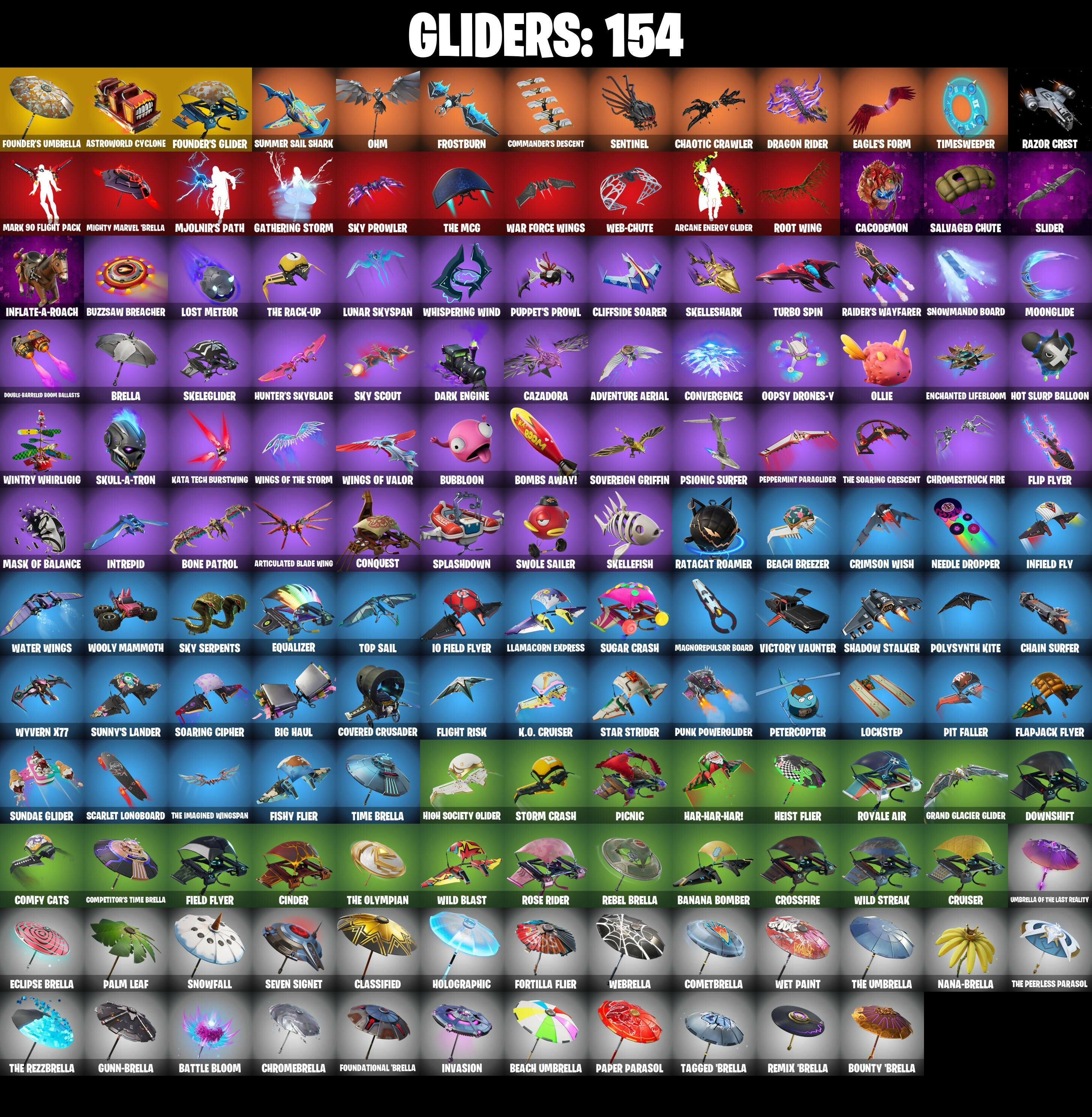 1-Ball, 10 Field Flyer, 8-Ball Janky, 999 Knives, Abominable Axe, Absenz, Abyssal Blade, Adira, Adira's Battle Flag, Adventure Aerial, Adventure Pack, Agent Jones, Agent Jones (Jump 31), Agent Peely, Air Horn, Air Shredder, Ancestral Bloom, Apocalypse Shroud, Arcane Energy Glider, Arctic Adeline, Arroyo Pack, Articulated Blade Wing, Astro Armor, Astroworld Cyclone, Aura, Auto Clutch, B Splat, Back Board, Back-Mounted Bombs Away!, Backup Blades, Balance Board, Balloon Axe, Banana Bomber, Banana Briefcase, Bananaxe, Banner Cape, Basic Basher, Bat Royale, Batsickle, Battle Bloom, Battlehawk, Beach Breezer, Beach Umbrella, Beachcomber, Beacon Glass, Beastfang, Beep Beep, Big Bite, Big Haul, Birthday Basher, Blackheart, Blackheart (Stage 8), Blade of the Waning Moon, Bladed Travpak, Blowin' Up, Board Breaker, Boba Bling, Boba Snack, Bobo, Bomb Bouquet, Bombs Away!, Bone Patrol, Boneless, Boogie Down, Boomin', Bounty 'Brella, Breakfast Bounty, Brella, Bring It Around, Bronzed Scimitars, Brutus, Bubloon, Buckets, Bun Bun Bano Bang, Bunker Jonesy, Buzz Pack, Buzzsaw Breacher, Bytes, Bytes (Lone Traveler), Cacodemon, Calamity, Calamity Stage 5, Calculated, Calico-Conut, Call Me, Called Shot, Carbide, Carbon Fiber Holster, Cardistry, Catalyst, Cazadora, Cazadora Wings, Chain Surfer, Chainsaur, Chainstick Pack, Chalked Up 1-Ball, Chaos Director, Chaotic Crawler, Choice Knit, Chrome Punk, Chromebrella, Chromeseed, Chromestruck Fire, Chronos Lock, Cinder, Clang & Basher, Classified, Clawbox, Clawz Retro, Clean Sweep, Cliffside Soarer, Club President Helsie, Cluck Strut, Cobalt, Cobra, Coin Flip, Combat Cue, Combat Wreath, Cometbrella, Comfy Cats, Commander's Descent, Competitor's Time Brella, Conga, Conquest, Convergence, Count It!, Covered Crusader, Crescent Shroom, Crimson Crest, Crimson Polestar, Crimson Wish, Crossfire, Crowning Achievement, Crucible Blade, Cruiser, Crystal Axe of the Masters, Cursed Marionette, Dark Engine, Datafiber Chargepack, Dawn Duelist Nisha, Deadpool, Deck Ducky, Deep Dab, Deep Dive, Designated Hitters, Diamond Throne, Diamondclaw Picker, Dice Roll, Dino Deck, Dive Knives, Dj Yonder, Do The 'Split, Doctor Doom, Dogg Treat, Doom Chalice, Doom Slayer, Doom's Cowl, Double Header, Double-Barreled Doom Ballasts, Downshift, Doze Dab, Dragon Radar, Dragon Rider, Dragon Rune Lance, Dragon Stance, Dragon's Claw, Dramatic Flares, Dread, Drift, Drift Stage 5, Driver, Dromerunner's Trophy, Duelist's Foil, Dumbbell Driver, Dune Scooper, Dusk, Dusk Wings, Dusty, Dying Light, Dynamo Grav-Suit, Dynamo Tntina, Dynamo Tntoon-A, Eagle's Form, Eclipse Brella, Electric Shredder, Electro Pairing Blades, Elegance Blade, Enchanted Lifebloom, Endless Scroll, Energy Claw, Eon Blades, Epic Blade of Floof, Epic Swords of Wonder, Equalizer, Era, Evasive Maneuvers, Evie, Expressionism, Fa-La-La-Llama, Fable, Fabled Cape, Fade, Fading Ember Cloak, Fancy Feet, Fang Dance, Fanged Foresight, Felina, Felina's Claw, Feline Dagger, Feline Fun, Ffrosty, Field Flyer, Fish Thicc, Fishbone Flayer, Fishstick Janky, Fishy Flier, Fist Bump, Fizzix, Flaky Feast, Flapjack Flyer, Flashback Breakdown, Flight Risk, Flip Flyer, Flippin' Away, Flippin' Sexy, Flux Silvera, Foil Flex, Fortilla Flier, Foundation's Mantle, Foundation's Plasma Spike, Foundational Brella, Founder's Glider, Founder's Umbrella, Fox Wayfinder, Frostburn, Frosted Frets, Frozen Axe, Gale Force, Gathering Storm, Gear Specialist Maya, Gentleman's Dab, Geralt Of Rivia, Get Out Of Your Mind, Giddy-Up, Gilded Morphic Blades, Gilded Pinscher, Godzilla's Exo-Spine, Gold Dagger Pack, Golden King, Golden Nemesis, Golden Scythe, Golf Clap, Goodie Bag, Grand Glacier Glider, Griffin's Talon, Grind Bag, Grizzy Gooper, Groot, Groot's Sap Axes, Groove Jam, Grriz, Guffy 6-String, Guffy G-String, Guiding Glow, Gum Brawler, Gumbo, Gumbo (Sour), Gummy Sack, Gunn-Brella, Gunnar, Gwenpool's Katanas, Hack & Smash, Hadean Gate, Hammers of Justice, Hand of Lightning, Happy, Har-Har-Har!, Harbinger Armor Omega Rok, Harlowe, Have A Seat, Haven, Haven (Tropical Chirper), Hayseed, Heart Sign, Heart Target, Heart's Carver, Heart-Stopper, Heist Flier, Hello Friend, Helsie, Hench Hauler, High Society Glider, Holly Hatchets, Holographic, Hope, Hope Star, Horde's War Wheel, Hot Slurp Balloon, Humbug Slicer, Hunter's Reach, Hunter's Skyblade, Huntress, Hybrid, Hybrid (Stage 4), Hype, Hypnot-Eyes, I'm A Mystery, Ice Breaker, Ice-Blasted Snow Cruncher, Iconic Era, Igni Sign, Imani, Infield Fly, Infinite Bloom, Inflate-A-Roach, Inky Ire, Intrepid, Invasion, Iron Man Backplate, It's Go Time!, It's... You?, Jennifer Walters, Jet Signals, Jones' Field Pack, Josie, Jules, K.O. Cruiser, Kabag!, Kata Tech Burstwing, Kata-Pack, Keyed Up, Kit, Kittanas, Krisabelle, Laguna, Lara Croft, Laser Focused, Laugh It Up, Lectro Guard Pack, Lectrostatic Impactor, Legend's Modkit, Legendary Blade of Insight, Lennox Rose, Lil Split, Lil' Black Heart, Lil' Kev, Lil' Longboat, Lil' Monster, Lil' Prancer, Lil' T-6 Shuttle, Llamacorn Express, Llaminator, Lock It Up, Lockpick, Lockstep, Lollipopper, Lorenzo, Lost Meteor, Love It!, Lt. John Llama, Lucha Slashers, Lug Axe, Lunar Charge, Lunar Defender, Lunar Glow, Lunar Hyperjet, Lunar Party, Lunar Skyspan, Lunarios, Luxury Lockbox, Mae, Mae Jr., Magnorepulsor Board, Make A Seat, Mancake, Mandalorian, Marauder's Machete, Mariposa, Mark 85 Energy Blade, Mark 90 Flight Pack, Mark Of The Slayer, Mask of Balance, Masked, Massai, Master Portal, Mave, Mave (Reactive Hair Off), Mean Streak, Meow Skulls, Meowidas, Meowscles, Mercurial, Metal Gear Mk. II, Metalhead, Mic Drop, Microbot Mallet, Midas, Midnight Skye, Mighty Marvel 'brella, Mind's Eye, Mini Moon, Mini Slayer Fistbump, Mjolnir, Mjolnir's Path, Molten Max Axe, Montague, Moonglide, Mr. Daruma, Mutiny, Mwahaha, Mystique, Mystique's Skull, Nailed It, Nana Bath, Nana Nana, Nana-Brella, Nanner Bashers, Ne'Jari Warhammer, Needle Dropper, Nemesis Box, Neon Wings, Nezumi, Night Kama, Ninja Stance: Donnie, Ninja Stance