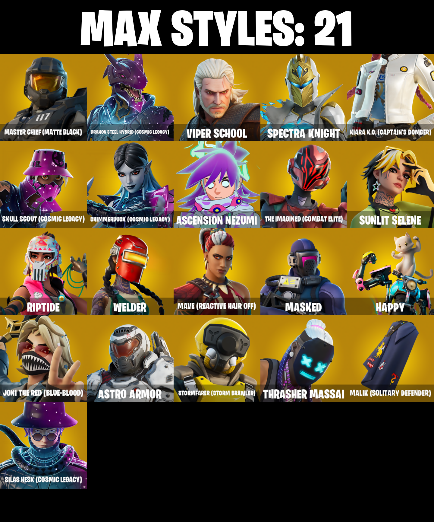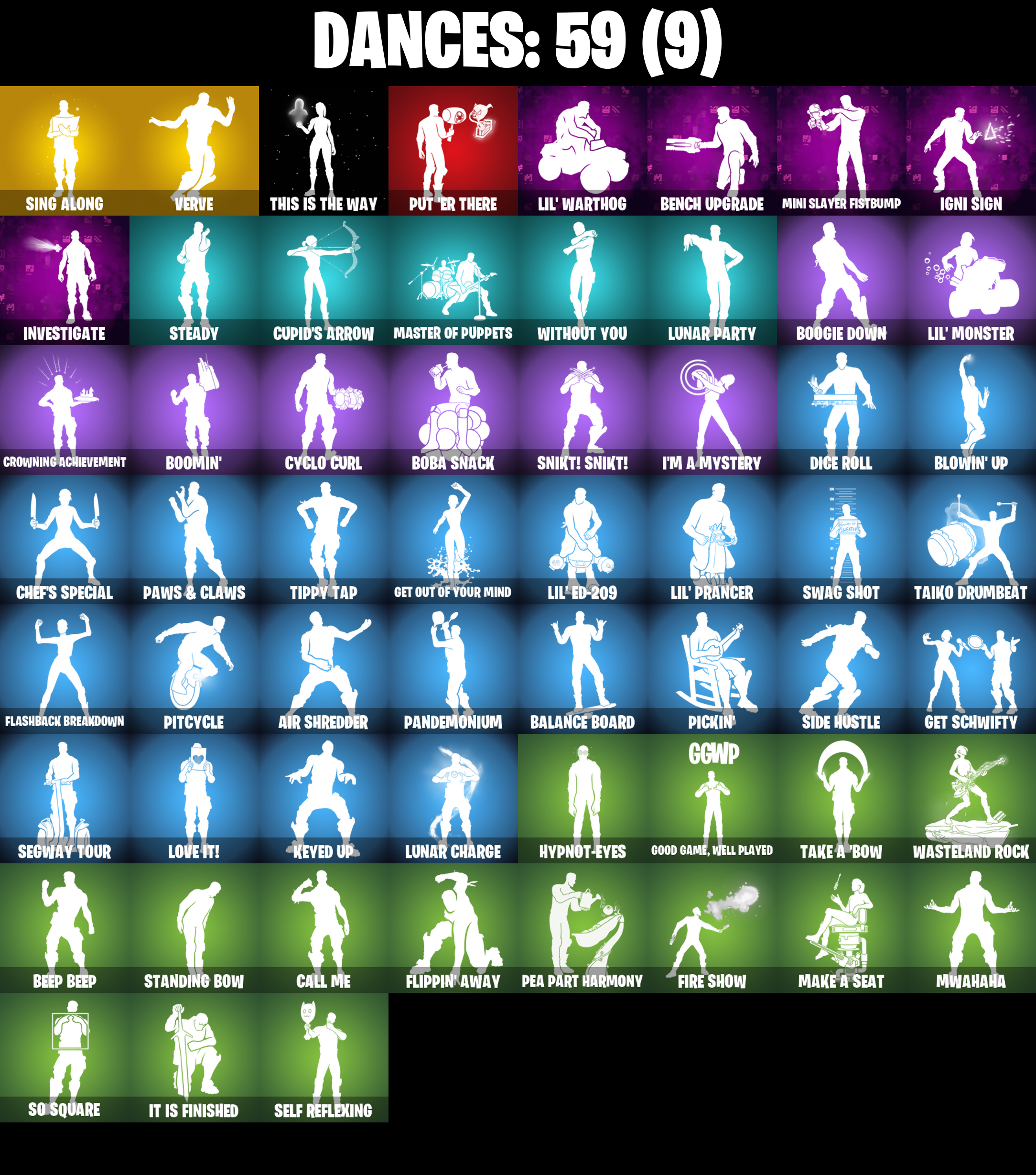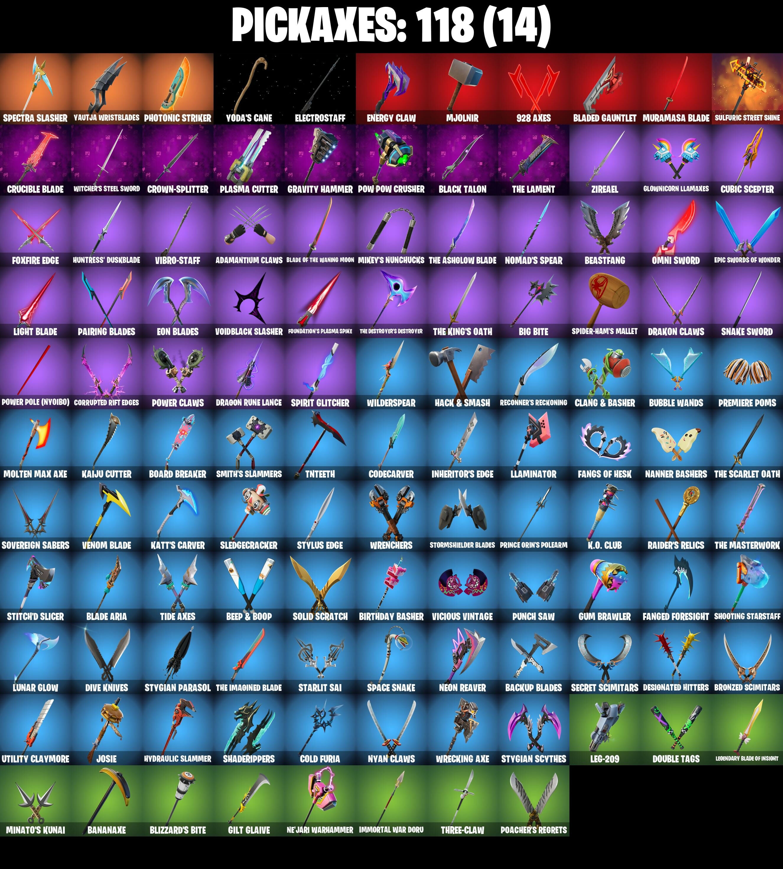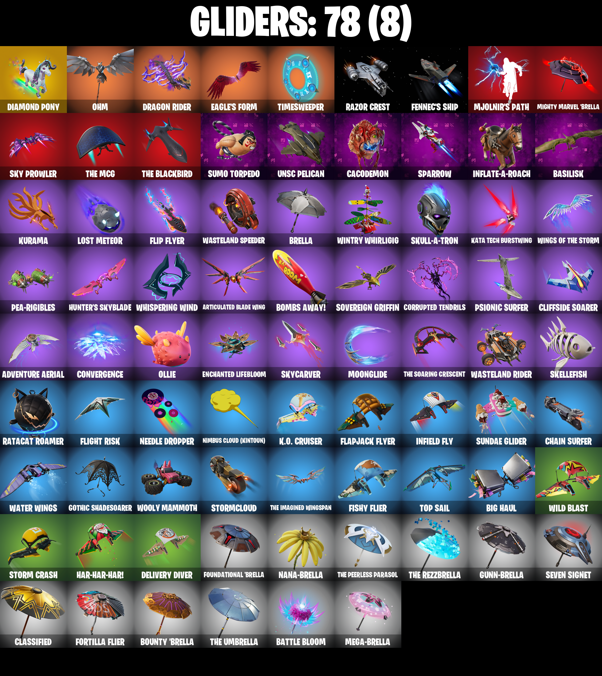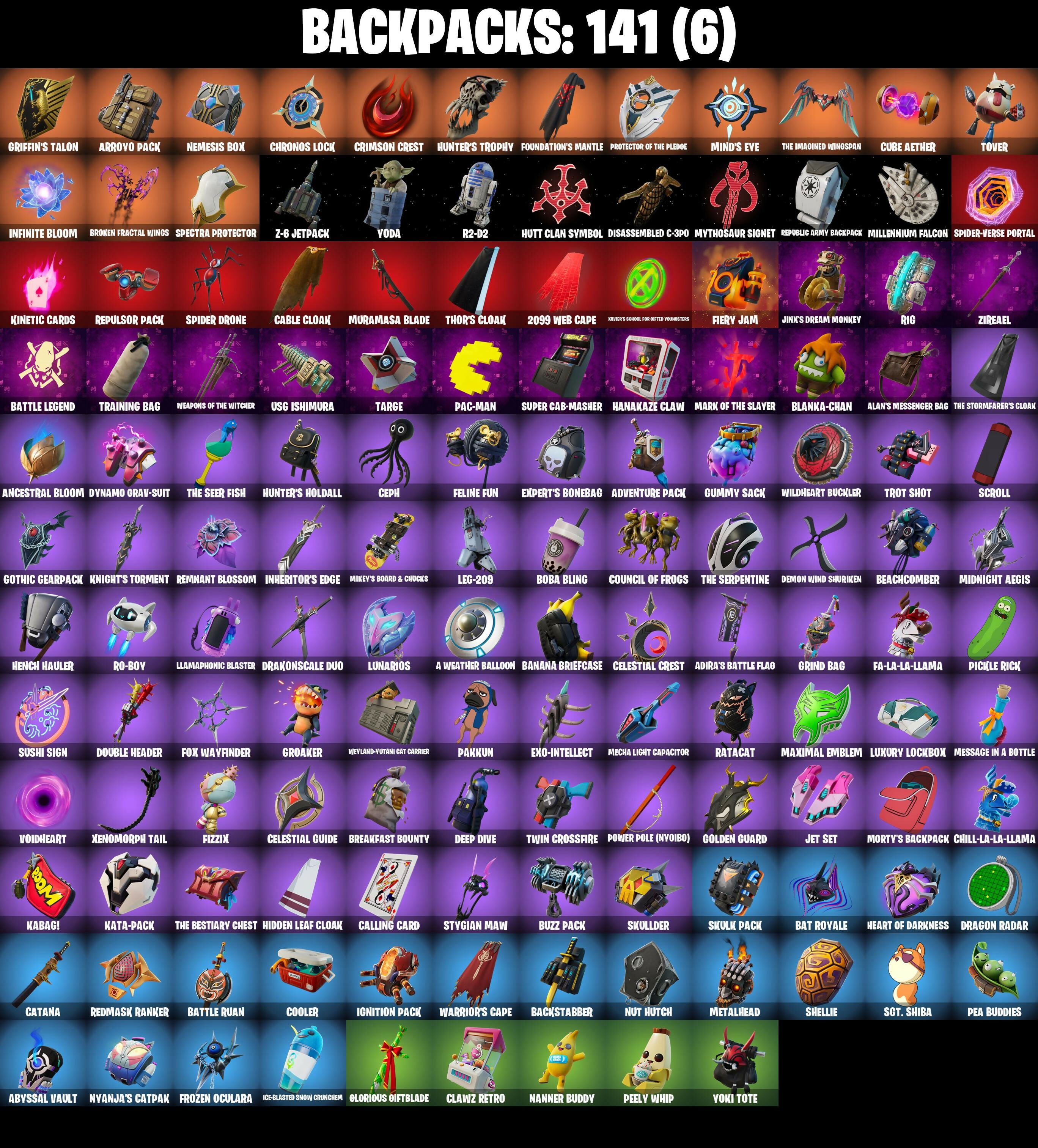 2099 Web Cape, 212th Battalion Trooper, 501st Trooper, 928 Axes, A Weather Balloon, Abyssal Vault, Adamantium Claws, Adira, Adira's Battle Flag, Adventure Aerial, Adventure Pack, Agent Peely, Ahsoka Tano, Air Shredder, Alan Wake, Alan's Messenger Bag, Ancestral Bloom, Arcane Jinx, Ares, Arroyo Pack, Articulated Blade Wing, Ascension Nezumi, Astrea, Astro Armor, Azuki, Backstabber, Backup Blades, Balance Board, Banana Briefcase, Bananaxe, Basilisk, Bat Royale, Battle Bloom, Battle Legend, Battle Ruan, Beachcomber, Beastfang, Beep & Boop, Beep Beep, Beerus, Bench Upgrade, Big Bite, Big Haul, Big Mouth, Bigfoot, Birthday Basher, Black Talon, Blade Aria, Blade of the Waning Moon, Bladed Gauntlet, Blanka, Blanka-Chan, Blizzard's Bite, Blowin' Up, Board Breaker, Boba Bling, Boba Fett, Boba Snack, Bombs Away!, Boogie Down, Boomin', Bounty 'Brella, Breakfast Bounty, Breezabelle, Brella, Broken Fractal Wings, Bronzed Scimitars, Brutus, Bubble Wands, Buzz Pack, Cable, Cable Cloak, Cacodemon, Call Me, Calling Card, Catana, Celestial Crest, Celestial Guide, Ceph, Cerberus, Chain Surfer, Charlotte, Chef's Special, Chewbacca, Chill-La-La-Llama, Chronos Lock, Chun-Li, Ciri, Clang & Basher, Classified, Clawz Retro, Cliffside Soarer, Codecarver, Cold Furia, Commander Zavala, Convergence, Cooler, Corrupted Rift Edges, Corrupted Tendrils, Council of Frogs, Crimson Crest, Crown-Splitter, Crowning Achievement, Crucible Blade, Cube Aether, Cubic Scepter, Cupid's Arrow, Cyclo Curl, Dahlia, Deadpool, Deep Dive, Delivery Diver, Demon Wind Shuriken, Designated Hitters, Diamond Pony, Dice Roll, Disassembled C-3PO, Dive Knives, Doom Slayer, Double Header, Double Tags, Dragon Radar, Dragon Rider, Dragoon Rune Lance, Drakon Claws, Drakon Steel Hybrid, Drakon Steel Hybrid (Cosmic Legacy), Drakonscale Duo, Driftwalker, Dusty, Dynamo Grav-Suit, Eagle's Form, Electrostaff, Ellen Ripley, Enchanted Lifebloom, Energy Claw, Eon Blades, Epic Swords of Wonder, Era, Evie, Exo-Intellect, Expert's Bonebag, Fa-La-La-Llama, Fade, Fanged Foresight, Fangs of Hesk, Feline Fun, Fennec Shand, Fennec's Ship, Fiery Jam, Fire Show, Fishy Flier, Fizzix, Flapjack Flyer, Flashback Breakdown, Flight Risk, Flip Flyer, Flippin' Away, Fortilla Flier, Foundation's Mantle, Foundation's Plasma Spike, Foundational 'Brella, Fox Wayfinder, Foxfire Edge, Frozen Ocolara, Gambit, Gear Specialist Maya, Geralt Of Rivia, Get Out Of Your Mind, Get Schwifty, Gildhart, Gilt Glaive, Glorious Giftblade, Glownicorn Llamaxes, Golden Guard, Good Game, Well Played, Gothic Gearpack, Gothic Shadesoarer, Gravity Hammer, Griffin's Talon, Grind Bag, Groaker, Guff Gringle, Gum Brawler, Gumbo, Gummy Sack, Gunn-Brella, Gunnar, Hack & Smash, Han Solo, Hanakaze Claw, Happy, Har-Har-Har!, Haven, Heart of Darkness, Helsie, Hench Hauler, Hidden Leaf Cloak, Hope, Human Bill, Hunter's Holdall, Hunter's Skyblade, Hunter's Trophy, Huntress' Duskblade, Hutt Clan Symbol, Hydraulic Slammer, Hypnot-Eyes, I'm A Mystery, Ice-Blasted Snow Cruncher, Igni Sign, Ignition Pack, Imani, Immortal War Doru, Infield Fly, Infinite Bloom, Inflate-A-Roach, Inheritor's Edge, Investigate, Iron Man Zero, Isaac Clarke, It Is Finished, Jellie, Jet Set, Jing, Jinx's Dream Monkey, Joni The Red, Joni The Red (Blue-Blood), Josie, Jules, K.O. Club, K.O. Cruiser, Kabag!, Kaiju Cutter, Kakashi Hatake, Kata Tech Burstwing, Kata-Pack, Katt, Katt's Carver, Keyed Up, Kiara K.O., Kiara K.O. (Captain's Bomber), Kinetic Cards, Kit, Knight's Torment, Krrsantan, Kurama, Lana Llane, Leg-209, Legendary Blade of Insight, Leia Organa, Light Blade, Lil Split, Lil' ED-209, Lil' Monster, Lil' Prancer, Lil' Warthog, Llamaphonic Blaster, Llaminator, Lost Meteor, Love It!, Loveless, Lt. John Llama, Lunar Charge, Lunar Glow, Lunar Party, Lunarios, Luxury Lockbox, Make A Seat, Malik, Malik (Solitary Defender), Mancake, Mandalorian, Mark of the Slayer, Masked, Massai, Master Chief (Matte Black), Master Of Puppets, Mave, Mave (Reactive Hair Off), Maximal Emblem, Mecha Light Capacitor, Mecha Morty, Mecha Strike Commander, Mecha Team Leader, Mega-Brella, Meowscles, Message in a Bottle, Metalhead, Michelangelo, Midnight Aegis, Mighty Marvel 'Brella, Mikey's Board & Chucks, Mikey's Nunchucks, Millennium Falcon, Minato's Kunai, Mind's Eye, Mini Slayer Fistbump, Mjolnir, Mjolnir's Path, Molten Max Axe, Moonglide, Morty's Backpack, Muramasa Blade, Mwahaha, Mystica, Mythosaur Signet, Nana-Brella, Nanner Bashers, Nanner Buddy, Naruto Uzumaki, Ne'Jari Warhammer, Needle Dropper, Nemesis Box, Neon Reaver, Nezumi, Nimbus Cloud (Kintoun), Nolan Chance, Nomad's Spear, Nut Hutch, Nyan Claws, Nyanja's Catpak, Ocean, Ohm, Ollie, Omega Knight, Omni Sword, Optimus Primal, Oscar, Pac-Man, Pairing Blades, Pakkun, Pandemonium, Paws & Claws, Pea Buddies, Pea Part Harmony, Pea-Rigibles, Peabody, Peely Whip, Persephone, Phaedra, Photonic Striker, Pickin', Pickle Rick, Pitcycle, Plasma Cutter, Poacher's Regrets, Pow Pow Crusher, Power Claws, Power Pole (Nyoibo), Predator, Premiere Poms, Prince Orin, Prince Orin's Polearm, Princess Lexa, Protector of the Pledge, Prowler, Psionic Surfer, Punch Saw, Put 'Er There, R2-D2, Raider's Relics, Ratacat, Ratacat Roamer, Razor Crest, Reconner's Reckoning, Redmask Ranker, Reese, Remnant Blossom, Renzo The Destroyer, Republic Army Backpack, Repulsor Pack, Rift Knight Kieran, Rig, Riptide, Ro-Boy, Robocop, Rogue, Ronin, Rust, Ryu, Sakura, Sakura Haruno, Sasuke Uchiha, Scroll, Scuba Jonesy, Secret Scimitars, Segway Tour, Selene, Self Reflexing, Seven Signet, Sgt. Shiba, Shaderippers, Shanta, Shellie, Shimmerdusk, Shimmerdusk (Cosmic Legacy), Shooting Starstaff, Side Hustle, Silas Hesk (Cosmic Legacy), Silas Heski, Sing Along, Skellefish, Skulk Pack, Skull Scout, Skull Scout (Cosmic Legacy), Skull-A-Tron, Skullder, Sky Prowler, Skycarver, Sledgecracker, Smith's Slammers, Snake Sword, Snap, Snikt! Snikt!, So Square, Solid Scratch, Son Goku, Sovereign Griffin, Sovereign Sabers, Space Snake, Sparrow, Spectra Knight, Spectra Protecto
