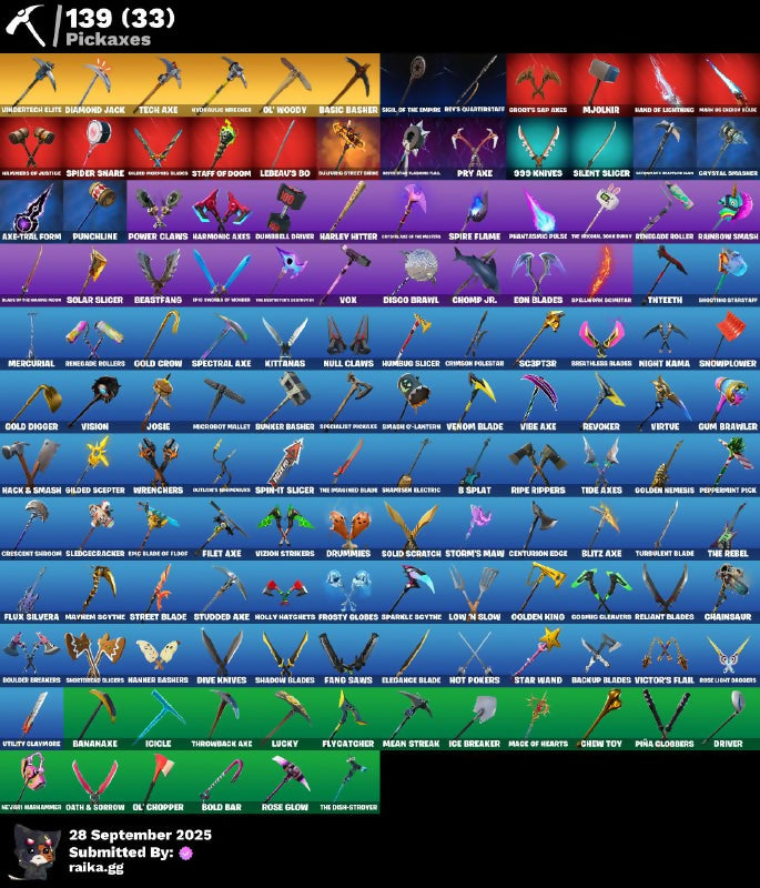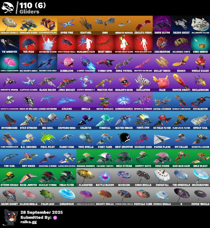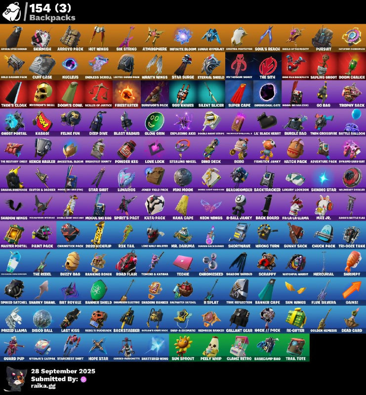 2020 Kickflip, 8 Splat, 8-Ball Janky, 999 Knives, A Warrior Prepares, Adventure Pack, Agent Jones, Agent Peely, Ancestral Bloom, Antonia, Apocalypse Ghouled, Arcana, Arcane Energy Glider, Arctic Adeline, Arroyo Pack, Aspen, Assault Trooper, Astra, Astroworld Cyclone, Atmosphere, Aub Shredder, Aura, Axe-tral Form, B Splat, B.R.U.T.E. Gunner, Back Board, Backlash, Backstabber, Backtracker, Backup Blades, Banana Bomber, Banana Briefcase, Bananaxe, Banner Cape, Banner Shield, Base Jumper, Basecamp Bag, Basic Basher, Bat Royale, Battle Balloon, Battle Bloom, Beachcomber, Bean Bag, Beastfang, Beatzbunny, Beeble's Rucksack, Beep Beep, Bhangra Boogie, Big Haul, Billy Bounce, Birdie, Blade Raven, Blades Of The Banana Hood, Blast Radius, Blaze, Blitz Axe, Blizzabelle, Bobo, Bold Bar, Bombs Away!, Bone Patrol, Boomin', Bootsin' Cats, Boulder Breakers, Bounceberry, Bounty 'Brella, Boxy, Breakfast Bounty, Breakneck, Breathless Blades, Brella, Brite Bomber, Bubbloon, Buckle Up, Bullet Rider, Bunker Basher, Bunker Jonesy, Bunny's Lander, Burgle Bag, Bushranger, Buzzy Bag, Cacodemon, Call Me, Cap Kick, Cardistry, Catalyst, Celestia, Centurion, Centurion Edge, Ceremonial Axe Of Nenritos, Chainsaur, Chainstick Pack, Chaos Double Agent, Chew Toy, Chicken Wing It, Chiigusa, Choiceknit, Chomp Jr., Chopper, Chrome Punk, Chromeseed, Chuck Pack, Classified, Clawz Retro, Clean Sweep, Cliffside Soarer, Cloaked Shadow, Cluck, Cluck 'n Strut, Clutch & Dagger, Coin Flip, Comet Crasher, Comfy Cats, Convergence, Coral Cruiser, Cozy Chomps, Cozy Jonesy, Crack It, Crescent Shadow, Crimson Polestar, Crimson Wish, Crustina, Crystal Smasher, Cuddly Cloudcruiser, Cuff Case, Cursed Marionette, Cycle Curl, Dab Stand, Dagger Dance, Dark Bomber, Dark Glyph, Dead Card, Deadpool, Dealer's Deck, Deep Dive, Diamond Hanz, Diamond Jack, Dice Roll, Dimensional Gate, Dino Deck, Disco Ball, Disco Brawl, Disco Diva, Dive Knives, Doctor Doom, Doom Chalice, Doom's Cowl, Double Agent Stripe, Double Up, Douga Agent Rush, Downpour, Doze Dab, Dream, Drip Dropper, Driver, Drummies, Dumbbell Driver, Dummy, Dyed Breeze, Dynamo, Dynamo Grab Suit, Eagle's Form, Echo, Eclipse Brella, Eggar, Electro Swing, Elegance Blade, End Zone Expert, Endless Scroll, Enigmic Manoeuvres, Eon Blades, Epic Blade Of Flood, Epic Swords Of Wonder, Equalizer, Eternal Knight, Eternal Shield, Eternal Voyager, Everybody Loves Me, Exploding Axis, Fa-La-La-Llama, Face Palm, Fade, Fang Saws, Featherweight, Feelin' Jaunty, Feline Fun, Fennec Shand, Field Flyer, Filet Axe, Firestarter, Fish Thicc, Fishstick, Fishstick Janky, Fishy Flier, Fist Bump, Flaky Feast, Flapjack Flyer, Flight Risk, Flippin' Away, Flowing Bubbles, Flux Silvera, Flycatcher, Focus, Focused, Forgotten Tal 'Brella, Fortilla Flier, Founder's Umbrella, Founders Glider, Freemix, Frosty Globes, Gagnam Style, Gains!, Galaxy Scout, Gallant Gear, Gathering Storm, Get Loose, Ghost Portal, Ghost's Cloudglider, Gilded Harpsich Blades, Gilded Scepter, Glow Grin, Go Bag, Go Mufasa, Godrig Cleavers, Gold Brutus, Gold Crow, Gold Dagger Pack, Gold Digger, Gold Midas, Golden King, Golden Nemesis, Golf Clap, Graph-G-Lantern, Grenade, Groot, Groot's Sap Axes, Ground Pound, Guard Pup, Gum Brawler, Gunn-Brella, Gunny Sack, H4CK // P4CK, Hack & Smash, Hammer Bashers, Hammers Of Justice, Hand Of Lightning, Har-Har-Har!, Harley Hitter, Harley Quinn, Harmonic Axes, Hatch Pack, Have a Seat, Hello Friend, Hench Hauler, Holly Hatchets, Holographic, Hope Star, Hot Pokers, Hot Wings, Humbug Slicer, Hunter's Sky Blade, Hydraulic Wrench, Hyperboard, I Declare, IQ Field Flyer, Ice Breaker, Icicle, Imperial March, Infectious, Infinite Bloom, Infinite Dab, Invasion, Iron Man Backplate, Isabelle, Iso, It Is Finished, It's Good!, It's... You?, James Battle Flag, Jay Walking, Jazz Hands, Jennifer Walters, Jones' Field Pack, Josie, Jubilation, Jules, Jumbo Popcorn, Jump Jets, Jumping Jacks, Junk Bucket, K.O. Cruiser, Kabagg, Kado Thorne, Kata-Pack, Keyed Up, Khaby Lame, King Wings, Kit, Kittanas, Kondor, Krisabelle, Lara Croft, Last Kiss, Laugh It Up, Lazer Blast, LeBeau's Bo, Leave The Door Open, Lectro Guard Pack, Lexa, Lightning Samurai King, Lil Diplo Slogues, Lil T-G Shuttle, Lil' Black Heart, Lil' Octane, Lil' Prancer, Llama Bell, Llama/Loom Express, Lone Wolf Holster, Look It Up, Love It!, Love Lock, Low 'N Slow, Lt. Evergreen, Lucky, Lunar Hyperjet, Lunar Skyspan, Lunarios, Luxury Lockbox, Mace Of Hearts, Mae, Mae Jr., Make a Seat, Maker Softflame Pack, Mami Master, Mancake, Mandalorian, Manic, Marin OG Cozy Bear, Mashed Potato, Mask of Balance, Master Mix, Master Portal, Maven, Mayhem Scythe, Mean Streak, Mechboot Mallet, Mega, Megavipes Venom, Megumi, Menaace, Mercurial, Mighty Marauder Stella, Millennium Falcon, Mini Moon, Mjolnir, Mjolnir's Path, Mocha Ski Bag (C2L), Mocha Ski Bag (C3L), Mocha Ski Bag (C4L), Modding Kalimba Mal, Mogul Master, Mogul Master Coal, Mogul Master Dusk, Mogul Ski Bag, Moon Knee Walker, Mr. Daruma, Mystique, Mystique's Skull, Mythosaur SigNet, Nailed It, Nana Cape, Ne'Var Marshamper, Neon Wings, Never Gonna, Newsclues, Neymar Jr, Night Mama, Nolan Chance, Nucleus, Null Claws, Nyanjas Catpak, Oath & Sorrow, Ocean, Oga Specialist Maya, Ohm, Ol' Chopper, Ol' Woody, Ollie, Oopsy Drones-V, Out West, Outlaw's Renegade Rock, Outlaw's Spanners, Paddle Royale, Paint Pack, Palm Leaf, Pandemonium, Paper Plane, Party Whips, Paws & Claws, Peacelout, Peekaboo, Peely Whip, Peppermint Pick, Phantasmic Pulse, Pheonix, Phone It In, Pina Clobbers, Piper Pace, Pit Faller, Pitch Patroller, Pitcycle, Pixel Pilot, Pizza Party, Planetary Vibe, Point & Shoot, Poised Playmaker, Poki, Polar Peely, Potris Playmaker, Powder Keg, Power Chord, Power Claws, Prized Llama, Pry Axe, Pull Up, Pulse, Punchline, Punk Powerglider, Puppets Prowl, Pursuit, Push You Down, Quvarq Street Game, R3X Tail, Rage Quit, Rainbow Smash, Raise the Roof, Ranking Ronin, Rapscallion, Raz, Razor Crest, Re-Getter, Rebirth Raven, Recon Expert, Red Card, Red Robin's 
