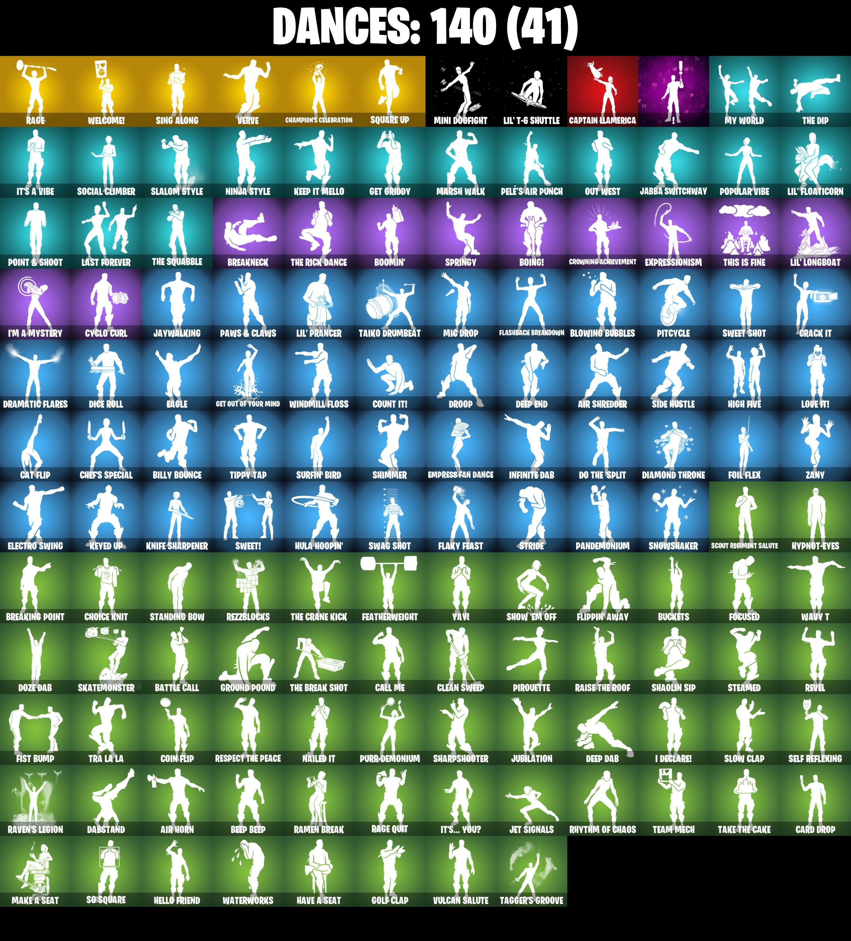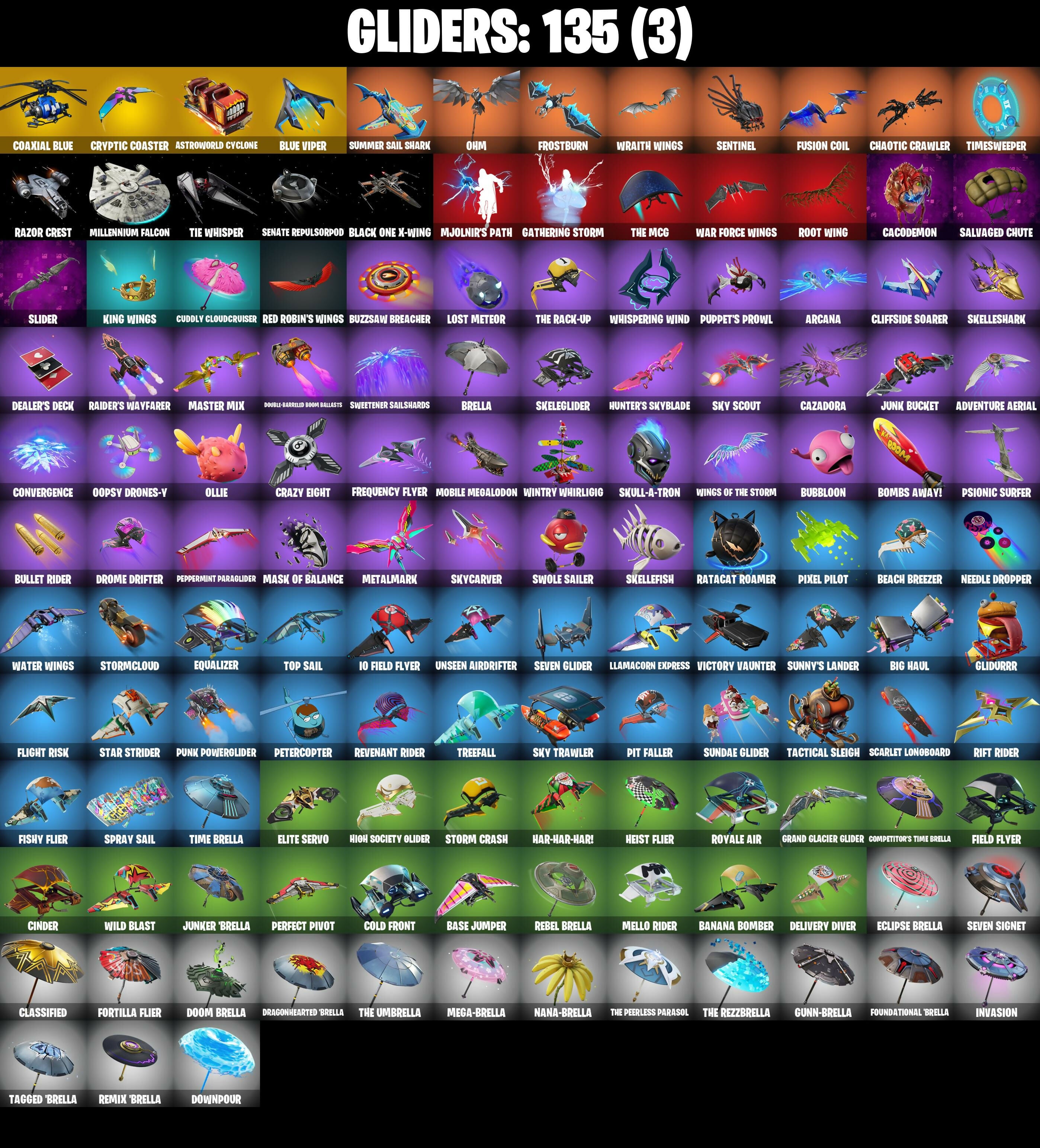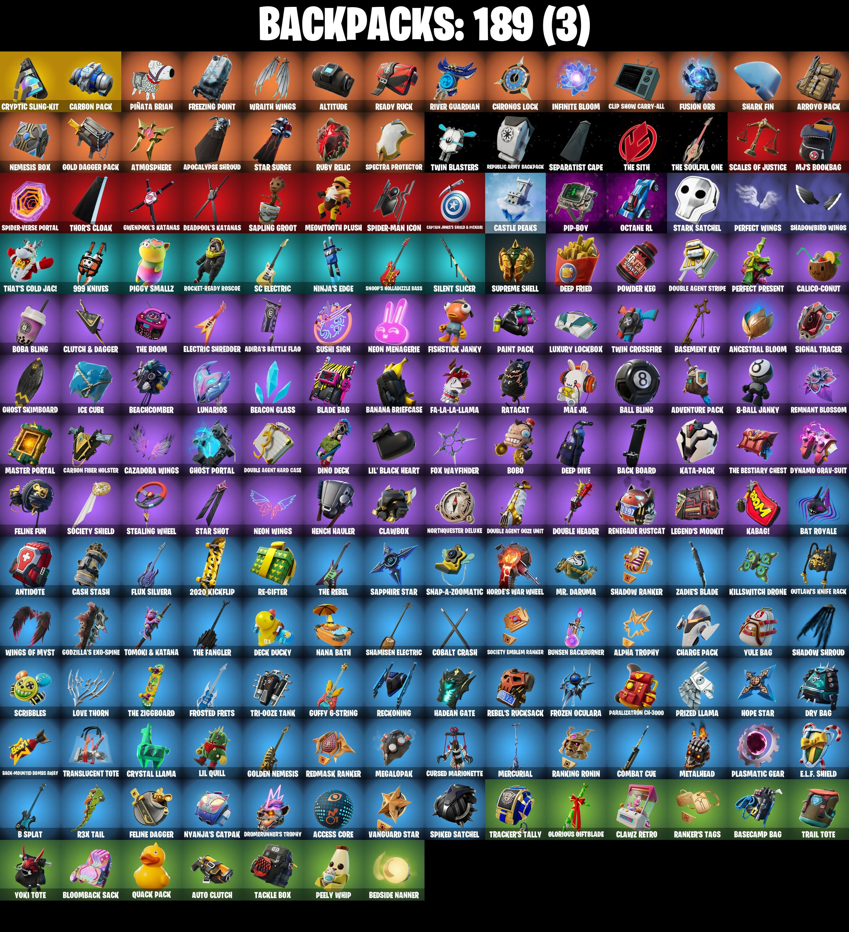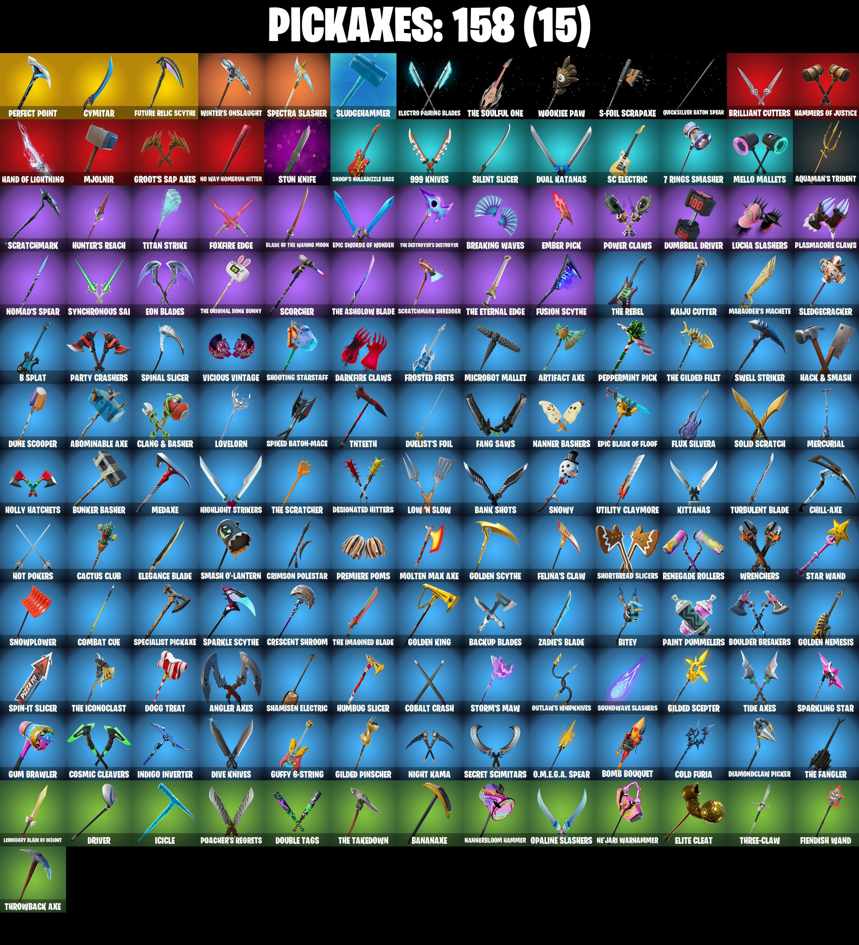 1-Ball, 10 Field Flyer, 2020 Kickflip, 7 Rings Smasher, 8-Ball Janky, 8-Ball Vs Scratch, 999 Knives, Abominable Axe, Access Core, Adira's Battle Flag, Adventure Aerial, Adventure Pack, Agent Peely, Air Horn, Air Shredder, Alpha Trophy, Altitude, Ancestral Bloom, Angler Axes, Antidote, Antonia, Apocalypse Shroud, Aquaman, Aquaman's Trident, Arcana, Arctic Adeline, Ariana Grande, Arroyo Pack, Arthur Curry, Artifact Axe, Astroworld Cyclone, Atmosphere, Auto Clutch, B Splat, Back Board, Back-Mounted Bombs Away, Backup Blades, Ball Bling, Banana Bomber, Banana Briefcase, Bananaxe, Bank Shots, Base Jumper, Basecamp Bag, Basement Key, Bat Royale, Battle Call, Beach Breezer, Beach Jules, Beachcomber, Beacon Glass, Bedside Nanner, Beef Boss, Beep Beep, Big Haul, Billy Bounce, Bitey, Black One X-Wing, Blade Bag, Blade of the Waning Moon, Blitz Brigade, Bloomback Sack, Blowing Bubbles, Blue Viper, Boardwalk Ruby, Boba Bling, Bobo, Boing!, Bomb Bouquet, Bombs Away!, Boomin', Boulder Breakers, Breaking Point, Breaking Waves, Breakneck, Brella, Brilliant Cutters, Brutus, Bubloon, Buckets, Bullet Rider, Bunker Basher, Bunsen Backburner, Burning Ambition Valeria, Buzzsaw Breacher, Cacodemon, Cactus Club, Calico-Coconut, Call Me, Cameo Vs Chic, Caper, Caper (Bunny), Captain Jones's Shield & Pickle, Captain Llamerica, Carbon Commando, Carbon Fiber Holster, Carbon Pack, Card Drop, Cash Stash, Castle Peaks, Cat Flip, Catalyst, Cazadora, Cazadora Wings, Chalked Up 1-Ball, Champion's Celebration, Championship Aura, Chaos Director, Chaos Double Agent, Chaotic Crawler, Charge Pack, Chef's Special, Chill-Axe, Choice Knit, Chomp Sr., Chronos Lock, Cinder, Clang & Basher, Classified, Clawbox, Clawz Retro, Clean Sweep, Cliffside Soarer, Clip Show Carry-All, Clutch & Dagger, Coaxial Blue, Cobalt Crash, Cobalt Snowfoot, Codename E.L.F., Coin Flip, Cold Front, Cold Furia, Combat Cue, Competitor's Time Brella, Convergence, Cosmic Cleavers, Count It!, Crack It, Crazy Eight, Crescent Shroom, Crimson Polestar, Crowning Achievement, Cryptic Coaster, Cryptic Sling-Kit, Crystal Llama, Cuddly Cloudcruiser, Cursed Marionette, Cyclo Curl, Cymitar, Dabstand, Darkfire Claws, Deadpool, Deadpool Unmasked, Deadpool's Katanas, Dealer's Deck, Deck Ducky, Deep Dab, Deep Dive, Deep End, Deep Fried, Delivery Diver, Designated Hitters, Diamond Throne, Diamondclaw Picker, Dice Roll, Die With A Smile Bruno, Dino Deck, Dive Knives, Do The Split, Dogg Treat, Doom Brella, Double Agent Hard Case, Double Agent Hush, Double Agent Ooze Unit, Double Agent Stripe, Double Agent Wildcard, Double Header, Double Tags, Double-Barreled Boom Ballasts, Downpour, Doze Dab, Dragonhearted 'Brella, Dramatic Flares, Driver, Dromerunner's Trophy, Drone Drifter, Droop, Dry Bag, Dual Katanas, Duelist's Foil, Dumbbell Driver, Dune Scooper, Dusk Knight, Dynamo Grav-Suit, Dynamo Tntina, Dynamo Tntoon-A, E.L.F. Shield, Eagle, Eclipse Brella, El Chapulin Colorado, Electric Shredder, Electro Pairing Blades, Electro Swing, Elegance Blade, Elite Cleat, Elite Servo, Ember Pick, Empress Fan Dance, Eon Blades, Epic Blade of Floof, Epic Swords of Wonder, Equalizer, Era, Eren Jaeger, Expressionism, Fa-La-La-Llama, Fade, Fancy Peter Griffin, Fang Saws, Featherweight, Felina, Felina's Claw, Feline Dagger, Feline Fun, Field Flyer, Fiendish Wand, Fish Thicc, Fishstick Janky, Fishy Flier, Fist Bump, Fixer, Flaky Feast, Flashback Breakdown, Flight Risk, Flippin' Away, Flux Silvera, Focused, Foil Flex, Fortilla Flier, Foundational 'Brella, Fox Wayfinder, Foxfire Edge, Freezing Point, Frequency Flyer, Frostbite, Frostburn, Frosted Frets, Frozen Fishstick, Frozen Nog Ops, Frozen Oculara, Fusion, Fusion Coil, Fusion Orb, Fusion Scythe, Future Relic Scythe, Gathering Storm, Gear Specialist Maya, Get Griddy, Get Out Of Your Mind, Ghost Portal, Ghost Skimboard, Gilded Pinscher, Gilded Scepter, Glidurrr, Glorious Giftblade, Godzilla's Exo-Spine, Gold Dagger Pack, Gold Midas, Golden King, Golden Nemesis, Golden Scythe, Golf Clap, Grand Glacier Glider, Groot, Groot's Sap Axes, Ground Pound, Guffy 6-String, Gum Brawler, Gunn-Brella, Gwenpool's Katanas, Hack & Smash, Hadean Gate, Hammers of Justice, Hand of Lightning, Har-Har-Har!, Harbinger Armor Omegorok, Have A Seat, Heist Flier, Hello Friend, Hench Hauler, High Five, High Society Glider, Highlight Strikers, Highwire, Holiday Boxy, Holly Hatchets, Hope, Hope Star, Horde's War Wheel, Hot Pokers, Hula Hoopin', Humbug Slicer, Hunter's Reach, Hunter's Skyblade, Hypnot-Eyes, I Declare, I'm A Mystery, Ice Cube, Icicle, Imani, Indigo Inverter, Infinite Bloom, Infinite Dab, Invasion, It's A Vibe, It's... You?, Jabba Switchway, Jaywalking, Jennifer Walters, Jet Signals, Joltara, Journey Vs Hazard, Jubilation, Jules, Junk Bucket, Junker 'Brella, Kabag!, Kado Thorne, Kaiju Cutter, Kata-Pack, Keep It Mello, Keyed Up, Khaby Lame, Killswitch Drone, King Wings, Kit, Kittanas, Knife Sharpener, Krisabelle, Last Forever, Legend's Modkit, Legendary Blade of Insight, Lewis Hamilton, Lil Quill, Lil Split, Lil' Black Heart, Lil' Floaticorn, Lil' Longboat, Lil' Prancer, Lil' T-6 Shuttle, Llamacorn Express, Lorenzo, Lost Meteor, Love It!, Love Thorn, Lovelorn, Low 'N Slow, Lt. Evergreen, Lucha Slashers, Lunarios, Luxury Lockbox, Lynx, Lynx (Stage 4 - No Ponytail), MJ's Bookbag, Mae, Mae Jr., Magmatic Mizuki, Make A Seat, Mandalorian, Marauder's Machete, Mariposa, Marsh Walk, Marshmello, Mask Of Balance, Masked, Master Mix, Master Portal, Medaxe, Mega Wave Imani, Mega Wave Thunder, Mega-Brella, Megalopak, Mello Mallets, Mello Rider, Meowdas, Meowscles, Meowtooth Plush, Mercurial, Metalhead, Metalmark, Mic Drop, Microbot Mallet, Midnight Skye, Midsummer Midas, Millennium Falcon, Mini Dogfight, Mizuki, Mj (No Way Home), Mjolnir, Mjolnir's Path, Mobile Megalodon, Molten Max Axe, Montague, Mr. Daruma, My World, Mystica, Nailed It, Nana Bath, Nana-Brella, Nanner Bashers, Nannerbloom Hammer, Ne'Jari Warhammer, Needle Dropper, Nemesis Box, Neon Menagerie, Neon Wings, Night 