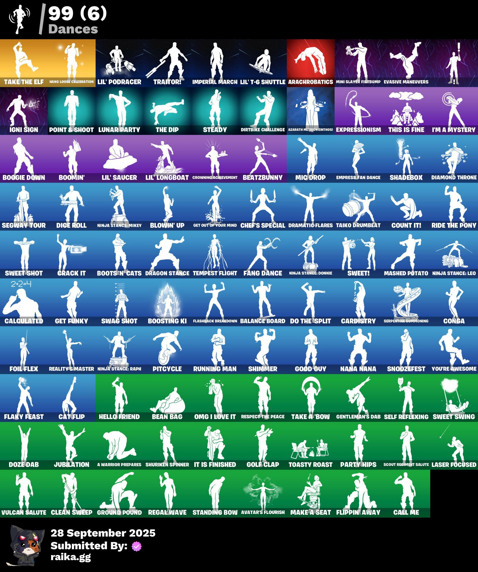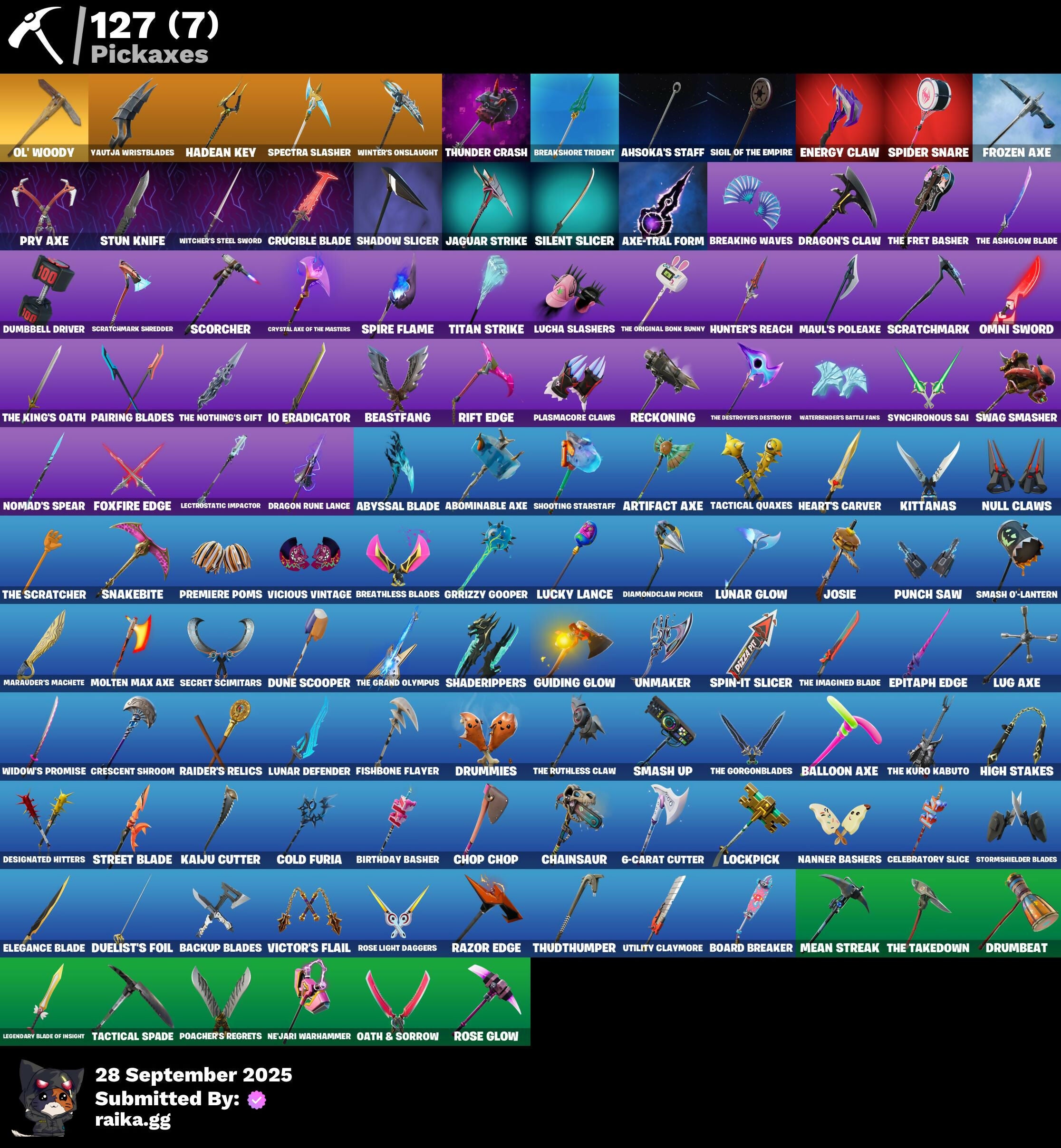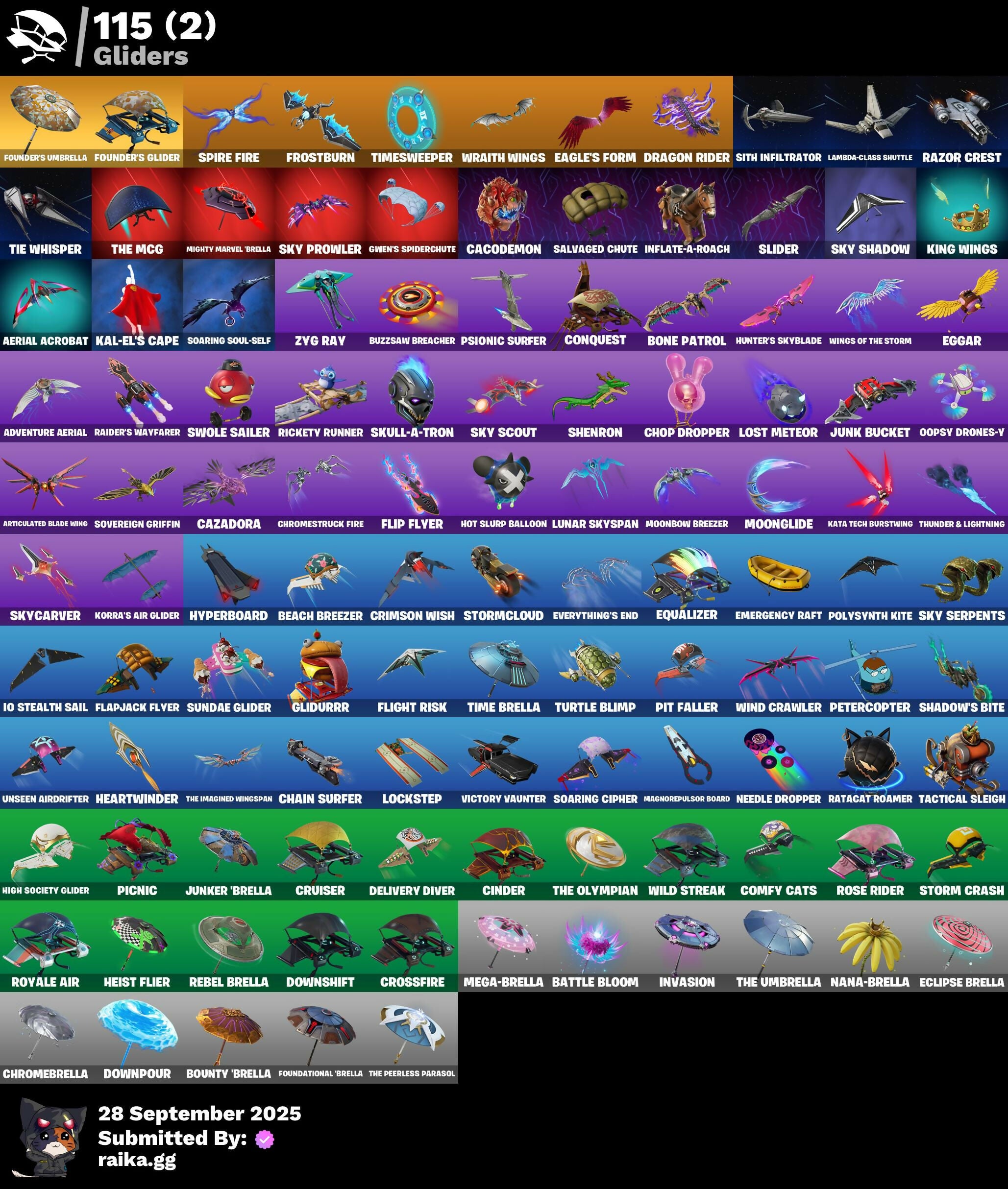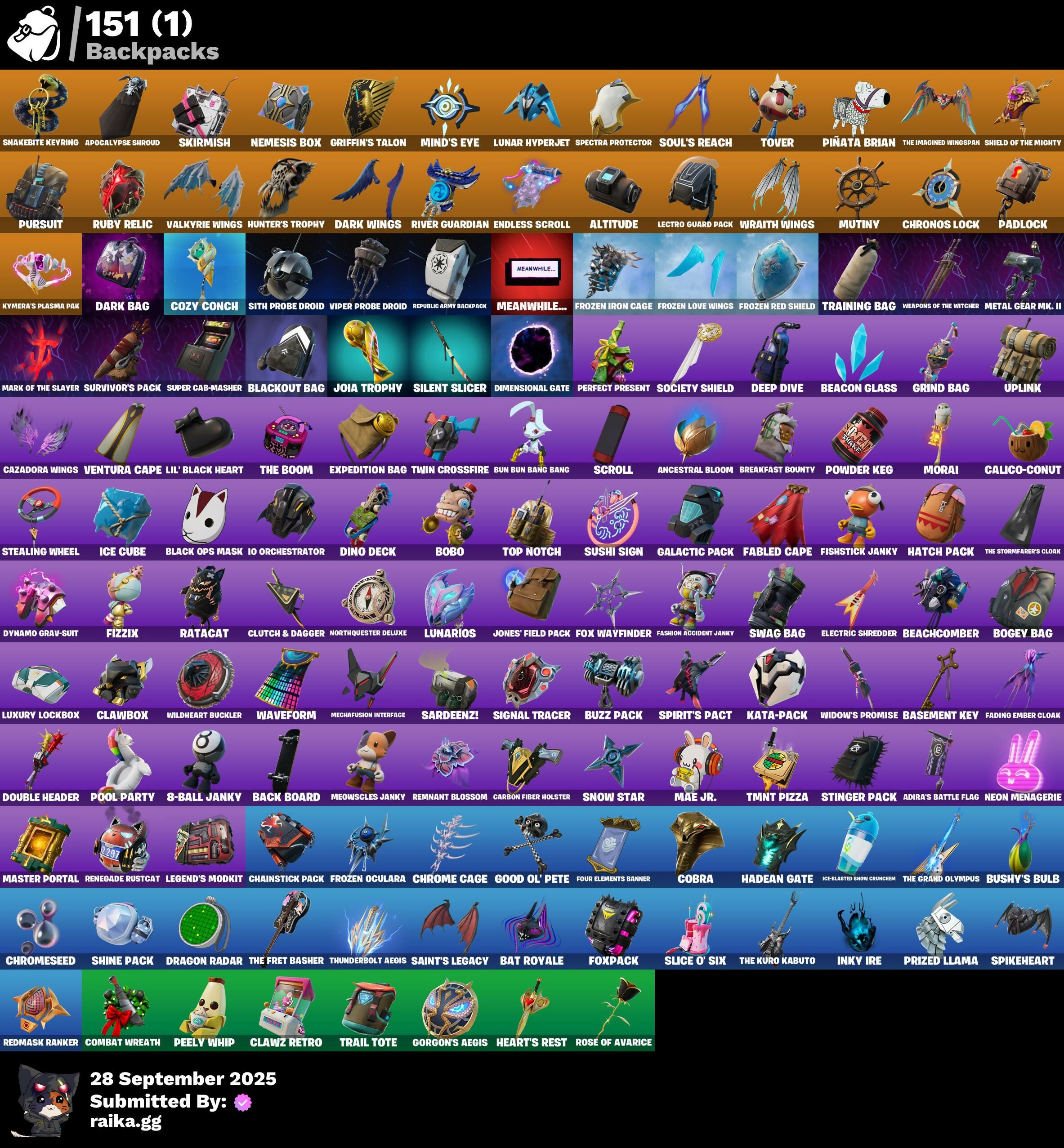 6-Carat Cutter, 8-Ball Janky, A Warrior Prepares, Abominable Axe, Absenz, Abyssal Blade, Adira, Adira's Battle Flag, Adventure Aerial, Aerial Acrobat, Agent Jones, Ahsoka Tano, Ahsoka's Clone Trooper, Ahsoka's Staff, Altitude, Ancestral Bloom, Antonia, Aphrodite, Apocalypse Shroud, Arachrobatics, Articulated Blade Wing, Artifact Axe, Avatar's Flourish, Axe-tral Form, Azarath Metrion Zinthos!, Back Board, Backup Blades, Balance Board, Balloon Axe, Basement Key, Bat Royale, Battle Bloom, Beach Breezer, Beachcomber, Beacon Glass, Bean Bag, Beastfang, Beatzbunny, Birthday Basher, Black Ops Mask, Blackheart, Blackout Bag, Blowin' Up, Board Breaker, Bobo, Bogey Bag, Bone Patrol, Boogie Down, Boomin', Boosting Ki, Boots 'N' Cats, Bounty 'Brella, Breakfast Bounty, Breaking Waves, Breakshore Trident, Breathless Blades, Bun Bun Bang Bang, Bushy's Bulb, Buzz Pack, Buzzsaw Breacher, Bytes, Cacodemon, Calamity, Calculated, Calico-Conut, Call Me, Carbon Fiber Holster, Cardistry, Cat Flip, Catalyst, Cazadora, Cazadora Wings, Celebratory Slice, Cerberus, Chain Surfer, Chainsaur, Chainstick Pack, Chef's Special, Chop Chop, Chop Dropper, Chrome Cage, Chrome Punk, Chromebrella, Chromeseed, Chromestruck Fire, Chronos Lock, Chun-Li, Cinder, Clawbox, Clawz Retro, Clean Sweep, Clone Trooper, Cluck, Clutch & Dagger, Cobra, Cold Furia, Combat Wreath, Comfy Cats, Conga, Conquest, Coruscant Guard, Count It!, Cozy Conch, Crack It, Crescent Shroom, Crimson Wish, Crossfire, Crowning Achievement, Crucible Blade, Cruiser, Crystal Axe Of The Masters, DJ Yonder, Dark Bag, Dark Bomber, Dark Wings, Darth Maul, Darth Vader, Deep Dive, Delivery Diver, Designated Hitters, Diamond Diva, Diamond Throne, Diamondclaw Picker, Dice Roll, Dimensional Gate, Dino Deck, Dirtbike Challenge, Do The 'Split, Doctor Slone, Doom Slayer, Double Header, Downpour, Downshift, Doze Dab, Dragon Radar, Dragon Rider, Dragon Rune Lance, Dragon Stance, Dragon's Claw, Dramatic Flares, Drift, Drumbeat, Drummies, Duelist's Foil, Dumbbell Driver, Dune Scooper, Dusty, Dynamo Grav-Suit, Eagle's Form, Eclipse Brella, Eggar, Electric Shredder, Elegance Blade, Ember, Emergency Raft, Empress Fan Dance, Endless Scroll, Energy Claw, Epitaph Edge, Equalizer, Era, Eren Jaeger, Evasive Maneuvers, Everything's End, Evie, Expedition Bag, Expressionism, Fabled Cape, Fading Ember Cloak, Fang Dance, Fashion Accident Janky, Fennix, Fish Thicc, Fishbone Flayer, Fishstick Janky, Fizzix, Flaky Feast, Flapjack Flyer, Flashback Breakdown, Flight Risk, Flip Flyer, Flippin' Away, Foil Flex, Foundational 'Brella, Founder's Glider, Founder's Umbrella, Four Elements Banner, Fox Wayfinder, Foxfire Edge, Foxpack, Frostburn, Frozen Axe, Frozen Iron Cage, Frozen Love Ranger, Frozen Love Wings, Frozen Oculara, Frozen Raven, Frozen Red Knight, Frozen Red Shield, Galactic Pack, Gentleman's Dab, Geralt Of Rivia, Get Funky, Get Out Of Your Mind, Giddy-Up, Glidurr, Golf Clap, Good Guy, Good Ol' Pete, Gorgon's Aegis, Griffin's Talon, Grind Bag, Griz, Grizzly Gooper, Ground Pound, Guggimon, Guiding Glow, Gunnar, Gwen's Spiderchute, Hadean Gate, Hadean Key, Hang Loose Celebration, Hatch Pack, Heart's Carver, Heart's Rest, Heartwinder, Heist Flier, Hello Friend, High Society Glider, High Stakes, Highwire, Hope, Hot Slurp Balloon, Hunter's Reach, Hunter's Skyblade, Hunter's Trophy, Huntress, Hybrid, Hyperboard, I'm A Mystery, IO Orchestrator, IO Stealth Sail, Ice Cube, Ice-Blasted Snow Cruncher, Igni Sign, Imani, Imperial March, Indiana Jones, Inflate-A-Roach, Inky Ire, Invasion, Io Eradicator, It Is Finished, Itachi Uchiha, Jaguar Strike, Joey, Joia Trophy, Jones' Field Pack, Josie, Jubilation, Junk Bucket, Junker 'Brella, Kado Thorne, Kaiju Cutter, Kal-El's Cape, Kata Tech Burstwing, Kata-Pack, Khaby Lame, King Wings, Kittanas, Kondor, Korra, Korra's Air Glider, Kymera, Kymera's Plasma Pak, Lambda-Class Shuttle, Lara Croft, Laser Focused, Lecrostatic Impactor, Lectro Guard Pack, Legend's Modkit, Legendary Blade Of Insight, Lennox Rose, Lexa, Lil Split, Lil' Black Heart, Lil' Longboat, Lil' Podracer, Lil' Saucer, Lil' T-6 Shuttle, Lockpick, Lockstep, Lorenzo, Lost Meteor, Lucha Slashers, Lucky Lance, Lug Axe, Lunar Defender, Lunar Glow, Lunar Hyperjet, Lunar Party, Lunar Skyspan, Lunarios, Luxury Lockbox, Lynx, Mae, Mae Jr., Magnorepulsor Board, Make A Seat, Malik, Mancake, Mandalorian, Marauder's Machete, Mariposa, Mark of the Slayer, Mashed Potato, Massai, Master Portal, Maul's Poleaxe, Mave, Mean Streak, Meanwhile..., Mechafusion Interface, Medusa, Mega-Brella, Menace, Meow Skulls, Meowscles Janky, Metal Gear Mk. II, Mic Drop, Mighty Marvel 'Brella, Mina Park, Mind's Eye, Mini Slayer Fistbump, Mizuki, Molten Max Axe, Montague, Moonbow Breezer, Moonglide, Morai, Mutiny, Mystica, Nana Nana, Nana-Brella, Nanner Bashers, Naruto Uzumaki, Ne'jari Warhammer, Needle Dropper, Nemesis Box, Neon Menagerie, Neymar Jr, Ninja Stance: Donnie, Ninja Stance: Leo, Ninja Stance: Mikey, Ninja Stance: Raph, Nisha, Nolan Chance, Nomad's Spear, Northquester Deluxe, Null Claws, OMG I Love It, Oath & Sorrow, Ol' Woody, Omegarok, Omni Sword, Onesie, Oopsy Drones-V, Oscar, Padlock, Pairing Blades, Paradigm (Reality-659), Paradise Meowscles, Party Hips, Peely, Peely Whip, Perfect Present, Peter Griffin, Petercopter, Picnic, Pinata Brian, Piper Pace, Pit Faller, Pitcycle, Plasmacore Claws, Poacher's Regrets, Point & Shoot, Polysynth Kite, Pool Party, Powder, Powder Keg, Predator, Premiere Poms, Prized Llama, Prowler, Pry Axe, Psionic Surfer, Punch Saw, Pursuit, Raider's Relics, Raider's Wayfarer, Ratacat Roamer, Ratcat, Ravage, Raz, Razor Crest, Razor Edge, Reality's Master, Rebel Brella, Rebirth Raven, Reckoning, Redline, Redmask Ranker, Reese, Regal Wave, Relik, Remnant Blossom, Renegade Lynx, Renegade Rustcat, Renzo The Destroyer, Republic Army Backpack, Respect The Peace, Rian, Rickety Runner, Ride The Pony, Rift Edge, River Guardian, Rose Glow, Rose Light Daggers, Rose Rider, Rose Team Leader, Rose of Avarice, Royal
