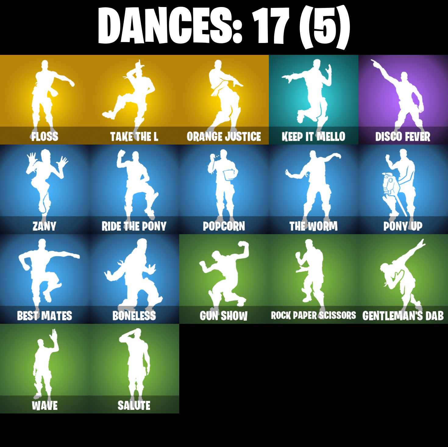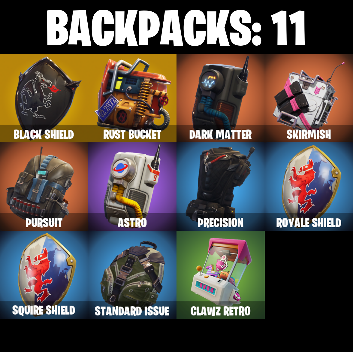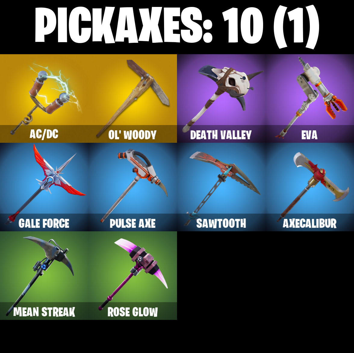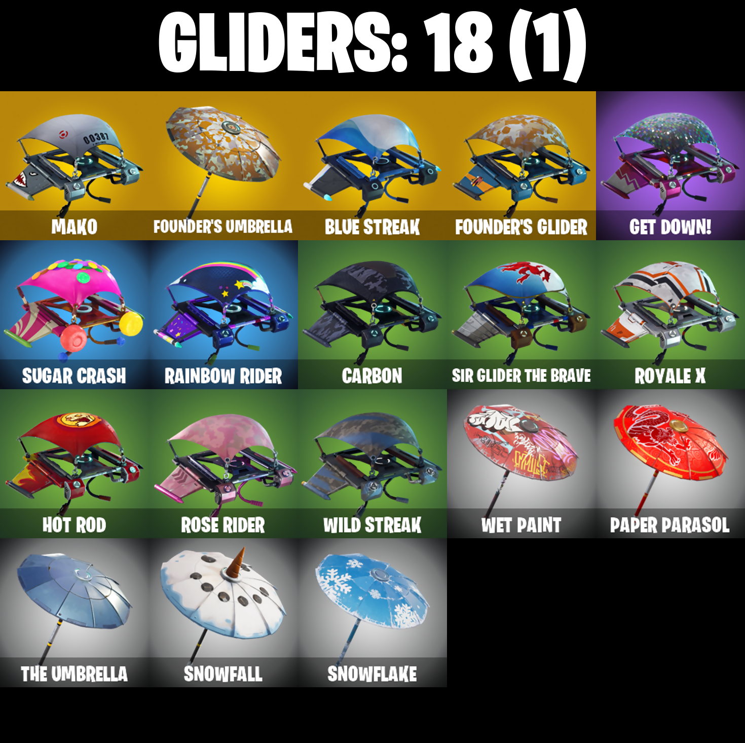 Ac/Dc, Astro, Axecalibur, Battlehawk, Best Mates, Black Knight, Black Shield, Blue Squire, Blue Streak, Blue Team Leader, Boneless, Carbide, Carbon, Clawz Retro, Dark Matter, Dark Voyager, Death Valley, Disco Fever, Eva, Floss, Founder's Glider, Founder's Umbrella, Gale Force, Gentleman's Dab, Get Down!, Gun Show, Hot Rod, Keep It Mello, Mako, Mean Streak, Mission Specialist, Moonwalker, Ol' Woody, Orange Justice, Paper Parasol, Pony Up, Popcorn, Precision, Pulse Axe, Pursuit, Rainbow Rider, Ride The Pony, Rock Paper Scissors, Rose Glow, Rose Rider, Rose Team Leader, Royale Knight, Royale Shield, Royale X, Rust Bucket, Rust Lord, Salute, Sawtooth, Sir Glider The Brave, Skirmish, Snowfall, Snowflake, Sparkle Specialist, Squire Shield, Standard Issue, Sugar Crash, Take The L, Teknique, The Umbrella, The Worm, Warpaint, Wave, Wet Paint, Wild Streak, Zany