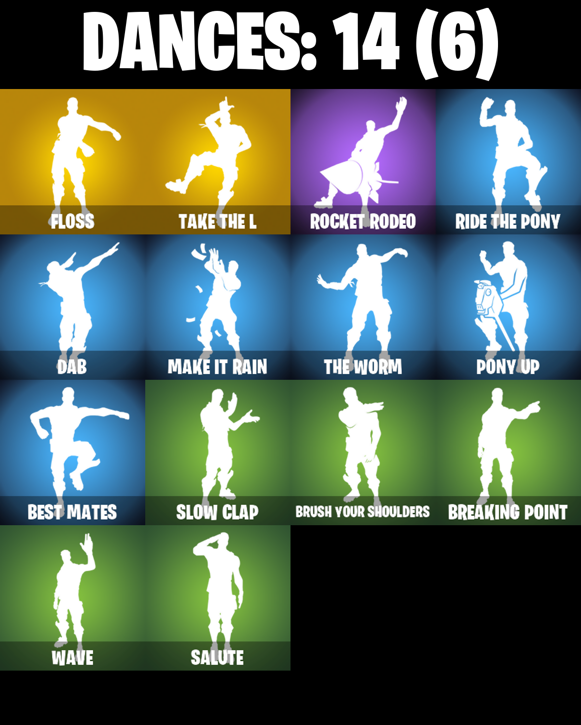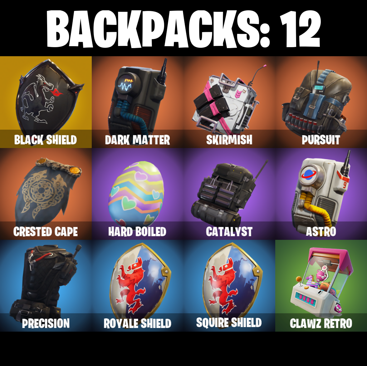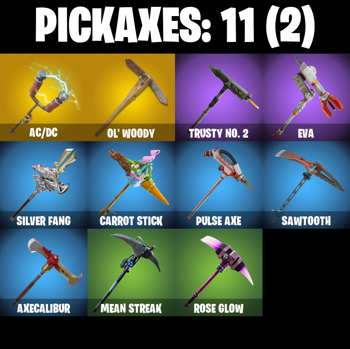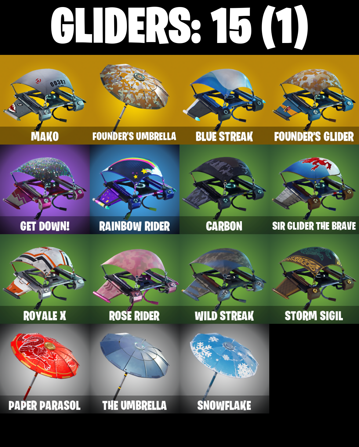Ac/dc, Astro, Axecalibur, Battle Hound, Best Mates, Black Knight, Black Shield, Blue Squire, Blue Streak, Blue Team Leader, Breaking Point, Brush Your Shoulders, Carbon, Carrot Stick, Catalyst, Clawz Retro, Crested Cape, Dab, Dark Matter, Dark Voyager, Eva, Floss, Founder's Glider, Founder's Umbrella, Get Down!, Hard Boiled, Make It Rain, Mako, Mean Streak, Mission Specialist, Moonwalker, Ol' Woody, Paper Parasol, Pony Up, Precision, Pulse Axe, Pursuit, Rabbit Raider, Rainbow Rider, Ride The Pony, Rocket Rodeo, Rogue Agent, Rose Glow, Rose Rider, Rose Team Leader, Royale Knight, Royale Shield, Royale X, Rust Lord, Salute, Sawtooth, Silver Fang, Sir Glider The Brave, Skirmish, Slow Clap, Snowflake, Sparkle Specialist, Squire Shield, Storm Sigil, Take The L, The Umbrella, The Worm, Trusty No. 2, Warpaint, Wave, Wild Streak