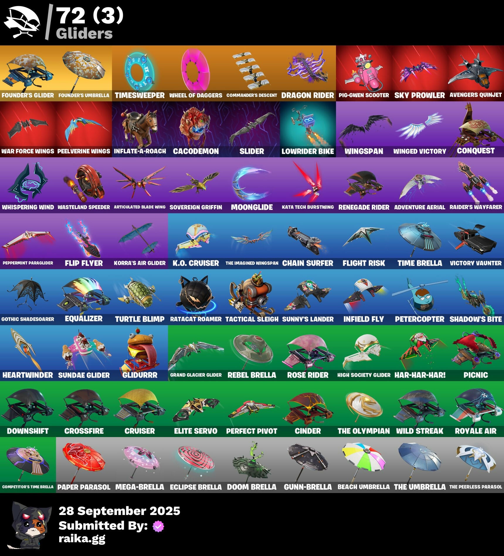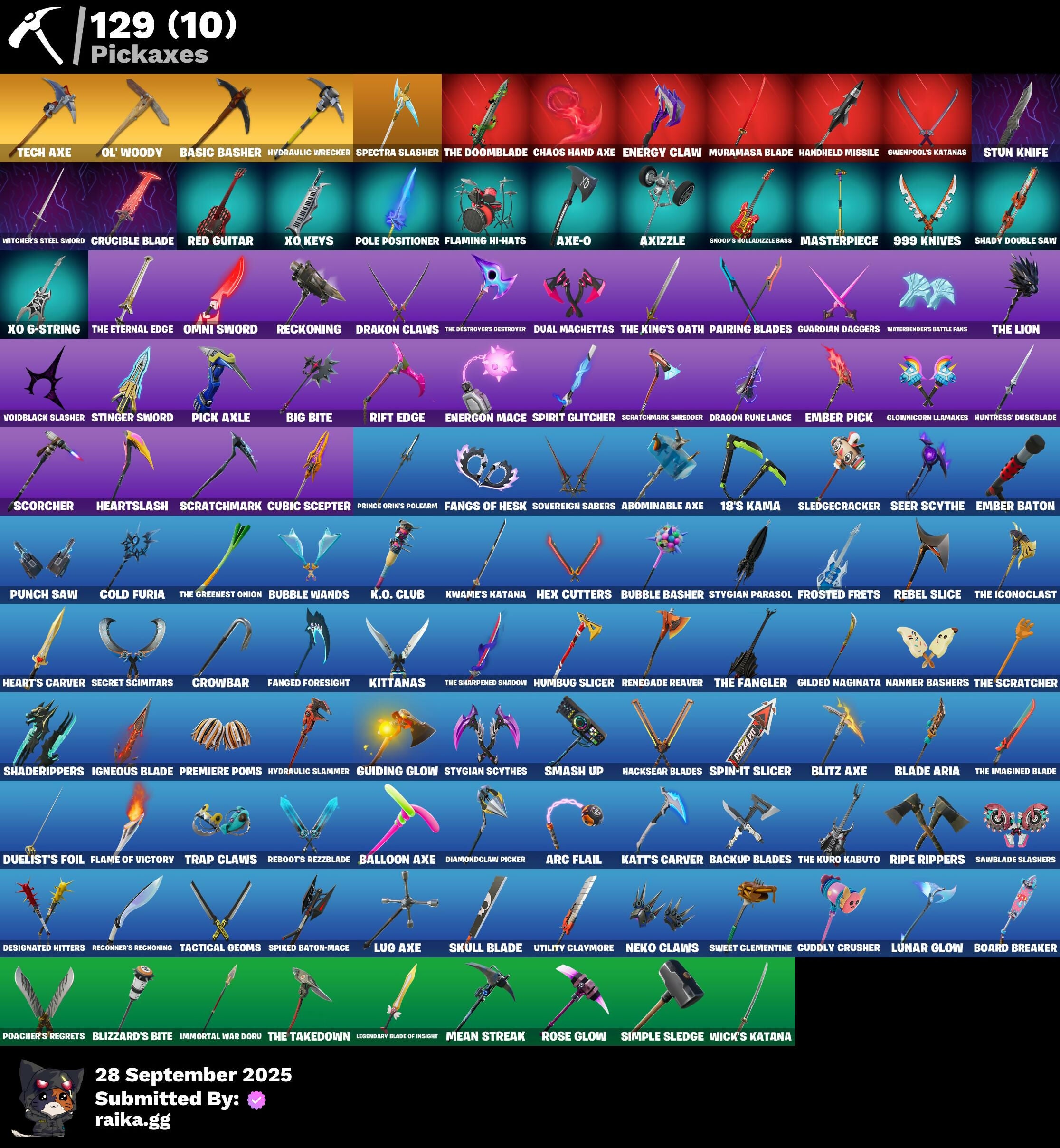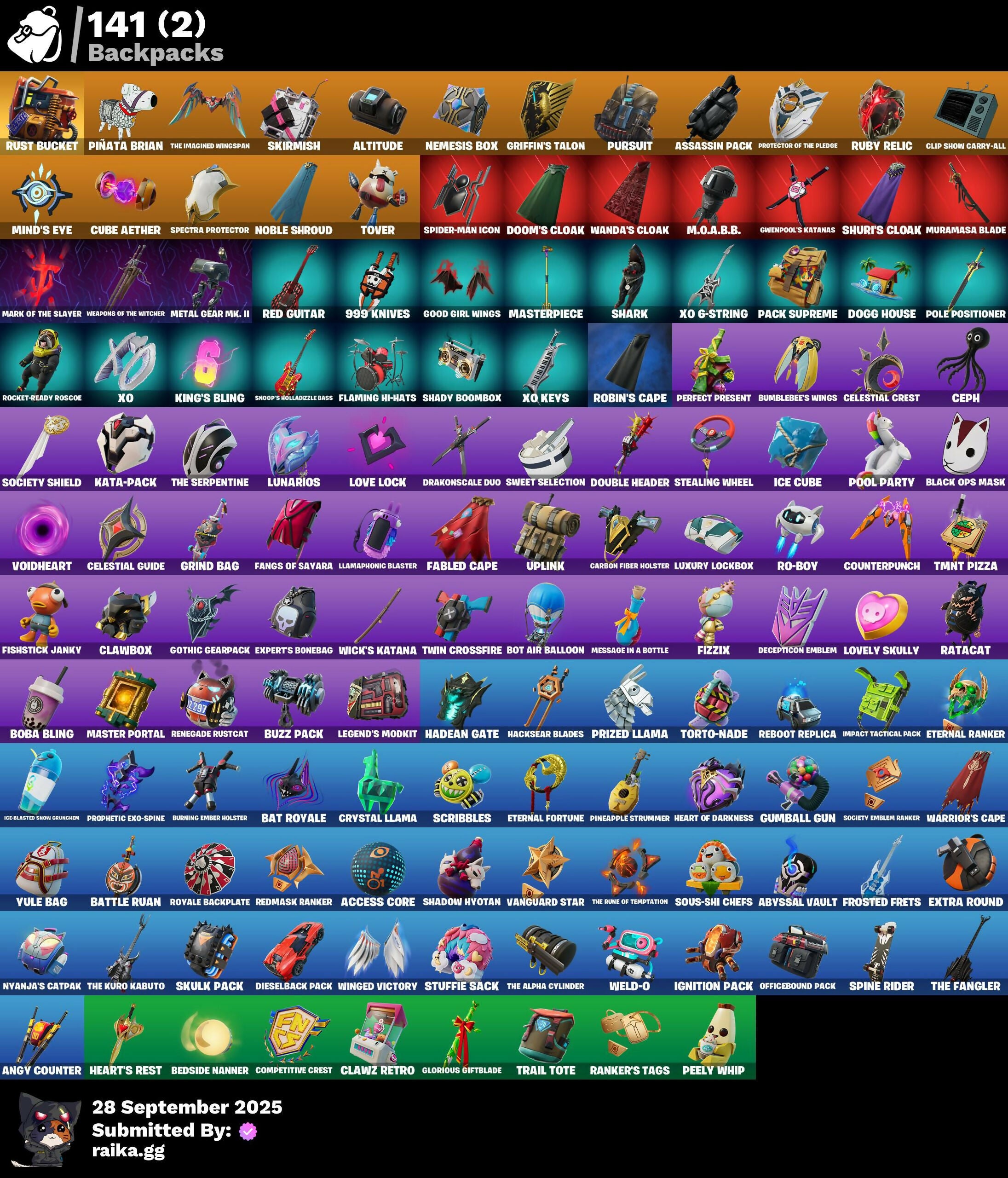 18's Kama, 999 Knives, Aang, Abominable Axe, Abyssal Vault, Access Core, Adira, Adventure Aerial, Ahsoka Tano, Altitude, Andy Fangerson, Angy Counter, Aphrodite, Apprentice Evie, Arc Flail, Arctic Adeline, Ares, Articulated Blade Wing, Assassin Pack, Astrea, Augury, Avengers Quinjet, Axe-O, Axizzle, Ayla Winn, Backup Blades, Bad Guy, Balance Board, Balloon Axe, Basic Basher, Bat Royale, Battle Ruan, Battlebus, Beach Umbrella, Bedside Nanner, Bernie, Big Bite, Black Ops Mask, Blade Aria, Blitz Axe, Blizzard's Bite, Blowin' Up, Board Breaker, Boba Bling, Boba Snack, Bones, Boogie Down, Bot Air Balloon, Breezabelle, Bubble Basher, Bubble Wands, Build Up, Bumblebee, Bumblebee's Wings, Burning Ember Holster, Buzz Pack, Cacodemon, Calamity, Calculated, Call Me, Called Shot, Captain Phasma, Carbon Fiber Holster, Card Drop, Cassidy Quinn, Cat Flip, Celestial Crest, Celestial Guide, Ceph, Cerberus, Chain Surfer, Chaos Director, Chaos Hand Axe, Cinder, Clawbox, Clawz Retro, Clip Show Carry-All, Cold Furia, Combat Tech Jules, Commander's Descent, Competitive Crest, Competitor's Time Brella, Conquest, Counterpunch, Crossfire, Crowbar, Crowning Achievement, Crucible Blade, Cruiser, Crystal Llama, Cube Aether, Cubic Scepter, Cuddly Crusher, Cupid's Arrow, Cyclo Curl, DJ Yonder, Dali, Danica, Decepticon Emblem, Designated Hitters, Diamond Throne, Diamondclaw Picker, Dice Roll, Die With A Smile Bruno, Dieselback Pack, Dizzie, Dogg House, Don't Start Now, Doom Brella, Doom Slayer, Doom's Cloak, Double Header, Downshift, Doze Dab, Dragon Rider, Dragon Rune Lance, Drakon Claws, Drakon Steel Hybrid, Drakonscale Duo, Drift, Dual Machettas, Duelist's Foil, Durrr Taisho, Dusty, Eclipse Brella, Elite Servo, Ember Baton, Ember Pick, Energon Mace, Energy Claw, Equalizer, Era, Eternal Fortune, Eternal Ranker, Evie, Expert's Bonebag, Extra Round, Fabled Cape, Fanged Foresight, Fangs of Hesk, Fangs of Sayara, Fishstick Janky, Fizzix, Flame of Victory, Flaming Hi-Hats, Flashback Breakdown, Flight Risk, Flip Flyer, Foil Flex, Founder's Glider, Founder's Umbrella, Frosted Frets, Gentleman's Dab, Geralt of Rivia, Get Funky, Get Griddy, Giddy-Up, Gilded Naginata, Glidurr, Glorious Giftblade, Glownicorn Llamaxes, Golf Clap, Good Game, Well Played, Good Girl Wings, Gothic Gearpack, Gothic Shadesoarer, Grand Glacier Glider, Griffin's Talon, Grind Bag, Guardian Daggers, Guiding Glow, Gumball Gun, Gunn-Brella, Gunnar, Gwen-Step, Gwenpool, Gwenpool's Katanas, Hacksear Blades, Hadean Gate, Handheld Missile, Har-Har-Har!, Haruka of the Masks, Heart of Darkness, Heart's Carver, Heart's Rest, Heartslash, Heartwinder, Hello Friend, Helsie, Hex Cutters, High Society Glider, Holiday Boxy, Hope, Hula, Humbug Slicer, Huntress, Huntress' Duskblade, Hydraulic Slammer, Hydraulic Wrecker, Hypnot-Eyes, I Need You To Concentrate, I'm A Mystery, Ice Cube, Ice Moves, Ice-Blasted Snow Cruncher, Igneous Blade, Igni Sign, Ignition Pack, Immortal War Doru, Impact Tactical Pack, Infield Fly, Inflate-A-Roach, It Is Finished, Itachi Uchiha, Jing, John Wick, Jun-Hwan, K.O. Club, K.O. Cruiser, Kata Tech Burstwing, Kata-Pack, Katt, Katt's Carver, Kiara K.O., King's Bling, Kittanas, Knife Sharpener, Korra, Korra's Air Glider, Kwame, Kwame's Katana, Kyran Aryk, LBC '93 Dogg, Lady of Cranes, Laguna, Lana Llane, Launch Day Lewis Hamilton, LeBron James, Legend's Modkit, Legendary Blade of Insight, Lewis Hamilton, Lil Split, Lil' Prancer, Lil' Warthog, Llamaphonic Blaster, Love Lock, Lovely Skully, Lowrider Bike, Lug Axe, Lunar Glow, Lunar Party, Lunarios, Luxury Lockbox, Lynx, M.O.A.B.B., Mark of the Slayer, Marshmello, Massai, Master Of Puppets, Master Portal, Masterpiece, Mean Streak, Mega-Brella, Megatron, Message in a Bottle, Metal Gear Mk. II, Mic Drop, Min-Joon, Mind's Eye, Mini Slayer Fistbump, Montague, Moonglide, Muramasa Blade, My World, Nanner Bashers, Neko Claws, Neko Hatsune Miku, Nemesis Box, Nezumi, Nike Goddess, Ninja Stance: Donnie, Ninja Stance: Leo, Ninja Stance: Mikey, Ninja Stance: Raph, Nisha, Noble Shroud, Nolan Chance, Nyangelica, Nyanja, Nyanja's Catpak, O.M.E.G.A. Suit Alpha, Officebound Pack, Ol' Woody, Omni Sword, Oscar, Pack Supreme, Pairing Blades, Paper Parasol, Peace Out, Peel Out, Peelverine, Peelverine Wings, Peely Whip, Peppermint Paraglider, Perfect Pivot, Perfect Present, Persephone, Peter Griffin, Petercopter, Phaedra, Pick Axe, Picnic, Pig-Gwen Scooter, Pinata Brian, Pineapple Strummer, Piper Pace, Pitcycle, Poacher's Regrets, Pole Positioner, Polus, Pool Party, Popular Vibe, Powder, Power Punk, Premiere Poms, Prince Orin, Prince Orin's Polearm, Princess Lexa, Prized Llama, Prophetic Exo-Spine, Prowler, Psychic Energy Manipulation, Punch Saw, Pursuit, Raider's Wayfarer, Ranker's Tags, Rap Boy, Ratacat, Ratacat Roamer, Raven Team Syd, Real Slim Shady, Rebel Brella, Rebel Oro, Rebel Slice, Reboot Man, Reboot Replica, Reboots Rezzblade, Reckoner's Reckoning, Reckoning, Red Guitar, Red Roots Billie, Redline, Redline Racer, Redmask Ranker, Regal Wave, Renegade Lynx, Renegade Reaver, Renegade Rebel, Renegade Rider, Renegade Rustcat, Ride Along, Ride The Pony, Rift Edge, Ripe Rippers, Ro-Boy, Robin, Robin's Cape, Rocket-Ready Roscoe, Rose Glow, Rose Rider, Rose Team Leader, Rox, Royale Air, Royale Backplate, Ruby Relic, Running Man, Russel, Rust Bucket, Sabrina Carpenter, Santa Dogg, Satoru Gojo, Sawblade Slashers, Sayara, Scarlet Witch, Scorcher, Scratchmark, Scratchmark Shredder, Scribbles, Secret Scimitars, Seer Scythe, Segway Tour, Selene, Sentinel, Sgt. Winter, Shadebox, Shaderippers, Shadow Hyotan, Shadow's Bite, Shady Boombox, Shady Double Saw, Shake & Split, Shark, Shimmer, Shimmerdusk, Show 'Em Off, Shuri's Cloak, Silas Hesk, Simple Sledge, Sing Along, Skirmish, Skulk Pack, Skull Blade, Skull Scout, Sky Prowler, Slayer Juice Wrld, Sledgecracker, Slider, Slim Shady, Smash Up, Snap, Snoop Dogg, Snoop's Holladazzle Bass, Snoop's Holladizzle Bass, Snoop's Walk, Society Emblem Ranker, Society Shield, Socks, Solid Snake, So