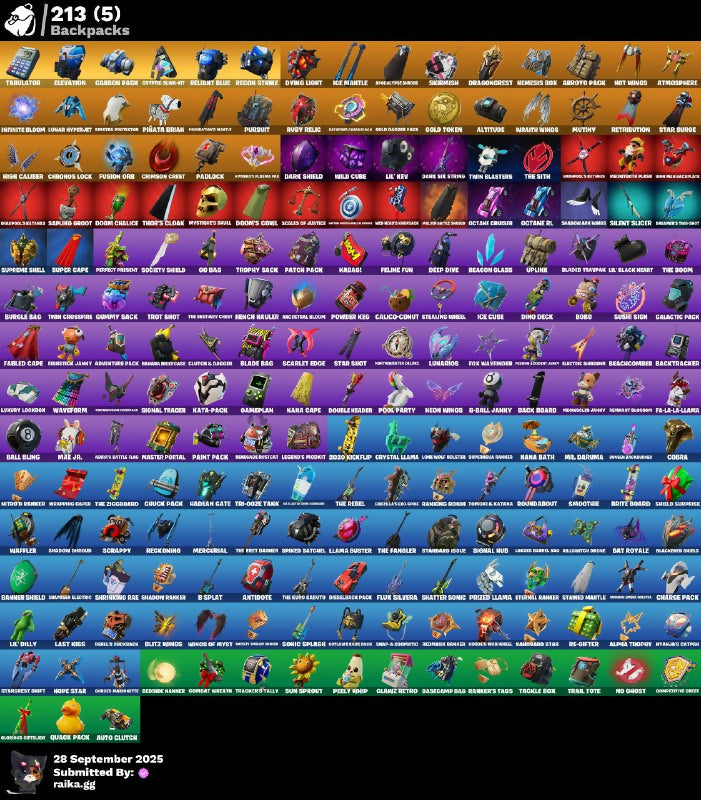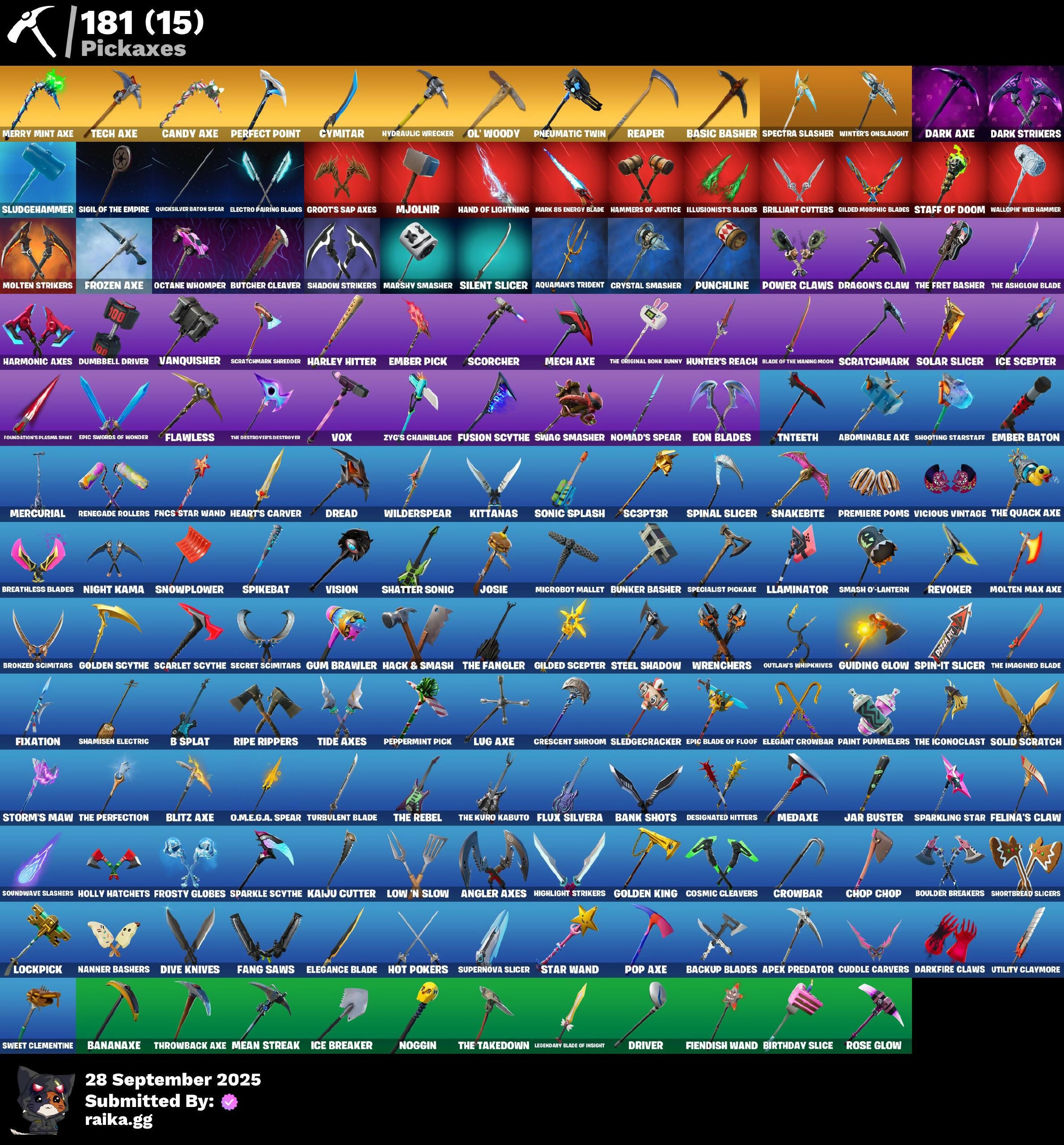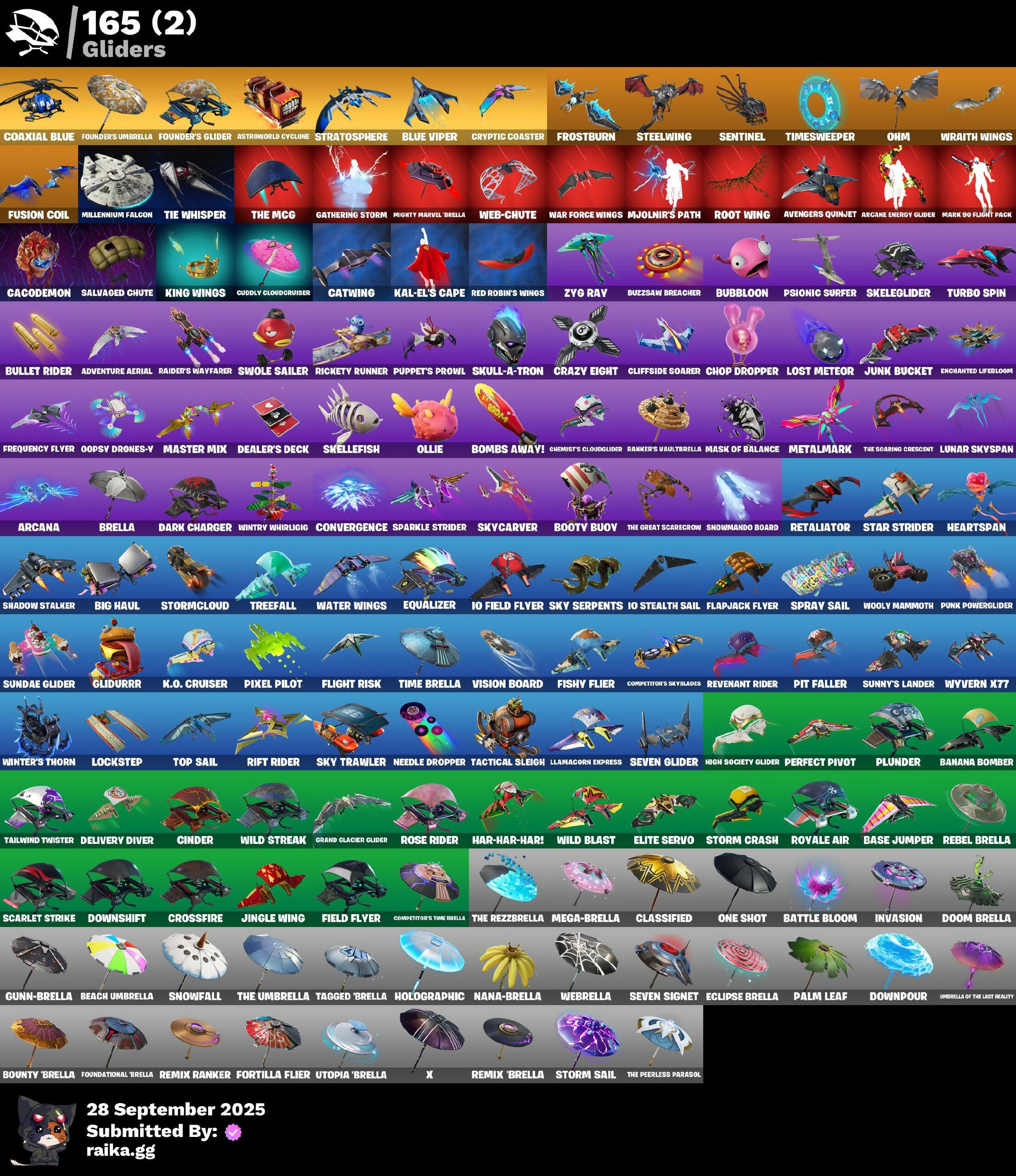 2020 Kickflip, 8-Ball Janay, A Warrior Prepares, Abducted Alien, Abominable Axe, Adventure Aerial, Adventure Back, Agent Peely, Ahsoka Tano, Air Shredder, Alpha Trophy, Altitude, Angler Axes, Antidote, Antonia, Apex Predator, Aqua Fishschool, Aquaman's Trident, Arcana, Arcane Energy Glider, Arroyo Pack, Artifact’s Flushing Pen, Aspen, Assault Trooper, Astroworld Cyclone, Atmosphere, Aura, Auto Clutch, Avengers Quinjet, B Splat, B-Ball vs Scratch, B-Splat, Back Board, Backtracker, Backup Blades, Ball Bling, Banana Bomber, Banana Break, Bananaxe, Bank Shots, Banner Shield, Barbaric Electric, Barbaric Jackalings, Baron's Hoard, Base Jumper, Basecamp Bag, Basic Basher, Battle Bloom, Bay Royale, Beach Bomber, Beach Umbrella, Beachcomber, Beacon Glass, Bear Hug, Bedside Manner, Beep Beep, Bench Mauler, Big Haul, Billy Bounce, Birthday Slice, Blackheart, Blade Bag, Blade of the Waning Moon, Bladed Travelpax, Blitz Axe, Blitz Wings, Blizzabelle, Blowing Bubbles, Blue Viper, Bobo, Boing!, Bolt, Bombs Away!, Bone Team Leader, Boobytrapped, Boogie Down, Booty Buoy, Boulder Breakers, Bounty 'Brella, Breakneck, Breathless Blades, Brella, Brilliant Cutters, Brite Board, Bronzed Scimitars, Bubbloon, Bullet Rider, Bunker Basher, Bunker Jonesy, Burgle Bag, Burpee, Butcher Cleaver, Buzzsaw Breacher, Cacodemon, Calculated, Calico-Cohut, Call Me, Cameo vs Chic, Candy Axe, Cap Kick, Captain Lllamerica, Carbon Commando, Cat Flip, Catalyst, Catwing, Cauldron Chill, Champion Siren, Charge Pack, Chef's Special, Chemist's Cloudglider, Chimichanga!, Choice Knit, Chop Chop, Chop Dropper, Chronos Lock, Chuco Pack, Cinder, Classified, Clean Sweep, Cliffside Soarer, Cloud Striker, Cluck Strut, Clutch & Dagger, Coaxial Blue, Cobra, Coin Flip, Commando, Competitive Crowd, Competitor's Skyblades, Competitor's Time Brella, Conga, Controller Crew, Convergence, Cornelius Crying, Cosmic Cleavers, Crack It, Crazy Eight, Crescent Shroom, Crimson Crest, Crossfire, Crowbar, Crowning Achievement, Cryptic Coaster, Crystal, Crystal Llama, Crystal Smasher, Cuddle Carvers, Cuddly Cloudcruiser, Curling Iron, Cursed Magnet, Cyclo Curl, Cymitar, Dabstand, Dark Axe, Dark Charger, Dark Jonesy, Dark Power Chord, Dark Red Knight, Dark Shield, Dark Side String, Dark Strikers, Dark Wild Card, Darkfire Claws, Deadpool, Dealer's Deck, Deep Dive, Deep End, Delivery Diver, Demi, Designated Hitters, Designer Pack, Diani, Dice Roll, Dino Deck, Dive Knives, Do The 'Split, Doctor Chalice, Doctor Doom, Doom Brella, Doom’s Codex, Double Header, Downpour, Downshift, Doze Dab, Dragon Stance, Dragon's Claw, Dragoncrest, Dread, Dream Feet, Driver, Droop, Dumbbell Driver, Dying Light, Eclipse Brella, Electric Burden, Electro Pairing Blades, Elegance Blade, Elegant Crowbar, Elevation, Elite Servo, Ember, Ember Baton, Ember Pick, Enchanted Lifebloom, Eon Blades, Epic Blade of Floof, Epic Swords of Wonder, Equalizer, Era, Eternal Banker, Eternal Voyager, Expressionism, Extraordinaire, Extraterrestrial, FNCS Star Wand, Fa-La-La-Llama, Fabled Cape, Face Palm, Fade, Family Fukkorn, Fang Saws, Featherweight, Felina, Felina's Claw, Feline Fun, Field Flyer, Fiendish Wand, Fierce, Fish Thicc, Fishstick Janay, Fishy Flier, Fist Bump, Fixation, Fixer, Flaky Feast, Flapjack Flyer, Flashback Breakdown, Flawless, Flight Risk, Flippin' Away, Flux Silvera, Focus, Foil Flex, Fortilla Flier, Foundation's Plasma Spike, Foundational Brella, Founder's Glider, Founder's Umbrella, Fox War Finder, Free Flow, Frequency Flyer, Frostburn, Frosty Globes, Frozen Axe, Fusion, Fusion Coil, Fusion Orb, Fusion Scythe, Galactic Pack, Gale Specialist Maya, Gameplan, Gargolla Sticker, Garrison Pack, Gathering Storm, Gentleman's Dab, Get Funky, Get Griddy, Get Out Of Your Mind, Gilded Morphic Blades, Gilded Scepter, Glavez Retro, Glidurr, Go Bag, Gold & Black Flag, Gold Brutus, Gold Meowscles, Gold Midas, Gold Token, Golden King, Golden Scythe, Golf Clap, Goose’s Wheel, Gothic Sailor, Grand Glacier Glider, Great Breath, Great Creature, Groot, Groot's Sap Axes, Gugimon, Guiding Glow, Gum Brawler, Gummy Sack, Gunay, Gunn-Brella, Hack & Smash, Hammers of Justice, Hand of Lightning, Har-Har-Har!, Harley Hitter, Harley Quinn, Harlowe, Harmonic Axes, Have A Seat, Haven, Heart's Carver, Heartspan, Heimat Buddy, Hello Friend, Heron Stance Hero, High Caliber, High Five, High Society Glider, Highlight Strikers, Hit It, Hog Ops, Holiday Boxy, Holly Hatchets, Holographic, Hoop Master, Hope Star, Hot Marat, Hot Pokers, Hot Wings, Hoverblast Agent, Hula Hoopin', Hunter's Reach, Hybrid, Hydraulic Wrecker, Hype!, IO Field Flyer, IO Stealth Sail, Ice Breaker, Ice Cube, Ice Mantle, Ice Scepter, Illusionist's Blades, Imperial March, Infinite Bloom, Introducing..., Invasion, Iris, It Is Finished, It’s Go Time!, It’s... You?, Jade Blade, Jar Buster, Jaywalking, Jazz Hands, Jennifer Walters, Jet Signals, Jingle Wing, Joey, Josie, Journey vs Hazard, Joztara, Jubilation, Jules, Jump Jets, Jun-Hwan, Junk Bucket, K.O. Cruiser, Kablaa!, Kaden Gate, Kado Thorne, Kaiju Cutter, Kal-El's Cape, Kata-Pack, Keep It Mello, Kellaganto Shade, Keyed Up, Kick Ups, King Wings, Kit, Kittanas, Knaby Lime, Krisabelle, Kymera, Laid Back Shuffle, Last Forever, Last Wings, Laugh It Up, Lazers Laser 3.0, Legendary Blade of Insight, Legend’s Rocket, Lil Split, Lil' Longboat, Lil' Monster, Lil' Prancer, Lil' Saucer, Lil' T-6 Shuttle, Lil’ Black Heart, Lil’ Dilly, Lil’ Kev, Llama Buster, Llaminator, Lllamacorn Express, Lockpick, Lockstep, Lost Meteor, Love Hook Holster, Love It!, Low 'N Slow, Lt. Evergreen, Lt. John Llama, Lug Axe, Luke, Lunar Charge, Lunar Payback, Lunar Skyspan, Lunarios, Luxury Lookdown, Lynx, Mae, Major Mancake, Make A Seat, Mark 85 Energy Blade, Mark 90 Flight Pack, Marshy Smasher, Mask Of Balance, Master Key, Master Mix, Master Portal, Max Jr., Mean Streak, Mech Axe, Medaxe, Mega-Brella, Mercurial, Merry Mint Axe, Metalmark, Mic Drop, Microbot Mallet, Mighty Marvel 'Brella, Millennium Falcon, Mjolnir, M