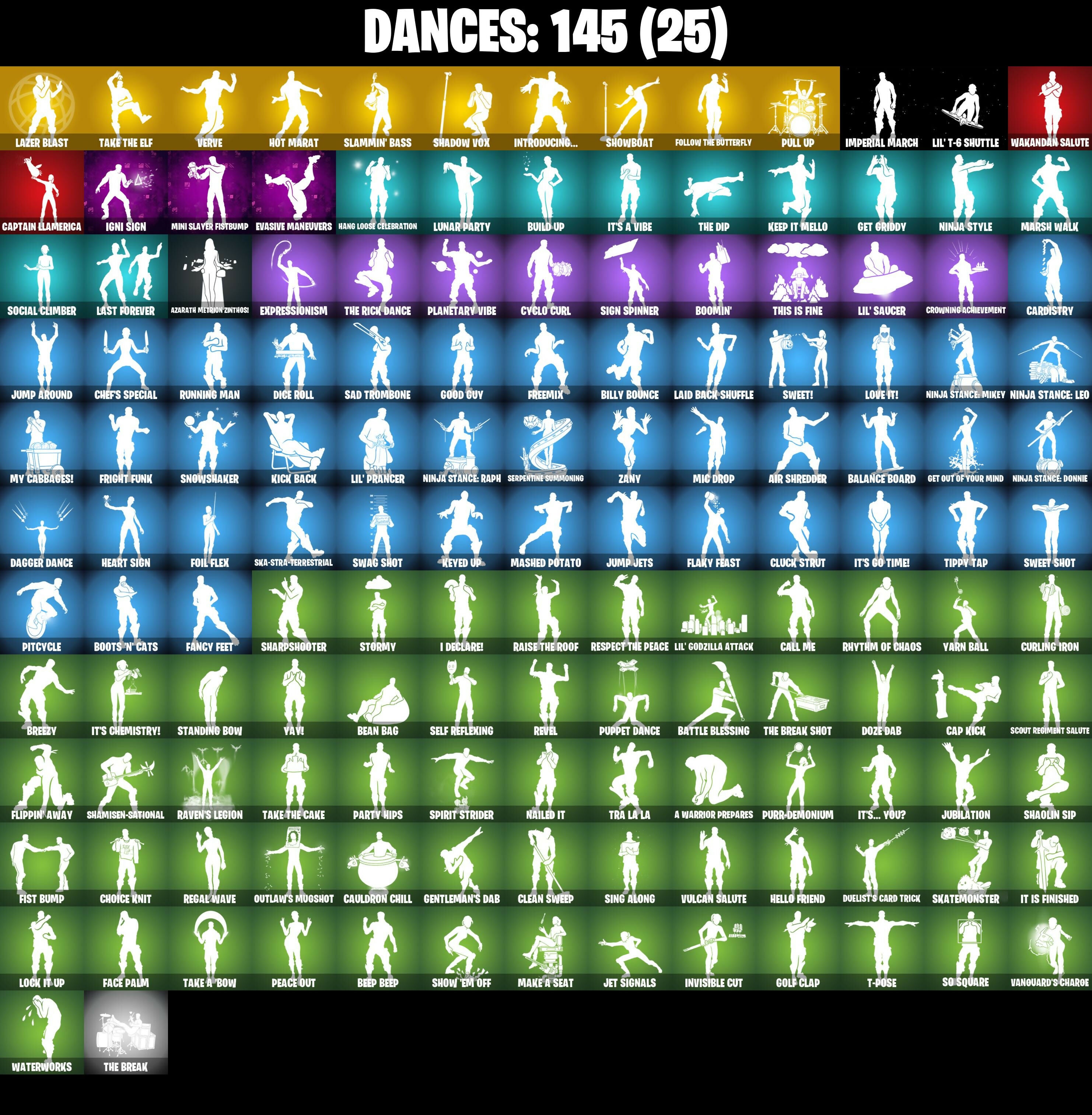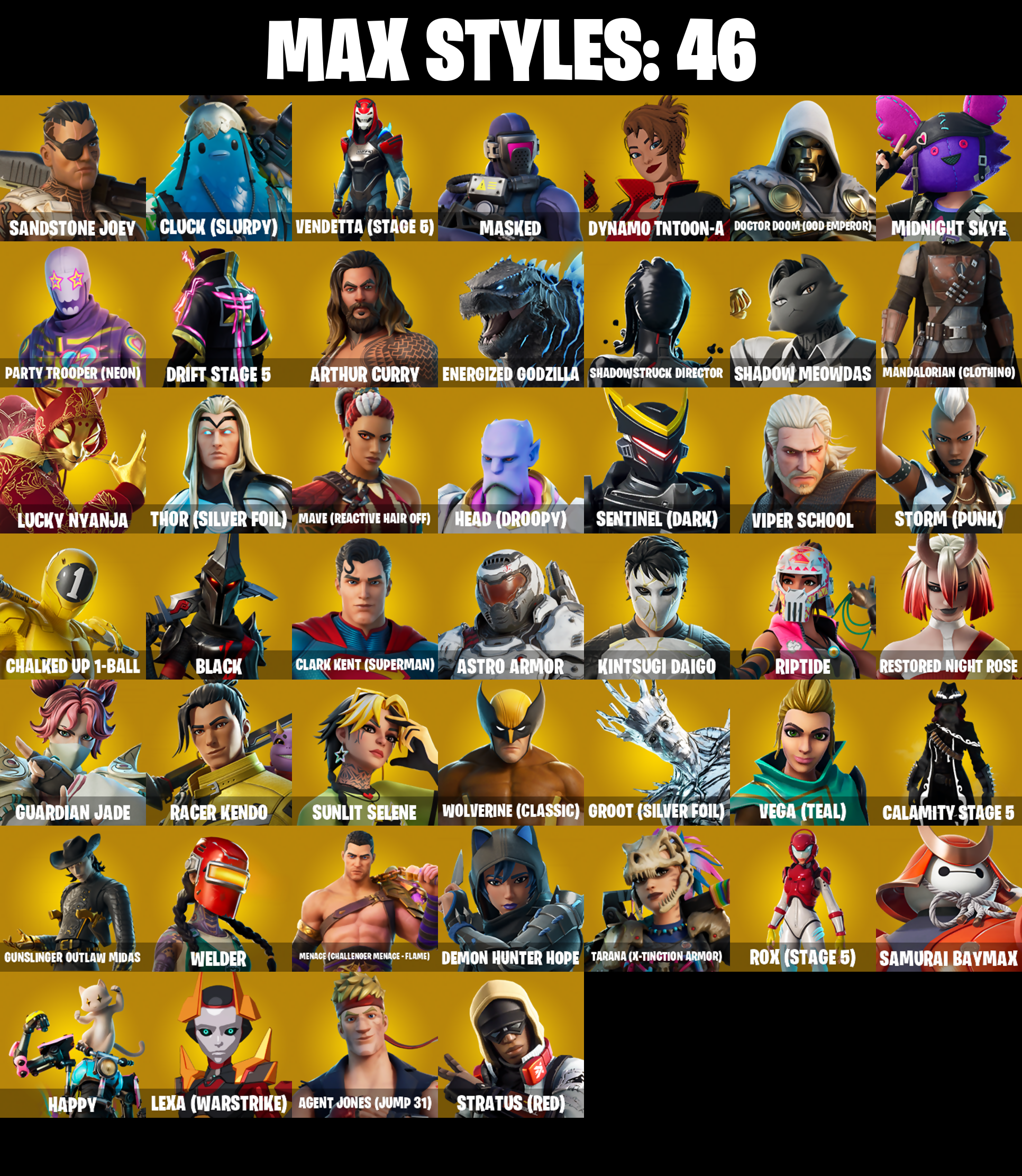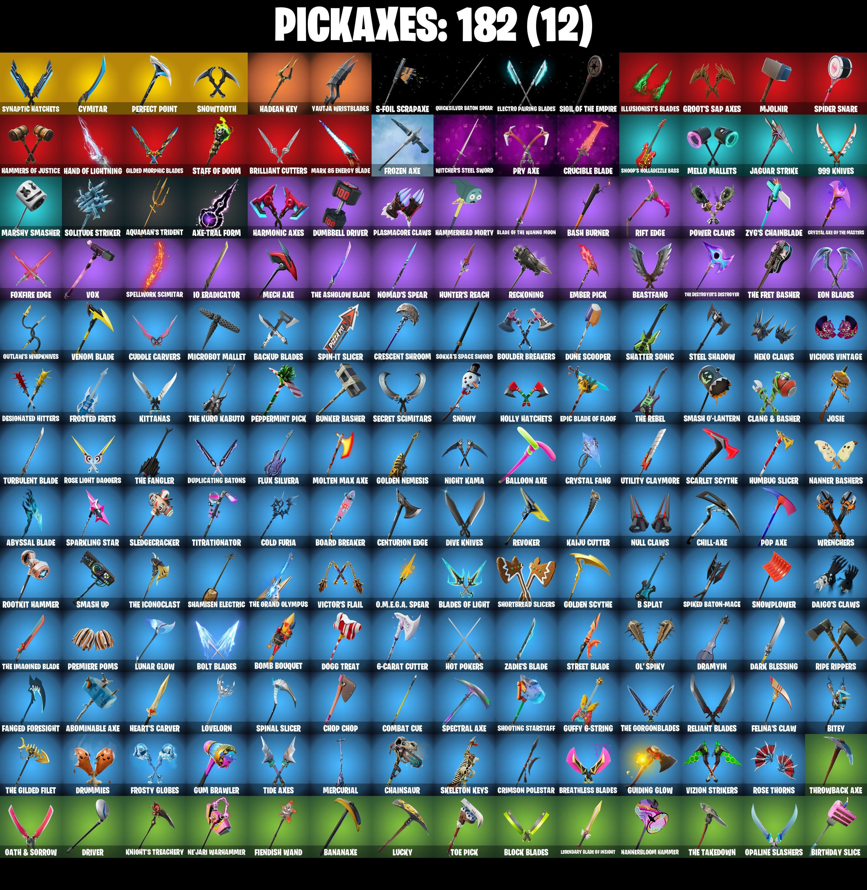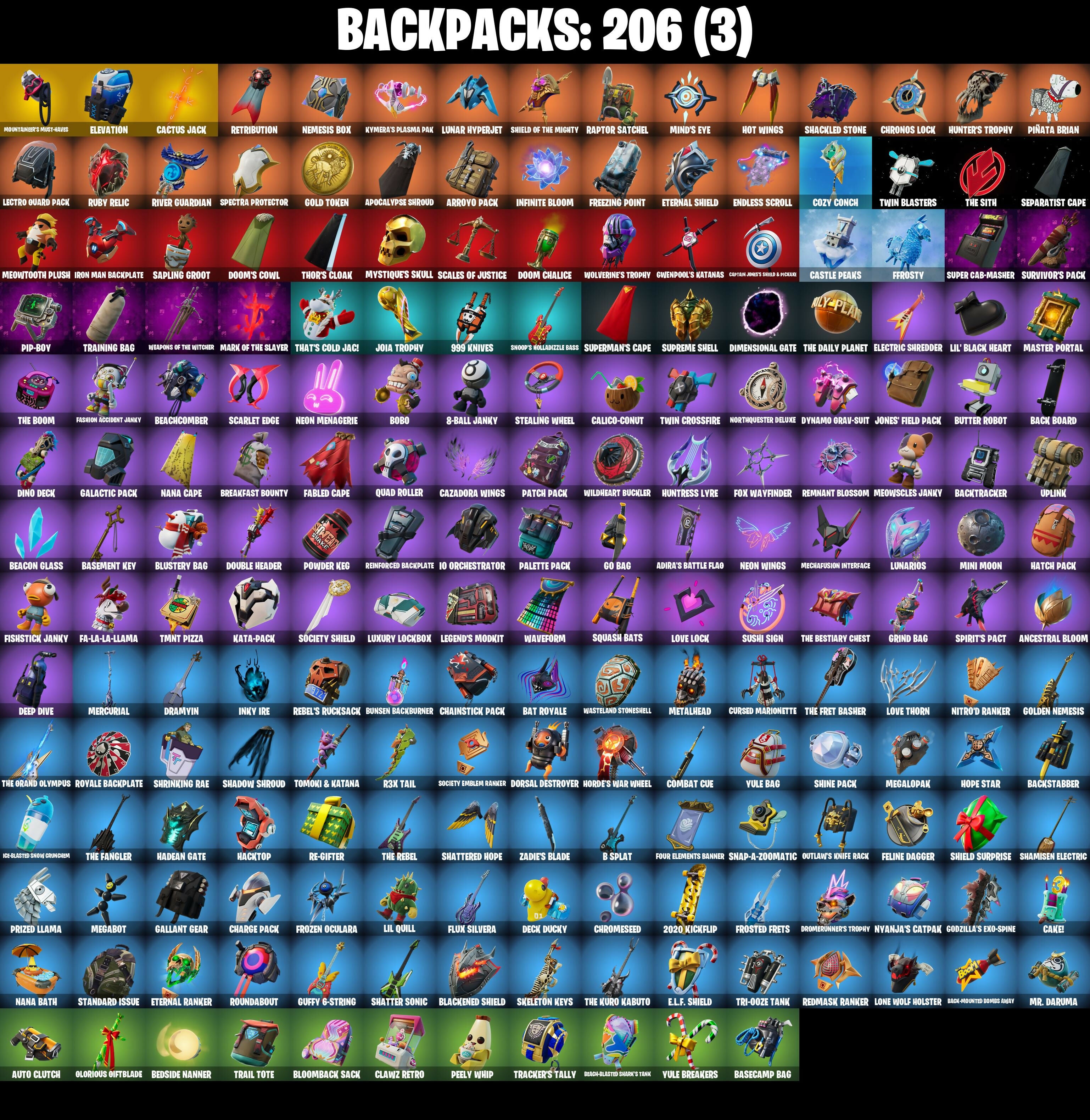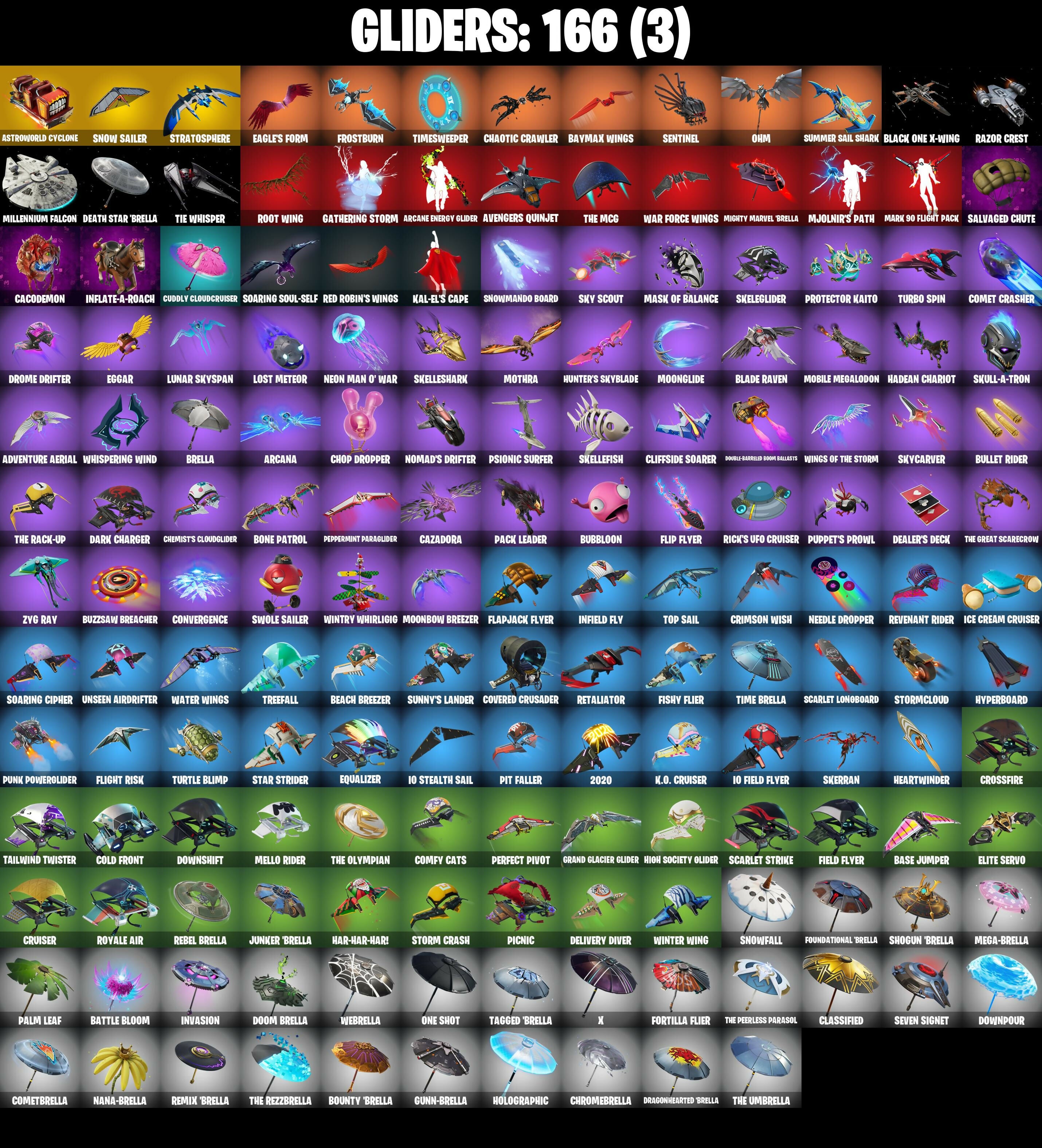 1-Ball, 10 Field Flyer, 10 Stealth Sail, 2020, 2020 Kickflip, 6-Carat Cutter, 8-Ball Janky, 999 Knives, A Warrior Prepares, Abominable Axe, Absenz, Abyssal Blade, Adira's Battle Flag, Adventure Aerial, Agent Jones, Agent Jones (Jump 31), Air Shredder, Ancestral Bloom, Apocalypse Shroud, Aquaman, Aquaman's Trident, Arcana, Arcane Energy Glider, Arctic Adeline, Arroyo Pack, Arthur Curry, Astro Armor, Astroworld Cyclone, Auto Clutch, Avengers Quinjet, Axe-tral Form, Azarath Metrion Zinthos!, B Splat, Back Board, Back-Mounted Bombs Away, Backstabber, Backtracker, Backup Blades, Balance Board, Balloon Axe, Bananaxe, Base Jumper, Basecamp Bag, Basement Key, Bash Burner, Bat Royale, Battle Blessing, Battle Bloom, Baymax Wings, Beach Breezer, Beach-Blasted Shark's Tank, Beachcomber, Beacon Glass, Bean Bag, Beastfang, Bedside Nanner, Beep Beep, Billy Bounce, Birthday Slice, Bitey, Black, Black One X-Wing, Blackened Shield, Blade Raven, Blade of the Waning Moon, Blades of Light, Blizzard Bomber, Block Blades, Bloomback Sack, Blustery Bag, Board Breaker, Bobo, Bolt Blades, Bomb Bouquet, Bone Patrol, Boomin', Boots 'N' Cats, Boulder Breakers, Bounty 'Brella, Brainiac, Breakfast Bounty, Breathless Blades, Breezy, Brella, Brilliant Cutters, Bubbloon, Build Up, Bullet Rider, Bunker Basher, Bunker Jonesy, Bunsen Backburner, Butter Robot, Buzzsaw Breacher, Cacodemon, Cactus Jack, Cake!, Calamity, Calamity Stage 5, Calico-Conut, Call Me, Cap Kick, Captain Clamerica, Captain Jones's Shield & Pickaxe, Cardistry, Cassidy Quinn, Castle Peaks, Cauldron Chill, Cazadora, Cazadora Wings, Centurion, Centurion Edge, Chainsaur, Chainstick Pack, Chalked Up 1-Ball, Chaos Director, Chaotic Crawler, Charge Pack, Chef's Special, Chemist's Cloudglider, Chill-Axe, Choice Knit, Chop Chop, Chop Dropper, Chrome Punk, Chromebrella, Chromeseed, Chronos Lock, Chun-Li, Clang & Basher, Clark Kent, Clark Kent (Superman), Classified, Clawz Retro, Clean Sweep, Cliffside Soarer, Cloud Striker, Cluck, Cluck (Slurpy), Cluck Strut, Cobalt, Codename E.L.F., Cold Front, Cold Furia, Combat Cue, Comet Crasher, Cometbrella, Comfy Cats, Contract Giller, Convergence, Covered Crusader, Cozy Conch, Crescent Shroom, Crimson Polestar, Crimson Wish, Crossfire, Crowning Achievement, Crucible Blade, Cruiser, Crystal Axe of the Masters, Crystal Fang, Cuddle Carvers, Cuddly Cloudcruiser, Curling Iron, Cursed Marionette, Cyclo Curl, Cymitar, D'Ark, DJ Yonder, Dagger Dance, Daigo, Daigo's Claws, Dark Blessing, Dark Charger, Deadfire, Dealer's Deck, Death Star 'Brella, Deck Ducky, Deep Dive, Delivery Diver, Demi, Demon Hunter Hope, Derby Dynamo, Designated Hitters, Diamond Diva, Dice Roll, Dimensional Gate, Dino Deck, Dive Knives, Doctor Doom, Doctor Doom (God Emperor), Doctor Slone, Dogg Treat, Doom Brella, Doom Chalice, Doom Slayer, Doom's Cowl, Dorsal Destroyer, Double Header, Double-Barreled Boom Ballasts, Downpour, Downshift, Doze Dab, Dragonhearted 'Brella, Dramvin, Dramyin, Drift, Drift Stage 5, Driver, Drome Drifter, Dromerunner's Trophy, Drummies, Duelist's Card Trick, Dumbbell Driver, Dune Scooper, Duplicating Batons, Dusty, Dynamo Grav-Suit, Dynamo Tntina, Dynamo Tntoon-A, E.L.F. Shield, Eagle's Form, Eggar, Electric Shredder, Electro Pairing Blades, Elevation, Elite Servo, Ember Pick, Endless Scroll, Energized Godzilla, Eon Blades, Epic Blade of Floof, Equalizer, Era, Eternal Knight, Eternal Ranker, Eternal Shield, Evasive Maneuvers, Expressionism, Fa-La-La-Llama, Fable, Fabled Cape, Face Palm, Fade, Fancy Feet, Fanged Foresight, Fashion Accident Janky, Felina, Felina’s Claw, Feline Dagger, Ffrosty, Field Flyer, Fiendish Wand, Fish Thicc, Fishstick Janky, Fishy Flier, Fist Bump, Flaky Feast, Flapjack Flyer, Fletcher Kane, Flight Risk, Flip Flyer, Flippin' Away, Flux Silvera, Foil Flex, Follow The Butterfly, Fortilla Flier, Foundational 'Brella, Four Elements Banner, Fox Wayfinder, Foxfire Edge, Freemix, Freezing Point, Fright Funk, Frost Squad, Frostbite, Frostburn, Frosted Frets, Frosty Globes, Frozen Axe, Frozen Fishstick, Frozen Nog Ops, Frozen Oculata, Galactic Pack, Gallant Gear, Gathering Storm, Gentleman's Dab, Geralt Of Rivia, Get Griddy, Get Out Of Your Mind, Giddy-Up, Gilded Morphic Blades, Glorious Giftblade, Go Bag, Godzilla Evolved, Godzilla's Exo-Spine, Gold Token, Golden Nemesis, Golden Scythe, Golf Clap, Good Guy, Grand Glacier Glider, Grind Bag, Groot, Groot (Silver Foil), Groot's Sap Axes, Guardian Jade, Guffy 6-String, Guffy G-String, Guggimon, Guiding Glow, Guild, Gum Brawler, Gunn-Brella, Gunslinger Outlaw Midas, Gwenpool's Katanas, Hacktop, Hadean Chariot, Hadean Gate, Hadean Key, Hammerhead Morty, Hammers of Justice, Hand of Lightning, Hang Loose Celebration, Happy, Har-Har-Har!, Harmonic Axes, Hatch Pack, Haxasaur, Head (Droopy), Heart Sign, Heartwinder, Heart’s Carver, Hello Friend, Hero Baymax, High Society Glider, Highwire, Holiday Boxy, Holly Hatchets, Holographic, Hope Star, Horde's War Wheel, Hot Marat, Hot Pokers, Hot Wings, Humbug Slicer, Hunter's Reach, Hunter's Skyblade, Hunter's Trophy, Huntress, Huntress Lyre, Hyperboard, I Declare!, IO Eradicator, Ice Cream Cruiser, Ice-Blasted Snow Crunch'em, Igni Sign, Illusionist's Blades, Imani, Imperial March, Infield Fly, Infinite Bloom, Inflate-A-Roach, Inky Ire, Introducing..., Invasion, Invisible Cut, Io Orchestrator, Iris, Iron Man Backplate, It Is Finished, It's A Vibe, It's Chemistry!, It's Go Time!, It's... You?, Jade, Jaguar Strike, Jennifer Walters, Jet Signals, Joey, Joia Trophy, Jones' Field Pack, Josie, Joss, Jubilation, Jules, Jump Around, Jump Jets, Junker 'Brella, K.O. Cruiser, Kaiju Cutter, Kal-El's Cape, Kata-Pack, Keep It Mello, Kendo, Keyed Up, Kick Back, Kintsugi Daigo, Kit, Kittanas, Knight’s Treachery, Kondor, Krisabelle, Kymera, Kymera's Plasma Pak, Laid Back Shuffle, Lara Croft, Last Forever, Lazer Blast, Lectro Guard Pack, Legend's Modkit, Legendary Blade of Insight, Lexa, Lexa (Warstrike), Lil Quill, Lil' Black Heart, Lil' Godzilla Attac