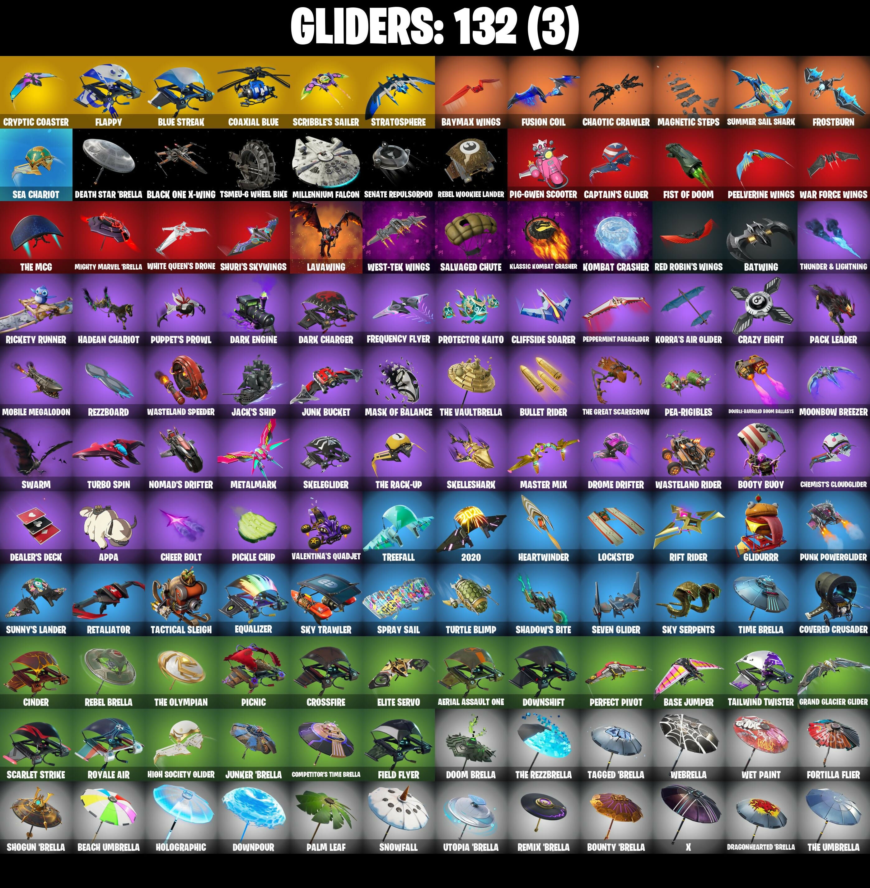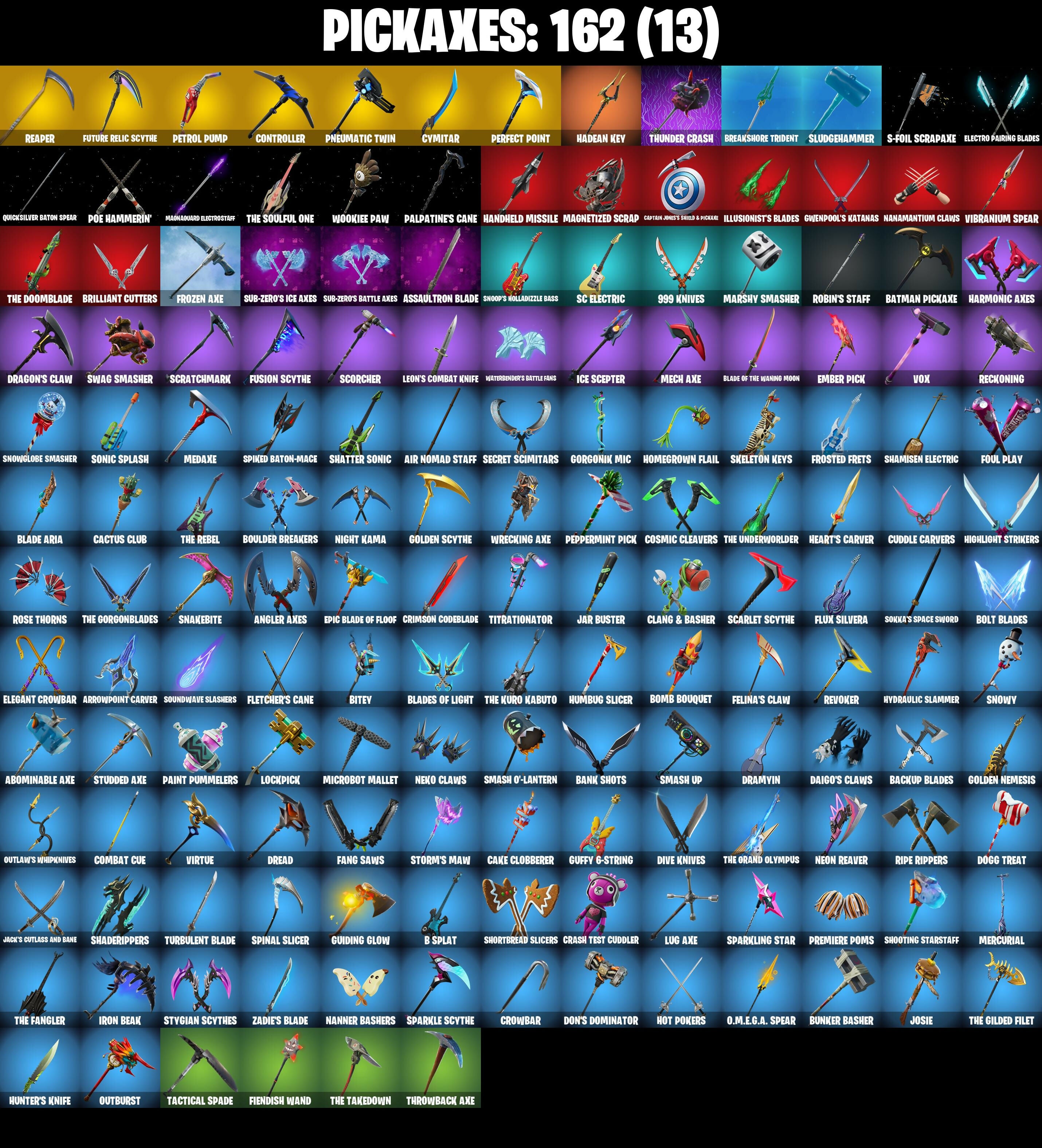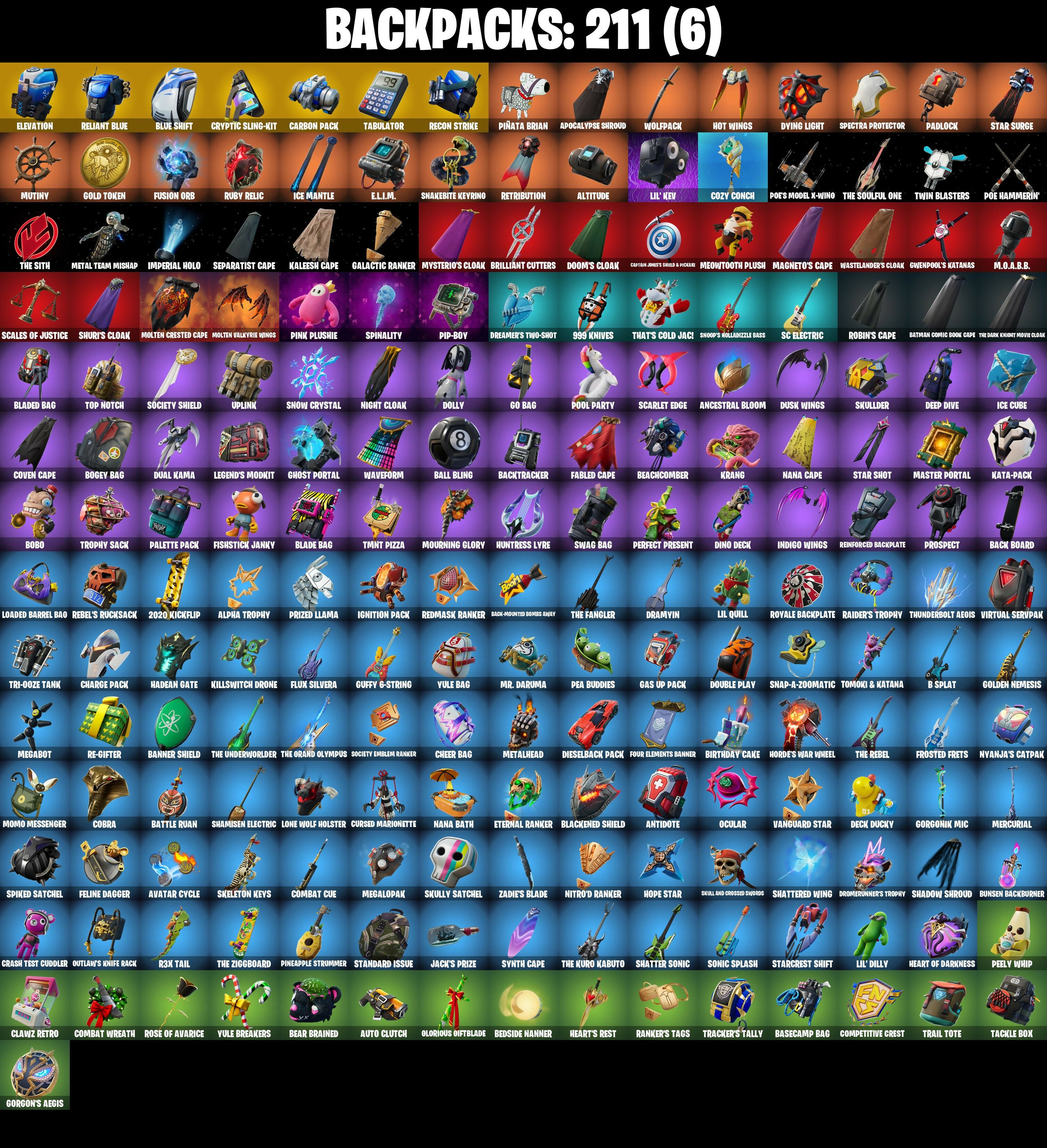 (Snikti), 1-Ball, 2020, 2020 Kickflip, 4 Hype!, 8-Ball Vs Scratch, 999 Knives, A.I.M., Aang, Aang's Air Sphere, Abominable Axe, Aerial Assault One, Air Nomad Staff, Alpha Trophy, Altitude, Ancestral Bloom, Angler Axes, Antidote, Aphrodite, Apocalypse Shroud, Appa, Apprentice Evie, Arrowpoint Carver, Artemis, Asmodeus, Assaultron Blade, Auto Clutch, Avatar Cycle, Avatar State Aang, Avatar's Flourish, B Splat, Back Board, Backtracker, Backup Blades, Balanced, Ball Bling, Bank Shots, Banner Shield, Baron's Hoard, Base Jumper, Basecamp Bag, Batman Comic Book Cape, Batman Comic Book Outfit, Batman Pickaxe, Battle Blessing, Battle Call, Battle Roan, Batwing, Baymax Wings, Beach Umbrella, Beachcomber, Bear Brained, Bedside Nanner, Bi-Han, Big Dill, Birdarang Flourish, Birthday Cake, Bitey, Black Knight T-60 Power Armor, Black One X-Wing, Black Panther (Shuri), Black Queen, Black Werewolf, Blackened Shield, Blackheart, Blackheart (Stage 8), Blacklight, Blade Aria, Blade Bag, Blade of the Waning Moon, Bladed Bag, Blades of Light, Blazing Fire Cerberus, Bloomin' Bouquet, Blowing Bubbles, Blue Joss, Blue Shift, Blue Streak, Blue Striker, Blue Team Leader, Bobo, Bogey Bag, Boing!, Bolt Blades, Bomb Bouquet, Boosting Ki, Booty Buoy, Boulder Breakers, Bounty 'Brella, Breakshore Trident, Brilliant Cutters, Brite Moves, Brite Raider, Bullet Rider, Bunker Basher, Bunker Jonesy, Bunsen Backburner, Cactus Club, Cake Clobberer, Calamity, Calamity Stage 5, Calculated, Call Me, Cameo Vs Chic, Camo War Machine, Captain Blamerica, Captain Jones, Captain Jones's Shield & Pickaxe, Captain's Glider, Carbon Commando, Carbon Pack, Cassidy Quinn, Cat Flip, Catalyst, Catrina, Cauldron Chill, Cerberus, Chalked Up 1-Ball, Chaos Director, Chaotic Crawler, Charge Pack, Cheer Bag, Cheer Bolt, Chemist's Cloudglider, Cinder, Clang & Basher, Classic Peelverine, Clawz Retro, Clean Sweep, Cliffside Soarer, Cloud Striker, Cluck Strut, Coaxial Blue, Cobalt, Cobra, Codsworth's Cleanup, Combat Cue, Combat Wreath, Competitive Crest, Competitor's Time Brella, Conch Call, Conga, Controller, Cosmic Cleavers, Coven Cape, Covered Crusader, Cozy Conch, Crash Test Cuddler, Crazy Eight, Crimson Godblade, Criss Cross, Crossfire, Crowbar, Crowning Achievement, Cryptic Coaster, Cryptic Sling-Kit, Cuddle Carvers, Cursed Marionette, Cymitar, D-1000, DJ Yonder, Dabstand, Daigo, Daigo's Claws, Dance Monkey, Dark Charger, Dark Engine, Dark Gwenpool, Darklands Brite Raider, Dealer's Deck, Death Star 'Brella, Deck Ducky, Deep Dab, Deep Dive, Demi, Demon Hunter Hope, Dieselback Pack, Dillinger The Gherk, Dino Deck, Dire, Disassemble, Dive Knives, Dogg Treat, Dolly, Don's Dominator, Doom, Doom Brella, Doom's Cloak, Doom's Domain, Double Play, Double Up, Double-Barreled Boom Ballista, Downpour, Downshift, Doze Dab, Dragon Stance, Dragon's Claw, Dragonhearted 'Brella, Dramvin, Dramyin, Dread, Dream, Dreamer's Two-Shot, Drome Drifter, Dromerunner's Trophy, Droop, Dual Kama, Duelist's Card Trick, Dusk, Dusk Knight, Dusk Wings, Dying Light, Dynamo TNTina, Dynamo Tntoon-A, E.L.I.M., Eagle, Electro Pairing Blades, Electro Swing, Elegant Crowbar, Elevation, Elite Servo, Elysian Artemis, Ember, Ember Pick, Emma Frost, Emperor Palpatine, Epic Blade of Floof, Equalizer, Eternal Ranker, Fable, Fabled Cape, Face Palm, Fang Saws, Fastball, Featherweight, Feel The Force, Felina, Felina's Claw, Feline Dagger, Field Flyer, Fiendish Wand, Finger Guns, Finger Wag, Fire Show, Fireworks Salvo, Fishstick Janky, Fist Bump, Fist Of Doom, Flamenco, Flappy, Fletcher Kane, Fletcher's Cane, Flippin' Away, Flux Silvera, Foil Flex, Force Lightning, Fortilla Flier, Foul Play, Four Elements Banner, Free Flow, Frequency Flyer, Frostburn, Frosted Frets, Frozen Axe, Frozen Treat Cart, Full Moon Fletcher Kane, Fusion, Fusion Coil, Fusion Orb, Fusion Scythe, Future Relic Scythe, Galactic Ranker, Gas Up Pack, General Grievous, Gentleman's Dab, Get Funky, Ghost Portal, Ghoul Trooper, Giddy-Up, Glidurrr, Glorious Giftblade, Go Bag, Gold Token, Golden Nemesis, Golden Scythe, Golf Clap, Gorgon's Aegis, Gorgonik Mic, Grand Glacier Glider, Ground Pound, Guardian Jade, Guffy 6-String, Guffy G-String, Guiding Glow, Gunslinger Outlaw Midas, Gwen-Step, Gwenpool, Gwenpool's Katanas, Hadean Chariot, Hadean Gate, Hadean Key, Hades, Handheld Missile, Harmonic Axes, Haylee Skye, Heart Of Darkness, Heart's Carver, Heart's Rest, Heartwinder, Hellfire Dance, Hello Friend, Hero Baymax, High Five, High Society Glider, Highlight Strikers, Holiday Boxy, Holographic, Homegrown Flail, Hootenanny, Hope Star, Horde's War Wheel, Hot Marat, Hot Pokers, Hot Wings, Hula Hoopin', Humbug Slicer, Hunter's Knife, Huntress Lyre, Hybrid, Hybrid (Stage 4), Hydraulic Slammer, I Declare!, Ice Cube, Ice King (Gold), Ice Mantle, Ice Scepter, Ignition Pack, Illusionist's Blades, Illusory Mysterio, Immortal Form, Immortal Zeus, Imperial Holo, Indigo Wings, Introducing..., Invisible Cut, Iron Beak, It's Chemistry!, It's Go Time!, Jack's Cutlass and Bane, Jack's Prize, Jack's Ship, Jade, Jar Buster, Jaywalking, Jet Signals, Jing, Josie, Joss, Journey Vs Hazard, Jump Jets, Junk Bucket, Junker 'Brella, Kaleesh Cape, Kata-Pack, Keep It Mello, Keisha Cross, Kendo, Killswitch, Killswitch Drone, Kintsugi Daigo, Klassic Kombat Crasher, Kombat Crasher, Korra, Korra's Air Glider, Krang, Kuno, Laguna, Laid Back Shuffle, Lavawing, Leafy Longboardin', Legend's Modkit, Leon's Combat Knife, Lil Quill, Lil' Dilly, Lil' Godzilla Attack, Lil' Key, Lil' Resistance Bomber, Lina Scorch, Loaded Barrel Bag, Lockpick, Lockstep, Lone Wolf Holster, Lt. Evergreen, Lucky Nyanja, Lug Axe, Lynx, Lynx (Stage 4 - No Ponytail), M.O.A.B.B., Magaquoard Electrostaff, Magmatic Poseidon, Magnetic Steps, Magnetized Scrap, Magneto, Magneto's Cape, Make A Seat, Marshy Smasher, Mask Of Balance, Master Key, Master Mix, Master Portal, Mech Axe, Medaxe, Medusa, Megabot, Megalo Don, Megalopak, Meowdas, Meowtooth Plush, Mercurial, Metal Team Mishap, Metalhead, Metalmark, Mic Dro