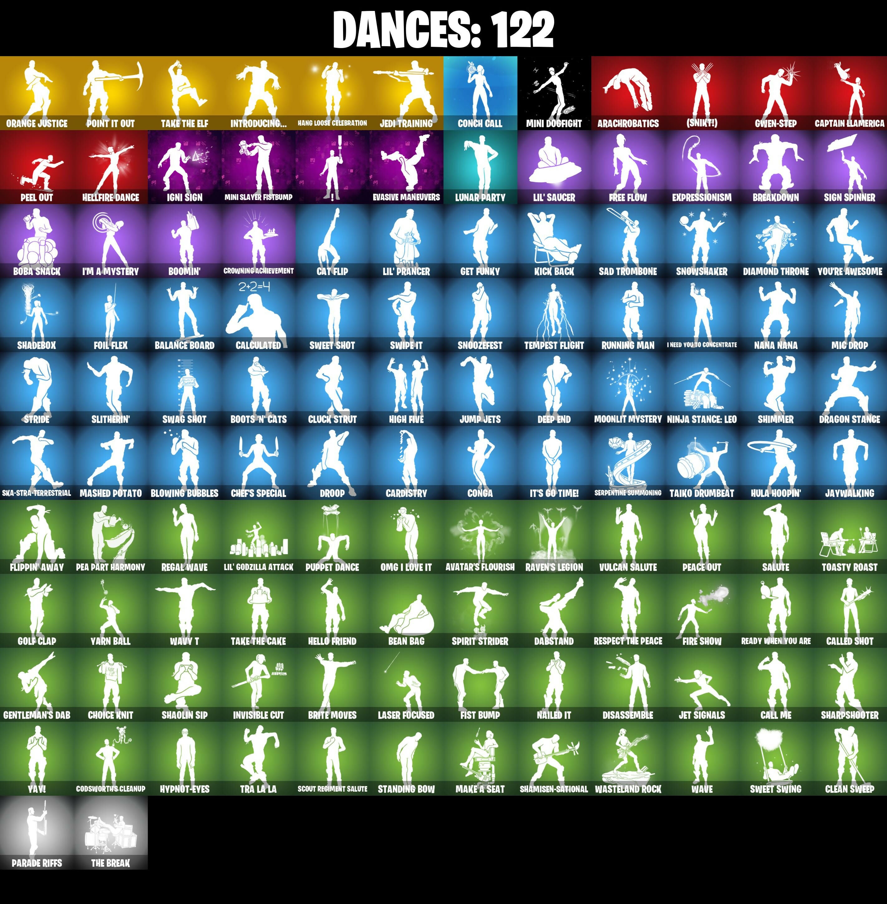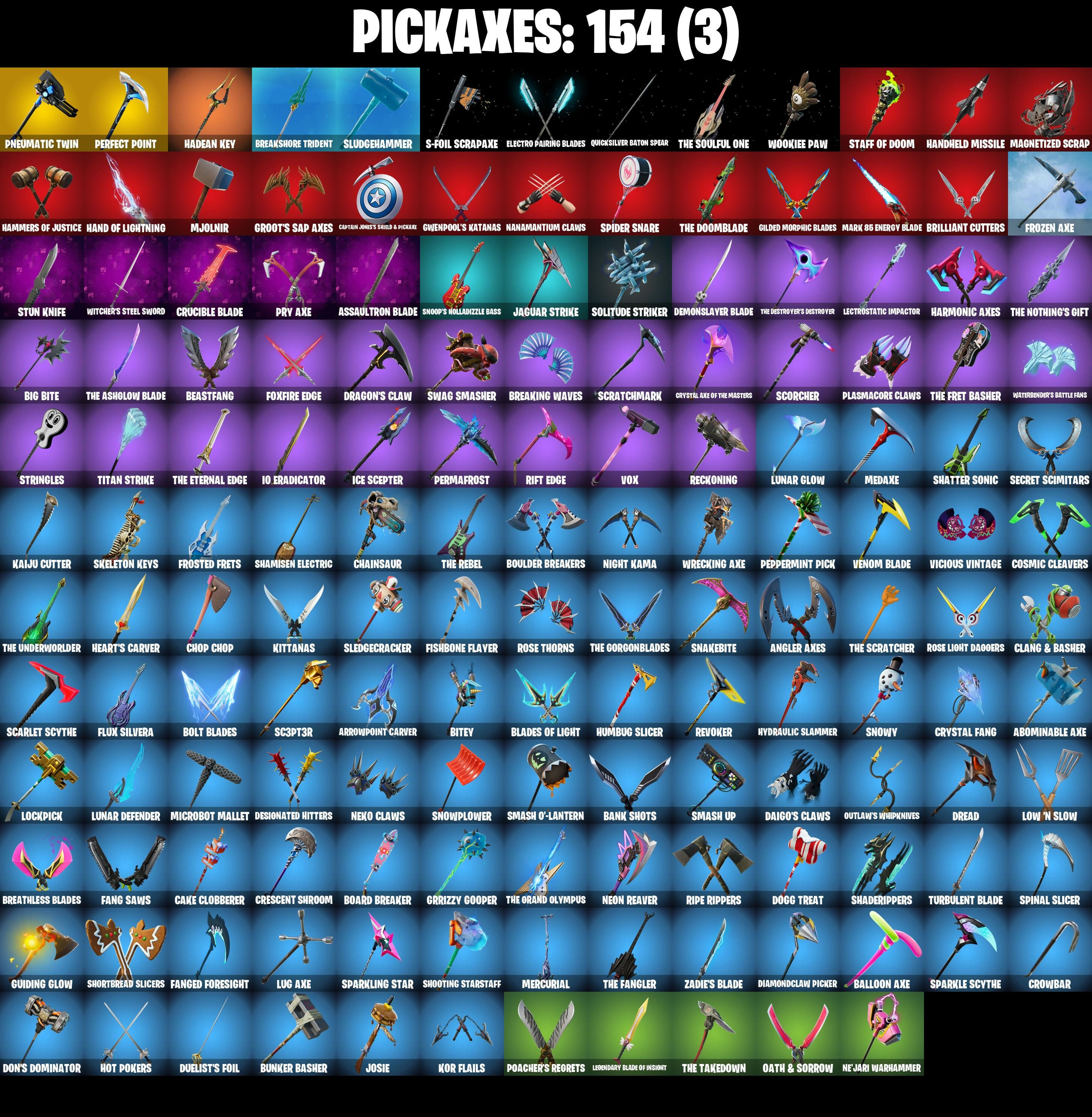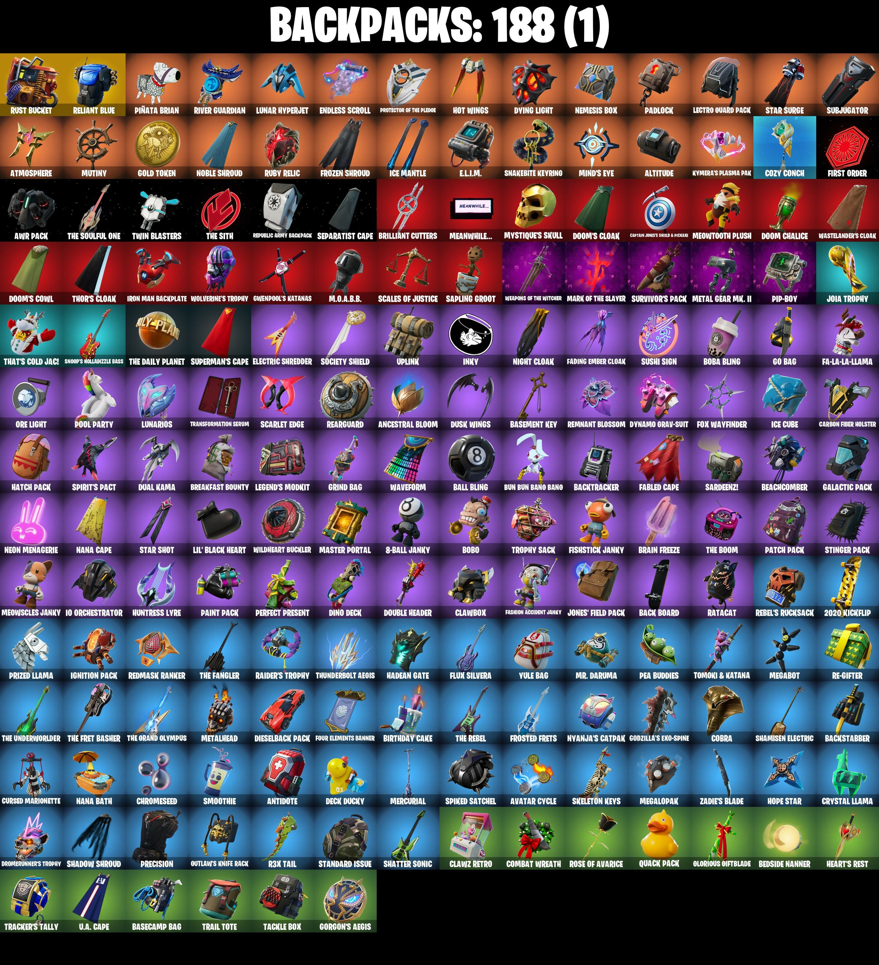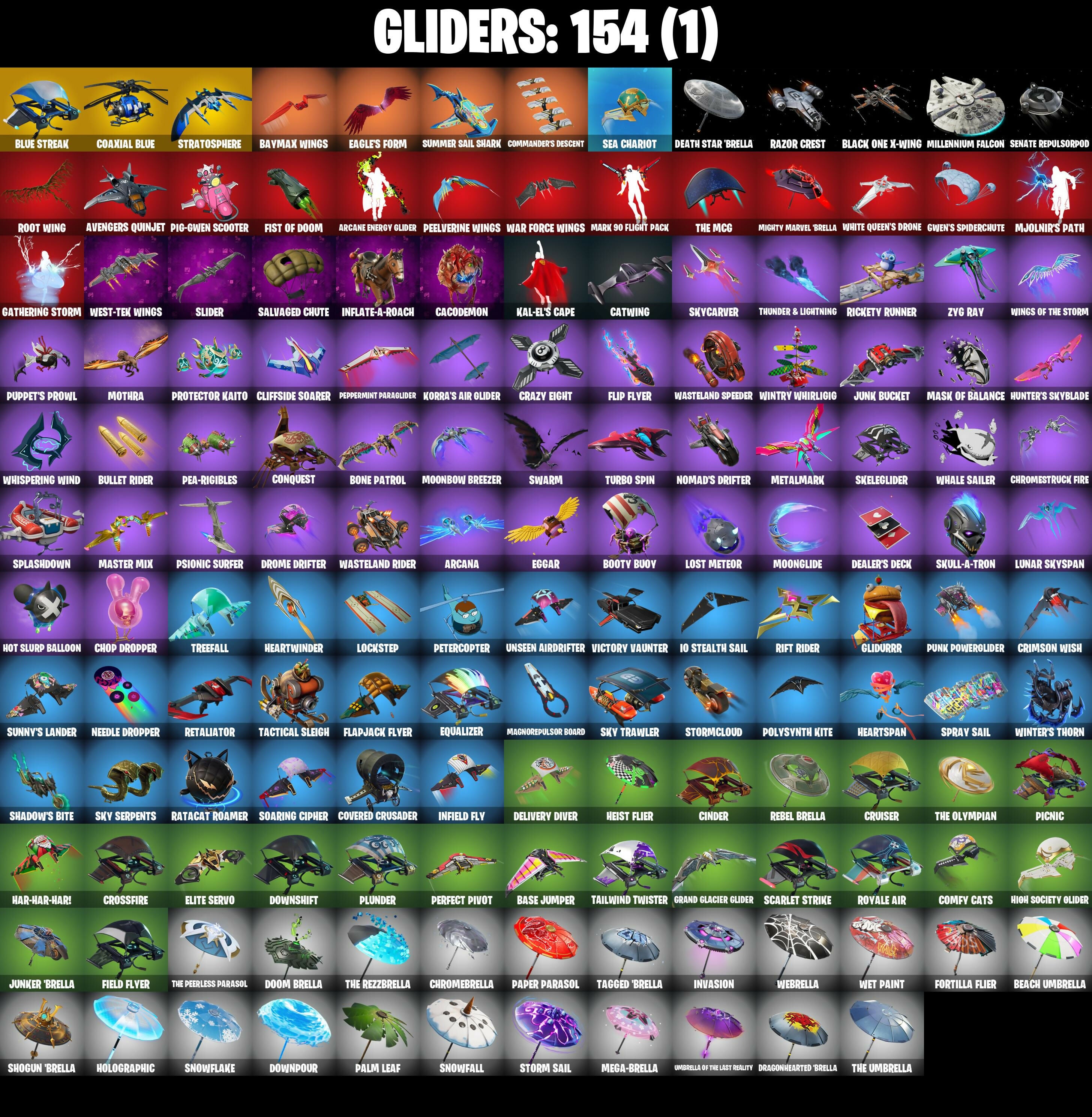 (SNIKT!), 2020 Kickflip, 8-Ball Janky, 8-Ball Vs Scratch, A.I.M., AWR Pack, Abominable Axe, Agent Jones, Agent Jones (Jump 31), Altitude, Ancestral Bloom, Angler Axes, Antidote, Aphrodite, Arachrobatics, Arcana, Arcane Energy Glider, Arctic Adeline, Arrowpoint Carver, Artemis, Ascension Nezumi, Assaultron Blade, Astro Armor, Atmosphere, Avatar Cycle, Avatar's Flourish, Avengers Quinjet, Back Board, Backstabber, Backtracker, Balance Board, Balanced, Ball Bling, Balloon Axe, Bank Shots, Base Jumper, Basecamp Bag, Basement Key, Baymax Wings, Beach Umbrella, Beachcomber, Bean Bag, Beastfang, Bedside Nanner, Big Bite, Birthday Cake, Bitey, Black One X-Wing, Blackheart, Blackheart (Stage 8), Blades of Light, Blazing Fire Cerberus, Blowing Bubbles, Blue Streak, Blue Team Leader, Board Breaker, Boba Bling, Boba Snack, Bobo, Bolt Blades, Bone Patrol, Boomin', Boots 'N' Cats, Booty Buoy, Boulder Breakers, Brain Freeze, Breakdown, Breakfast Bounty, Breaking Waves, Breakshore Trident, Breathless Blades, Brilliant Cutters, Brite Moves, Brite Raider, Bubblegum Highwire, Bullet Rider, Bullpen Brawler Dusty, Bun Bun Bano Bano, Bunker Basher, Bunker Jonesy, Bytes, Bytes (Lone Traveler), Cacodemon, Cake Clobberer, Calamity, Calamity Stage 5, Calculated, Call Me, Called Shot, Captain Jones, Captain Jones's Shell & Pickaxe, Captain Levi, Captain Llamerica, Carbon Fiber Holster, Cardistry, Cat Flip, Catalyst, Catwing, Cerberus, Chainsaur, Charlotte, Chef's Special, Choice Knit, Chop Chop, Chop Dropper, Chrome Punk, Chromebrella, Chromeseed, Chromestruck Fire, Cinder, Clang & Basher, Clark Kent, Clark Kent (Superman), Clawbox, Clawz Retro, Clean Sweep, Cliffside Soarer, Club President Helsie, Cluck, Cluck Strut, Coaxial Blue, Cobra, Codsworth's Cleanup, Combat Wreath, Comfy Cats, Commander's Descent, Conch Call, Conga, Conquest, Cosmic Cleavers, Covered Crusader, Cozy Conch, Crazy Eight, Crescent Shroom, Crimson Wish, Crossfire, Crowbar, Crowning Achievement, Crucible Blade, Cruiser, Crystal Axe of the Masters, Crystal Fang, Crystal Llama, Cursed Marionette, DJ Yonder, Dabstand, Daigo, Daigo's Claws, Dealer's Deck, Death Star 'Brella, Deck Ducky, Deep End, Delivery Diver, Demi, Demon Hunter Hope, Demonslayer Blade, Designated Hitters, Diamond Throne, Diamondclaw Picker, Dieselback Pack, Dino Deck, Disassemble, Doctor Doom, Doctor Doom (God Emperor), Doctor Slone, Dogg Treat, Don's Dominator, Doom, Doom Brella, Doom Chalice, Doom Slayer, Doom's Cloak, Doom's Cowl, Double Header, Downpour, Downshift, Dragon Stance, Dragon's Claw, Dragonhearted 'Brella, Dread, Drift, Drift Stage 5, Drome Drifter, Dromerunner's Trophy, Droop, Dual Kama, Duelist's Foil, Dusk, Dusk Wings, Dusty, Dying Light, Dynamo Grav-Suit, E.L.I.M., Eagle's Form, Eggar, Electric Shredder, Electro Pairing Blades, Elite Servo, Ember, Ember (Night), Emma Frost, Endless Scroll, Energized Godzilla, Enforcer, Equalizer, Eren Jaeger, Evasive Maneuvers, Expressionism, Fa-La-La-Llama, Fable, Fabled Cape, Fading Ember Cloak, Fang Saws, Fanged Foresight, Fashion Accident Janky, Field Flyer, Fire Show, First Order, Fishbone Flayer, Fishstick Janky, Fist Bump, Fist of Doom, Flapjack Flyer, Flip Flyer, Flippin' Away, Flux Silvera, Foil Flex, Fortilla Flier, Four Elements Banner, Fox Wayfinder, Foxfire Edge, Free Flow, Frosted Frets, Frozen Axe, Frozen Shroud, Galactic Pack, Gathering Storm, Gentleman's Dab, Geralt Of Rivia, Get Funky, Giddy-Up, Gilded Morphic Blades, Glidurr, Glorious Giftblade, Go Bag, Godzilla Evolved, Godzilla's Exo-Spine, Gold Token, Golf Clap, Gorgon's Aegis, Grand Glacier Glider, Grind Bag, Groot, Groot (Silver Foil), Groot's Sap Axes, Grriz, Grrizzy Gooper, Guardian Jade, Guggimon, Guiding Glow, Gwen's Spiderchute, Gwen-Step, Gwenpool, Gwenpool's Katanas, Hadean Gate, Hadean Key, Hammers of Justice, Hand of Lightning, Handheld Missile, Hang Loose Celebration, Har-Har-Har!, Harmonic Axes, Hatch Pack, Heart's Carver, Heart's Rest, Heartbreaker Aphrodite, Heartspan, Heartwinder, Heist Flier, Hellfire Dance, Hello Friend, Helsie, Hero Baymax, High Five, High Society Glider, Highwire, Holiday Boxy, Holographic, Hope, Hope Star, Hot Pokers, Hot Slurp Balloon, Hot Wings, Hula Hoopin', Humbug Slicer, Hunter's Skyblade, Huntress, Huntress Lyre, Hybrid, Hybrid (Stage 4), Hydraulic Slammer, Hypnot-Eyes, I Need You To Concentrate, I'm A Mystery, IO Orchestrator, IO Stealth Sail, Ice Cube, Ice King (Gold), Ice Mantle, Ice Scepter, Igni Sign, Ignition Pack, Imani, Infield Fly, Inflate-A-Roach, Inky, Introducing..., Invasion, Invisible Cut, Io Eradicator, Iron Man Backplate, It's Go Time!, Jade, Jaguar Strike, Jaywalking, Jedi Training, Jennifer Walters, Jet Signals, Joey, Joia Trophy, Jones' Field Pack, Josie, Journey Vs Hazard, Juke, Jump Jets, Junk Bucket, Junker 'Brella, Kaiju Cutter, Kal-El's Cape, Kendo, Kick Back, Kintsugi Daigo, Kittanas, Kondor, Kor Flails, Korra, Korra's Air Glider, Kuno, Kymera, Kymera's Plasma Pak, Lara Croft, Laser Focused, Lectro Guard Pack, Lectrostatic Impactor, Legend's Modkit, Legendary Blade of Insight, Lennox Rose, Lil' Black Heart, Lil' Godzilla Attack, Lil' Prancer, Lil' Saucer, Lockpick, Lockstep, Lost Meteor, Low 'n Slow, Lt. Evergreen, Lucky Nyanja, Lug Axe, Lunar Defender, Lunar Glow, Lunar Hyperjet, Lunar Party, Lunar Skyspan, Lunarios, Lynx, Lynx (Stage 4 - No Ponytail), M.O.A.B.B., Magnetized Scrap, Magnorepulsor Board, Make A Seat, Mancake, Mandalorian, Mark 86 Energy Blade, Mark 90 Flight Pack, Mark of the Slayer, Mashed Potato, Mask of Balance, Massai, Master Key, Master Mix, Master Portal, Mave, Mave (Reactive Hair Off), Meanwhile..., Medaxe, Medusa, Mega-Brella, Megabot, Megalo Don, Megalopak, Meow Skulls, Meowscles Janky, Meowtooth Plush, Mercurial, Metal Gear Mk. II, Metalhead, Metalmark, Mic Drop, Microbot Mallet, Mighty Marvel 'Brella, Mikasa Ackermann, Millennium Falcon, Mind's Eye, Mini Dogfight, Mini Slayer Fistbump, Mizuki, Mjolnir, Mjolnir's Path, Montague, Moonbow Breezer, Moonglide, Moonli
