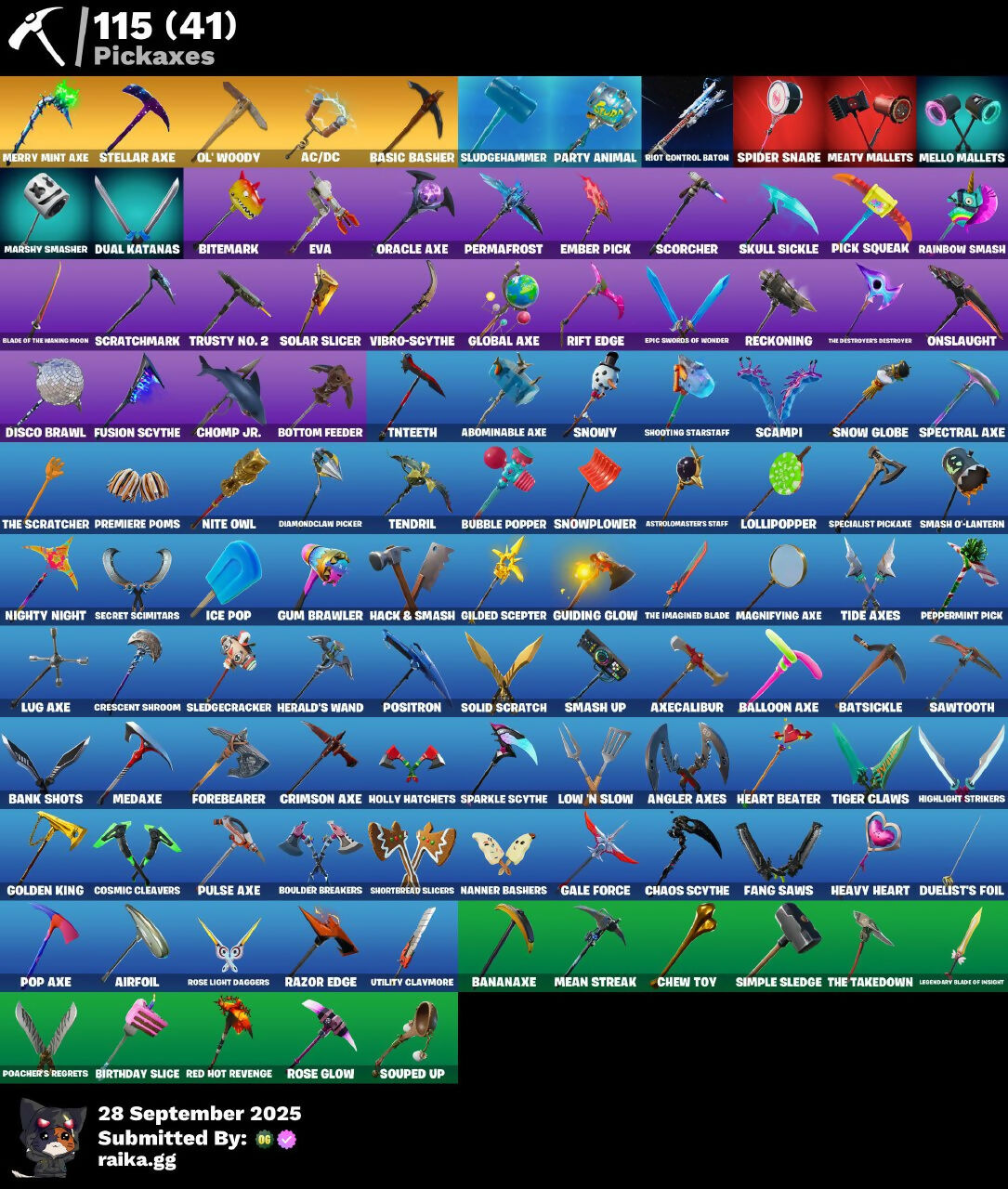 8-Ball vs Scratch, AC/DC, Abominable Axe, Absolute Zero, Abstrakt, Agent Peely, Airfoil, Angler Axes, Arctic Adeline, Astrolomaster's Staff, Axecalibur, Balloon Axe, Bananaxe, Bank Shots, Bao Bros, Basic Basher, Batsickle, Battlehawk, Beef Boss, Birthday Slice, Bitemark, Black Knight, Blade Of The Waning Moon, Blue Squire, Bottom Feeder, Boulder Breakers, Brite Bomber, Brite Gunner, Bronto, Bubble Popper, Bushranger, Calamity, Cameo vs Chic, Candyman, Carbide, Catalyst, Chaos Agent, Chaos Scythe, Chew Toy, Chomp Jr., Circuit Breaker, Cosmic Cleavers, Crackabella, Crackshot, Crescent Shroom, Crimson Axe, Crimson Scout, DJ Vonder, Dark Rex, Dark Vanguard, Dark Voyager, Deadpool, Diamondclaw Picker, Dire, Disco Brawl, Doggo, Drift, Dual Katanas, Duelist's Foil, Dusk, Elite Agent, Ember Pick, Epic Swords Of Wonder, Eternal Voyager, Eva, Fable, Fade, Fang Saws, Fireworks Team Leader, Flytrap, Forebearer, Fusion, Fusion Scythe, Galaxy, Gale Force, Gear Specialist Maya, Giddy-Up, Gilded Scepter, Global Axe, Gold Brutus, Gold Meowscles, Gold Midas, Golden King, Guaco, Guiding Glow, Gum Brawler, Hack & Smash, Heart Beater, Heavy Heart, Herald's Wand, Highlight Strikers, Holiday Boxy, Hollowhead, Holly Hatchets, Hope, Huntress, Hyperion, Ice Pop, Iris, Jackie, Jade Racer, Jellie, Jolly Jammer, Journey vs Hazard, Jungle Scout, Krisabelle, Kylo Ren, Legendary Blade Of Insight, Leviathan, Lil Whip, Llion, Lollipopper, Lovethorn, Low 'N Slow, Lt. Evergreen, Lug Axe, Lynx, Magnifying Axe, Mariana, Marshy Smasher, Mean Streak, Meaty Mallets, Medaxe, Mello Mallets, Merry Mint Axe, Mission Specialist, Montague, Moonwalker, Munitions Major, Nanner Bashers, Nightshade, Nighty Night, Ninja, Nisha, Nite Owl, Noir, Oblivion, Ocean, Ol' Woody, Omega (Stage 5), Omen, Onslaught, Oracle Axe, Oscar, PJ Pepperoni, Party Animal, Peekaboo, Peppermint Pick, Permafrost, Peter Griffin, Pick Squeak, Plague, Plastic Patroller, Poacher's Regrets, Polar Peely, Pop Axe, Positron, Powder, Premiere Poms, Pulse Axe, Radiant Striker, Ragnarok, Rainbow Smash, Raptor, Raven, Razor Edge, Reckoning, Red Hot Revenge, Red Knight, Red Strike, Redline, Remedy vs Toxin, Rex, Rift Edge, Riot Control Baton, Rippley vs Sludge, Rogue Agent, Rook, Rose Glow, Rose Light Daggers, Rose Team Leader, Royale Knight, Runway Racer, Rust Lord, Sawtooth, Scampi, Scorcher, Scoundrel, Scourge, Scratchmark, Scuba Jonesy, Secret Scimitars, Sgt. Green Clover, Sgt. Winter, Shadow Ops, Shooting Starstaff, Shortbread Slicers, Simple Sledge, Sith Trooper, Skull Sickle, Skull Trooper, Skye, Sled Ready Guff, Sledgecracker, Sledgehammer, Sludgehammer, Slumber, Slurp Bandolette, Slurp Jonesy, Slurp Leviathan, Smash O'-Lantern, Smash Up, Snorkel Ops, Snow Globe, Snowplower, Snowy, Solar Slicer, Solid Scratch, Souped Up, Sparkle Scythe, Sparkle Specialist, Sparkle Supreme, Specialist Pickaxe, Spectral Axe, Spider Snare, Squad Leader, Stalwart Sweeper, Starfish, Stellar Axe, Summit Striker, Sun Strider, TNTina, Teknique, Tender Defender, Tendril, The Ace, The Brat, The Destroyer's Destroyer, The Imagined Blade, The Reaper, The Scratcher, The Takedown, The Visitor, Tide Axes, Tiger Claws, Tilted Teknique, Tnteeth, Tomatohead, Tricera Ops, Triggerfish, Trog, Trusty No. 2, Turk vs Riptide, Ultima Knight, Utility Claymore, Valeria, Valor, Vengeance Jones, Venturion, Vertex, Vibro-Scythe, Vond3r, Warpaint, Wilde, Wingman, Winterfest Bushranger, Wooly Warrior, Wukong, X-Lord, Zenith, Zoey