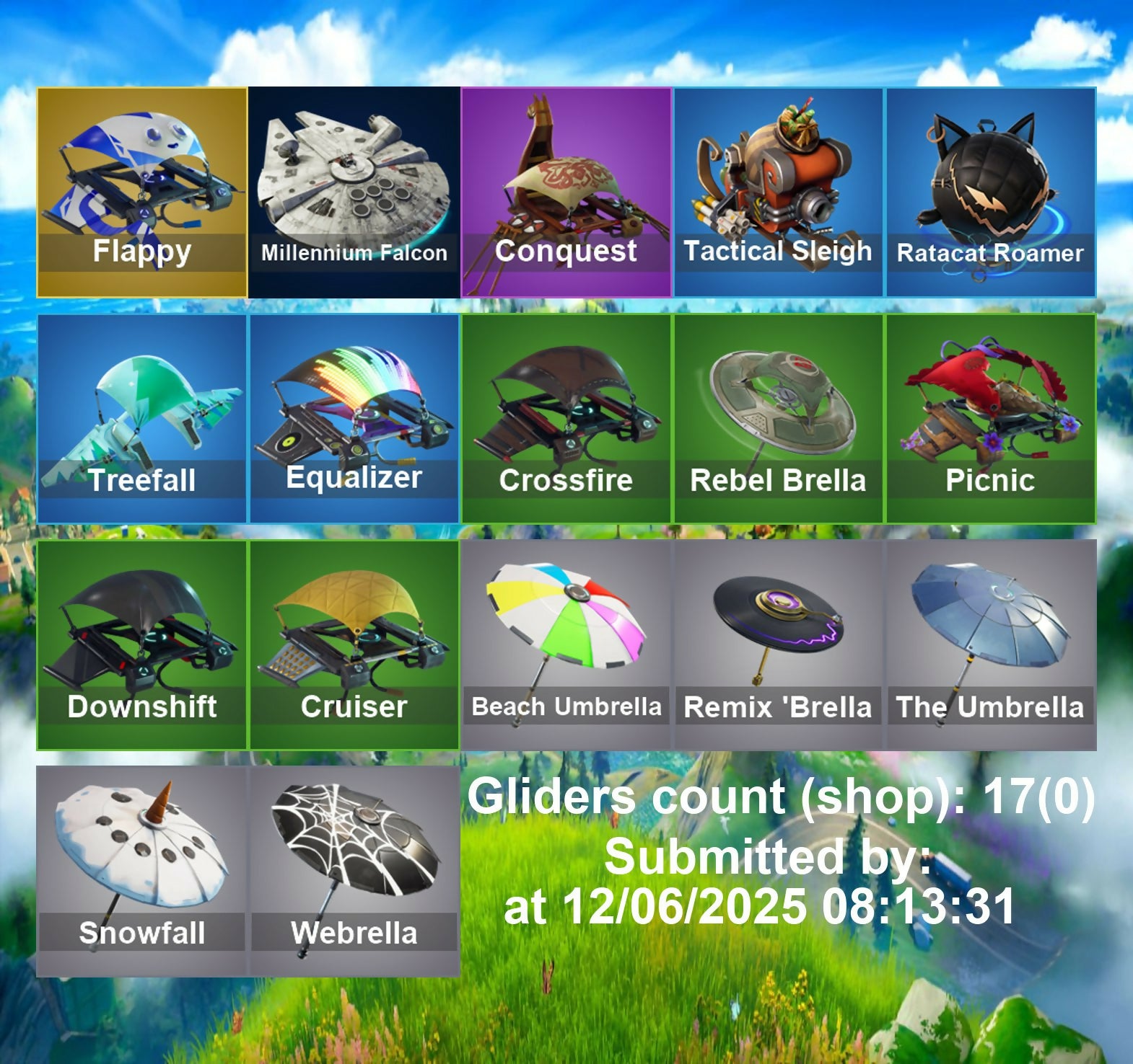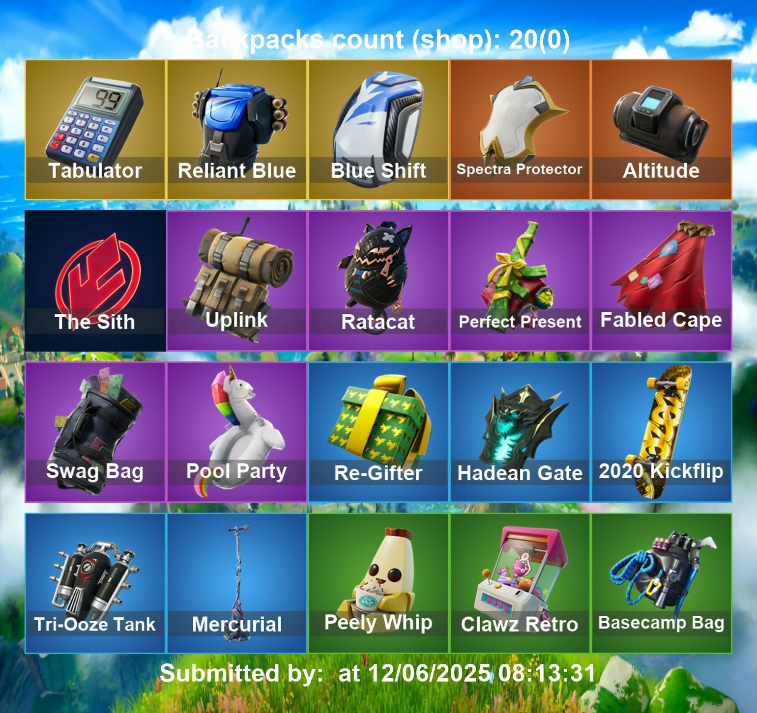 2020 Kickflip, Altitude, Balloon Axe, Basecamp Bag, Beach Umbrella, Blue Shift, Blue Striker, Calamity, Calamity Stage 5, Calculated, Cat Flip, Clawz Retro, Conquest, Controller, Crossfire, Cruiser, Dj Yonder, Downshift, Drift, Drift Stage 5, Equalizer, Fabled Cape, Flappy, Gentleman's Dab, Giddy-Up, Golden Scythe, Golf Clap, Guiding Glow, Hadean Gate, Hope, Huntress, I'm A Mystery, Lt. Evergreen, Lug Axe, Lynx, Lynx (Stage 4 - No Ponytail), Mercurial, Millennium Falcon, Nanner Bashers, Peely Whip, Peppermint Pick, Perfect Present, Picnic, Pool Party, Premiere Poms, Prodigy, Ratacat, Ratacat Roamer, Re-Gifter, Rebel Brella, Reckoning, Redline, Regal Wave, Reliant Blue, Remix 'Brella, Respect The Peace, Rift Edge, Running Man, Salute, Scorcher, Scratchmark, Secret Scimitars, Shaolin Sip, Shortbread Slicers, Smash Up, Snoop's Walk, Snowfall, Snowshaker, Snowy, Spectra Protector, Stun Knife, Sun Strider, Swag Bag, Tabulator, Tactical Sleigh, The Ace, The Break Shot, The Sith, The Umbrella, Treefall, Tri-Ooze Tank, Trilogy, Uplink, Webrella, Wooly Warrior, Work It Out, You're Awesome, Zenith, Zenith (Stage 4)