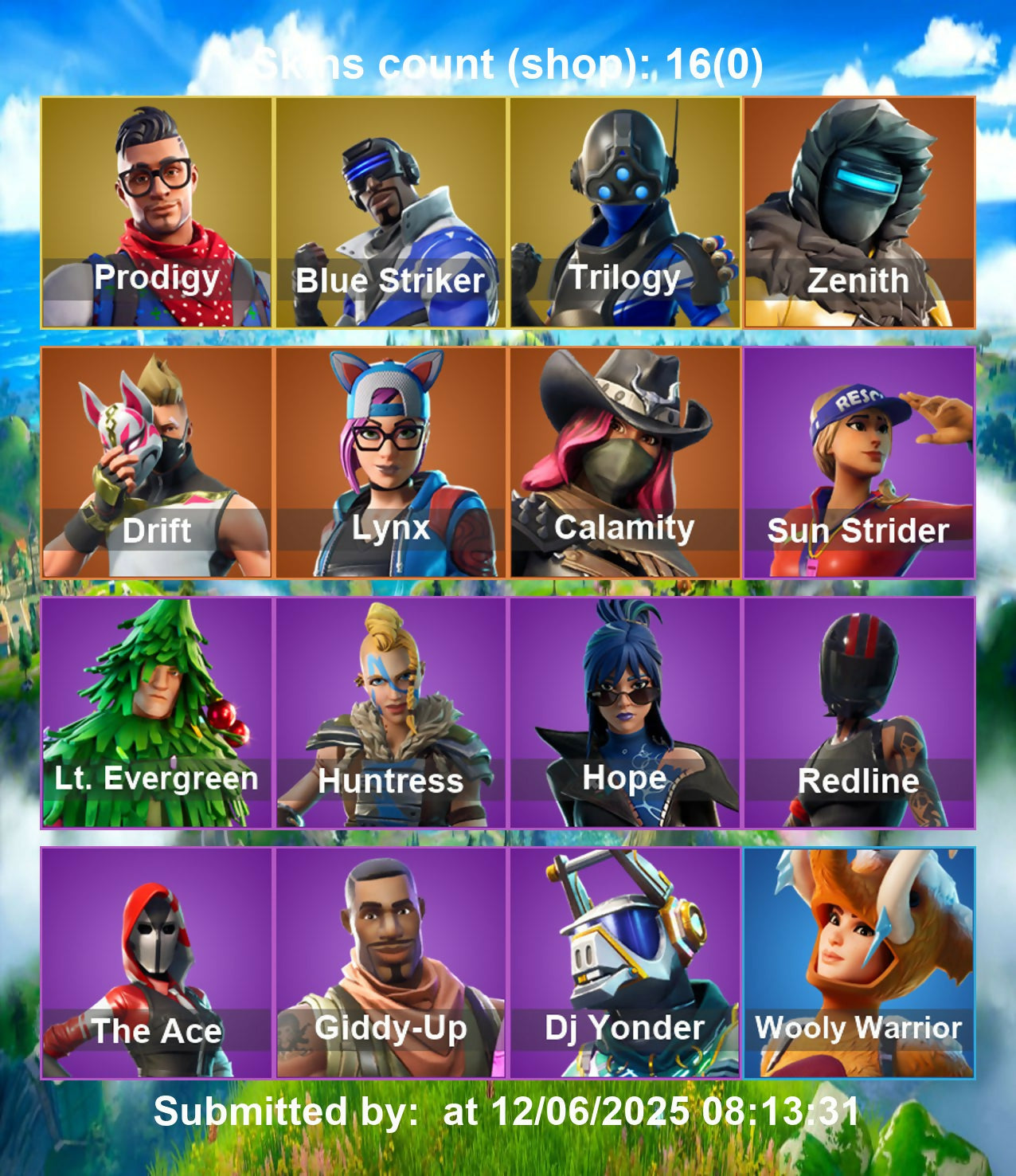 [PC/PSN/XBOX] 16 skins | Prodigy | Blue Striker | Trilogy | Zenith | Drift | Lynx | Calamity | Sun Strider | Lt. Evergreen | Huntress | Hope | Redline | 200 VB