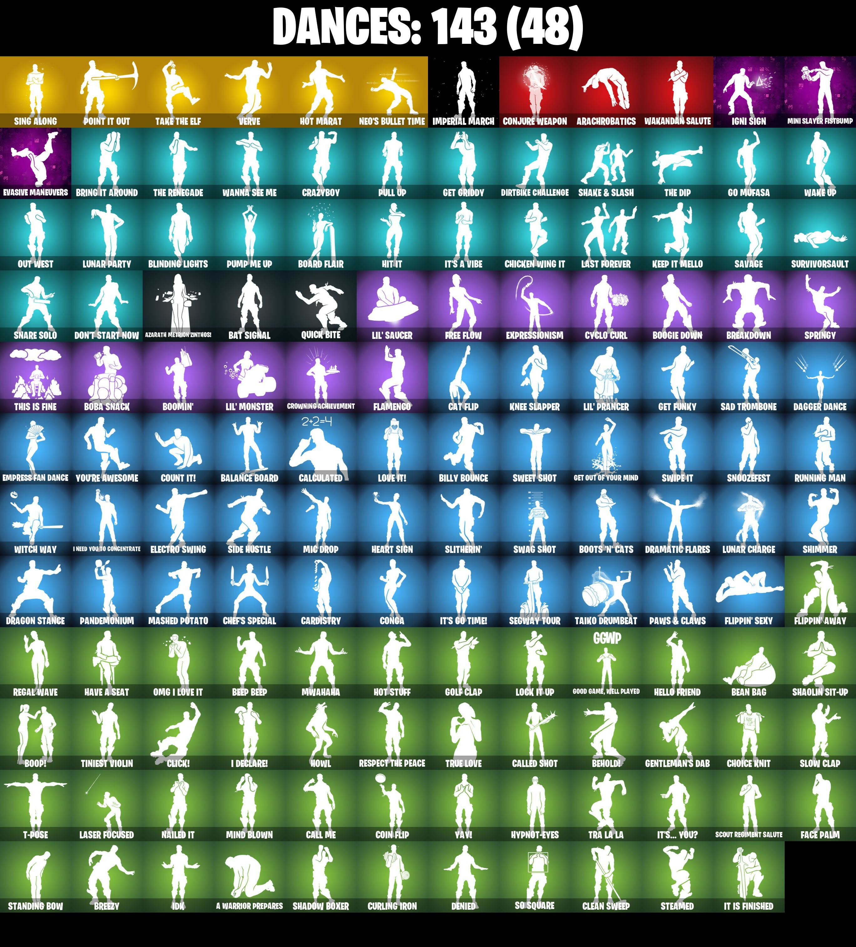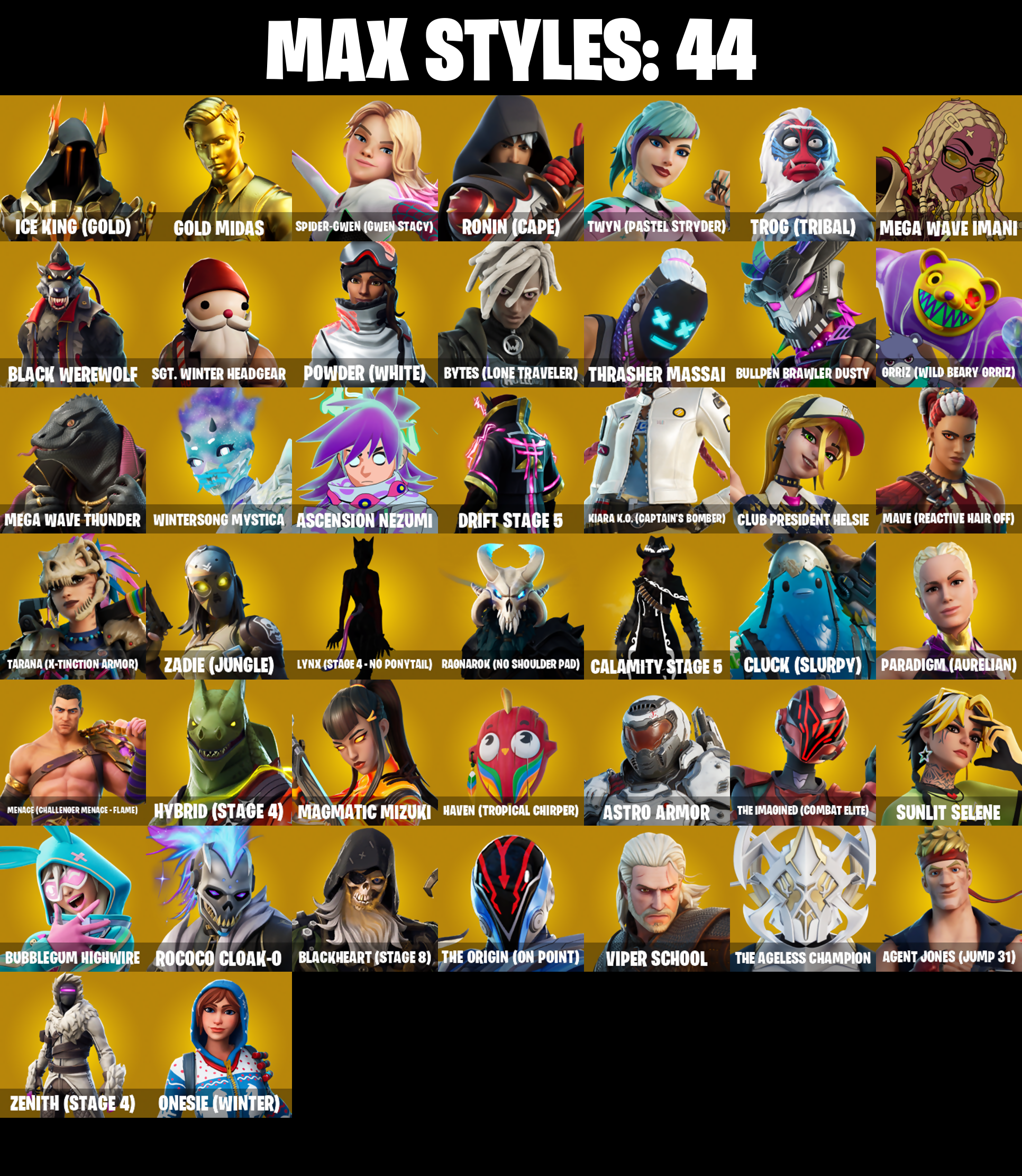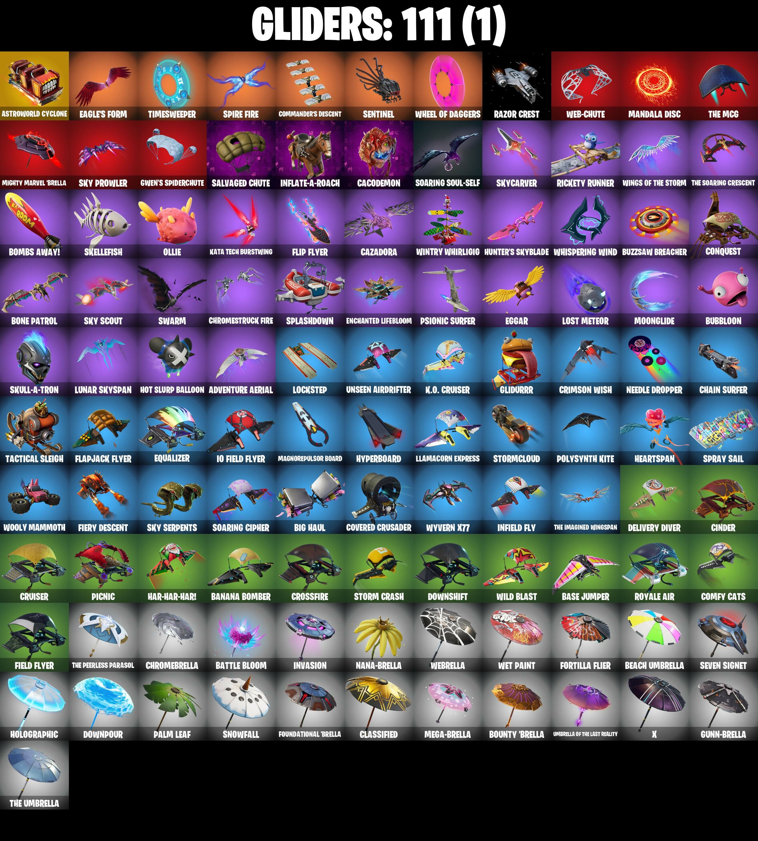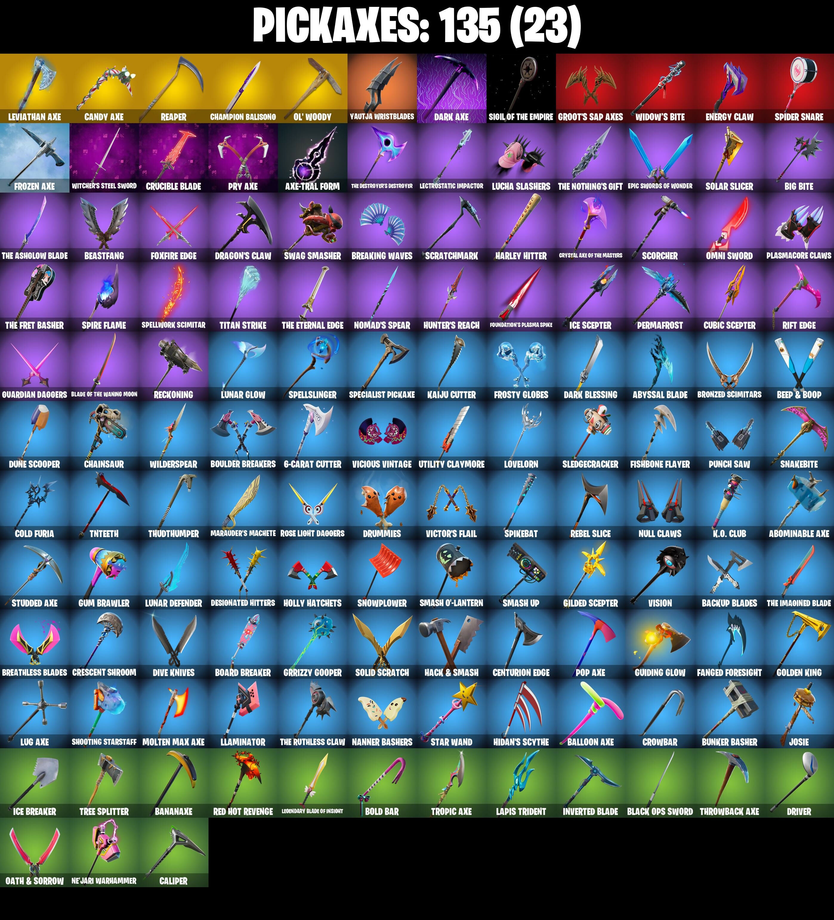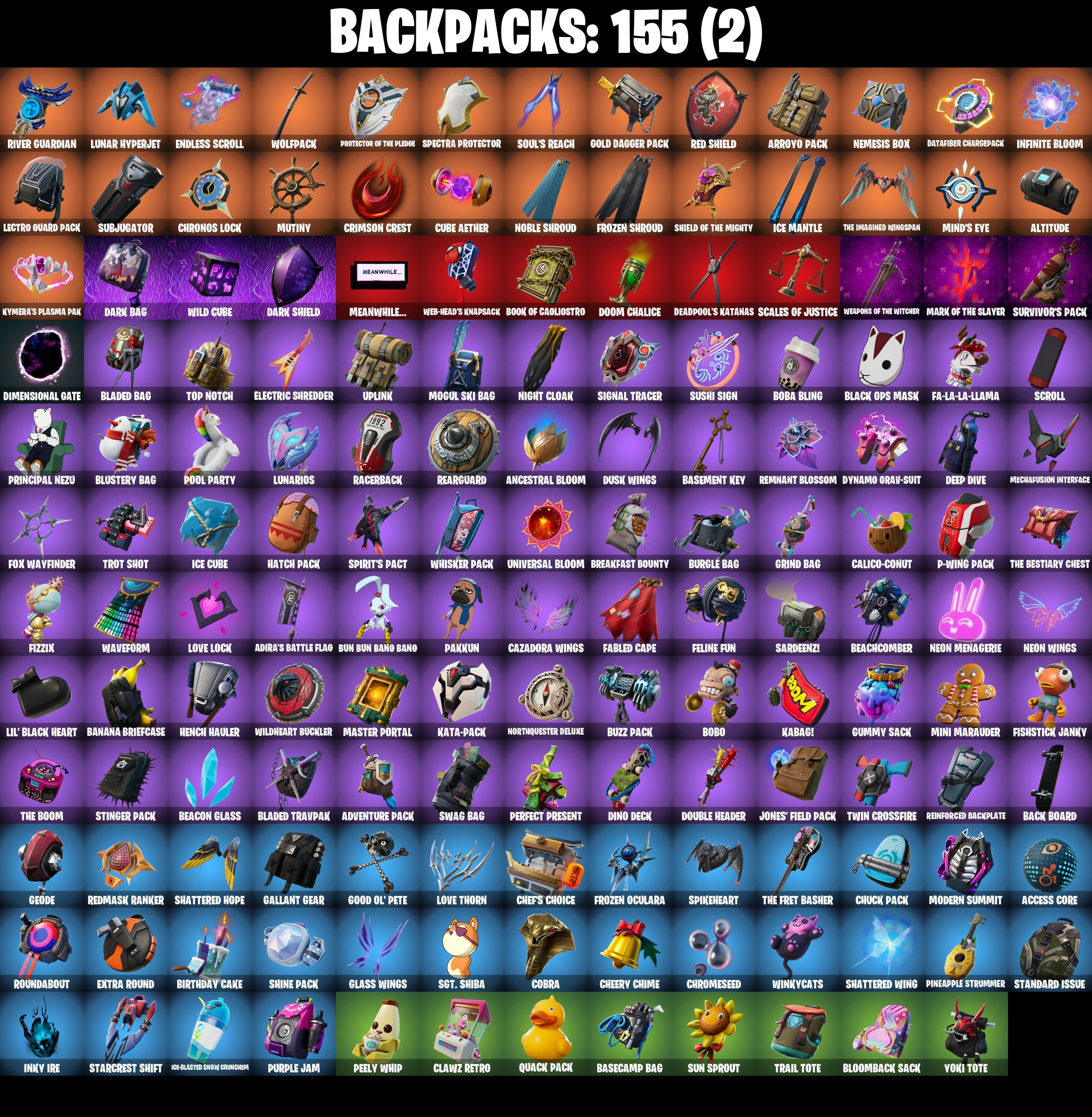 6-Carat Cutter, A Warrior Prepares, Abominable Axe, Absenz, Abyssal Blade, Access Core, Adira's Battle Flag, Adventure Aerial, Adventure Pack, Agent Jones, Agent Jones (Jump 31), Agent Peely, All Might, Altitude, Ancestral Bloom, Arachrobatics, Arctic Adeline, Arctica, Arroyo Pack, Ascension Nezumi, Assault Trooper, Astro Armor, Astroworld Cyclone, Aura Analyzer, Axe-tral Form, Azarath Metrion Zinthos!, B.R.U.T.E. Gunner, Back Board, Backup Blades, Balance Board, Balloon Axe, Banana Bomber, Banana Briefcase, Bananaxe, Base Jumper, Basecamp Bag, Basement Key, Bat Signal, Battle Bloom, Beach Umbrella, Beachcomber, Beacon Glass, Bean Bag, Beastfang, Beep & Boop, Beep Beep, Behold!, Big Bite, Big Haul, Billy Bounce, Birthday Cake, Black Ops Mask, Black Ops Sword, Black Werewolf, Blackheart, Blackheart (Stage 8), Blade of the Waning Moon, Bladed Bag, Bladed Travpak, Blinding Lights, Bloomback Sack, Blustery Bag, Board Breaker, Board Flair, Boba Bling, Boba Snack, Bobo, Bold Bar, Bombs Away!, Bone Patrol, Boogie Down, Book of Caolostro, Boomin', Boop!, Boots 'N' Cats, Boulder Breakers, Bounty 'Brella, Breakdown, Breakfast Bounty, Breaking Waves, Breathless Blades, Breezy, Bring It Around, Bronzed Scimitars, Brutus, Bubblegum Highwire, Bubbloon, Bullpen Brawler Dusty, Bun Bun Bano Bang, Bunker Basher, Burgle Bag, Buzz Pack, Buzzsaw Breacher, Bytes, Bytes (Lone Traveler), Cacodemon, Calamity, Calamity Stage 5, Calculated, Calico-Conut, Caliper, Call Me, Called Shot, Candy Axe, Cardistry, Cat Flip, Cazadora, Cazadora Wings, Centurion, Centurion Edge, Chain Surfer, Chainsaur, Champion Balisong, Cheery Chime, Chef's Choice, Chef's Special, Chicken Wing It, Choice Knit, Chrombrella, Chrome Punk, Chromeseed, Chromestruck Fire, Chronos Lock, Chuck Pack, Cinder, Clash, Classified, Clawz Retro, Clean Sweep, Click!, Club President Helsie, Cluck, Cluck (Slurpy), Cobalt, Cobra, Coin Flip, Cold Furia, Comfy Cats, Commander's Descent, Conga, Conjure Weapon, Conquest, Count It!, Covered Crusader, Crazyboy, Crescent Shroom, Crimson Crest, Crimson Wish, Crossfire, Crowbar, Crowning Achievement, Crucible Blade, Cruiser, Crystal, Crystal Axe of the Masters, Cube Aether, Cubic Scepter, Curling Iron, Cyclo Curl, D'Ark, DJ Yonder, Dagger Dance, Dark Axe, Dark Bag, Dark Blessing, Dark Bomber, Dark Jonesy, Dark Red Knight, Dark Shield, Dark Wild Card, Datafiber Chargepack, Deadpool, Deadpool's Katanas, Deep Dive, Delivery Diver, Denied, Designated Hitters, Diamond Diva, Dimensional Gate, Dino Deck, Dire, Dirtbike Challenge, Dive Knives, Dizzle, Doctor Strange, Don't Start Now, Doom Chalice, Doom Slayer, Double Header, Downpour, Downshift, Dragon Stance, Dragon's Claw, Dramatic Flares, Dream, Drift, Drift Stage 5, Driver, Drummies, Dune Scooper, Dusk, Dusk Wings, Dusty, Dynamo Grav-Suit, Eagle's Form, Eggar, Electric Shredder, Electro Swing, Empress Fan Dance, Enchanted Lifebloom, Endless Scroll, Energy Claw, Enforcer, Envoy, Epic Swords of Wonder, Equalizer, Era, Eren Jaeger, Erisa, Evasive Maneuvers, Expressionism, Extra Round, Fa-la-la-llama, Fable, Fabled Cape, Face Palm, Facet, Fanged Foresight, Feline Fun, Field Flyer, Fiery Descent, Finesse Finisher, Fishbone Flayer, Fishstick Janky, Fizzix, Flamenco, Flapjack Flyer, Flip Flyer, Flippin' Away, Flippin' Sexy, Focus, Fortilla Flier, Foundation's Plasma Spike, Foundational 'Brella, Fox Wayfinder, Foxfire Edge, Free Flow, Frosty Globes, Frozen Axe, Frozen Oculare, Frozen Shroud, Gallant Gear, Gear Specialist Maya, Gentleman's Dab, Geode, Geralt Of Rivia, Get Funky, Get Griddy, Get Out Of Your Mind, Giddy-Up, Gilded Scepter, Glass Wings, Glidurrr, Go Mufasa, Gold Dagger Pack, Gold Midas, Golden King, Golf Clap, Good Game, Well Played, Good Ol' Pete, Grind Bag, Grizzly Gooper, Groot's Sap Axes, Grriz, Grriz (Wild Beary Grriz), Guardian Daggers, Guiding Glow, Gum Brawler, Gumbo, Gummy Sack, Gunn-Brella, Gunnar, Gwen's Spiderchute, Hack & Smash, Halley, Har-Har-Har!, Harley Hitter, Harlowe, Hatch Pack, Have A Seat, Haven, Haven (Tropical Chirper), Heart Sign, Heartspan, Hello Friend, Helsie, Hench Hauler, Hidan's Scythe, Highwire, Hit It, Holly Hatchets, Holographic, Hot Marat, Hot Slurp Balloon, Hot Stuff, Howl, Hunter's Reach, Hunter's Skyblade, Huntress, Hybrid, Hybrid (Stage 4), Hyperboard, Hypnot-Eyes, I Declare!, I Need You To Concentrate, IDK, IO Field Flyer, Ice Breaker, Ice Cube, Ice King (Gold), Ice Mantle, Ice Scepter, Ice-Blasted Snow Cruncherm, Igni Sign, Imani, Imperial March, Infield Fly, Infinite Bloom, Inflate-A-Roach, Inky Ire, Invasion, Inverted Blade, Iris, It Is Finished, It's A Vibe, It's Go Time!, It's... You?, Itachi Uchiha, Jolly Jammer, Jones' Field Pack, Josie, Jungle Scout, K.O. Club, K.O. Cruiser, Kabag!, Kaiju Cutter, Kakashi Hatake, Kata Captain, Kata Tech Burstwing, Kata-Pack, Keep It Mello, Kiara K.O., Kiara K.O. (Captain's Bomber), Knee Slapper, Komplex, Kondor, Krisabelle, Kymera, Kymera's Plasma Pak, Laguna, Lapis Trident, Lara Croft, Laser Focused, Last Forever, Lectro Guard Pack, Lectrostatic Impactor, Legendary Blade of Insight, Lennox Rose, Leviathan Axe, Lexa, Lil' Black Heart, Lil' Monster, Lil' Prancer, Lil' Saucer, Llamacorn Express, Llaminator, Lock It Up, Lockstep, Lorenzo, Lost Meteor, Love It!, Love Lock, Love Thorn, Lovelorn, Lt. John Llama, Lucha Slashers, Lug Axe, Lunar Charge, Lunar Defender, Lunar Glow, Lunar Hyperjet, Lunar Party, Lunar Skyspan, Lunarios, Lynx, Lynx (Stage 4 - No Ponytail), Magmatic Mizuki, Magnorepulsor Board, Mancake, Mandala Disc, Mandalorian, Marauder's Machete, Mariposa, Mark of the Slayer, Mashed Potato, Massai, Master Portal, Mave, Mave (Reactive Hair Off), Meanwhile..., Mechafusion Interface, Mega Wave Imani, Mega Wave Thunder, Mega-Brella, Menace, Menace (Challenger Menace - Flame), Meow Skulls, Meowscles, Merry Marauder, Mic Drop, Mighty Marvel 'Brella, Mina Park, Mind Blown, Mind's Eye, Mini Marauder, Mini Slayer Fistbump, Mizuki, Modern Summit, Mogul Master, Mogul Ski Bag, Molten Max Axe,