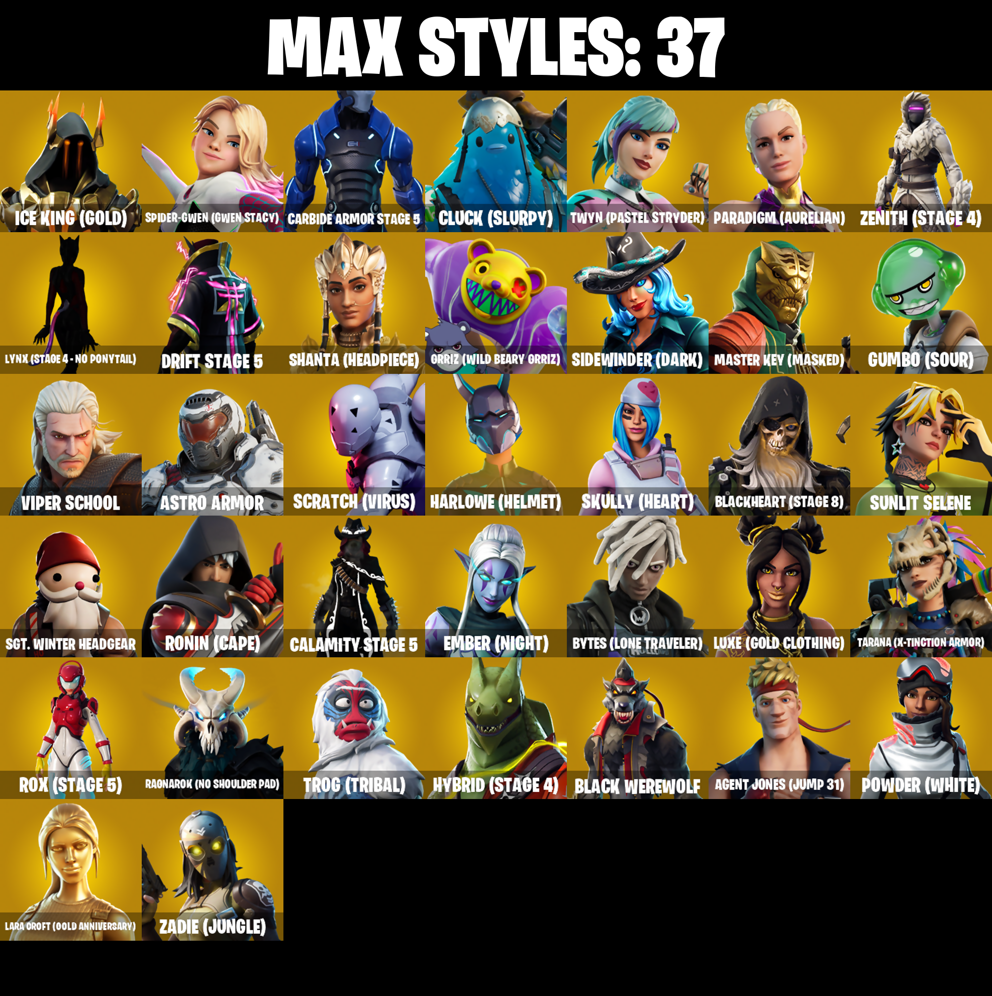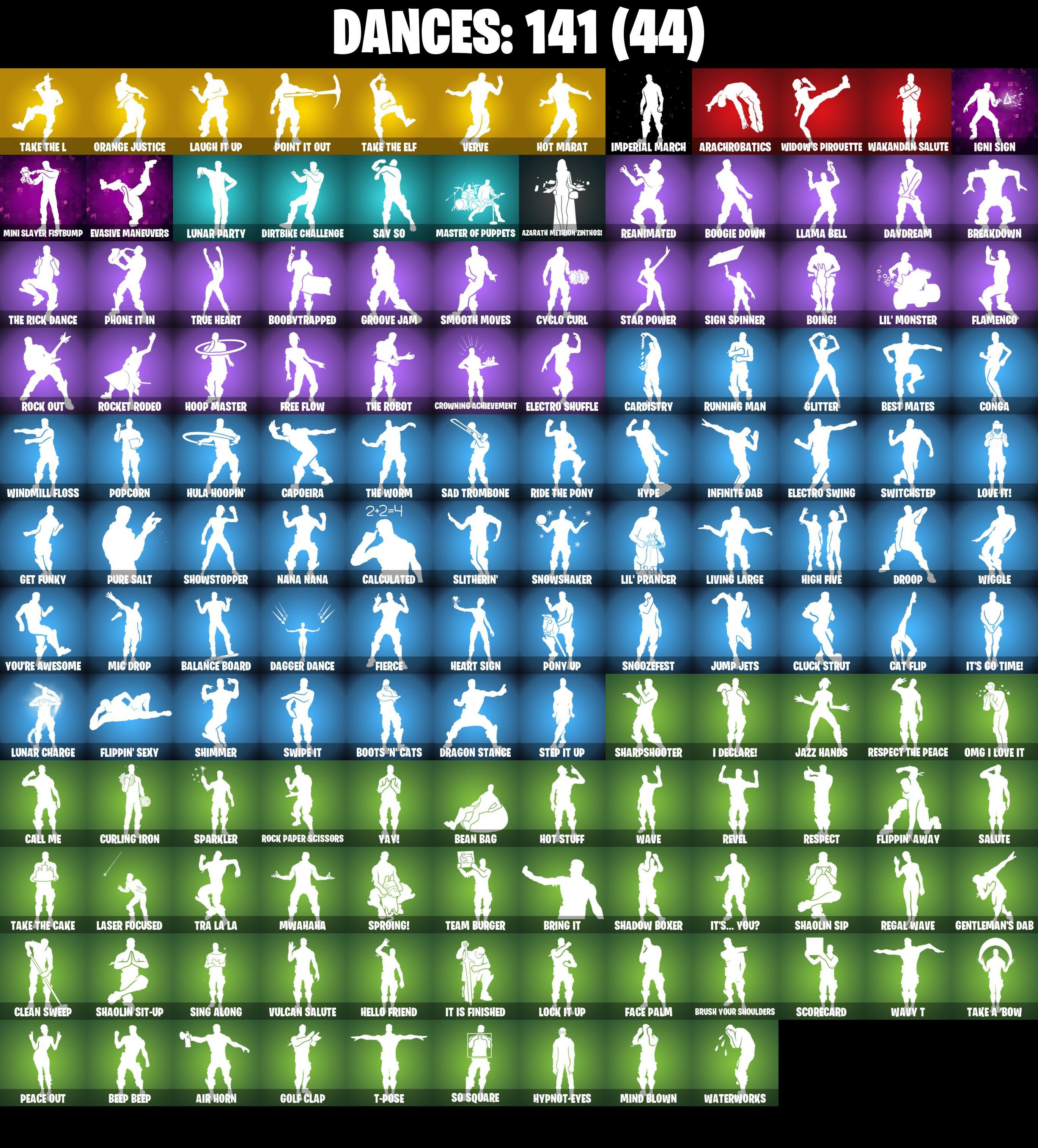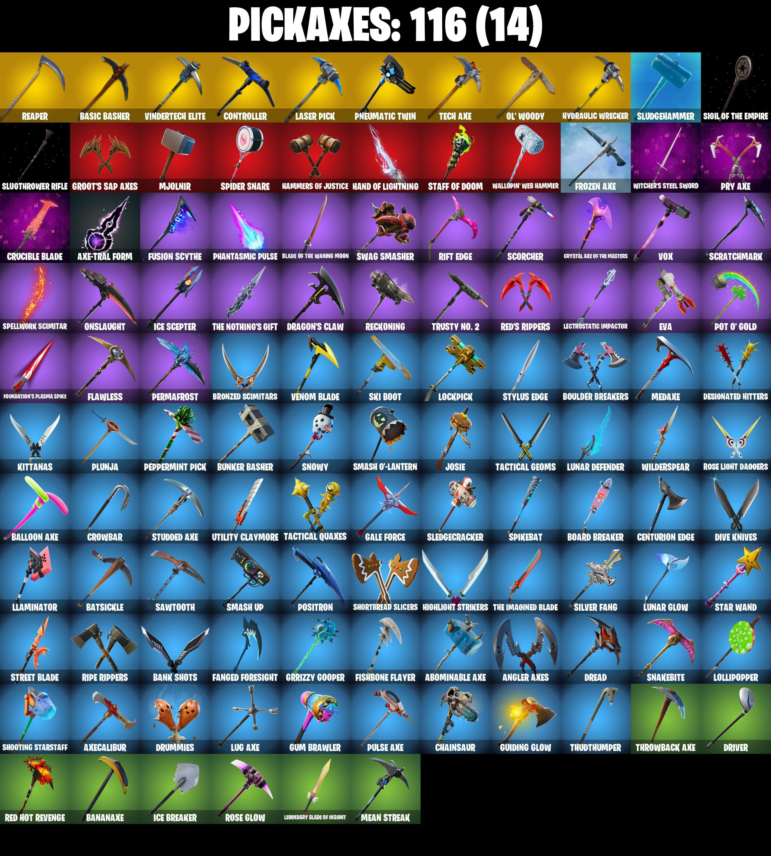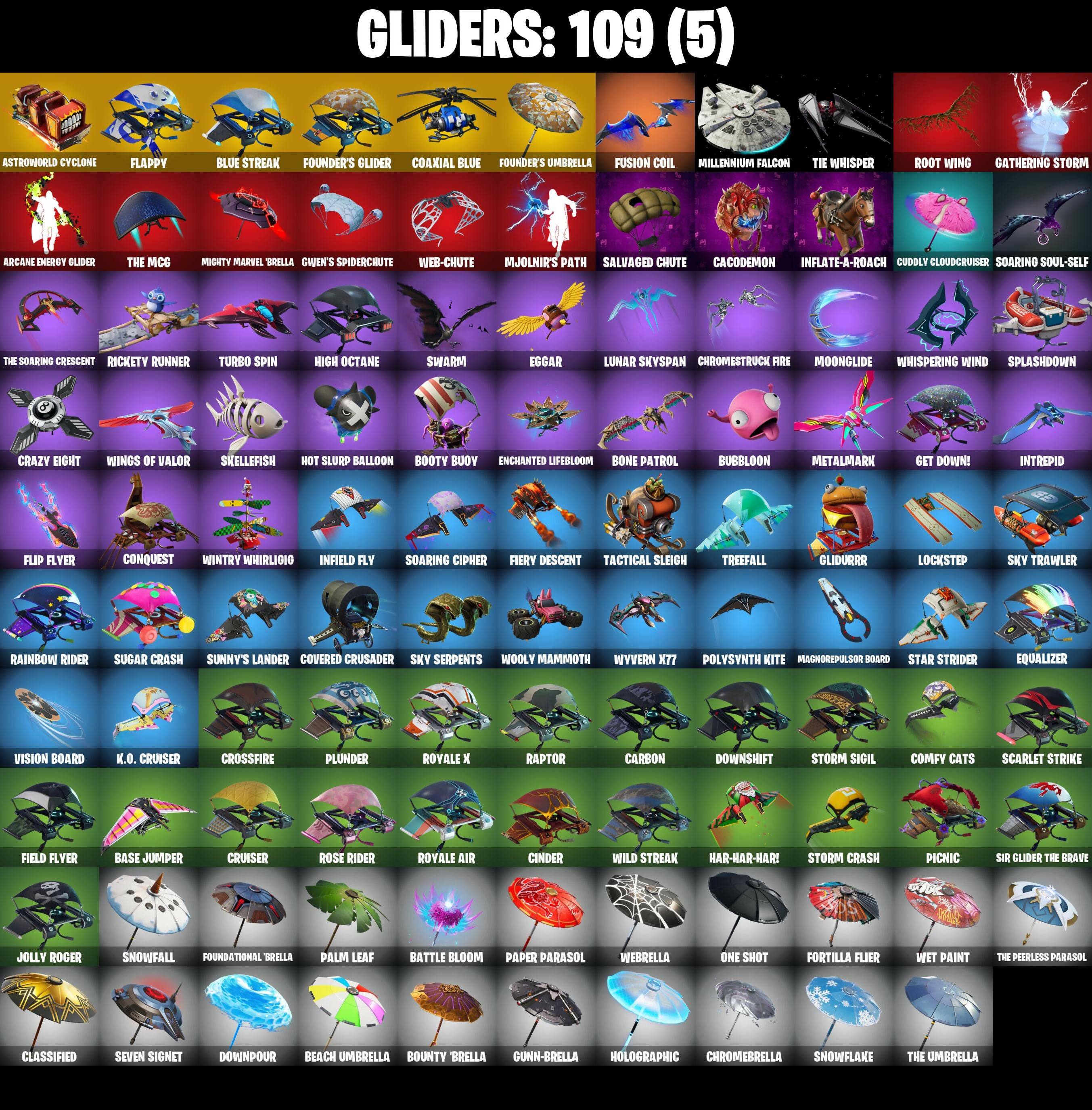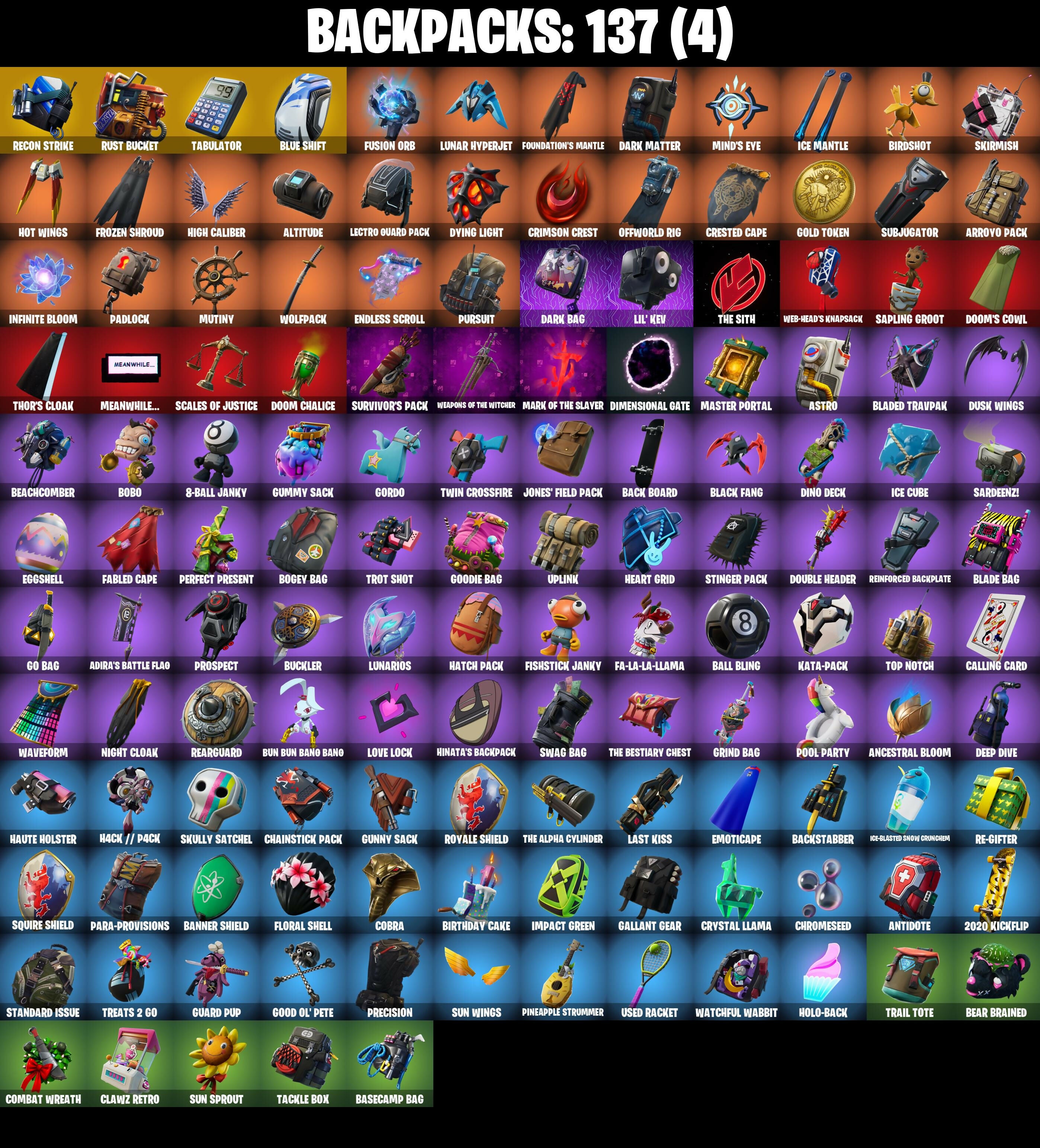 2020 Kickflip, 8-Ball Janky, 8-Ball vs Scratch, Abominable Axe, Adira's Battle Flag, Agent Jones, Agent Jones (Jump 31), Air Horn, Altitude, Ancestral Bloom, Angler Axes, Antidote, Arachrobatics, Arcane Energy Glider, Arctic Adeline, Arctic Assassin, Arroyo Pack, Astro, Astro Armor, Astroworld Cyclone, Athleisure Assassin, Aura, Axe-Tral Form, Axecalibur, Azarath Metrion Zinthos, B.R.U.T.E. Gunner, Back Board, Backstabber, Balance Board, Ball Bling, Balloon Axe, Bananaxe, Bank Shots, Banner Shield, Base Jumper, Basecamp Bag, Basic Basher, Batsickle, Battle Bloom, Battle Hound, Battlehawk, Beach Umbrella, Beachcomber, Bean Bag, Bear Brained, Beep Beep, Best Mates, Birdshot, Birthday Cake, Black Fang, Black Werewolf, Blackheart, Blackheart (Stage 8), Blade Bag, Blade Of The Waning Moon, Bladed Travpak, Blue Shift, Blue Squire, Blue Streak, Blue Striker, Blue Team Leader, Board Breaker, Bobo, Bogey Bag, Boing!, Bone Patrol, Boobytrapped, Boogie Down, Boots 'N' Cats, Booty Buoy, Boulder Breakers, Bounty 'Brella, Breakdown, Bring It, BriteStrom Bomber, Bronzed Scimitars, Brush Your Shoulders, Bubbloon, Buckler, Bun Bun Bang Bang, Bunker Basher, Bunker Jonesy, Bunny Brawler, Bunnywolf, Bytes, Bytes (Lone Traveler), Cacodemon, Calamity, Calamity Stage 5, Calculated, Call Me, Calling Card, Cameo vs Chic, Capoeira, Carbide, Carbide Armor Stage 5, Carbon, Cardistry, Cat Flip, Centurion, Centurion Edge, Chainsaur, Chainstick Pack, Chigusa, Chrome Punk, Chromebrella, Chromeseed, Chromestruck Fire, Cinder, Circuit Breaker, Classified, Clawz Retro, Clean Sweep, Cluck, Cluck (Slurpy), Cluck Strut, Coaxial Blue, Cobalt, Cobra, Combat Wreath, Comfy Cats, Commando, Conga, Conquest, Controller, Covered Crusader, Crackshot, Crazy Eight, Crested Cape, Crimson Crest, Crossfire, Crowbar, Crowning Achievement, Crucible Blade, Cruiser, Crystal, Crystal Axe Of The Masters, Crystal Llama, Cuddly Cloudcruiser, Curling Iron, Cyclo Curl, DJ Yonder, Dagger Dance, Dark Bag, Dark Bomber, Dark Matter, Dark Voyager, Dawdream, Dazzle, Deep Dive, Designated Hitters, Dimensional Gate, Dino Deck, Dire, Dirtbike Challenge, Dive Knives, Doctor Doom, Doom Chalice, Doom Slayer, Doom's Cowl, Double Header, Doublecross, Downpour, Downshift, Dragon Stance, Dragon's Claw, Dread, Drift, Drift Stage 5, Driver, Droop, Drummies, Dusk, Dusk Wings, Dusty, Dying Light, Eggar, Eggshell, Electro Shuffle, Electro Swing, Elite Agent, Ember, Ember (Night), Emoticape, Enchanted Lifebloom, Endless Scroll, Enforcer, Equalizer, Eva, Evasive Maneuvers, Fa-La-La-Llama, Fable, Fabled Cape, Face Palm, Fanged Foresight, Field Flyer, Fierce, Fiery Descent, Fishbone Flayer, Fishstick Janky, Flamenco, Flappy, Flawless, Flip Flyer, Flippin' Away, Flippin' Sexy, Floral Shell, Fortilla Flier, Foundation's Mantle, Foundation's Plasma Spike, Foundational 'Brella, Founder's Glider, Founder's Umbrella, Free Flow, Frozen Axe, Frozen Shroud, Fusion, Fusion Coil, Fusion Orb, Fusion Scythe, Gale Force, Gallant Gear, Gathering Storm, Gentleman's Dab, Geralt of Rivia, Get Down!, Get Funky, Ghoul Trooper, Giddy-Up, Glidurr, Glitter, Go Bag, Gold Token, Golf Clap, Good Ol' Pete, Goodie Bag, Gordo, Grind Bag, Grizzly Gooper, Groot, Groot's Sap Axes, Groove Jam, Grriz, Grriz (Wild Beary Grriz), Guard Pup, Guiding Glow, Gum Brawler, Gumbo, Gumbo (Sour), Gummy Sack, Gunn-'Brella, Gunny Sack, Gwen's Spiderchute, Hack // Pack, Hammers Of Justice, Hand Of Lightning, Har-Har-Har!, Harlowe, Harlowe (Helmet), Hatch Pack, Haute Holster, Haven, Heart Grid, Heart Sign, Hello Friend, High Caliber, High Five, High Octane, Highland Warrior, Highlight Strikers, Hinata Hyuga, Hinata's Backpack, Holo-Back, Holographic, Hoop Master, Hot Marat, Hot Slurp Balloon, Hot Stuff, Hot Wings, Hula Hoopin', Huntress, Hybrid, Hybrid (Stage 4), Hydraulic Wrecker, Hype, Hyperion, Hypnot-Eyes, I Declare!, Ice Breaker, Ice Cube, Ice King (Gold), Ice Mantle, Ice Scepter, Ice-Blasted Snow Crunchem, Igni Sign, Impact Green, Imperial March, Infield Fly, Infinite Bloom, Infinite Dab, Inflate-A-Roach, Intrepid, It Is Finished, It's Go Time!, It's... You?, Jazz Hands, Jennifer Walters, Jolly Roger, Jones' Field Pack, Josie, Journey vs Hazard, Jump Jets, Jungle Scout, K.O. Cruiser, Kata-Pack, Kittanas, Kyra, Laguna, Lara Croft, Lara Croft (Gold Anniversary), Laser Focused, Laser Pick, Last Kiss, Laugh It Up, Lectro Guard Pack, Lectrostatic Impactor, Legendary Blade Of Insight, Lennox Rose, Lil' Kev, Lil' Monster, Lil' Prancer, Living Large, Llama Bell, Llaminator, Lock It Up, Lockpick, Lockstep, Lollipopper, Love It!, Love Lock, Loveless, Lt. Evergreen, Lt. John Llama, Lug Axe, Lunar Charge, Lunar Defender, Lunar Glow, Lunar Hyperjet, Lunar Party, Lunar Skyspan, Lunarios, Luxe, Luxe (Gold Clothing), Lynx, Lynx (Stage 4 - No Ponytail), Magnorepulsor Board, Mark Of The Slayer, Massai, Master Key, Master Key (Masked), Master Portal, Master of Puppets, Maximilian, Mean Streak, Meanwhile..., Medaxe, Megumi, Meow Skulls, Metalmark, Mic Drop, Mighty Marvel 'Brella, Millennium Falcon, Min-Joon, Mind Blown, Mind's Eye, Mini Slayer Fistbump, Mission Specialist, Mjolnir, Mjolnir's Path, Moonglide, Moonwalker, Munitions Expert, Mutiny, Mwahaha, Nana Nana, Neymar Jr, Nezumi, Night Cloak, Nightshade, Nog Ops, Offworld Rig, Ol' Woody, Omega, Omg I Love It, One Shot, Onesie, Onslaught, Orange Justice, Padlock, Palm Leaf, Paper Parasol, Para-Provisions, Paradigm (Aurelian), Paradigm (Reality-659), Pastel, Peace Out, Peely, Peppermint Pick, Perfect Present, Permafrost, Phantasmic Pulse, Phone It In, Picnic, Pineapple Strummer, Plunder, Plunja, Pneumatic Twin, Point It Out, Point Patroller, Poised Playmaker, Polysynth Kite, Pony Up, Pool Party, Popcorn, Positron, Pot O' Gold, Powder, Powder (White), Precision, Prodigy, Prospect, Prv Axe, Pulse Axe, Pure Salt, Pursuit, Ragnarok, Ragnarok (No Shoulder Pad), Rainbow Rider, Raptor, Raz, Re-Gifter, Reanimated, Reaper, Rearguard, Rebirth Raven, Reckoning, Recon Scout, Recon Specialist, Re