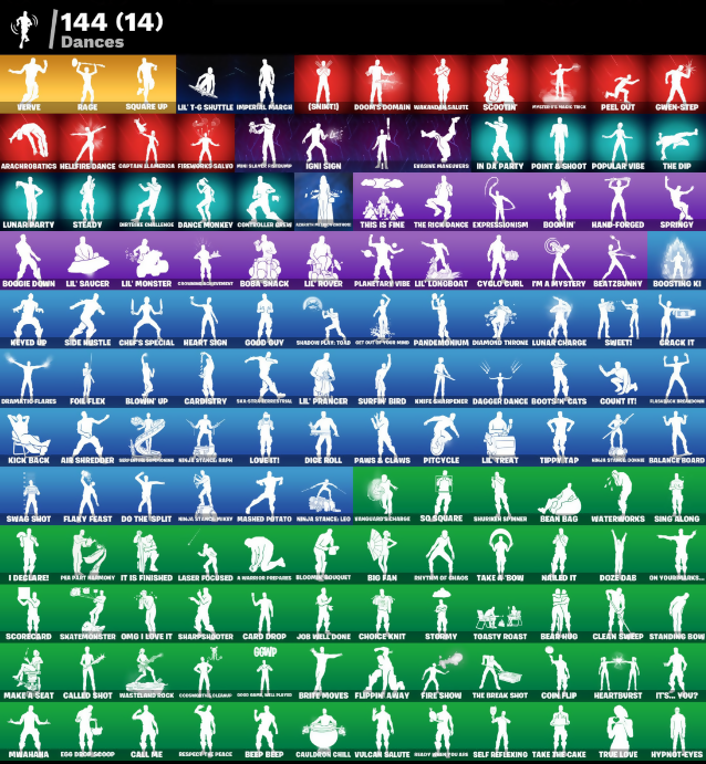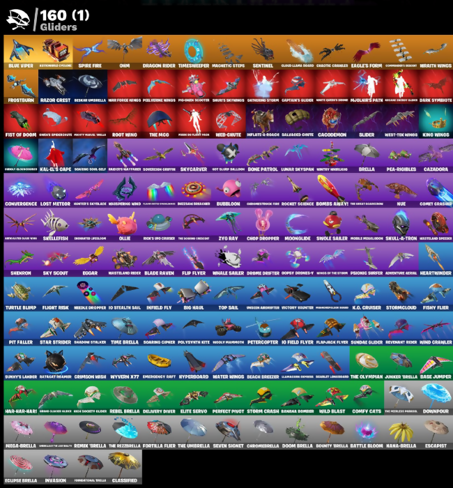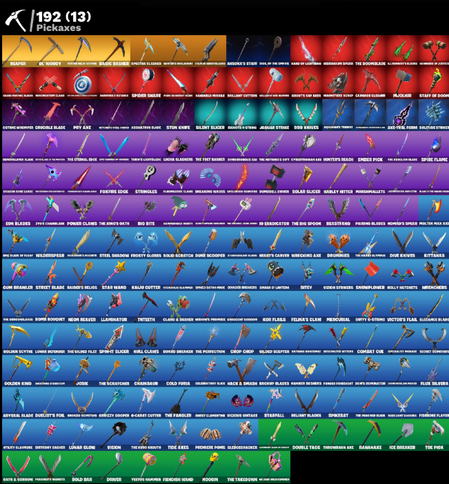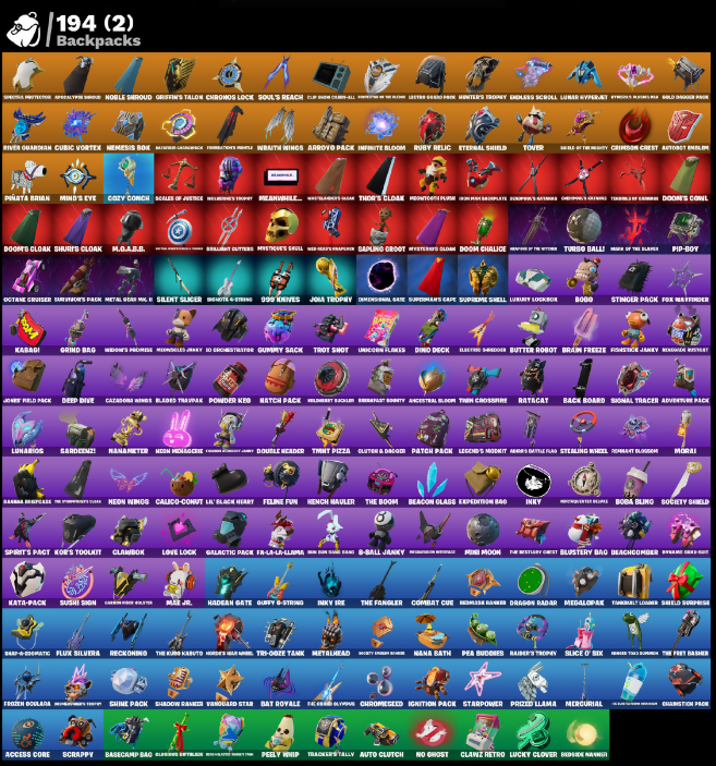 1-4-0 Phoenix Ash, 1-Ball, 8-Ball Jankey, 999 Knives, A Warrior Prepares, Abassi, AbseNz, Abyssal Blade, Access Core, Acrobatics, Adira, Adventure Arial, Adventure Pack, Adventurous Windmill, Agent Jones, Agent Peely, Ahsoka Tano, Ahsoka's Staff, Air Shredder, Ancestral Bloom, Antonia, Apocalypse Shroud, Aquaman, Aquaman's Trident, Arcane Energy Glider, Archmaldra Chain Wing, Arctic Adeline, Arroyo Pack, Assassins Blade, Aura, Auto Clutch, Autobot Emblem, Axe-Tral Form, Back Board, Backup Blades, Balance Board, Banana Bomber, Banana Briefcase, Bananaxe, Base Jumper, Basecamp Bag, Basic Basher, Bat Royale, Battery, Battle Bloom, Beach Breezer, Beachcomber, Beacon Glass, Bean Bag, Bearwoo, Beastfang, Beatzbunny, Bedside Manner, Beefmaster Bonnety, Beep Beep, Behold 6-String, Beskar Umbrella, Beware Careful, Bichota G-string, Big Bite, Big Fan, Big Haul, Birthday Dagger, Blade Raven, Bladed Missile, Bladed Trayvak, Bloom & Bouquet, Blowin' Up, Blue Viper, Blustery Bag, Board Breaker, Boba Bling, Boba Snack, Bobo, Bold Bar, Bomb Bouquet, Bomb The Destroyer, Bombs Away!, Bone Patrol, Boogie Down, Boomin', Boosting Kit, Bootsin' Cats, Bounty Brella, Brain Freeze, Breakdancing Turkey, Breaking Waves, Brella, Bricked Scimitars, Brief Moves, Brigandine Claw Of The Valkyrie, Brilliant Cutters, Brite Raider, Bubbloon, Buid Ready Gun, Butter Robot, Buzzban Boarbear, Bytes, Cacodemon, Calico-Coconut, Call Me, Called Shot, Candy Bomber, Captain Jones, Captain La Garcia, Captain's Glider, Card Drop, Cardistry, Carnage, Carnage Cleaver, Cauldron Chill, Cazadora, Cazadora Wings, Celebratory Slice, Chainsaur, Champion Pack, Chaos Director, Chaotic Crawler, Charlotte, Chef's Special, Choice Knit, Chompcindadong Pick, Chop Chop, Chop Dropper, ChromaBrella, Chrome Punk, Chromeseed, Chronos Lock, Clang & Bashar, Clark Kent, Classic Medieval Blade, Classified, Clawbox, Clawz Retro, Clean Sweep, Clinical Crosser, Clip Show Claws-All, Cloud Collector, Cloud Llama Board, Cluck, Coin Flip, Cold Furia, Combat Claw, Combat Cue, Comet Crasher, Comfy Cats, Command-Sheltered Brella, Controller Crash, Convergence, Count It!, Cozy Conch, Crack It, Crescent Diamond, Crimson Crest, Crimson Wulf, Crucible Blade, Cubic Vortex, Cuddly Glidervisor, Cyberstorm Axe, Cyclo Gurl, Dagger Dance, Dance Monkey, Dark Specialist Raava, Dark Symbiote, Deadpool, Deadpool's Sword, Deep Dive, Delivery Diver, Destroyer Knives, Diamond Dina, Diamond Throne, Diamondclaw Prime, Dice Roll, Dimensional Gate, Dino Deck, Dive Knives, Do The Split, Doctor Doom, Doctor Slone, Doom, Doom Brella, Doom Slayer, Doom's Cloak, Doom's Cowl, Doom's Domain, Dooms Dominator, Double Blades, Double Header, Double Tags, Downpour, Doze Dab, Dragon Radar, Dragon Rider, Dragon Rune Lance, Drama Flares, Driver, Drone Drifter, Drumlines, Drumroll Staff, Duelist's Foil, Dumbbell Driver, Dune Scooper, Dusty, Eagle's Form, Eating Basterd, Eclipse Brella, Egg Drop Scoop, Eggar, Electro Guard Pack, Electro Shadow, Elegance Blade, Elite Servo, Ember Pick, Emerald Blossom, Emergency Raft, Emma Frost, Enchanted Lifebloom, Endless Scroll, Eon Blades, Epic Blade Of Proof, Erock, Escapist, Eternal Knight, Eternal Shield, Eternity's Plasmida, Evasive Maneuvers, Evie, Expedition Bag, Expressionism, Fa-La-La-Llama, Fade, Fanged Foresight, Felina, Felina's Claw, Feline Fun, Fiendish Wand, Fire Show, Fireworks Salvo, Fish Thicc, Fishbone Flayer, Fishy Flier, Fist Of Doom, Fixer, Flaky Feast, Flapjack Flyer, Flare-otted Skymonsters, Flashback Breakdance, Flashglow Claws, Flight Risk, Flip Flyer, Flippin' Away, Flux Silvera, Foil Flex, Forgotten Wella, Fortilla Fleur, Fox Wayfinder, Foxfire Edge, Frost Squad, Frostburn, Frosty Globes, Frozen Goliara, Future Bass Scythe, Galactic Pack, Gathering Storm, Geralt of Rivia, Get Out Your Mind, Gilded Scepter, Glowing Fortune, Gold Brutus, Gold Digger Pack, Gold Midas, Golden King, Golden Scythe, Good Game, Well Played, Good Guy, Grand Soarer Glider, Griffin's Talon, Grind Bag, Grindz, Grizzly Dodger, Groot, Groot's Sap Arks, Guffy 6-String, Guffy G-String, Guggimon, Guitar & Drago, Gum Brawler, Gumbo, Gummy Sack, Gwenpool, Hack & Smash, Hadean Gate, Halloweentown's Blaze, Halo Of Mighty Sages, Hammer Bashes, Hammer Of Justice, Hand Of Lightning, Hand-Forged, Har-Har-Har!, Harlee And Scorch, Harley Hitter, Harlowe, Hatch Pack, Haven, Heart Sign, Heartburst, Hearts Carver, Heartwinder, Heavy Lame, Hellfire Dance, Hellraiser Horns, Helmelius Trophy, Helsie, Hench Hauler, Hero's Delta Flag, Hero's Togo Jumper, Holiday BoXy, Holly Knights, Hope, Hornyo's Spear, Horses Hair Mane, Horsing Jazzy, Hot Slurp Balloon, Howwire, Hunter's Reach, Hunter's Skyblade, Hunter's Trophy, Hustler, Hyperboard, Hypnot-Eyes, I Declare, I'm A Mystery, IQ Field Flyer, IQ Stealth Sail, Ice Breaker, Ice Cold Olympus, Igni Sign, Ignition Pack, Imani, Imperial March, In Da Party, Indiana Jones, Indoraptor Duke, Inferno Sekiro, Inferno's Claws, Infield Fly, Infinite Bloom, Inflate-A-Roach, Inky, Inky Ire, Invasion, It Is Finished, It's... You?, J.B. Chimpanski, Jaguar Strike, Jennifer Walters, Job Well Done, Joey, Jolla Trophy, Jones' Field Pack, Josie, Jules, Junker Brella, K.O. Cruiser, Kabagi, Kado Thorne, Kaiju Cutter, Kal-El's Cape, Kata-Pack, Keyed Up, Kick Back, King Wings, Kit, Kittanas, Knife Sharper, Knot Light Chaos, Kondor, Kor Flails, Kor's Toolkit, Krisabelle, Kymera, Lara Croft, Laser Focused, Legend's Modkit, Lennox Rose, Lexa, Lil Longboat, Lil Monster, Lil Split, Lil T-G Shuttle, Lil' Black Heart, Lil' Prancer, Lil' Rover, Lil' Threat, Lil'Saucer, Llaminator, Lo Eradicator, Lorenzo, Lost Meteor, Love Lock, Lovegift, Lt. John Llama, Lucha Slashers, Lucky Clover, Lumian Hyperjet, Lunar Charge, Lunar Defender, Lunar Glow, Lunar Party, Lunar Skyscan, Lunarios, Lunarlight Blaze Of The Elements, Luxury Lockbox, M.O.A.B.B., Machinist Mina, Mae, Magnetic Steps, Magnified Scrap, Maje Jr., Make A Exit, Malik, Mammoth Claws, Mana-Brella, Mancake, Mandalorian, Maripos